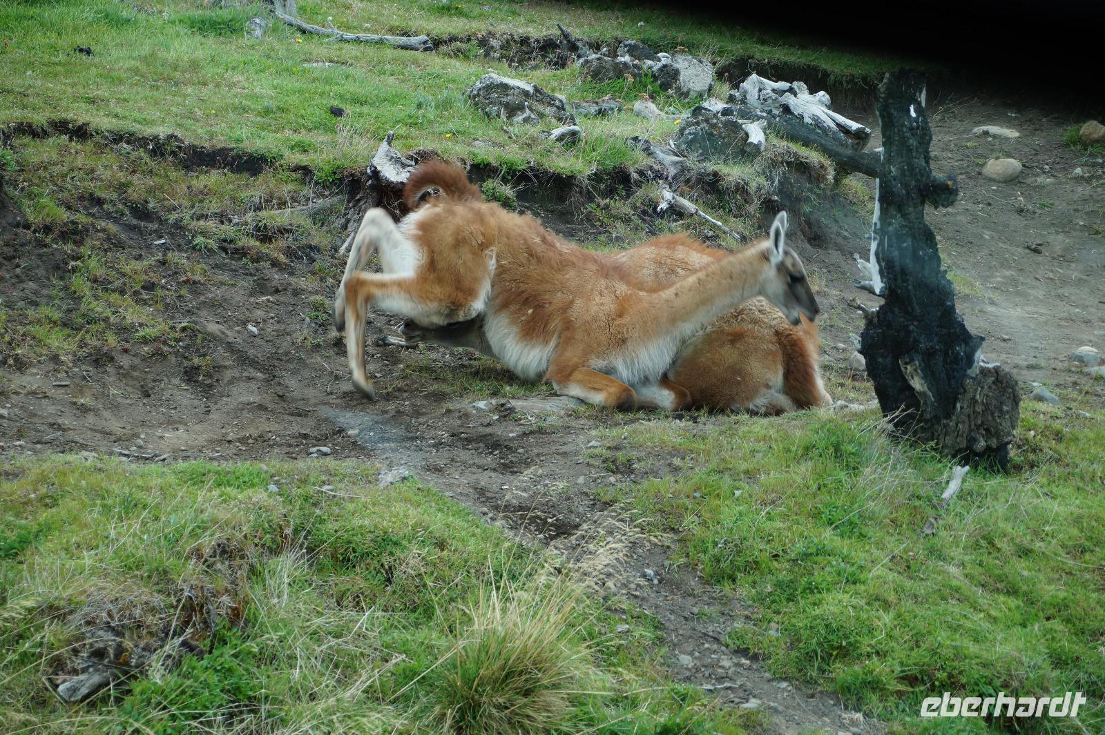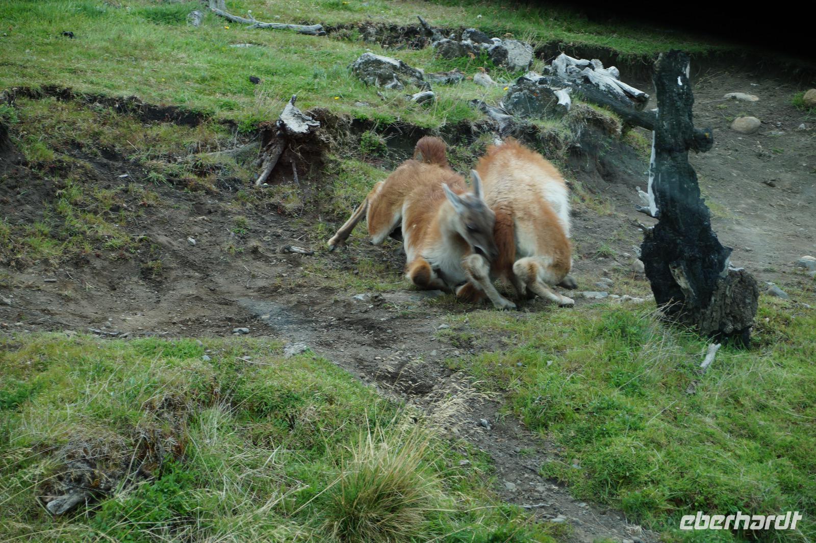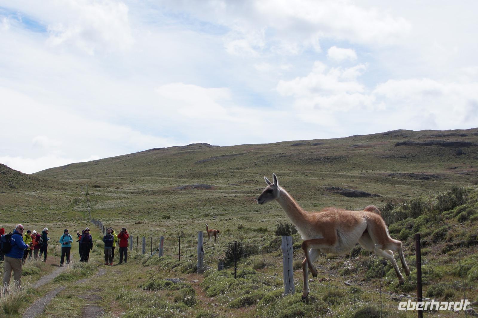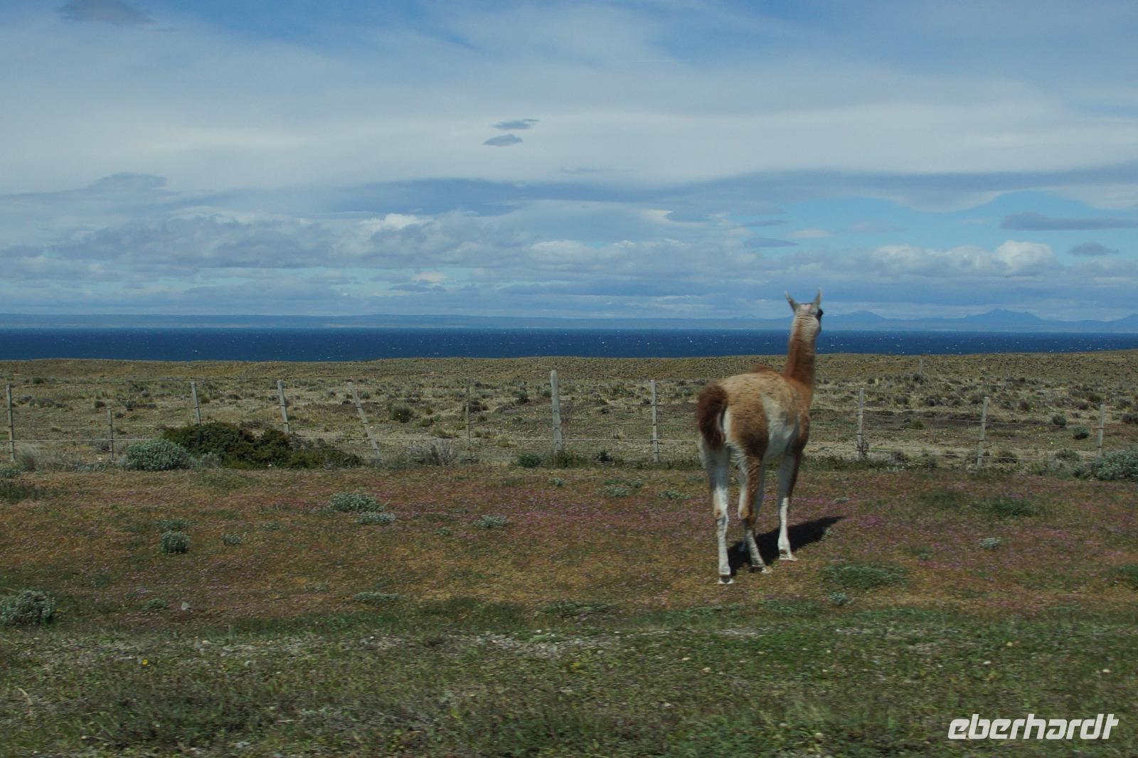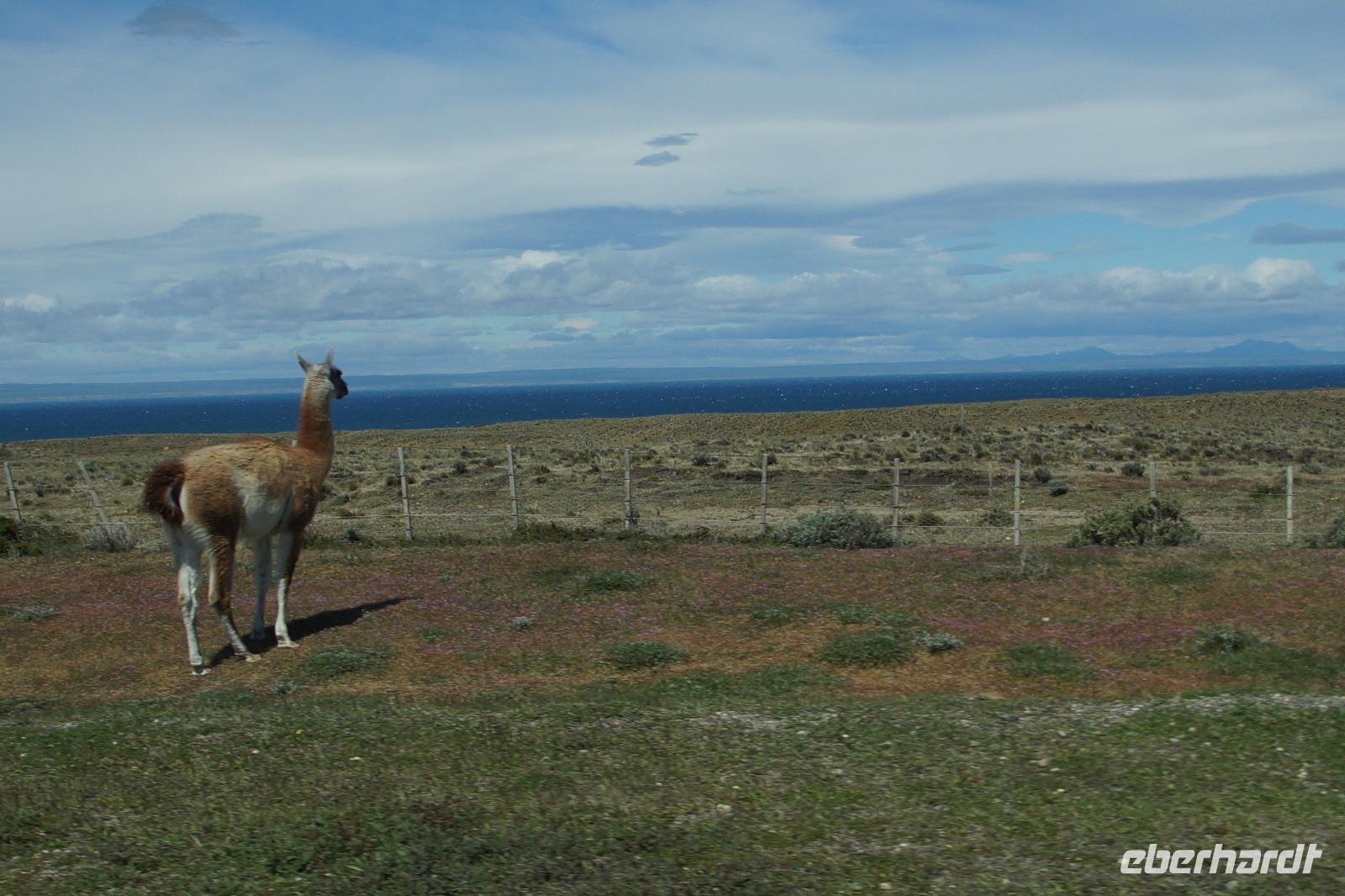 Am Zaun kreuzen die Guanacos zwischen Estancia und Park und genau das erlebten wir, als einige Guanacos, anstatt vor uns zu flüchten uns nur kurz sondierten, als Menschen wohl für harmlos erachteten und in unserer Anwesenheit den Zaun überquerten.