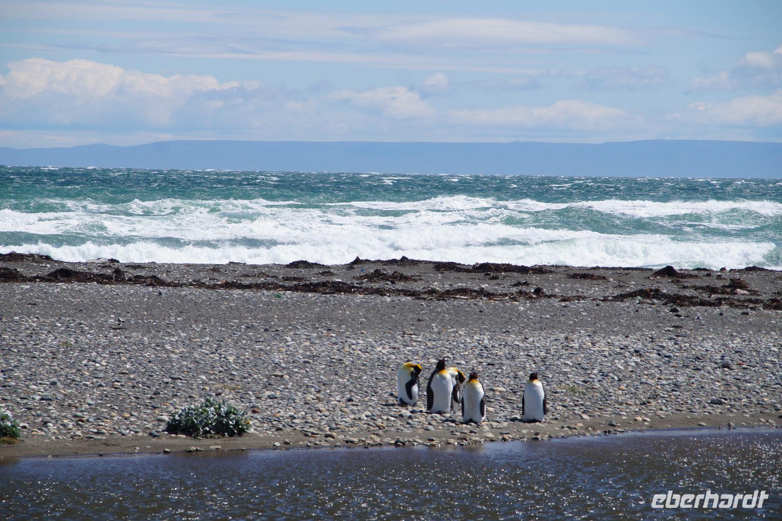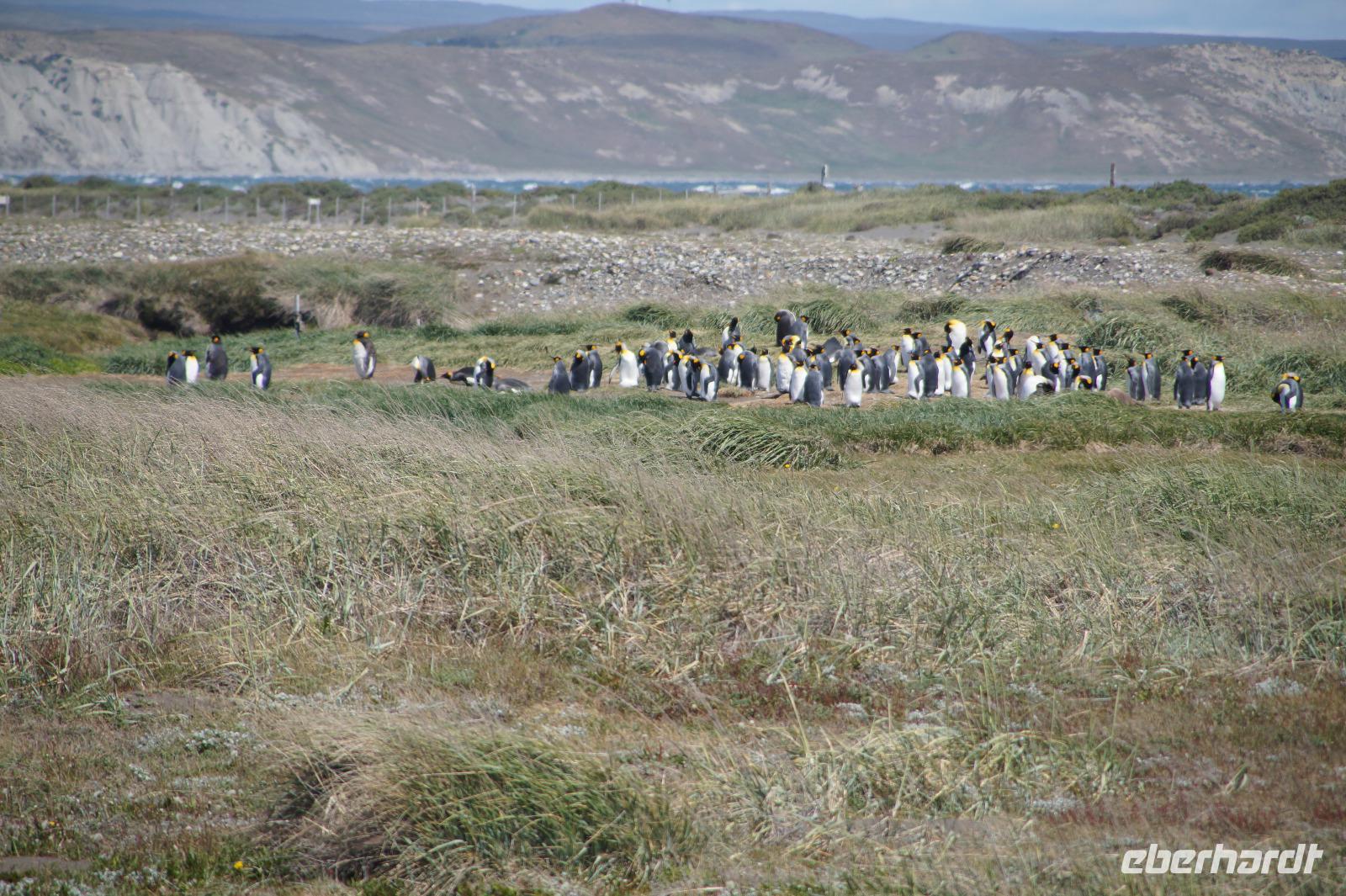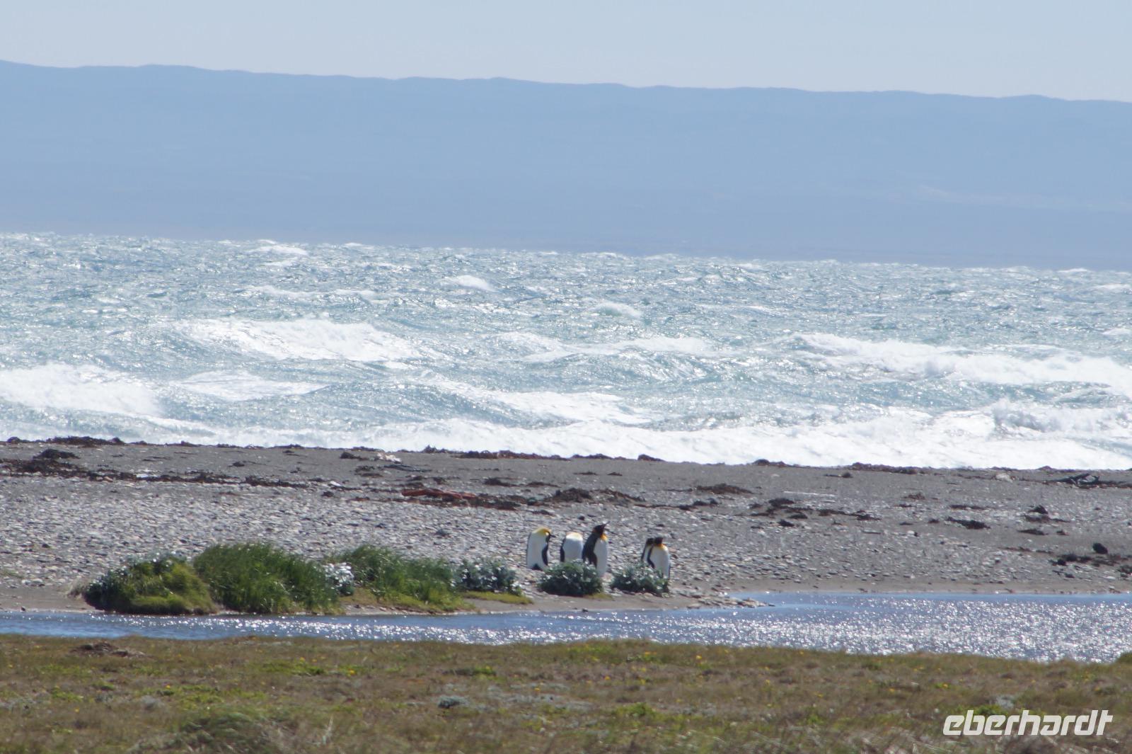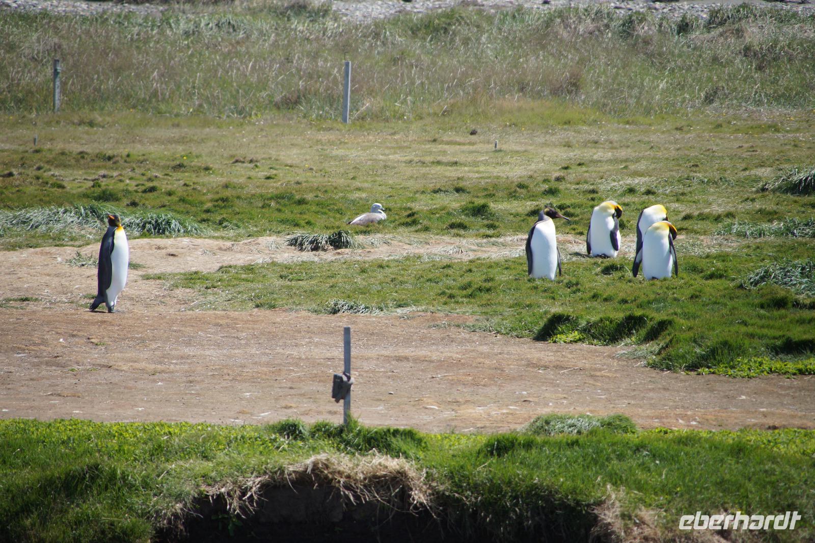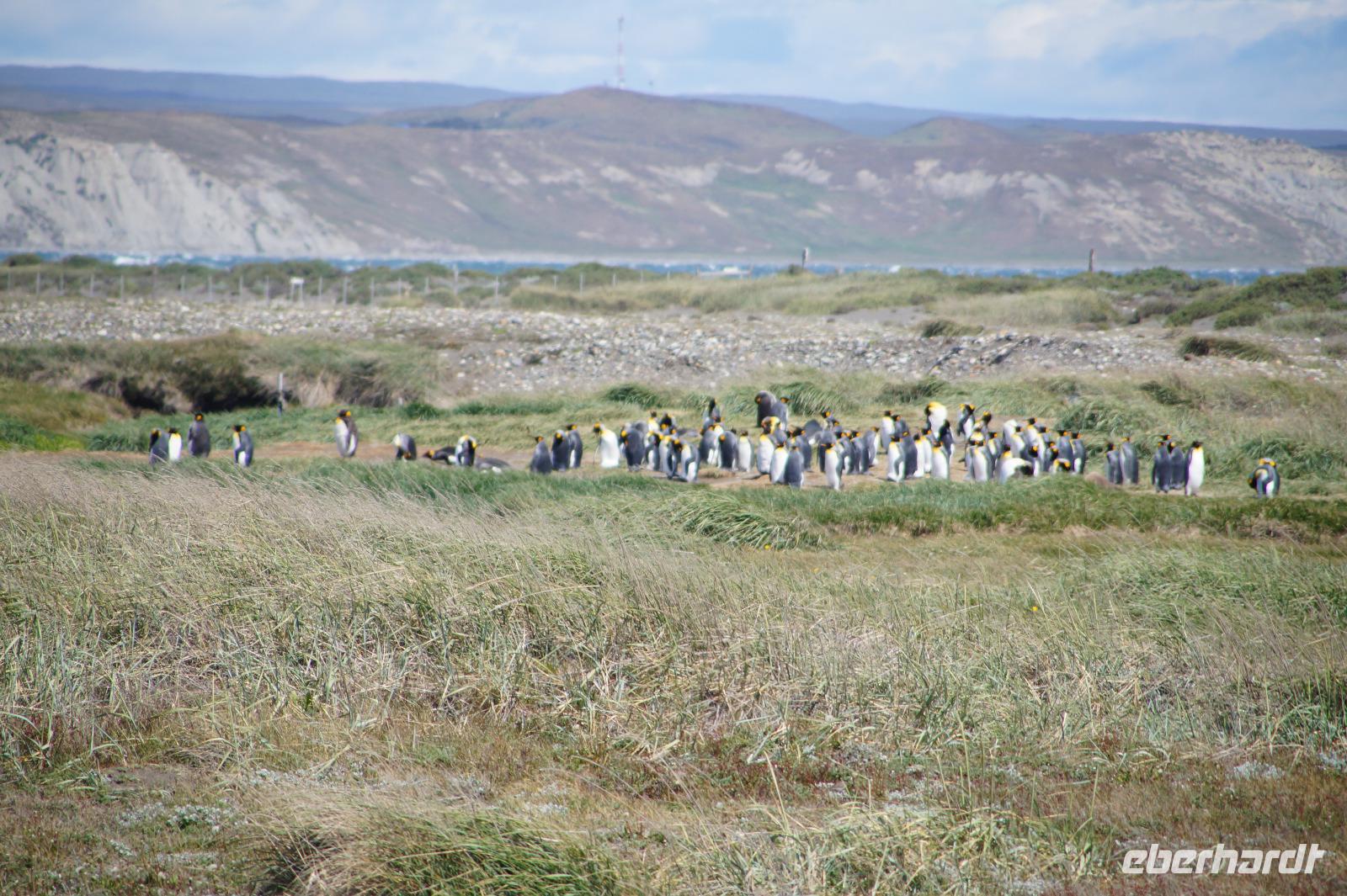 Die Königspinguinkolonie ist noch ziemlich jung, derzeit sind es etwa 90 Tiere, die regelmäßig hierherkommen, um zu brüten, die Männchen und Weibchen, so wurde uns erklärt, unterschieden sich kaum voneinander, einen ausgeprägten Dimorphismus, wie bei anderen Vogelarten gebe es nicht. Die Königspinguine sind etwa doppelt so groß, wie die Magellanpinguine und natürlich viel hübscher anzusehen. Aber auch ein bisschen wneiger aktiv. Die Schnäbel der männlichen Tiere seien - so wurde uns erklärt - etwas länger, als die der Weibchen. Nur waren wir so wiet entfernt, dass wir nur schwer ein Maßband anhalten konnten. Die Kolonie liegt von der Bahía Inútil (der unbrauchbaren Bucht) vom steifen Wind der Magellanstraße nur durch etwas Gras geschützt auf einem Schotterstrand, hinter einem Bach. Hauptfeind der Pinguinkolonie ist der patagonische Fuchs, der hin und wieder mal ein Ei stibitzt. Bei zwei Eiern auf drei Jahren ist das natürlich fatal.