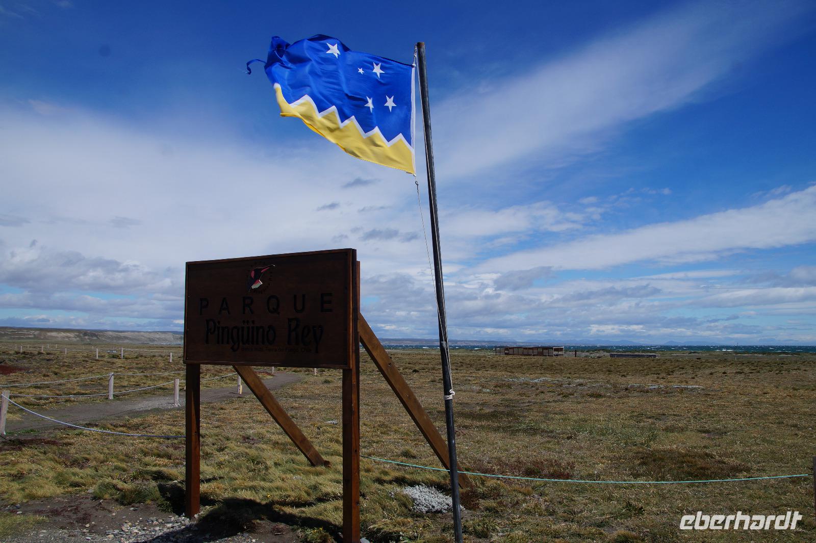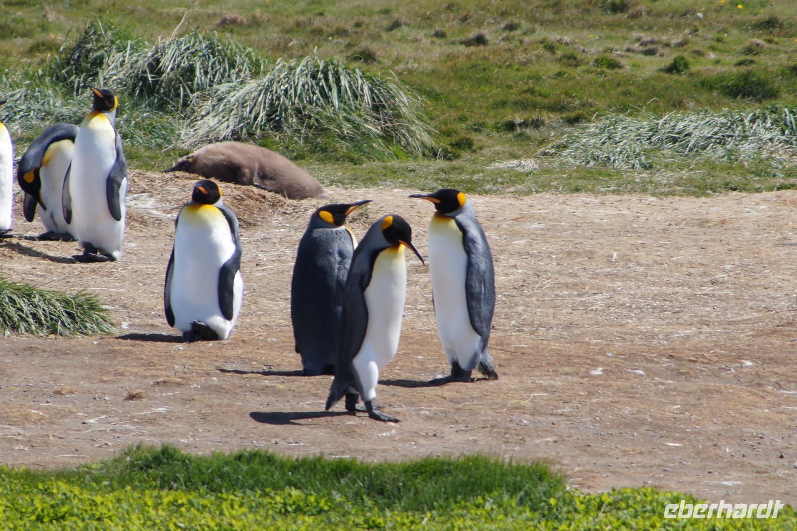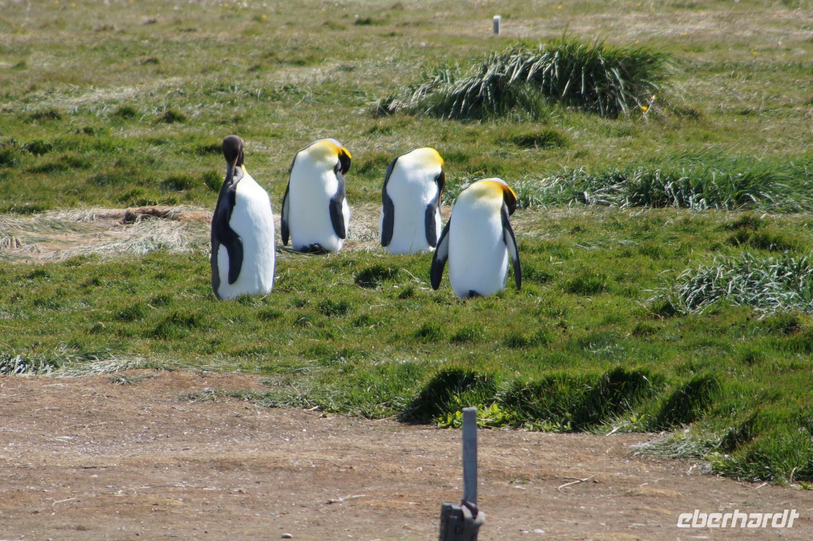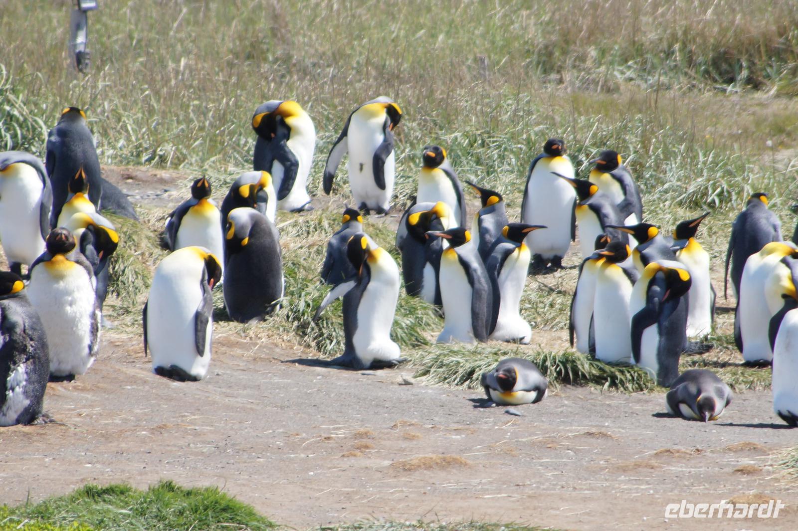 Die Königspinguinkolonie ist noch ziemlich jung, derzeit sind es etwa 90 Tiere, die regelmäßig hierherkommen, um zu brüten, die Männchen und Weibchen, so wurde uns erklärt, unterschieden sich kaum voneinander, einen ausgeprägten Dimorphismus, wie bei anderen Vogelarten gebe es nicht. Die Königspinguine sind etwa doppelt so groß, wie die Magellanpinguine und natürlich viel hübscher anzusehen. Aber auch ein bisschen wneiger aktiv. Die Schnäbel der männlichen Tiere seien - so wurde uns erklärt - etwas länger, als die der Weibchen. Nur waren wir so wiet entfernt, dass wir nur schwer ein Maßband anhalten konnten. Die Kolonie liegt von der Bahía Inútil (der unbrauchbaren Bucht) vom steifen Wind der Magellanstraße nur durch etwas Gras geschützt auf einem Schotterstrand, hinter einem Bach. Hauptfeind der Pinguinkolonie ist der patagonische Fuchs, der hin und wieder mal ein Ei stibitzt. Bei zwei Eiern auf drei Jahren ist das natürlich fatal.