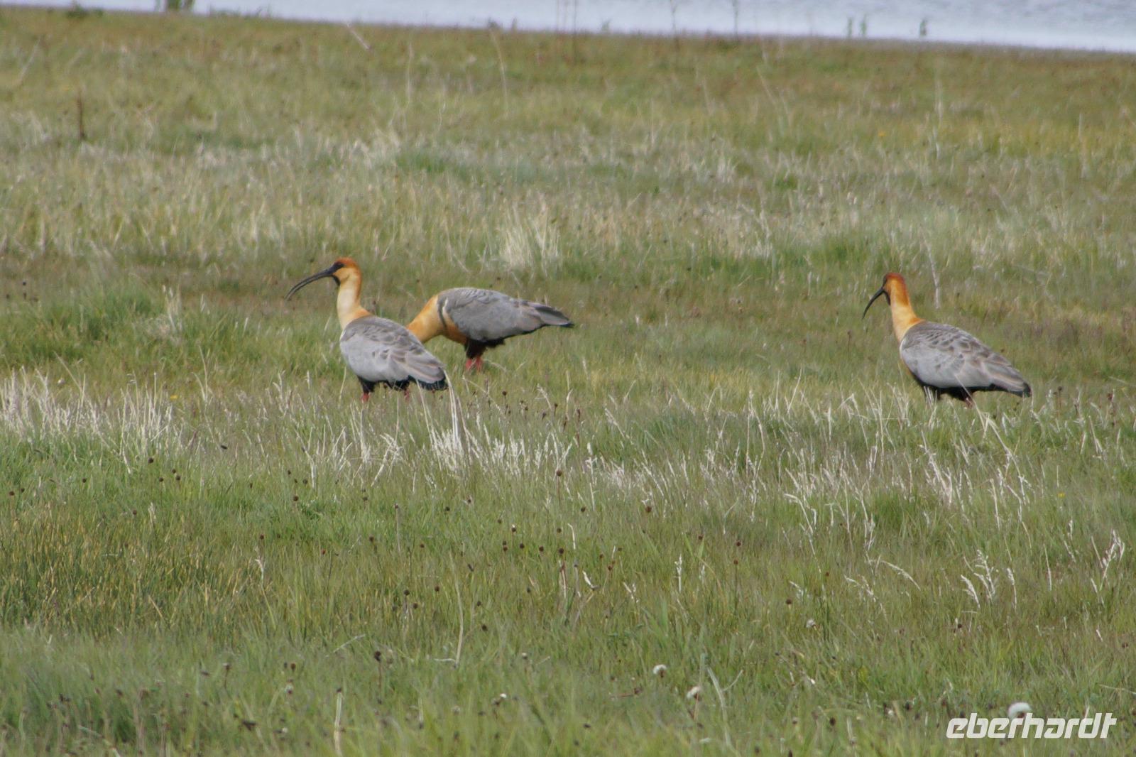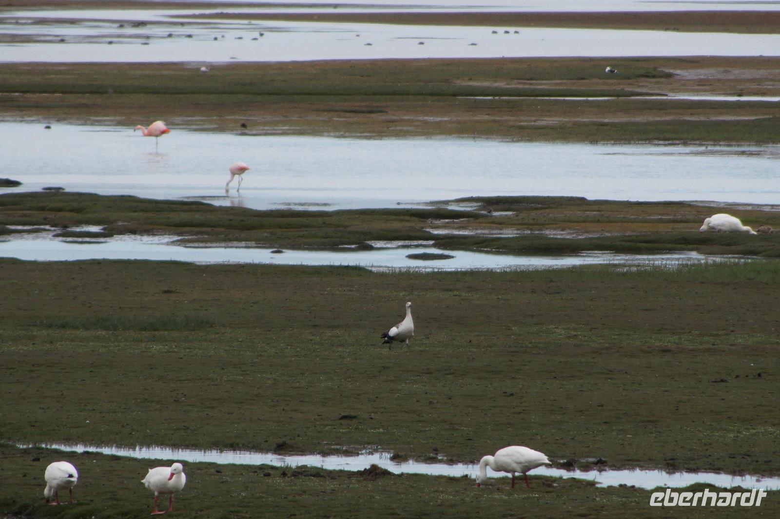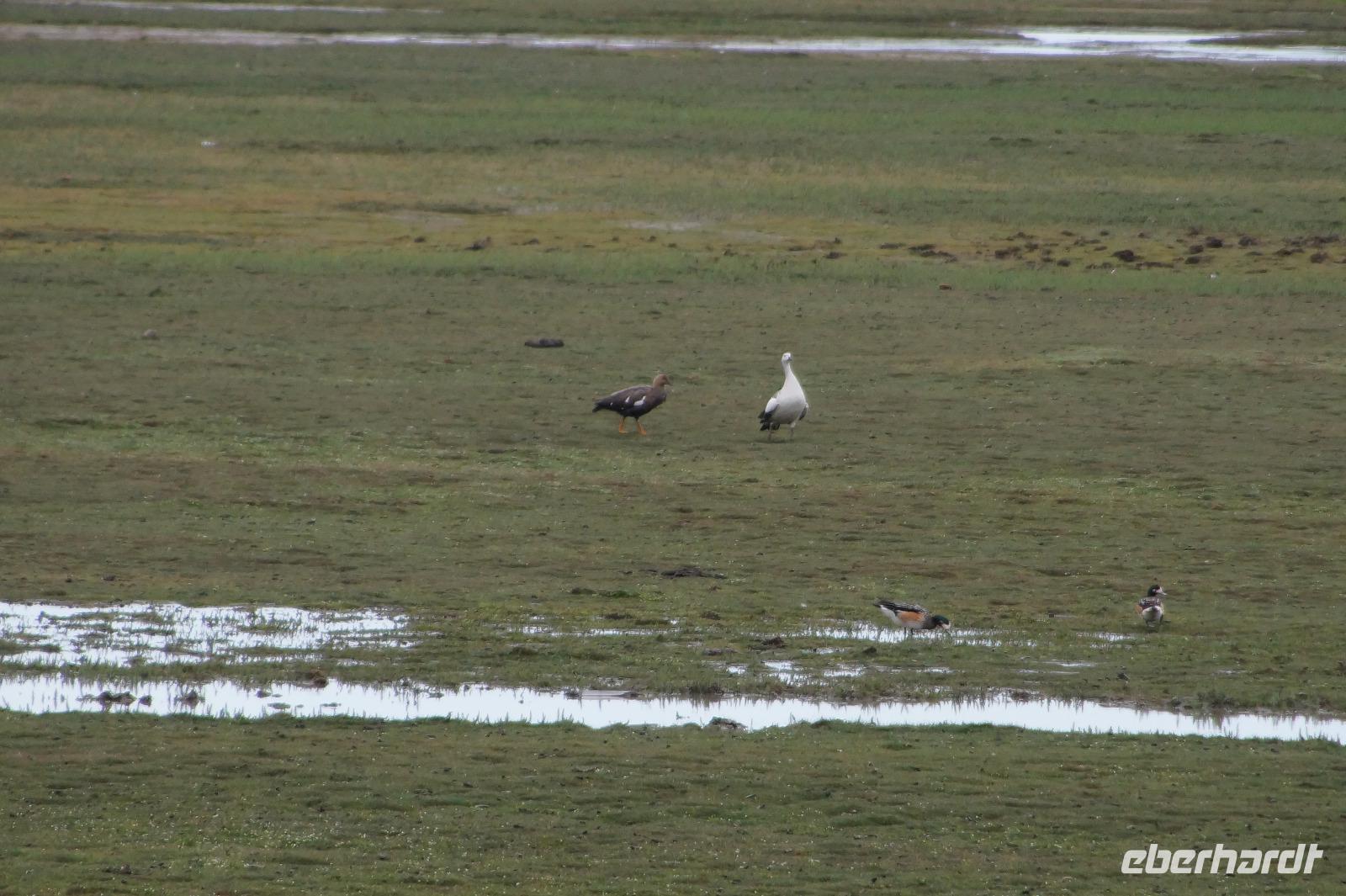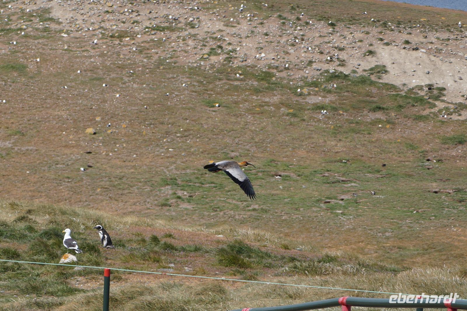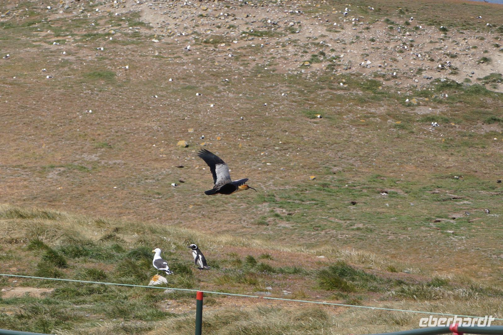 Die Königspinguinkolonie ist noch ziemlich jung, derzeit sind es etwa 90 Tiere, die regelmäßig hierherkommen, um zu brüten, die Männchen und Weibchen, so wurde uns erklärt, unterschieden sich kaum voneinander, einen ausgeprägten Dimorphismus, wie bei anderen Vogelarten gebe es nicht. Die Königspinguine sind etwa doppelt so groß, wie die Magellanpinguine und natürlich viel hübscher anzusehen. Aber auch ein bisschen wneiger aktiv. Die Schnäbel der männlichen Tiere seien - so wurde uns erklärt - etwas länger, als die der Weibchen. Nur waren wir so wiet entfernt, dass wir nur schwer ein Maßband anhalten konnten. Die Kolonie liegt von der Bahía Inútil (der unbrauchbaren Bucht) vom steifen Wind der Magellanstraße nur durch etwas Gras geschützt auf einem Schotterstrand, hinter einem Bach. Hauptfeind der Pinguinkolonie ist der patagonische Fuchs, der hin und wieder mal ein Ei stibitzt. Bei zwei Eiern auf drei Jahren ist das natürlich fatal.