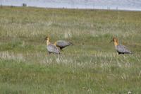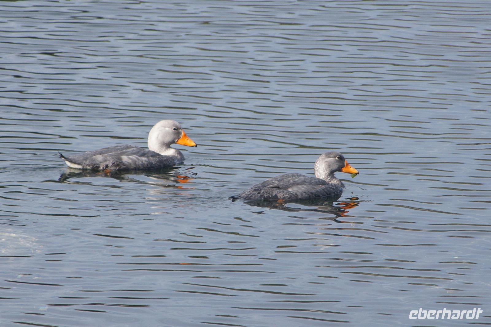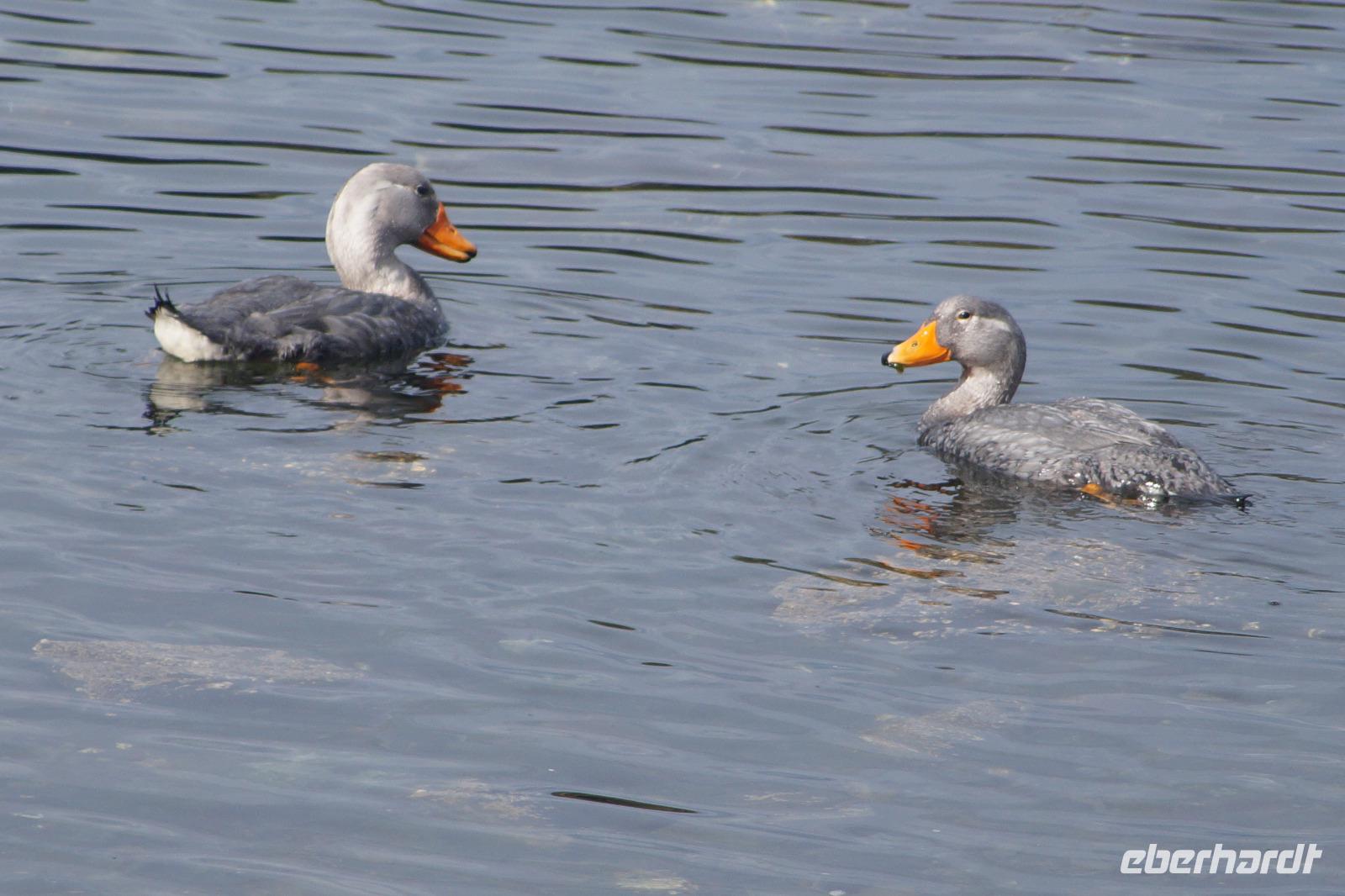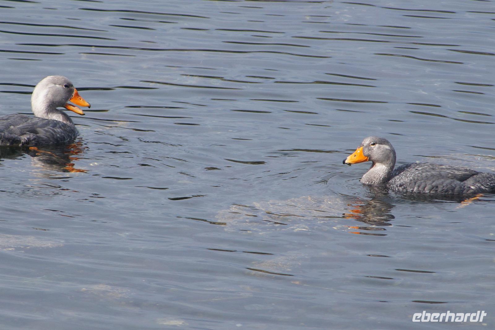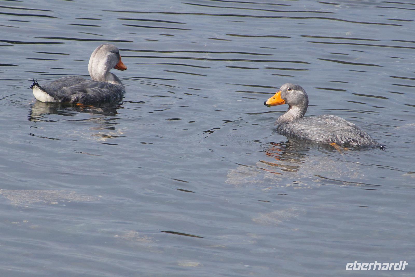 Die Königspinguinkolonie ist noch ziemlich jung, derzeit sind es etwa 90 Tiere, die regelmäßig hierherkommen, um zu brüten, die Männchen und Weibchen, so wurde uns erklärt, unterschieden sich kaum voneinander, einen ausgeprägten Dimorphismus, wie bei anderen Vogelarten gebe es nicht. Die Königspinguine sind etwa doppelt so groß, wie die Magellanpinguine und natürlich viel hübscher anzusehen. Aber auch ein bisschen wneiger aktiv. Die Schnäbel der männlichen Tiere seien - so wurde uns erklärt - etwas länger, als die der Weibchen. Nur waren wir so wiet entfernt, dass wir nur schwer ein Maßband anhalten konnten. Die Kolonie liegt von der Bahía Inútil (der unbrauchbaren Bucht) vom steifen Wind der Magellanstraße nur durch etwas Gras geschützt auf einem Schotterstrand, hinter einem Bach. Hauptfeind der Pinguinkolonie ist der patagonische Fuchs, der hin und wieder mal ein Ei stibitzt. Bei zwei Eiern auf drei Jahren ist das natürlich fatal.