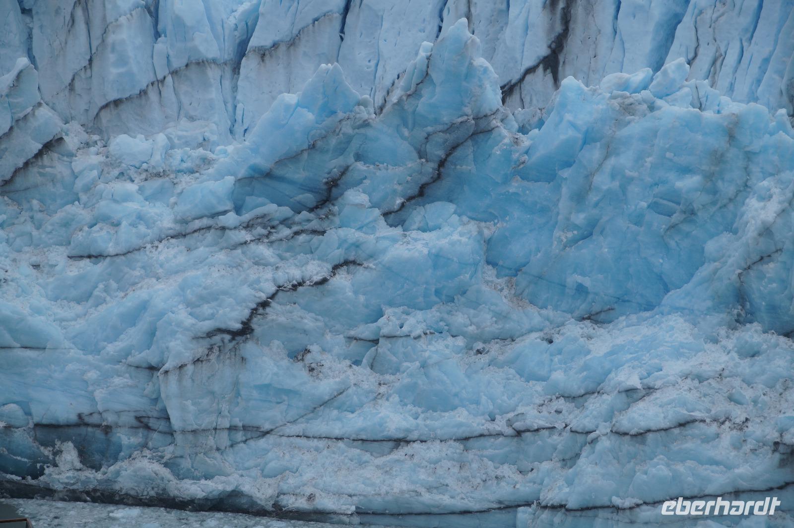 Dunkle Bänder im Eis stammen von Lawinenabgängen auf den Gletscher und Stürmen, es handelt sich um Fels, Staub und organisches Material.