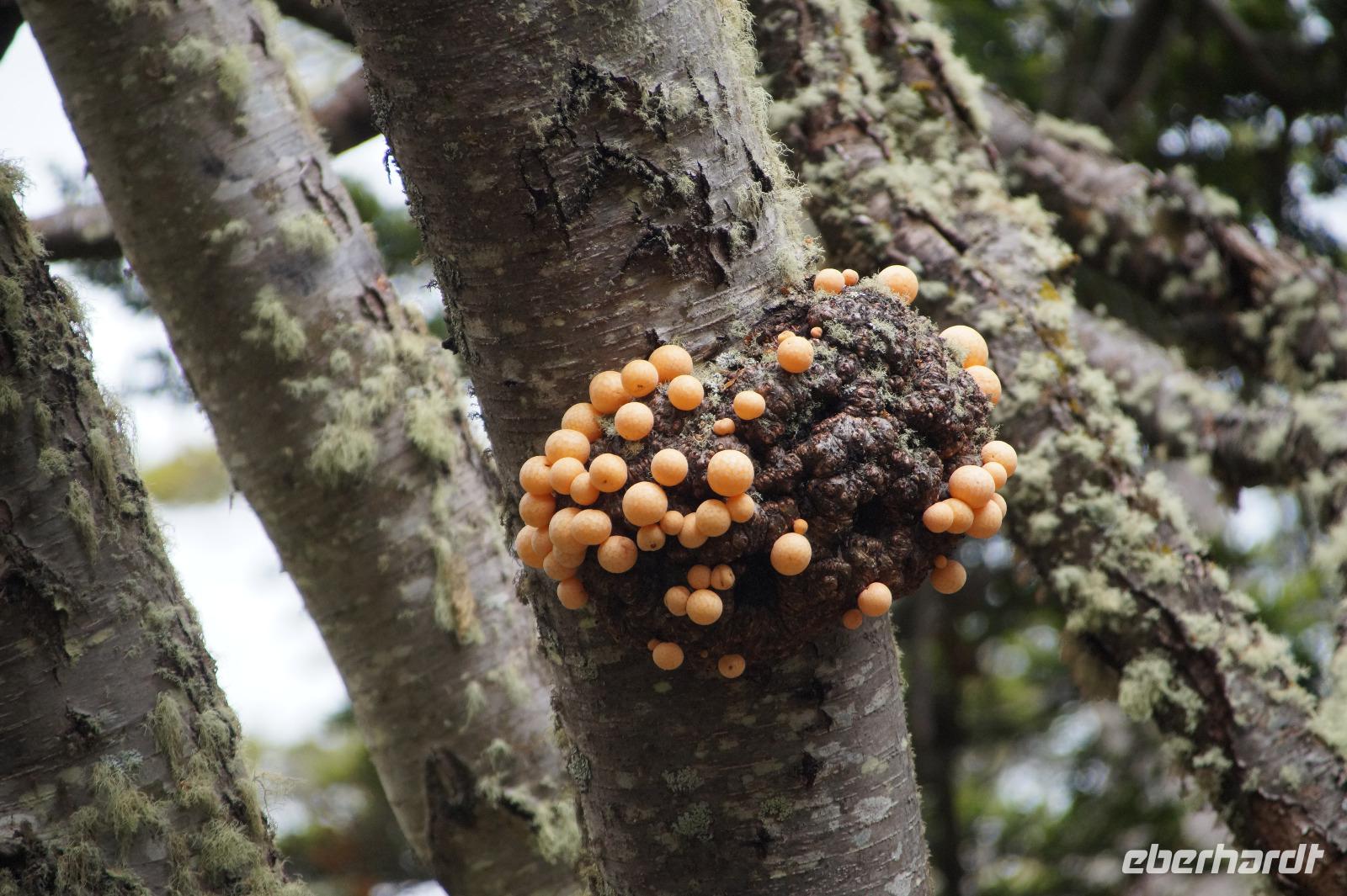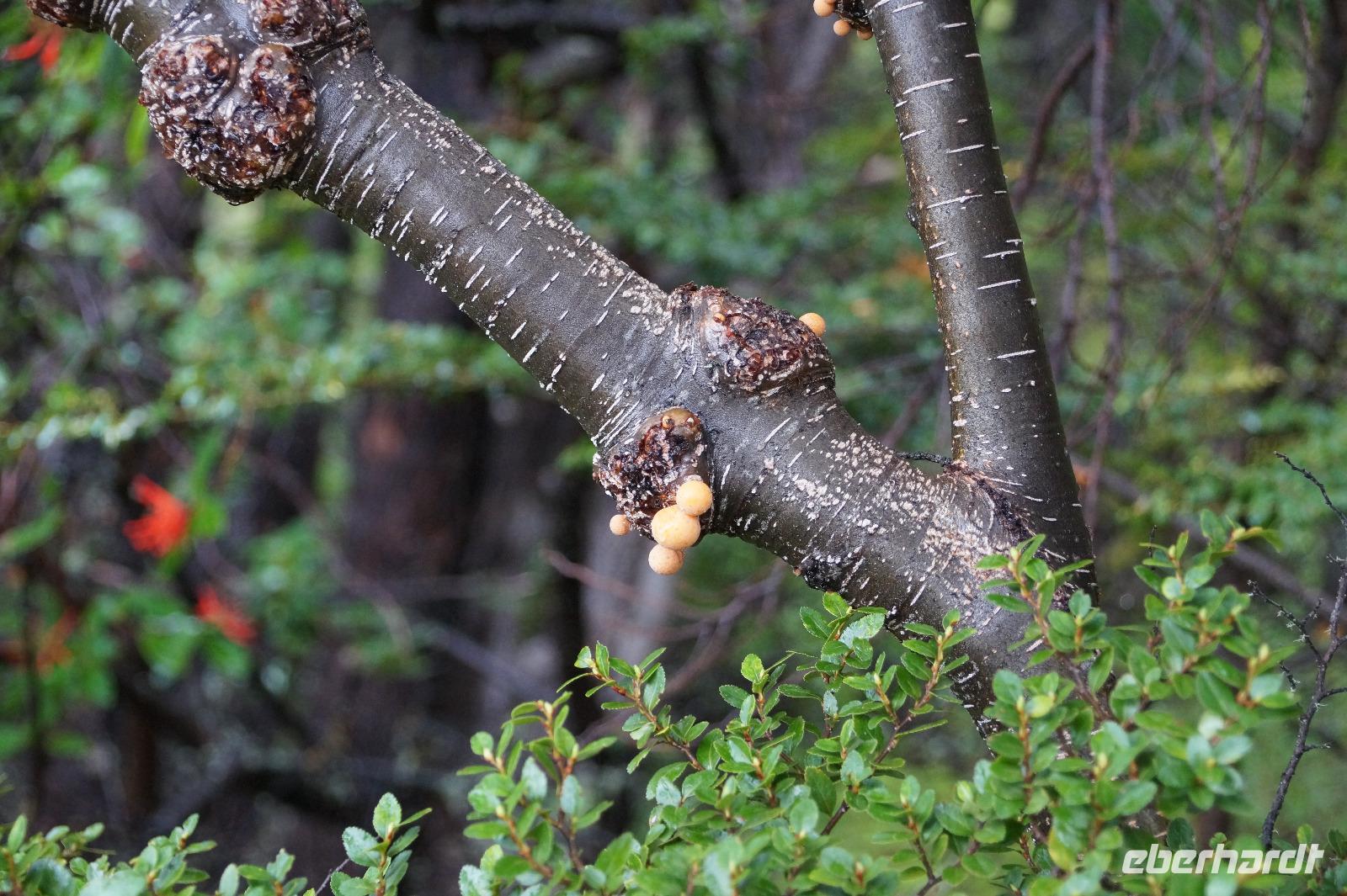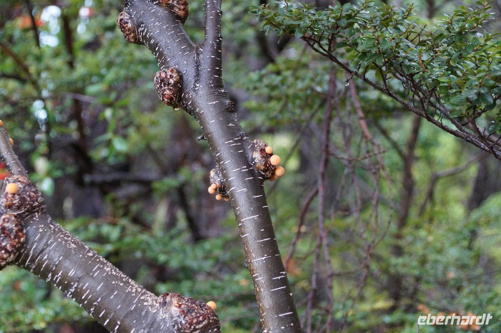 Vitamine konnte sich die indianische Urbevölkerung z.B. anhand von Baumpilzen holen, die man überall an den Nothofagen sieht. Diese Pilze verursachen geschwürartige Wucherungen an den Bäumen, aus denen wiederum die süßlich schmeckenden orangenen Fruchtkörper dieser Pilze wachsen, auf Spanisch als Pan del Indio (Indianerbrot) auf Mapundungun (die Sprache der zentralpatgonischen Mapuche) als Llao Llao ('süß', 'wunderbar') bekannt. Einige von uns trauten sich, die Pilze zu probieren. Dabei ist es wichtig, dass die Fruchtkörper viel Sonne abbekommen haben, je mehr, desto süßer bzw. intensiver der Geschmack, je weniger, desto nichtssagender.