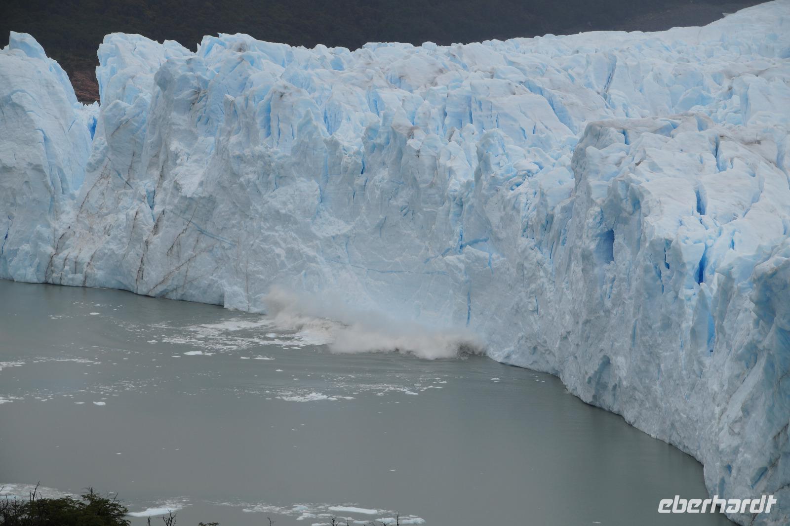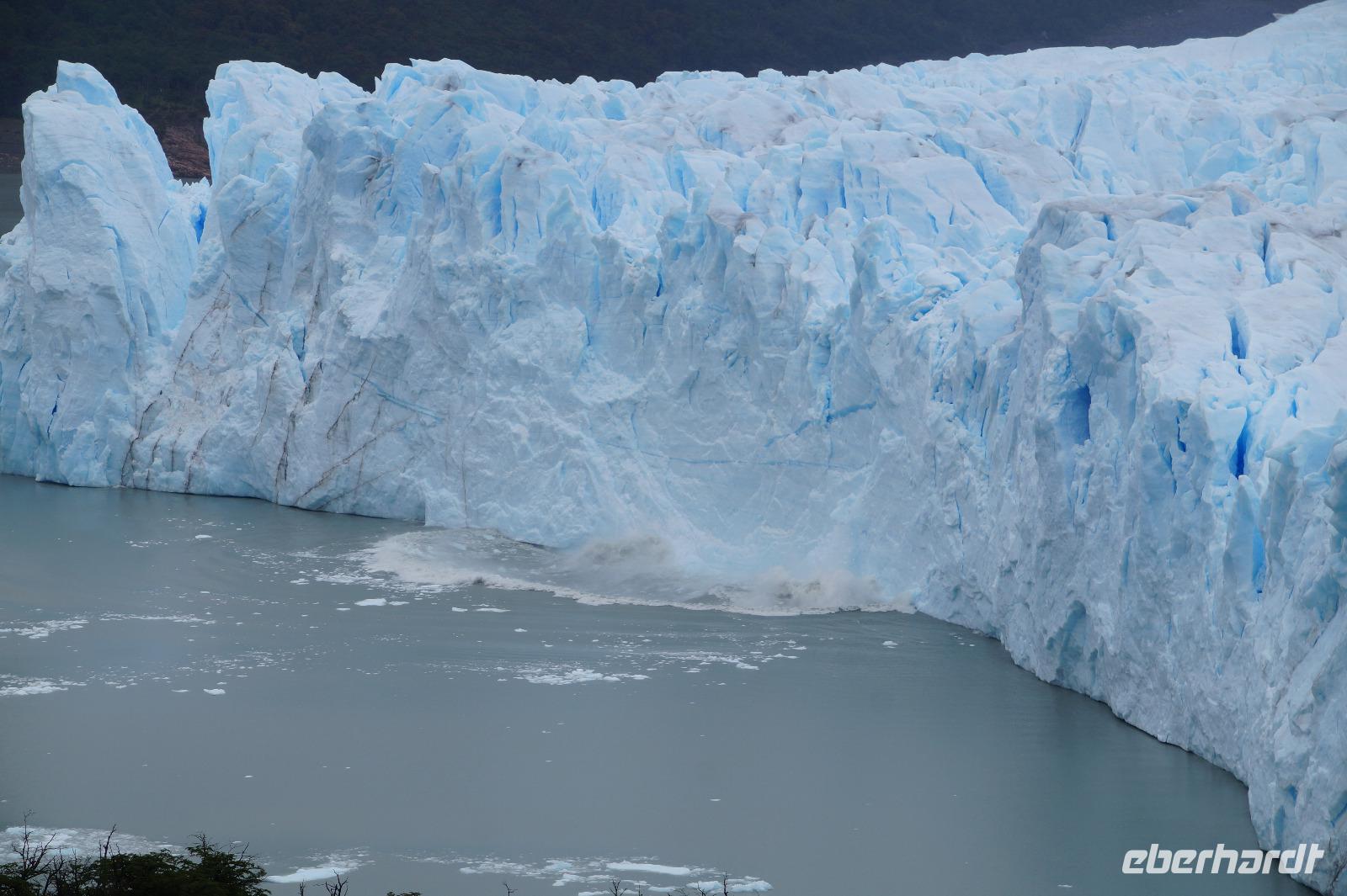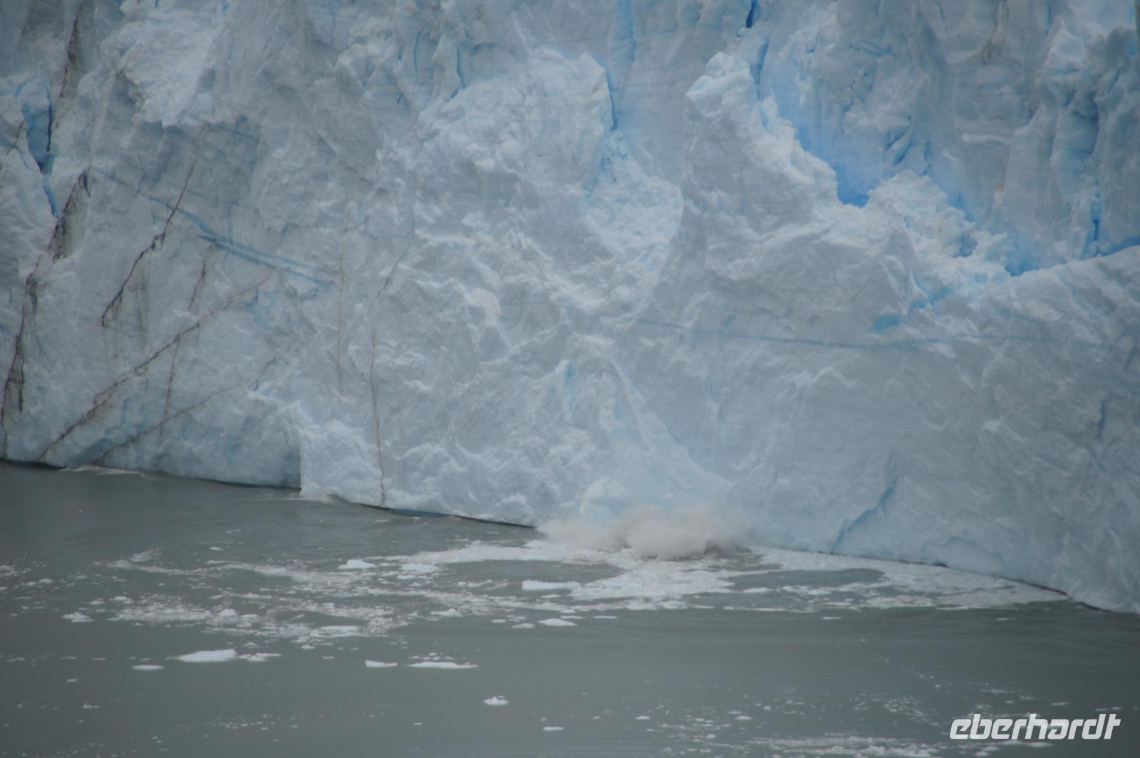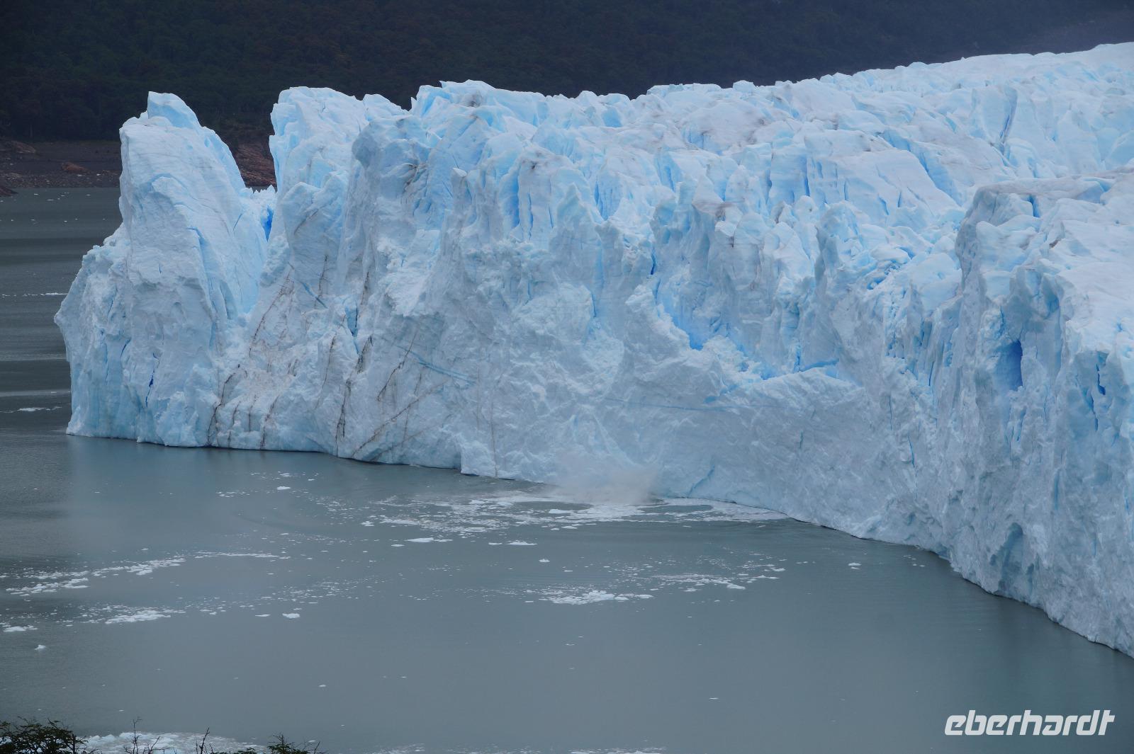 Nach diesen und anderen Erklärungen von Rocío wanderten wir je nach eigenem Gusto an der Gletscherfront entlang (wir befanden uns auf der Magellanhalbinsel im Argentino-See, die den Perito Moreno gewissermaßen „stoppt“). Vor uns knackte der Gletscher und hin und wieder fielen mit lautem Krachen Eisbrocken in den See. Aufgrund der Größe des Gletschers natürlich mit dem Effekt, dass man, wenn es krachte und plumpste, den Kopf erst nach dem eigentlichen Geschehen in die richtige Richtung drehte, wenn alles schon vorbei war. Nur, wenn man zufällig in die richtige Richtung sah, konnte man das Geschehen beobachten und mit kleiner Zeitverzögerung das zugehörige Geräusch hören.