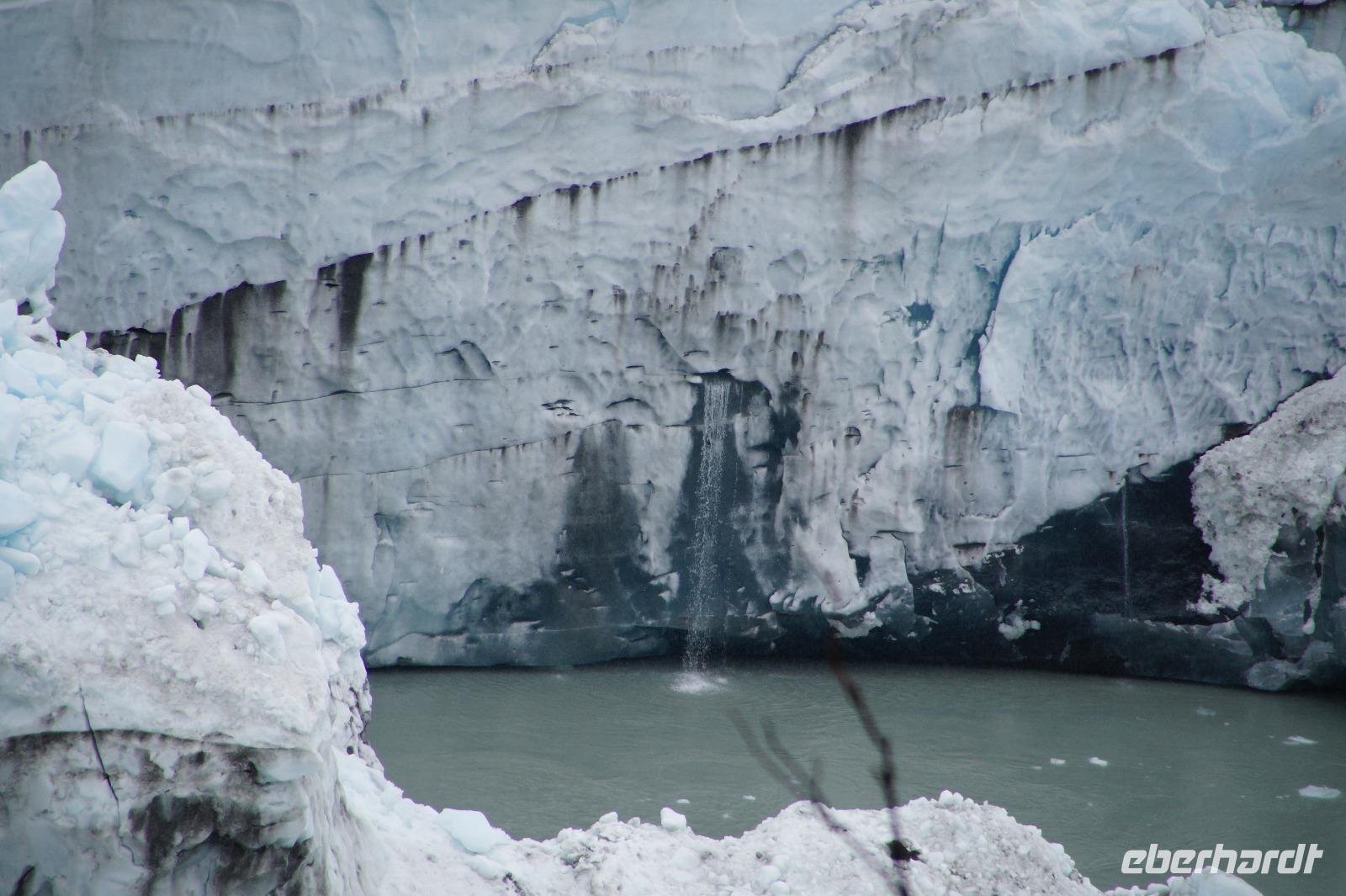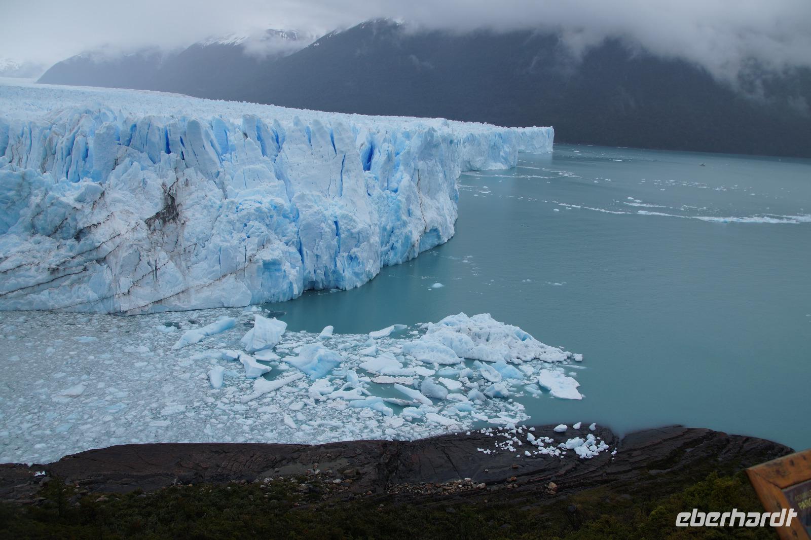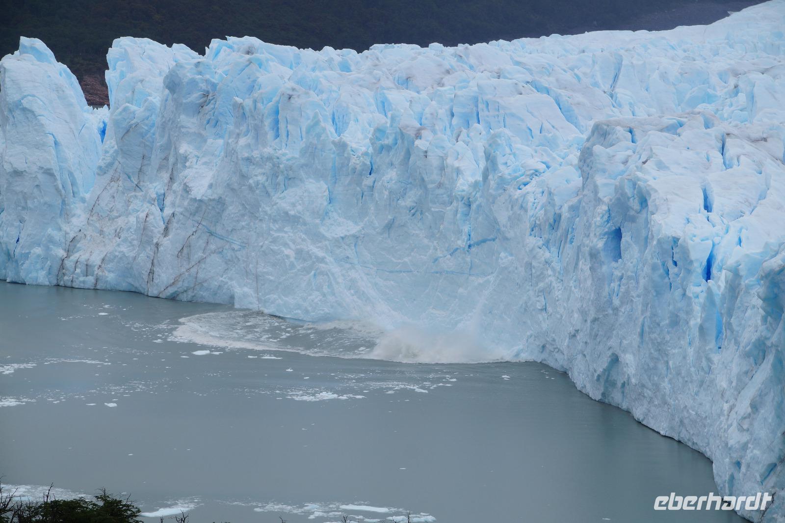 Nach diesen und anderen Erklärungen von Rocío wanderten wir je nach eigenem Gusto an der Gletscherfront entlang (wir befanden uns auf der Magellanhalbinsel im Argentino-See, die den Perito Moreno gewissermaßen „stoppt“). Vor uns knackte der Gletscher und hin und wieder fielen mit lautem Krachen Eisbrocken in den See. Aufgrund der Größe des Gletschers natürlich mit dem Effekt, dass man, wenn es krachte und plumpste, den Kopf erst nach dem eigentlichen Geschehen in die richtige Richtung drehte, wenn alles schon vorbei war. Nur, wenn man zufällig in die richtige Richtung sah, konnte man das Geschehen beobachten und mit kleiner Zeitverzögerung das zugehörige Geräusch hören.