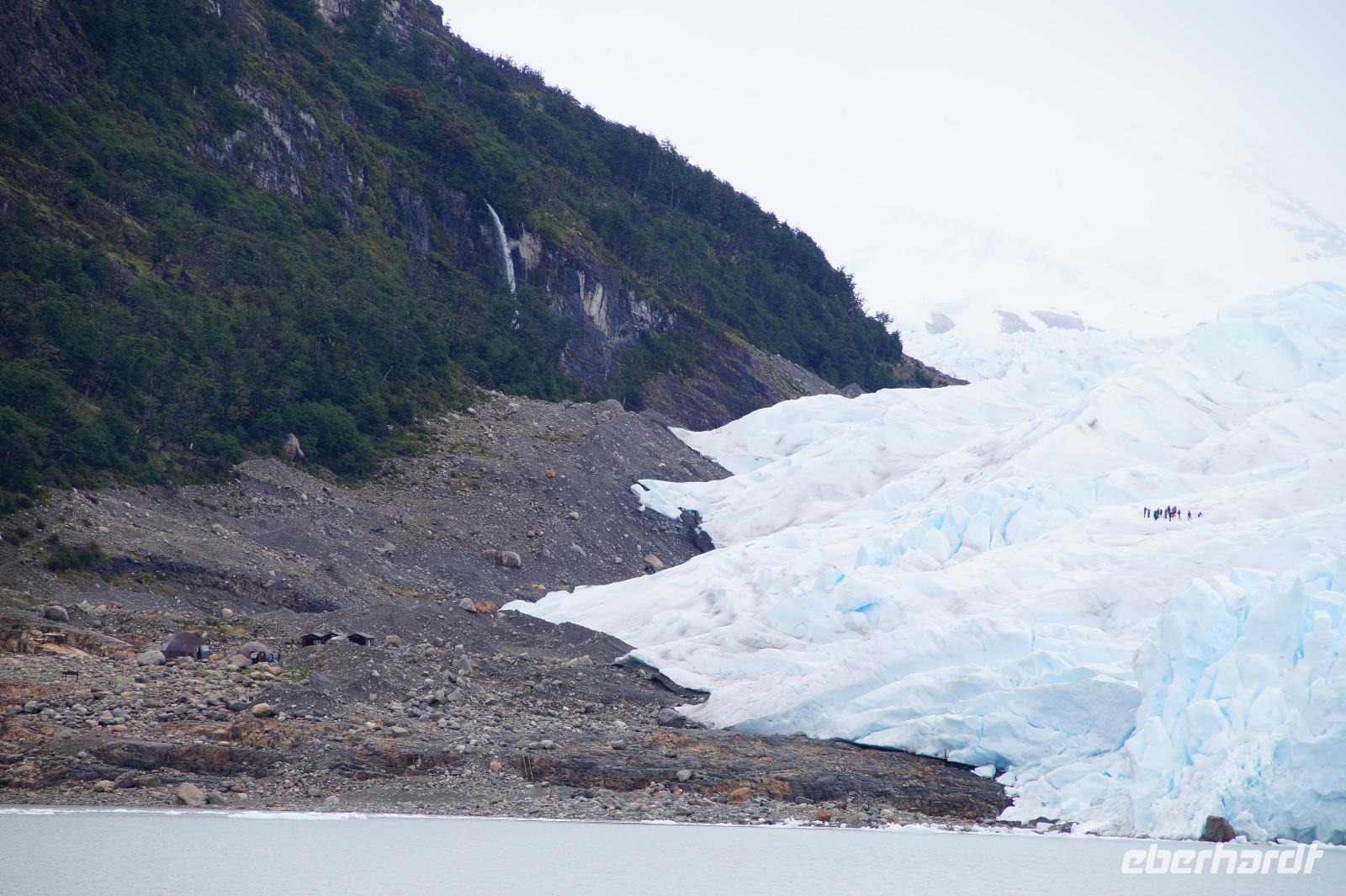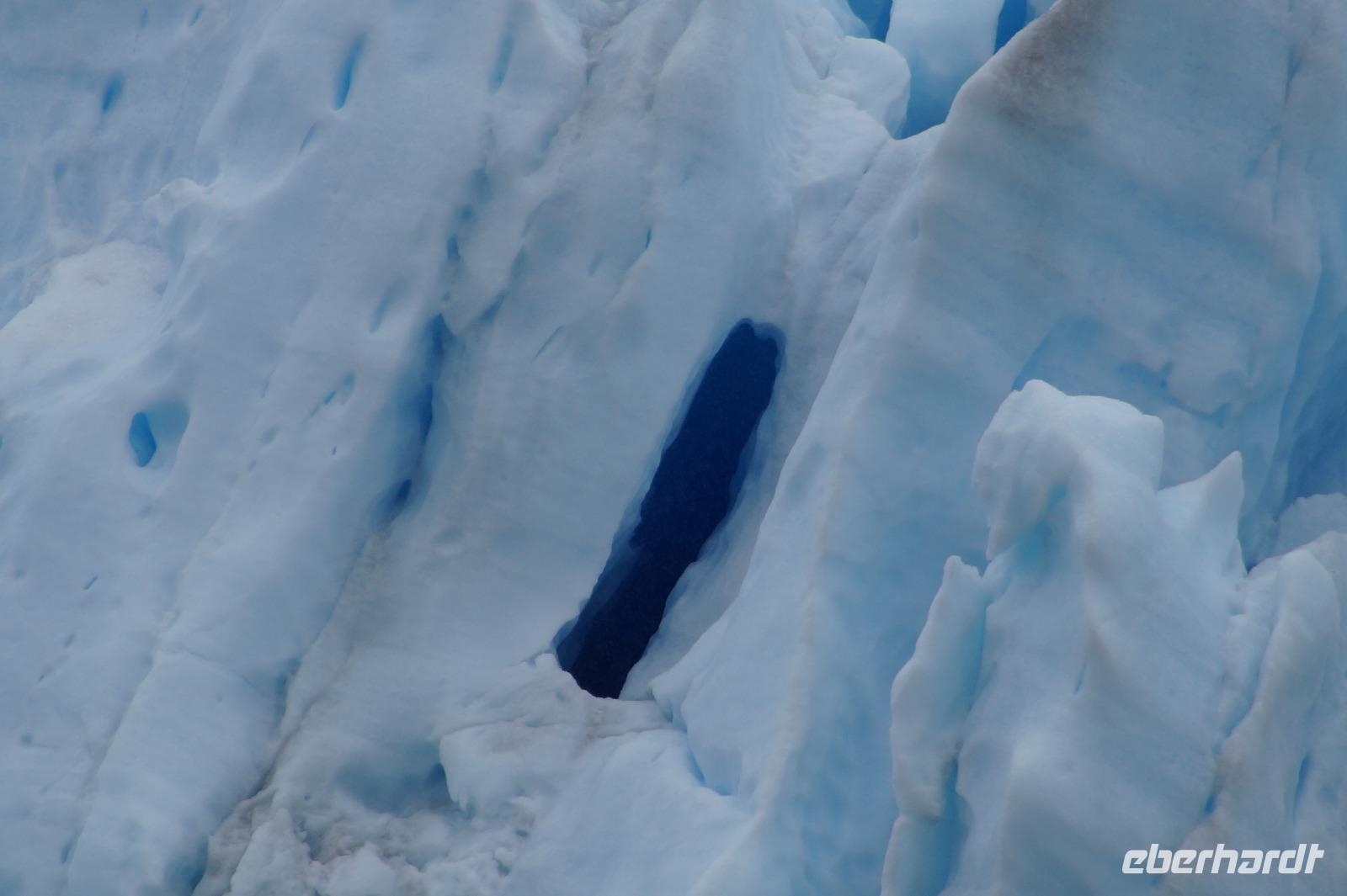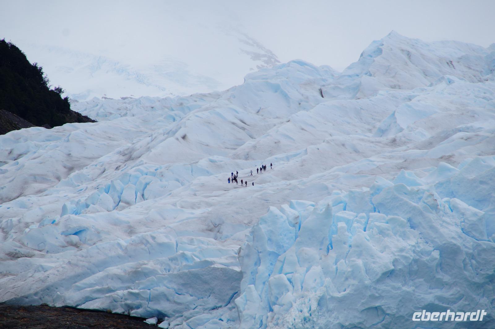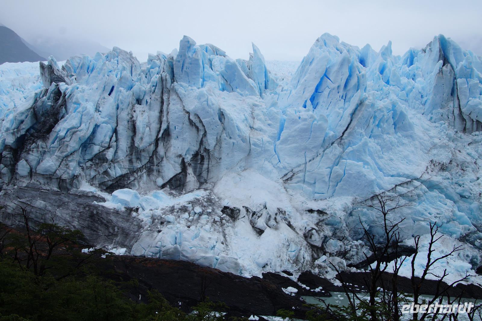 Nach diesen und anderen Erklärungen von Rocío wanderten wir je nach eigenem Gusto an der Gletscherfront entlang (wir befanden uns auf der Magellanhalbinsel im Argentino-See, die den Perito Moreno gewissermaßen „stoppt“). Vor uns knackte der Gletscher und hin und wieder fielen mit lautem Krachen Eisbrocken in den See. Aufgrund der Größe des Gletschers natürlich mit dem Effekt, dass man, wenn es krachte und plumpste, den Kopf erst nach dem eigentlichen Geschehen in die richtige Richtung drehte, wenn alles schon vorbei war. Nur, wenn man zufällig in die richtige Richtung sah, konnte man das Geschehen beobachten und mit kleiner Zeitverzögerung das zugehörige Geräusch hören.