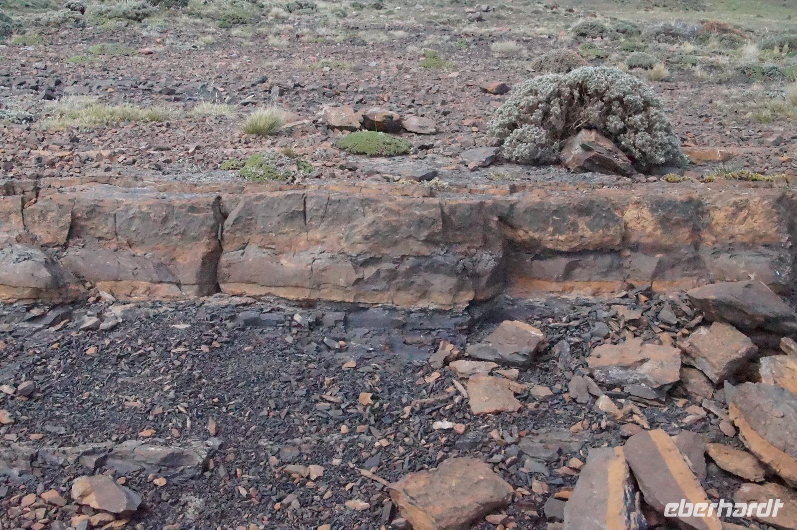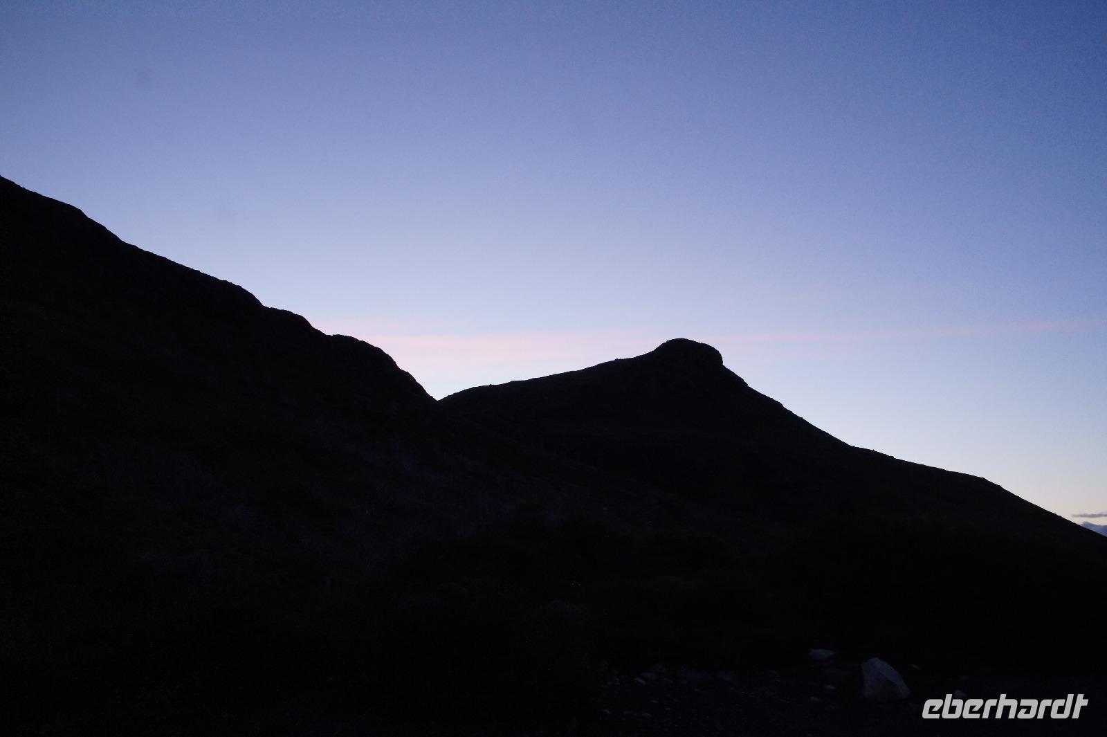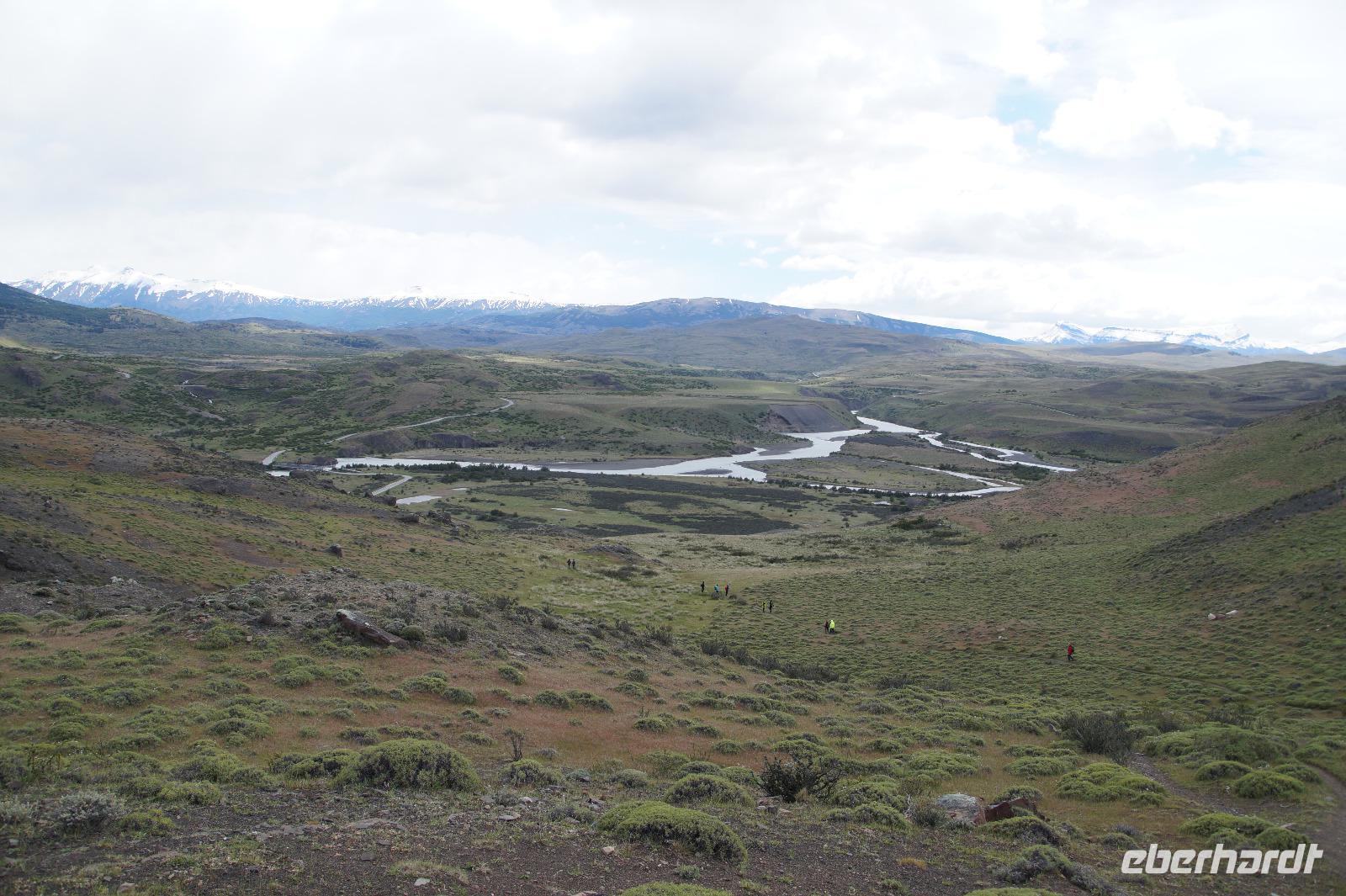 Nein, die Wirklichkeit sah etwas anders aus: es war anstrengend, die Sonne knallte von oben herab, so, dass man sich seiner Kleiderschichten entledigte, woraufhin der Wind auffrischte, so dass man sie wieder anzog. Bisher hatten wir auf sechs Kilometer verteilt 295 m erklommen. Nun ging es in knapp einem Kilometer von 750 m NN auf 1170 m NN, wir überwanden also einen Höhenunterschied von 420 m. Aus dem Río Blanco konnten wir frisches Gletscherwasser schöpfen und unsere entleerten Trinkflaschen wieder auffüllen.