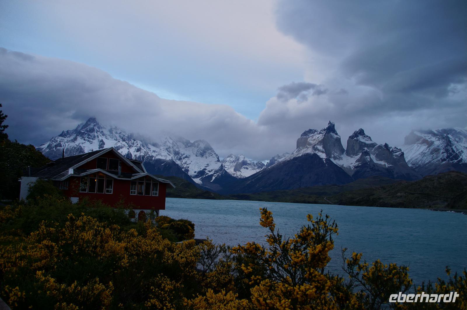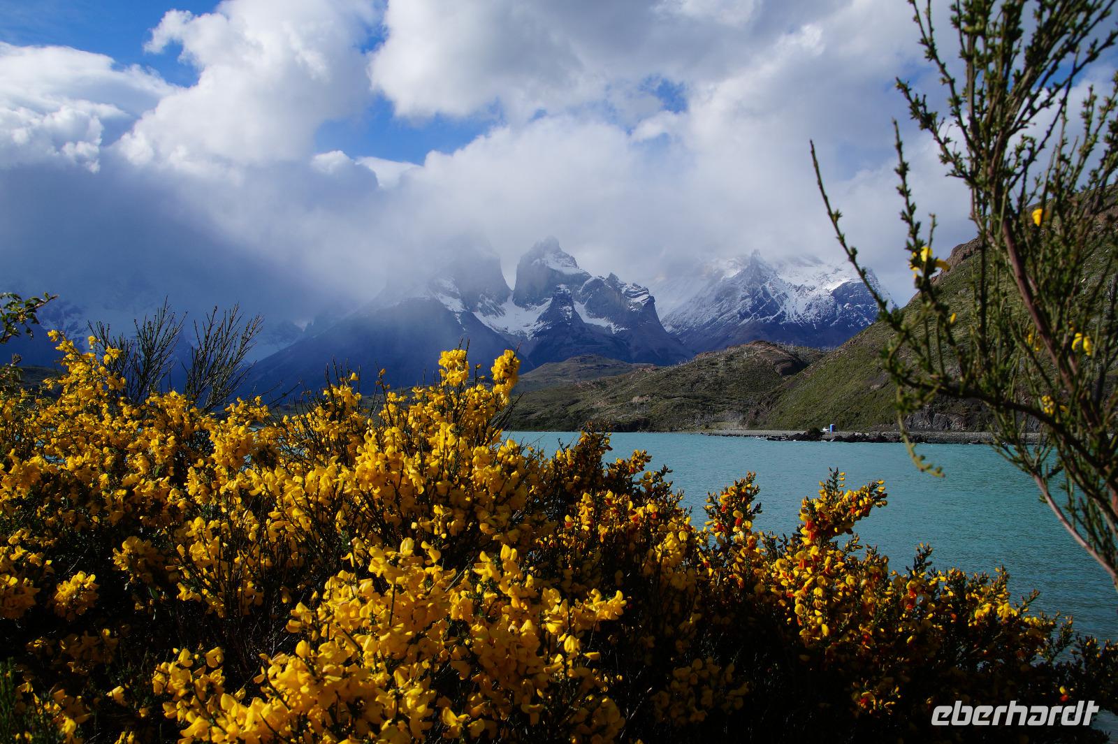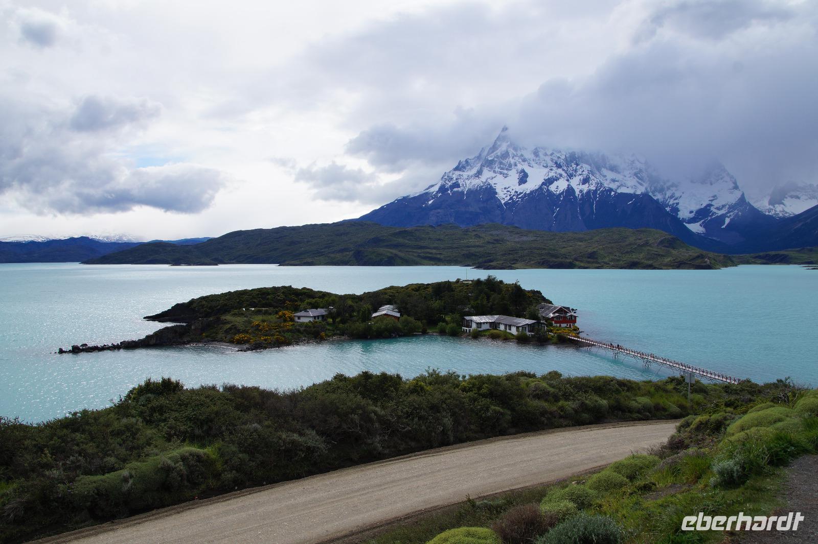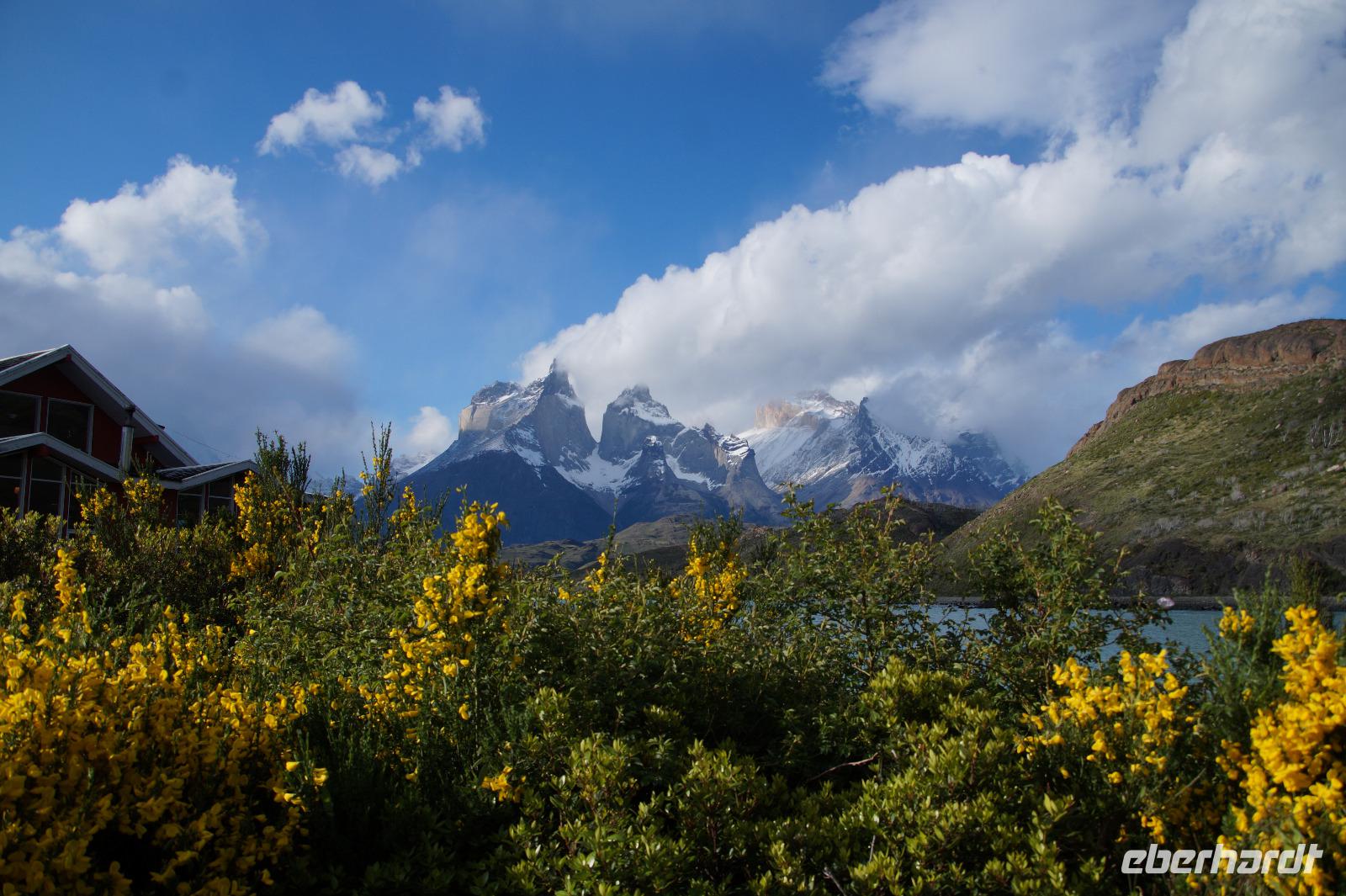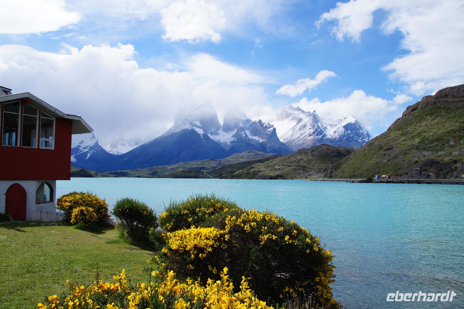 Über eine abenteuerliche Brücke erreichten wir das Hotel, das zwischen gelb und gelb-rot blühenden Ginsterbüschen romantisch auf einer Insel im Pehoé-See lag.