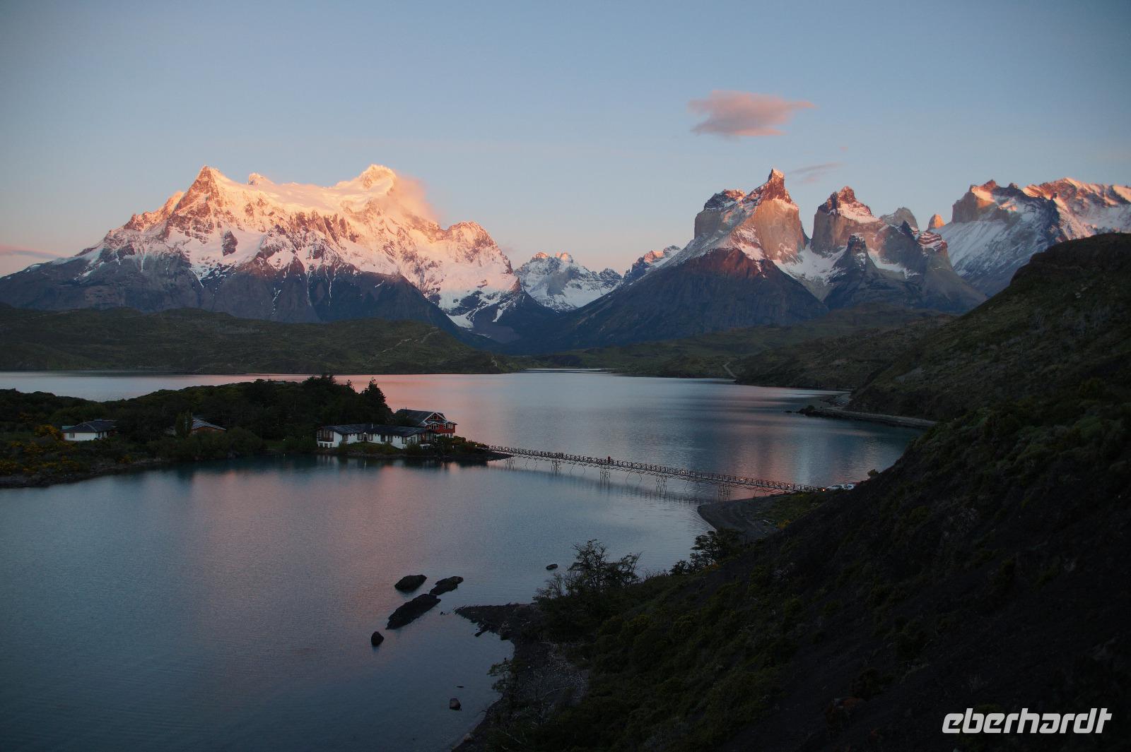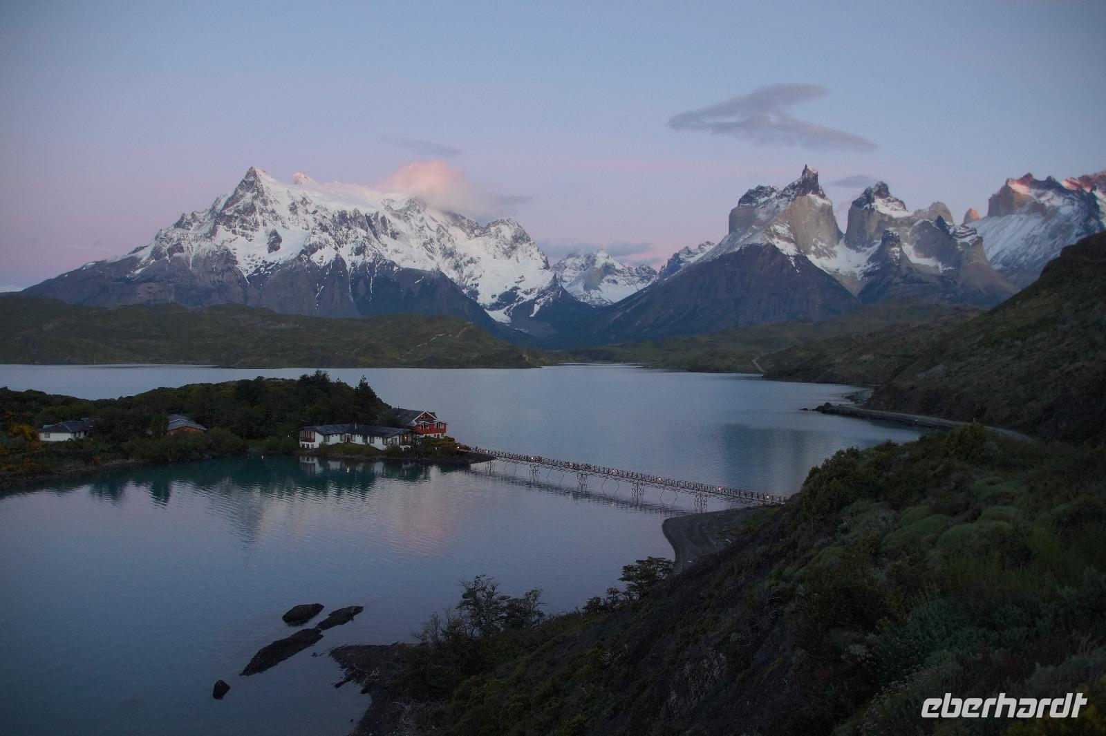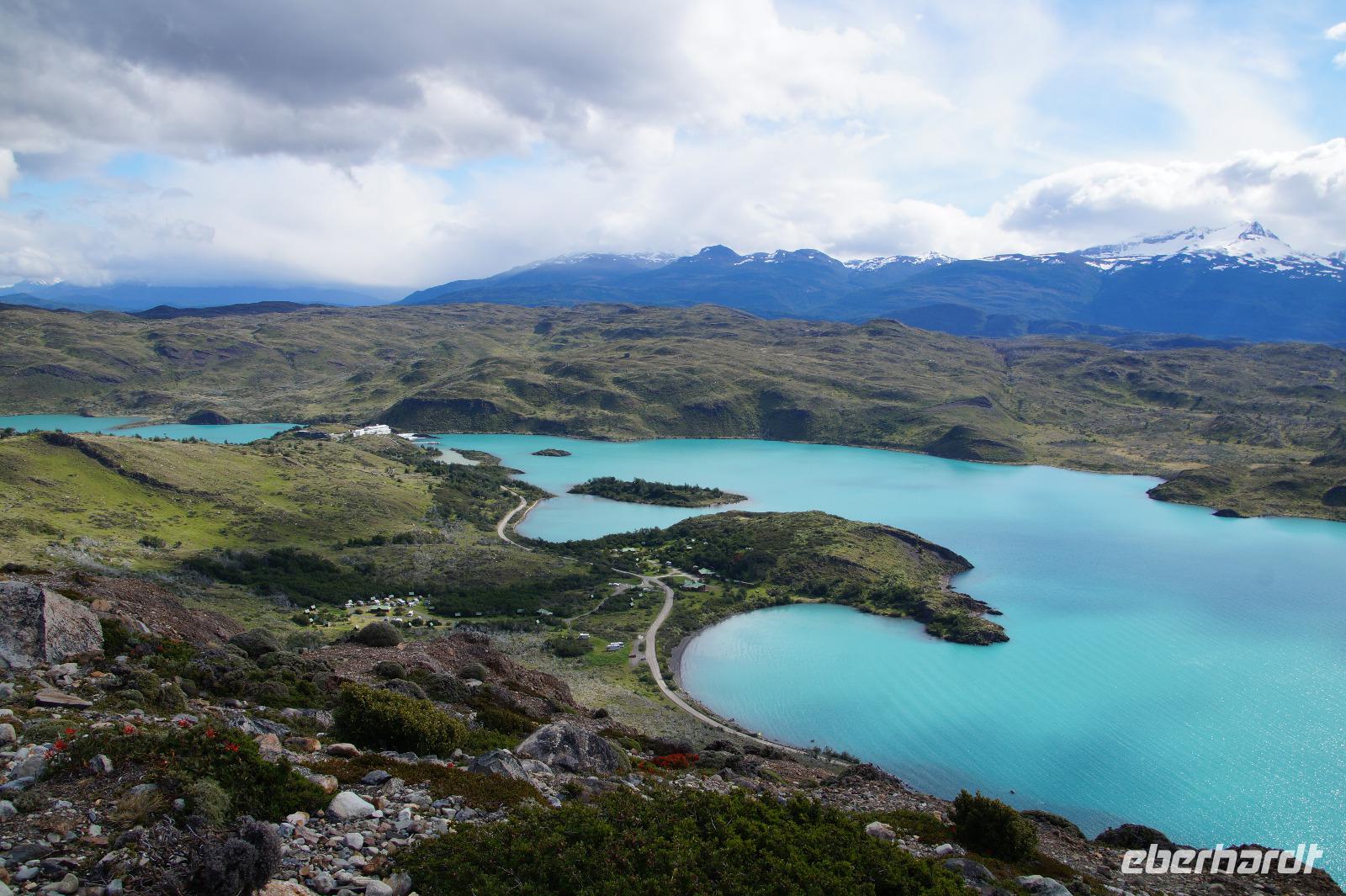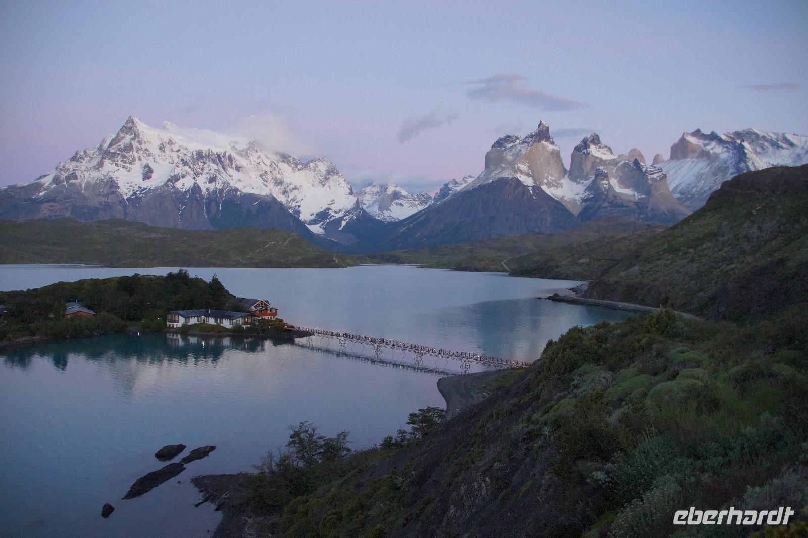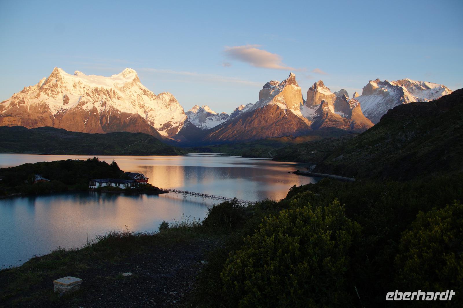 Über eine abenteuerliche Brücke erreichten wir das Hotel, das zwischen gelb und gelb-rot blühenden Ginsterbüschen romantisch auf einer Insel im Pehoé-See lag.