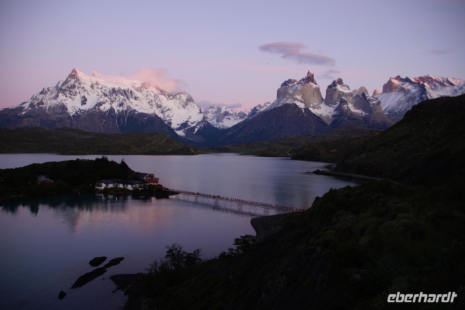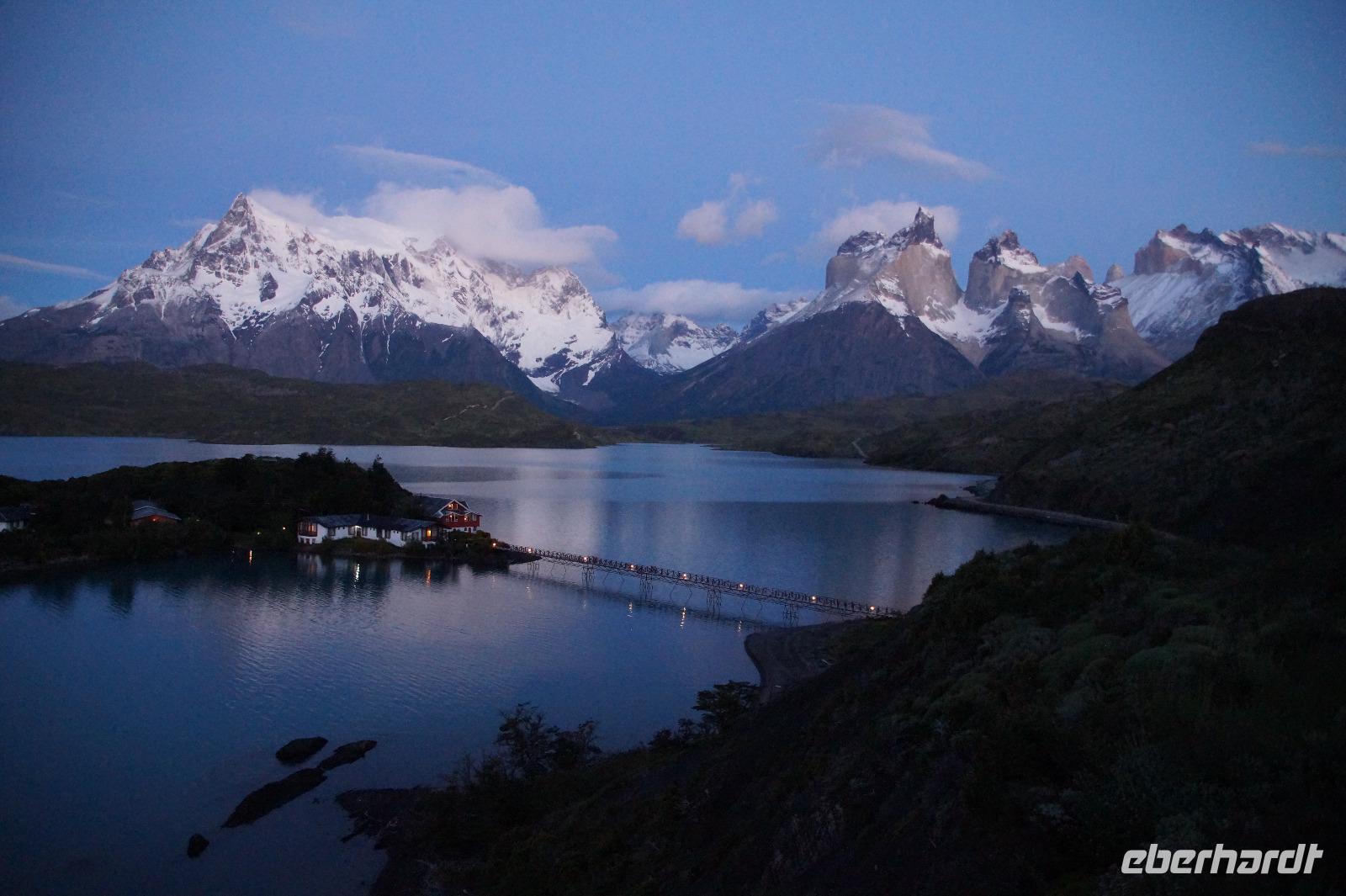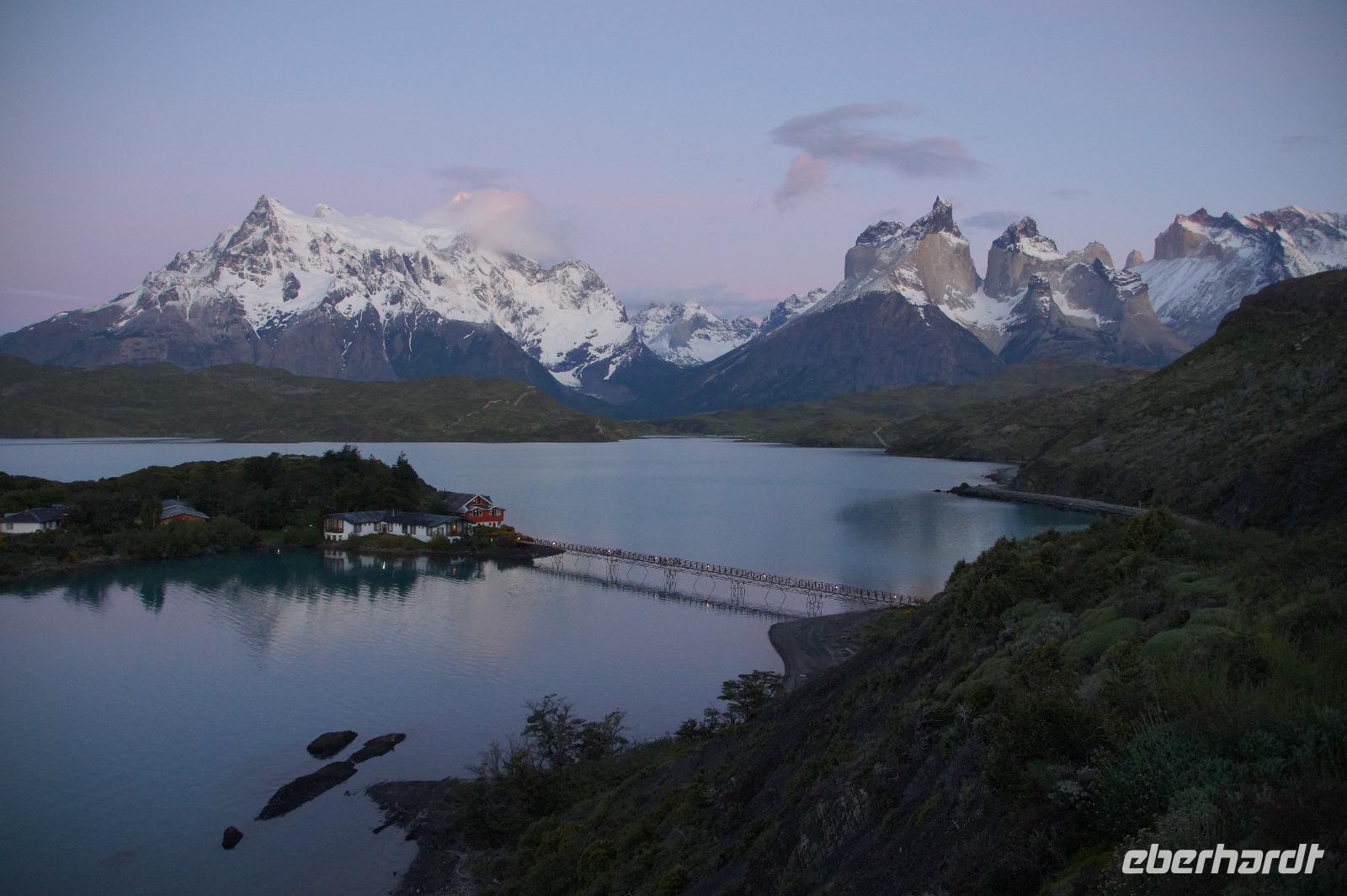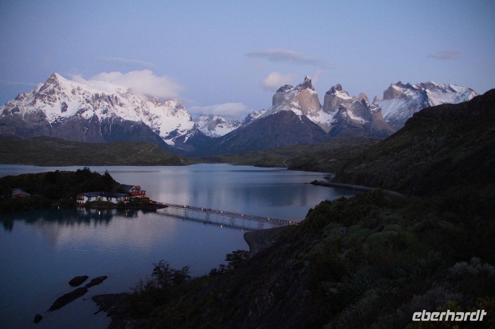 Über eine abenteuerliche Brücke erreichten wir das Hotel, das zwischen gelb und gelb-rot blühenden Ginsterbüschen romantisch auf einer Insel im Pehoé-See lag.