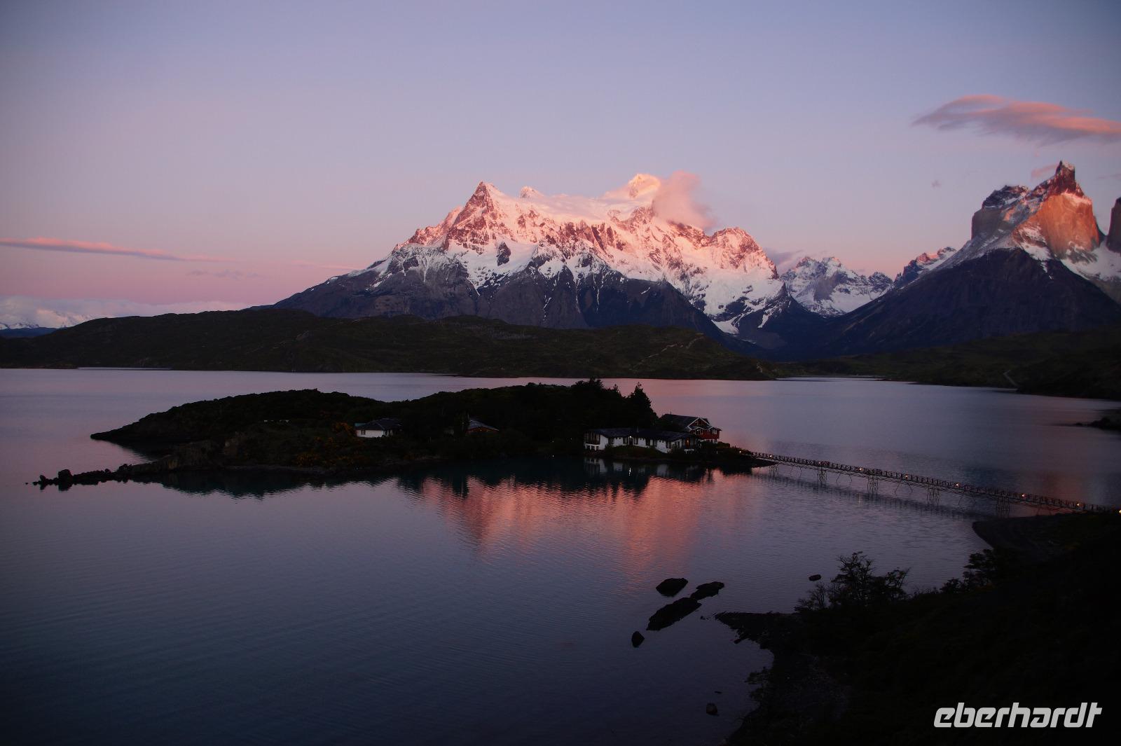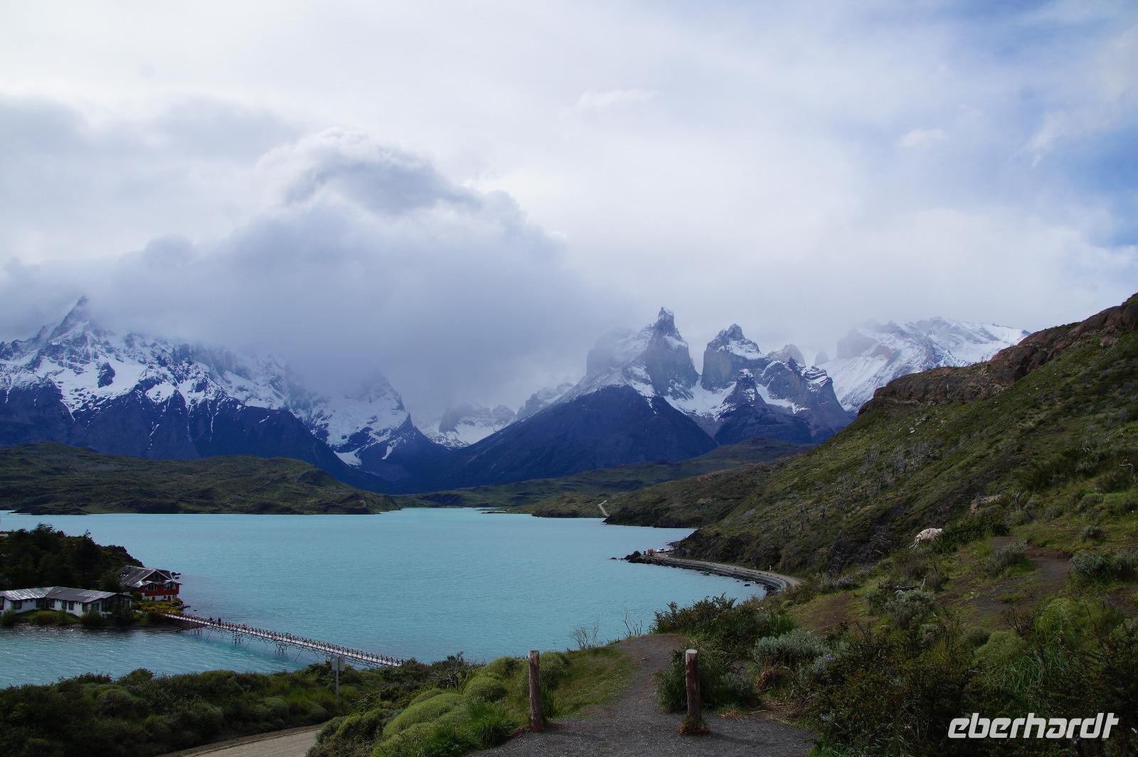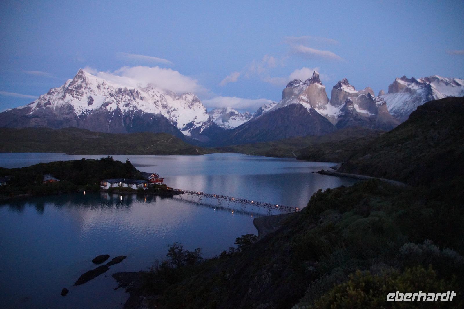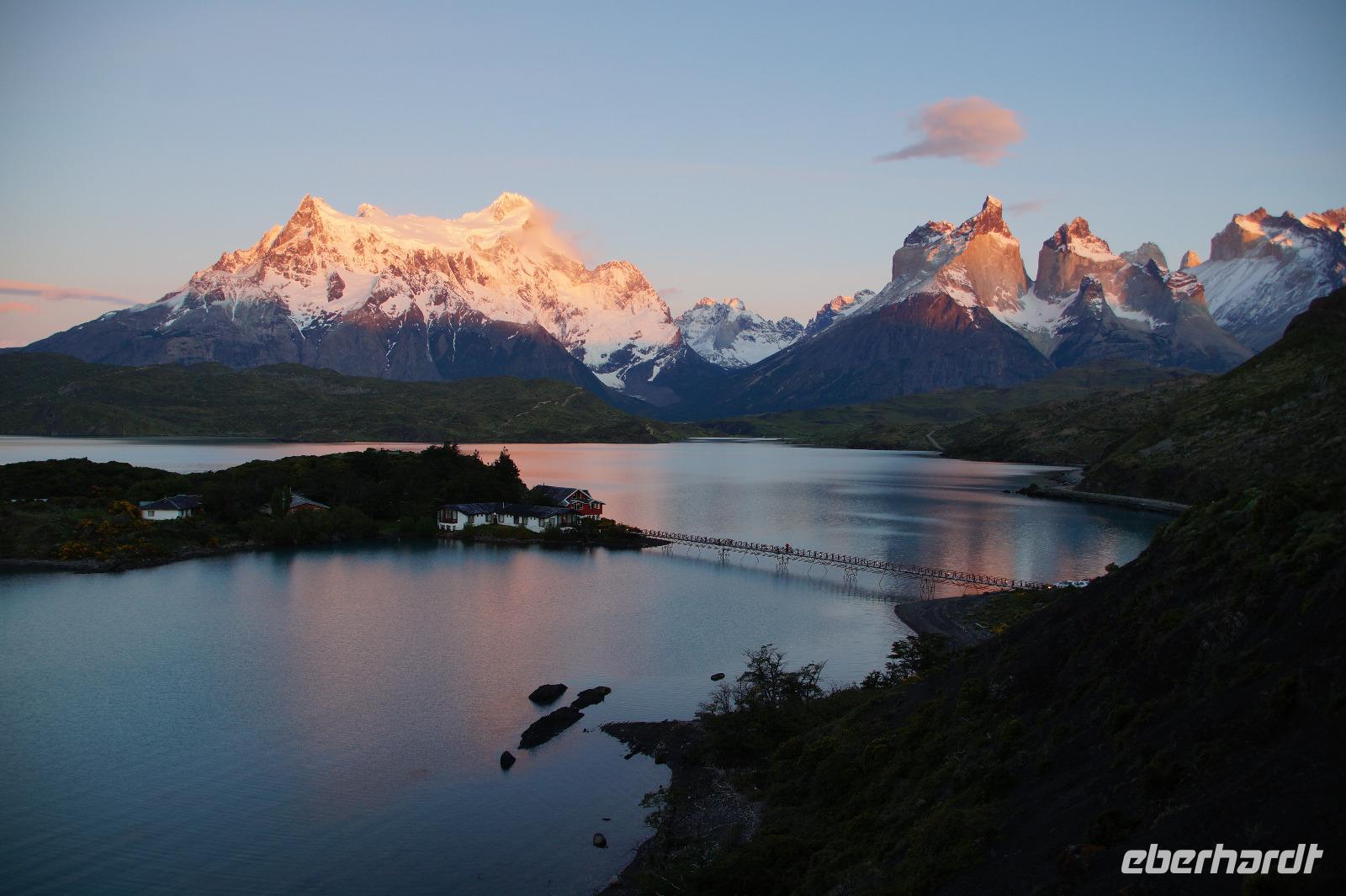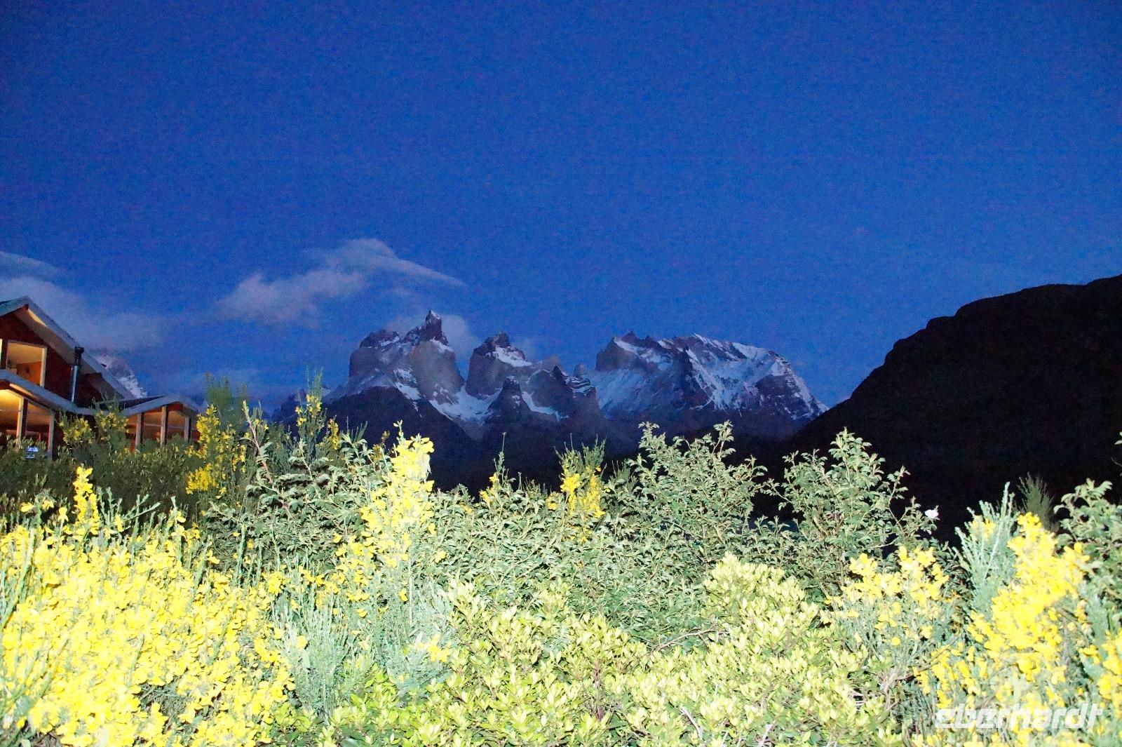 Über eine abenteuerliche Brücke erreichten wir das Hotel, das zwischen gelb und gelb-rot blühenden Ginsterbüschen romantisch auf einer Insel im Pehoé-See lag.