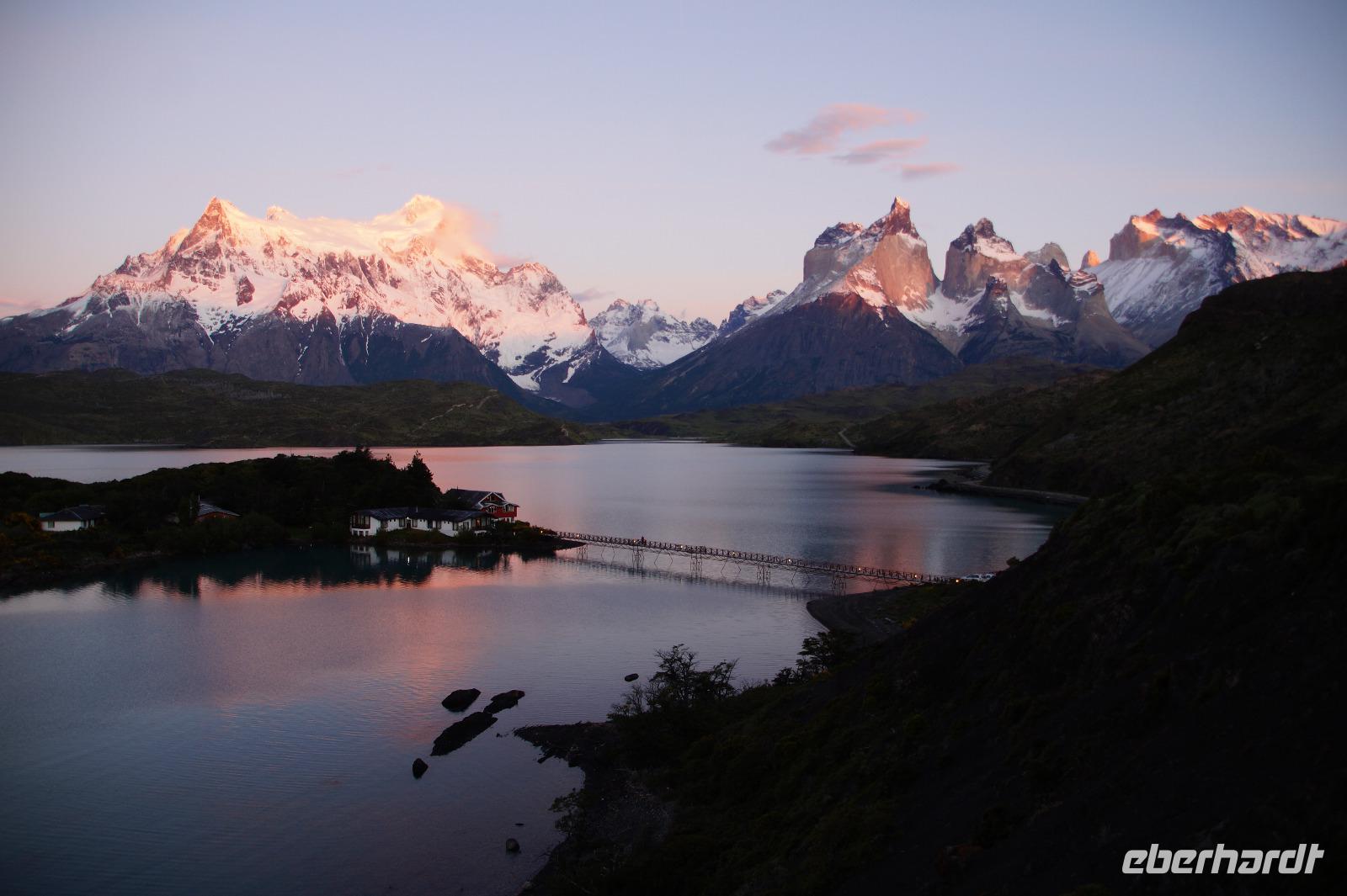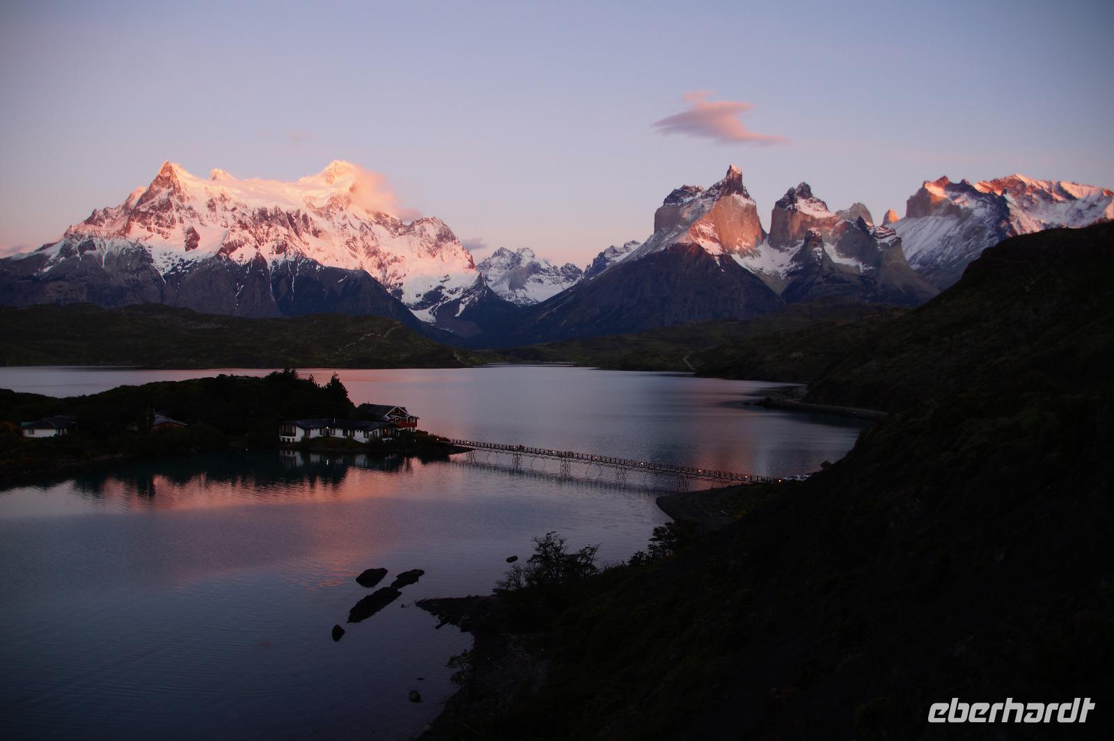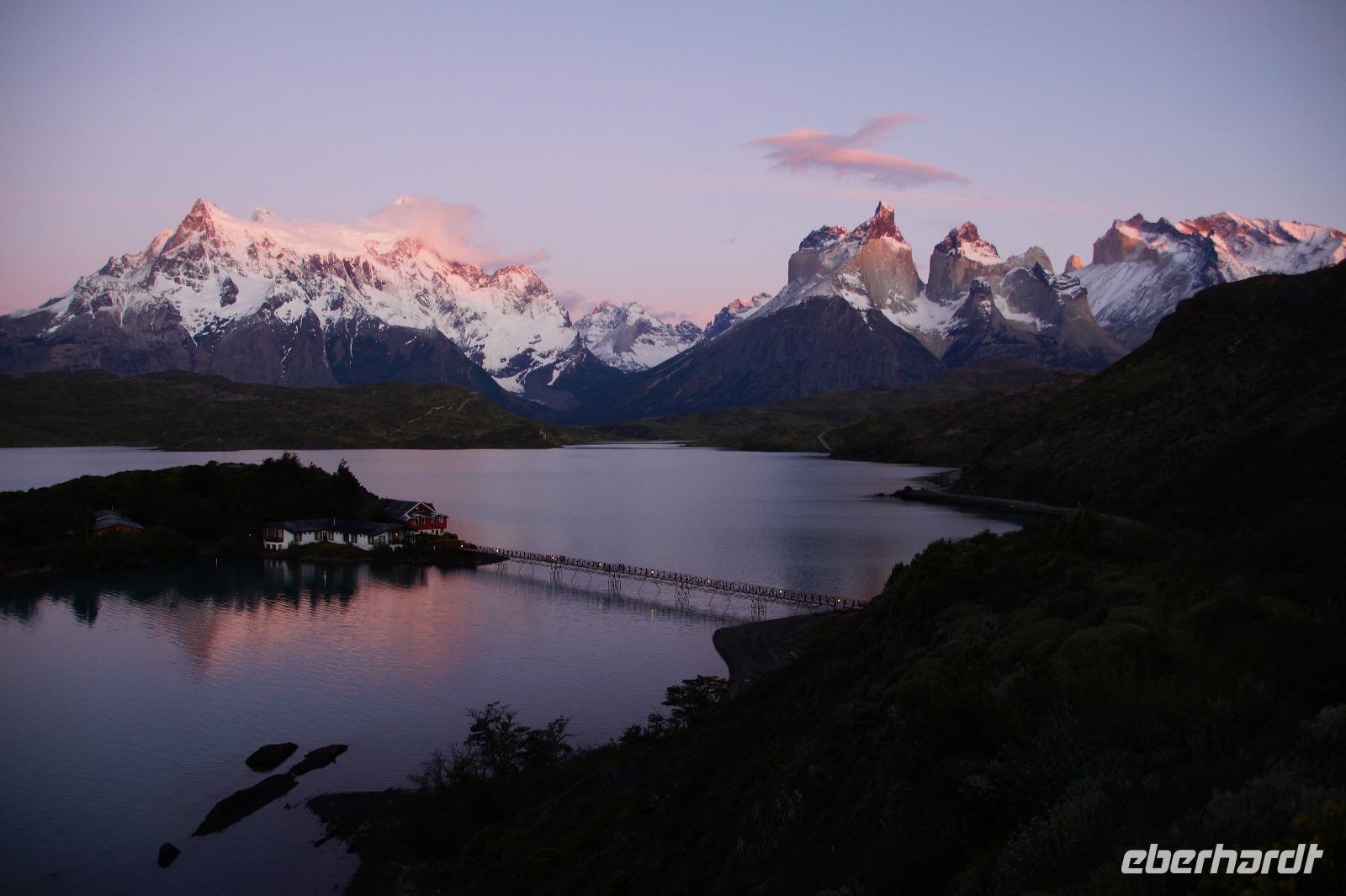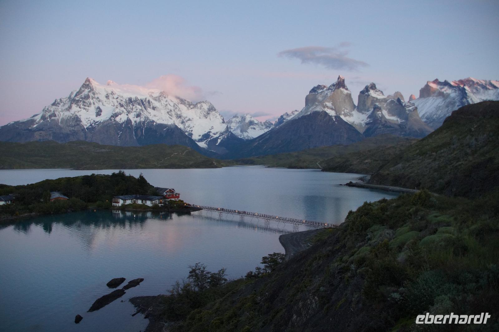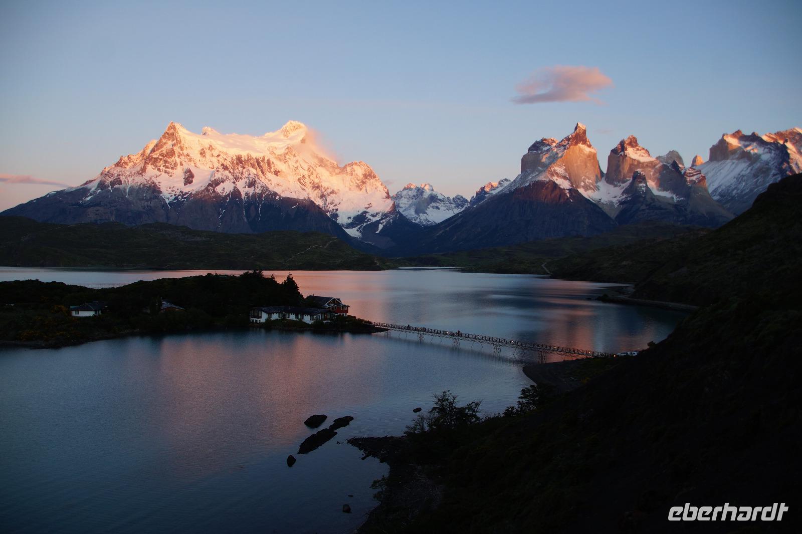 Über eine abenteuerliche Brücke erreichten wir das Hotel, das zwischen gelb und gelb-rot blühenden Ginsterbüschen romantisch auf einer Insel im Pehoé-See lag.