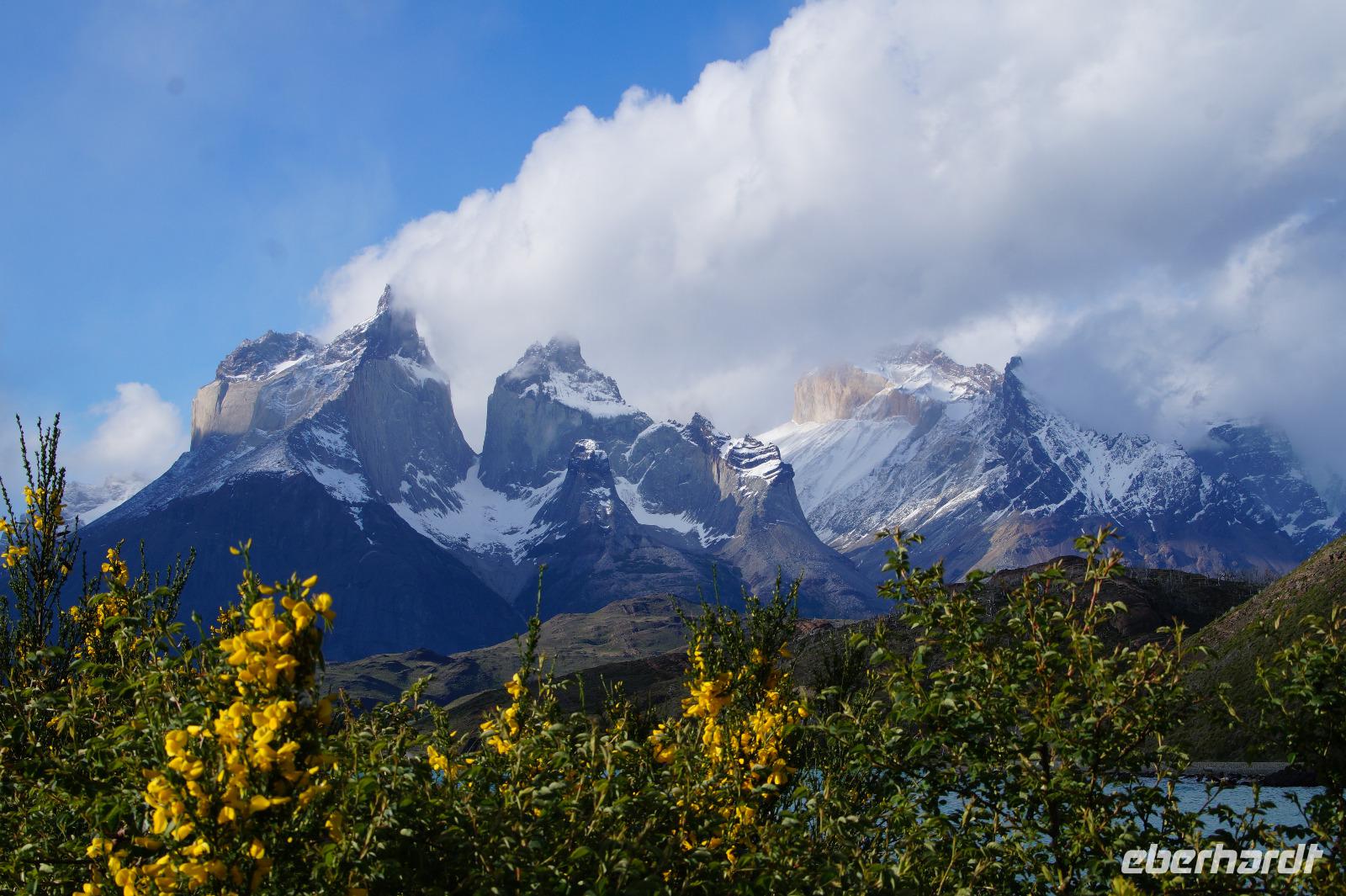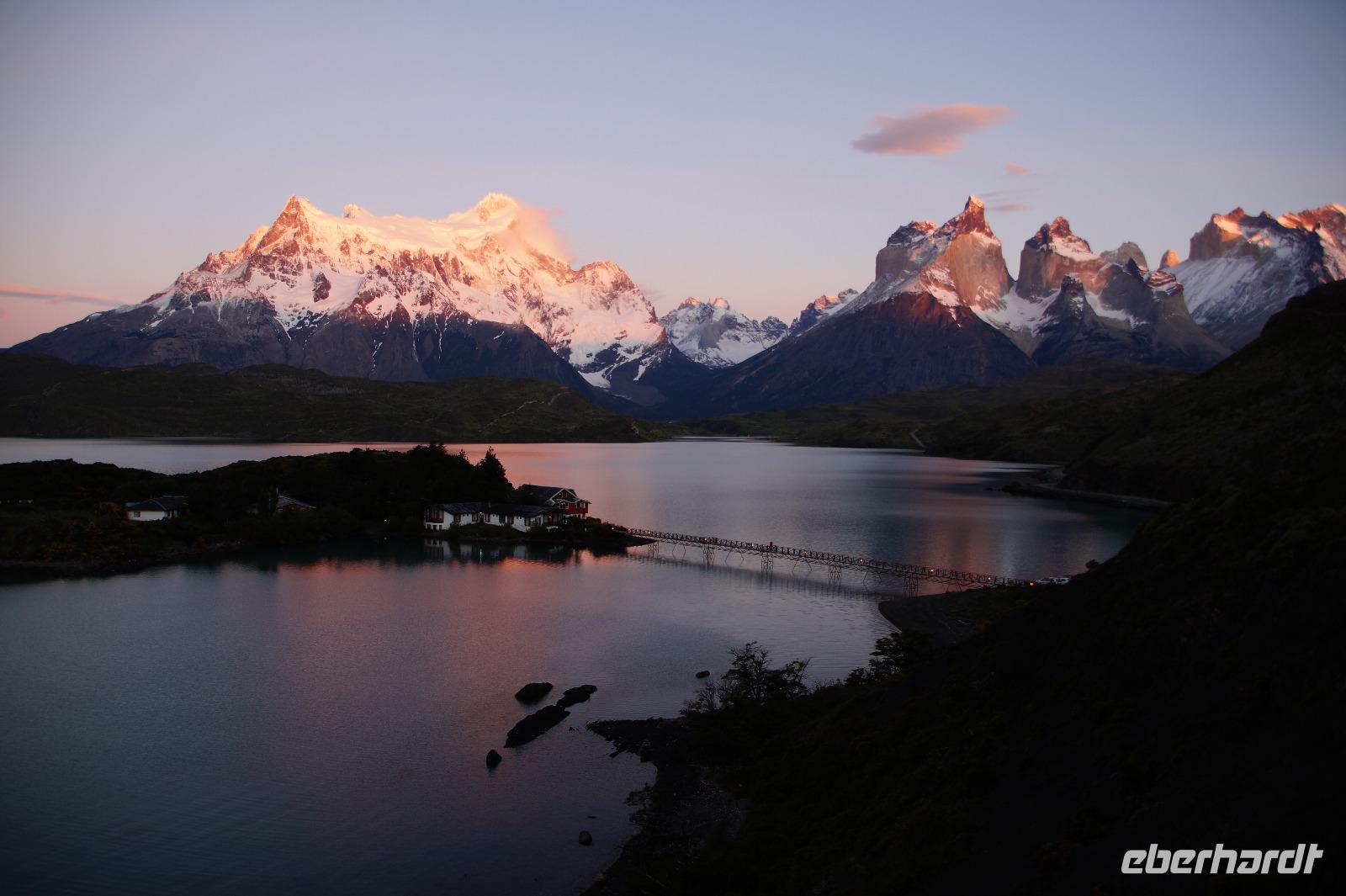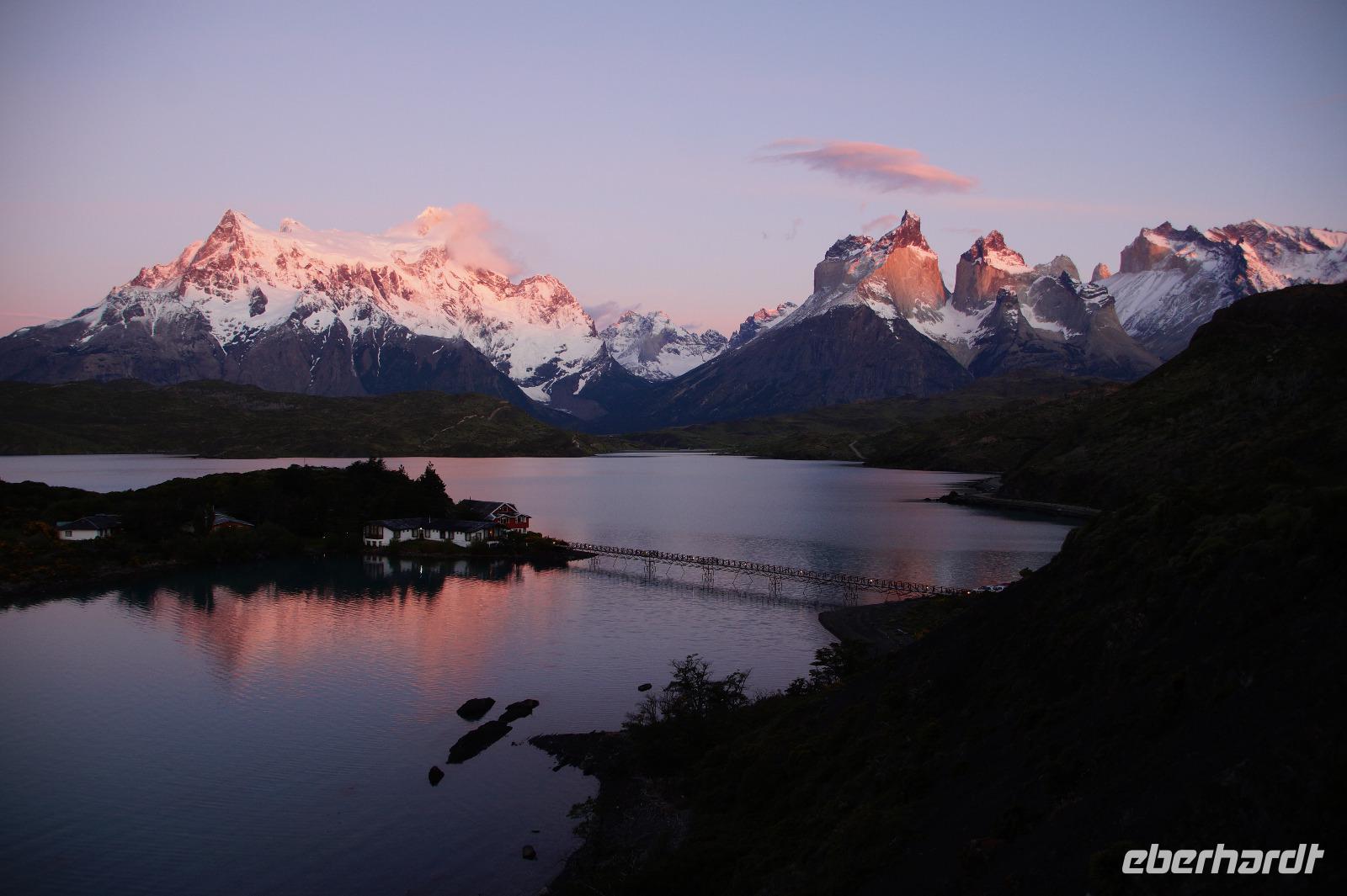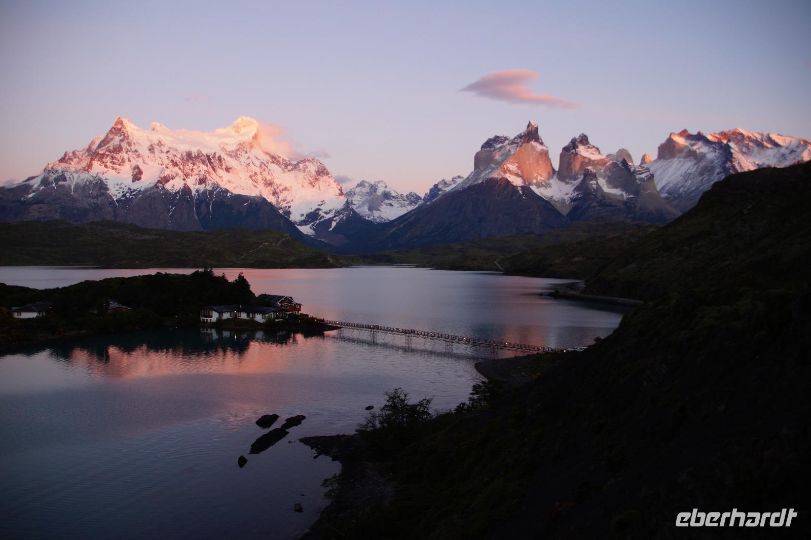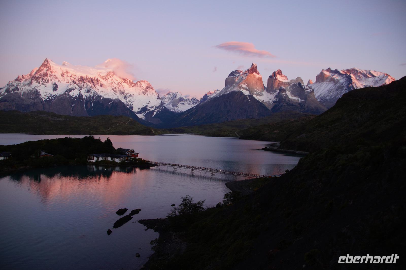 Über eine abenteuerliche Brücke erreichten wir das Hotel, das zwischen gelb und gelb-rot blühenden Ginsterbüschen romantisch auf einer Insel im Pehoé-See lag.