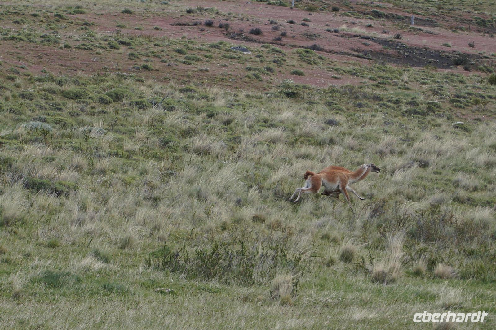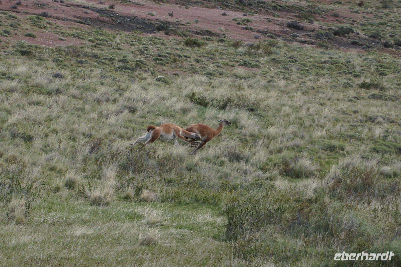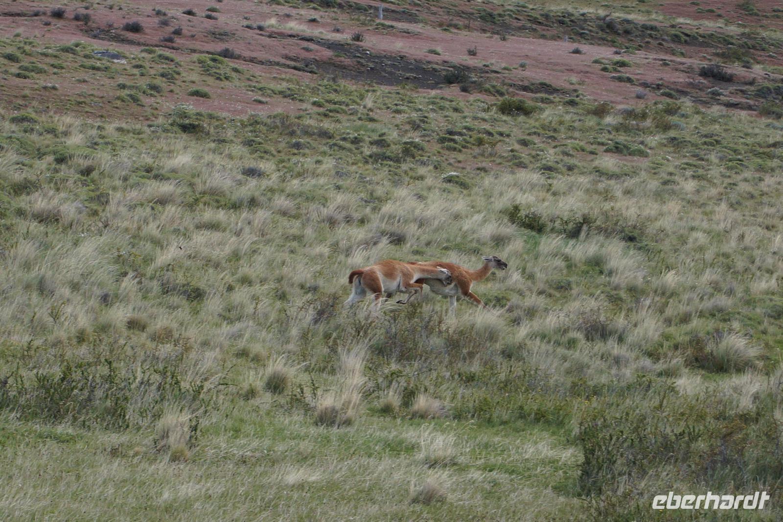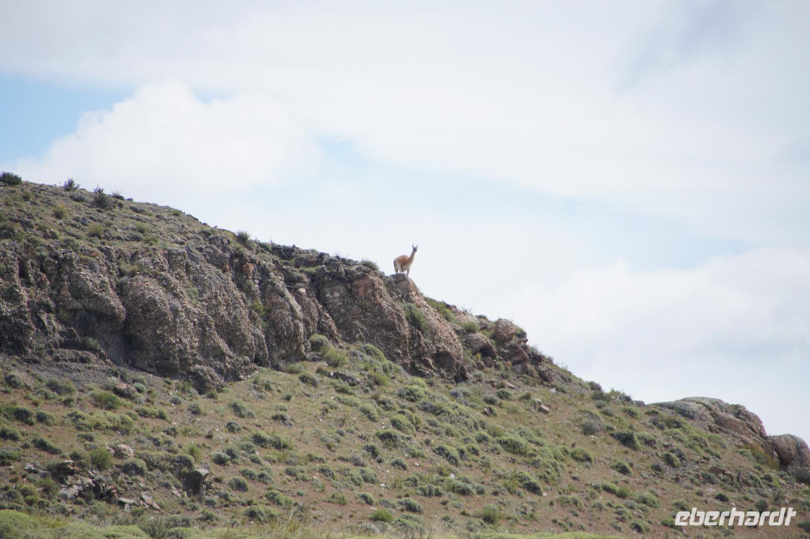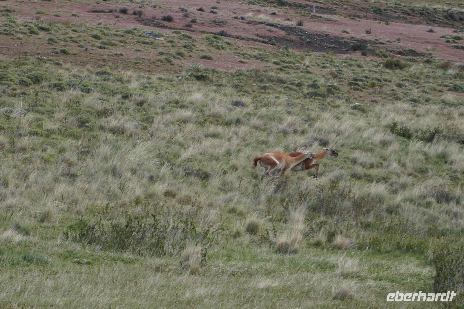 Wenige Schritte weiter stand ein Guanaco, einige Hügel weiter stand ein Guanaco Wache und als es des uns näheren Guanacos gewahr wurde, lief es, schnell Geschwindigkeit aufnehmend auf dieses zu. Es war der Hengst, der seinen Harem zu verteidigen suchte und so erlebten wir unseren ersten Kampf zwischen zwei Guanacohengsten.