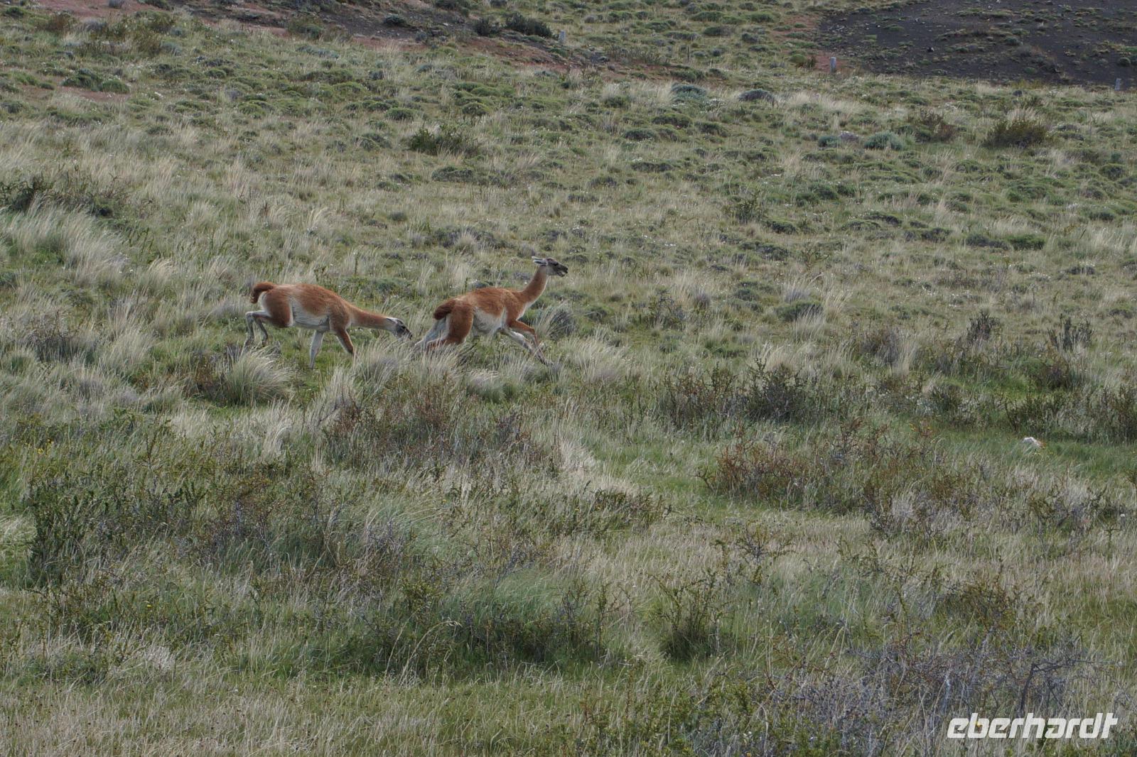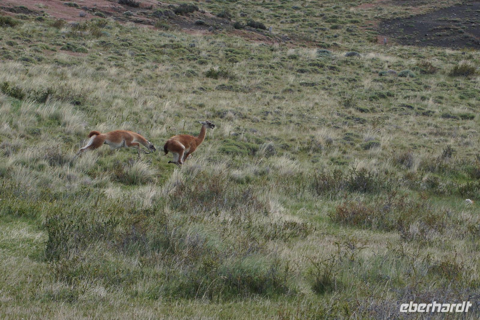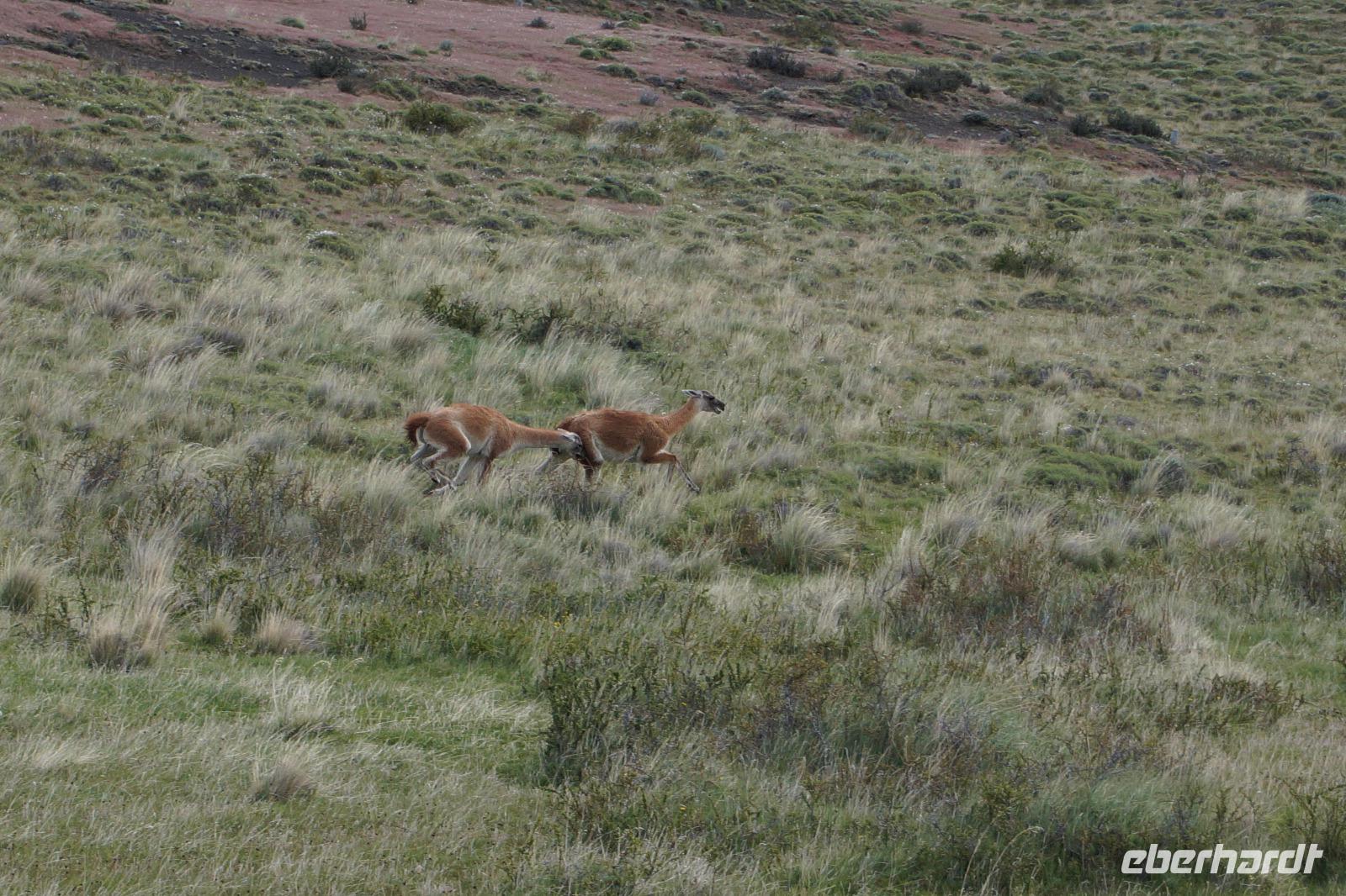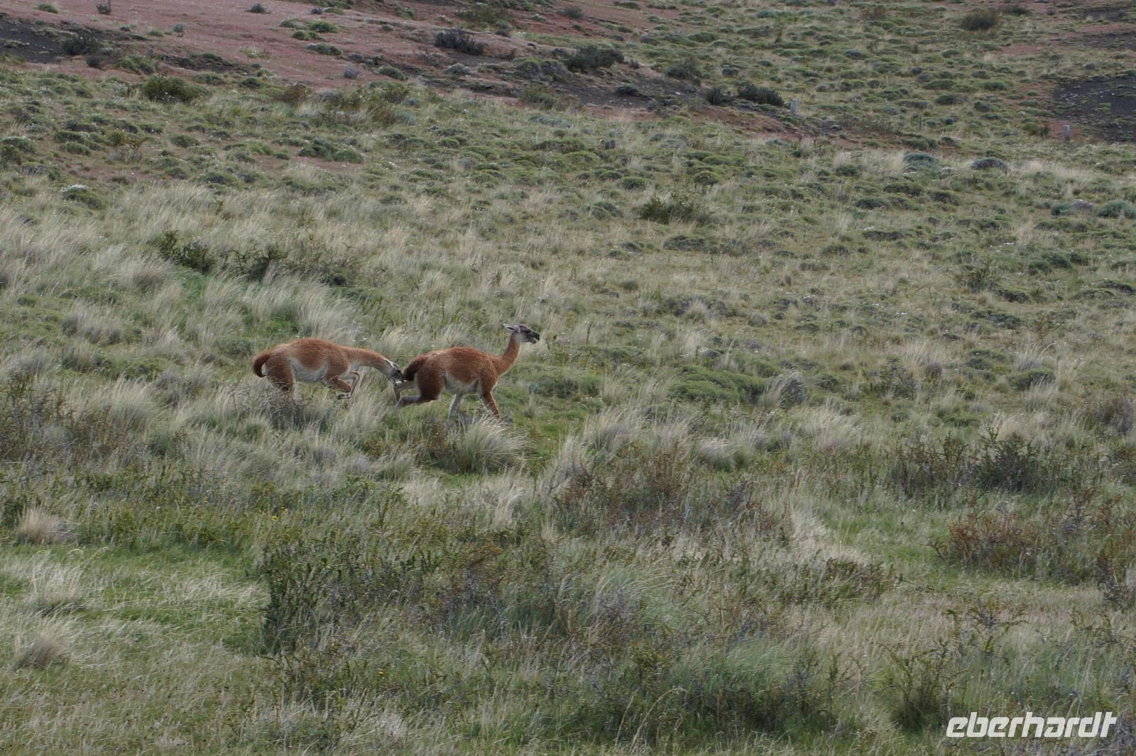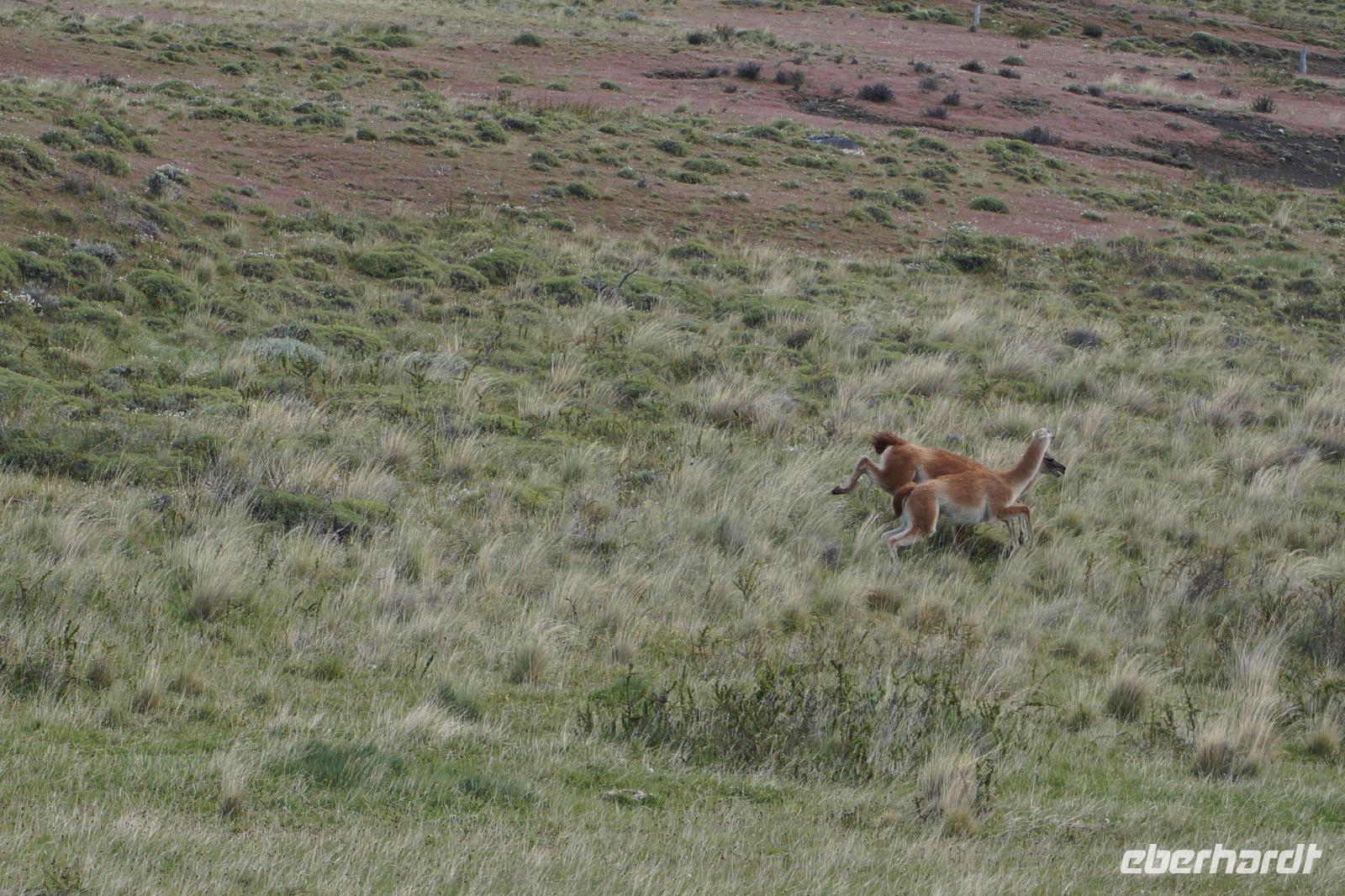 Wenige Schritte weiter stand ein Guanaco, einige Hügel weiter stand ein Guanaco Wache und als es des uns näheren Guanacos gewahr wurde, lief es, schnell Geschwindigkeit aufnehmend auf dieses zu. Es war der Hengst, der seinen Harem zu verteidigen suchte und so erlebten wir unseren ersten Kampf zwischen zwei Guanacohengsten.