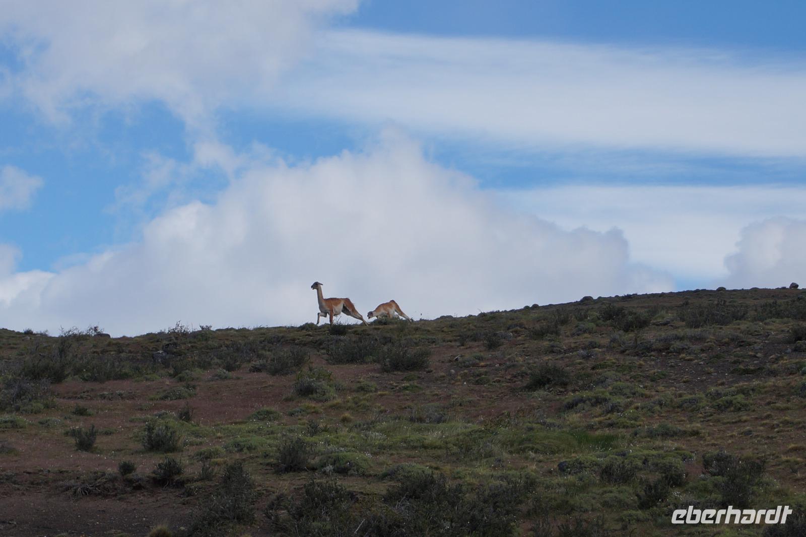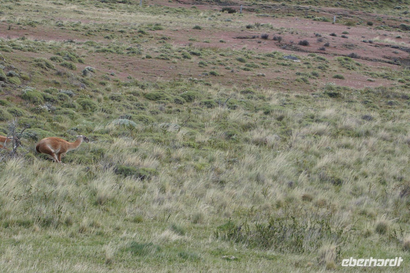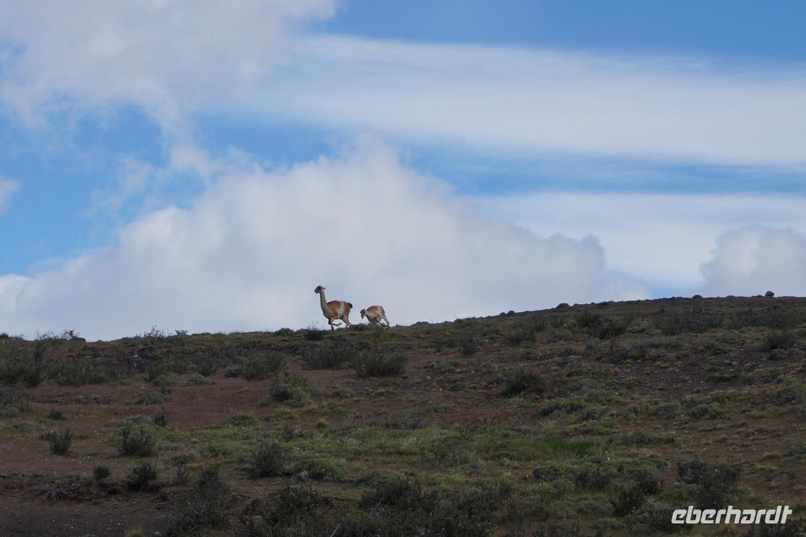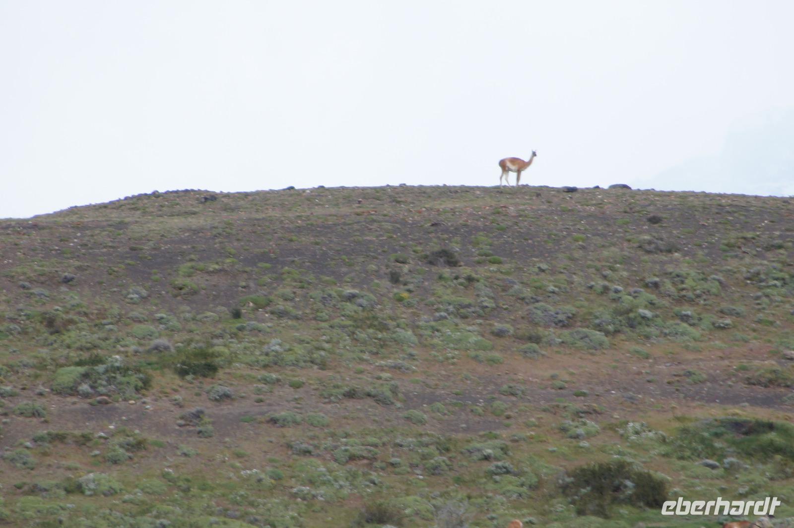 Wenige Schritte weiter stand ein Guanaco, einige Hügel weiter stand ein Guanaco Wache und als es des uns näheren Guanacos gewahr wurde, lief es, schnell Geschwindigkeit aufnehmend auf dieses zu. Es war der Hengst, der seinen Harem zu verteidigen suchte und so erlebten wir unseren ersten Kampf zwischen zwei Guanacohengsten.