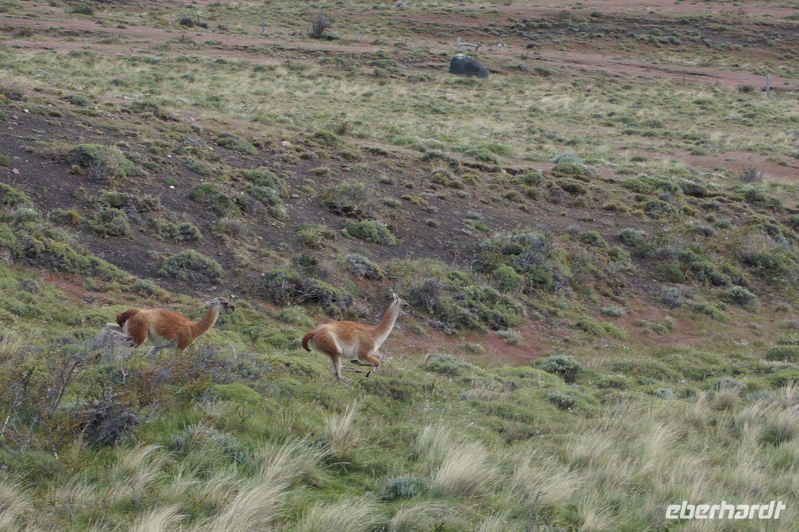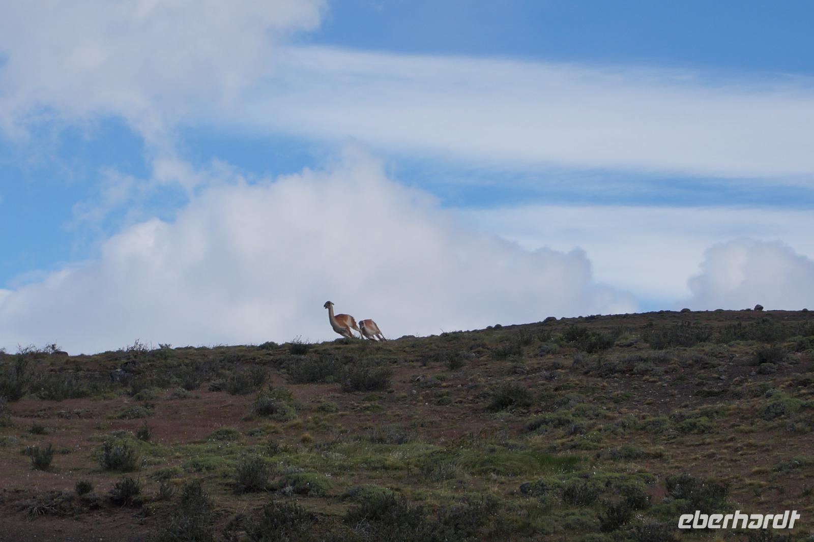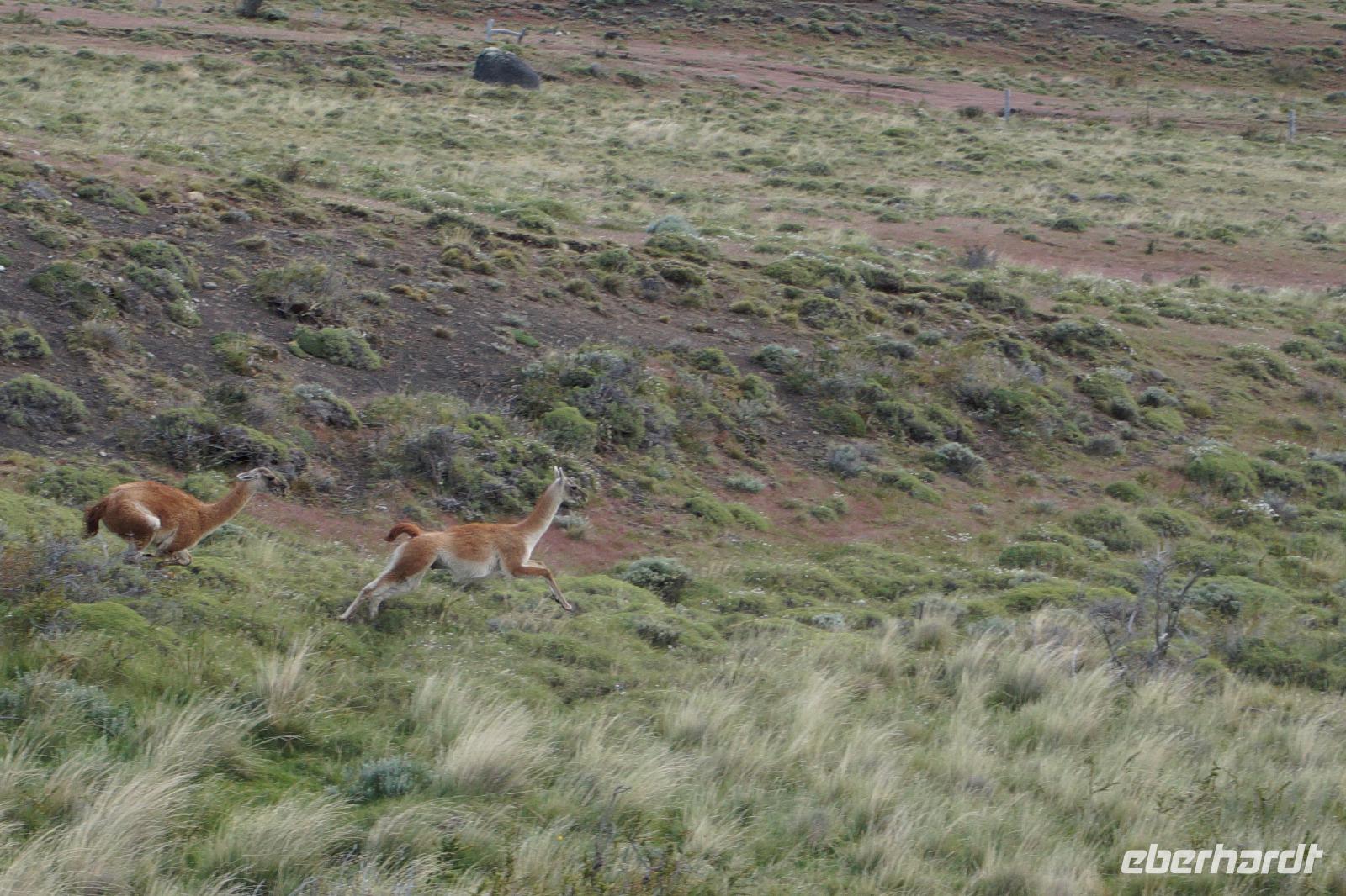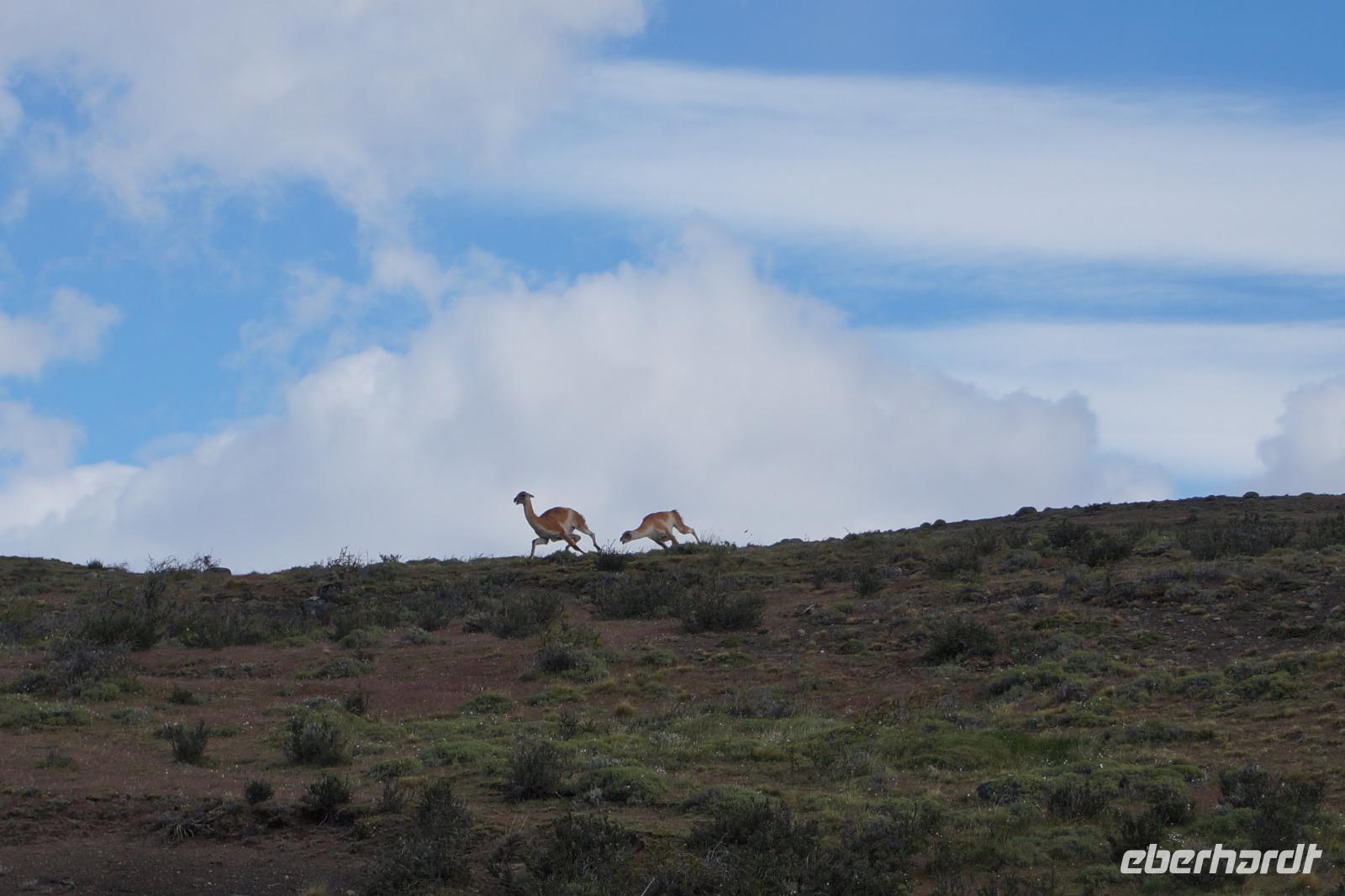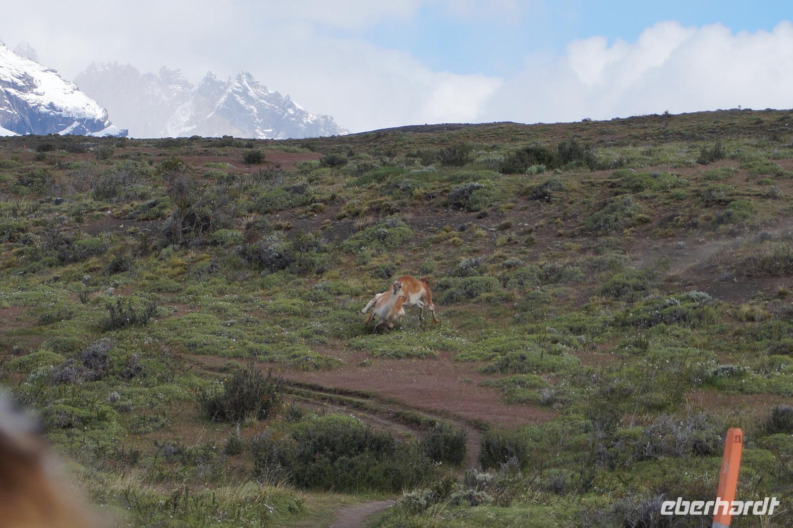 Wenige Schritte weiter stand ein Guanaco, einige Hügel weiter stand ein Guanaco Wache und als es des uns näheren Guanacos gewahr wurde, lief es, schnell Geschwindigkeit aufnehmend auf dieses zu. Es war der Hengst, der seinen Harem zu verteidigen suchte und so erlebten wir unseren ersten Kampf zwischen zwei Guanacohengsten.