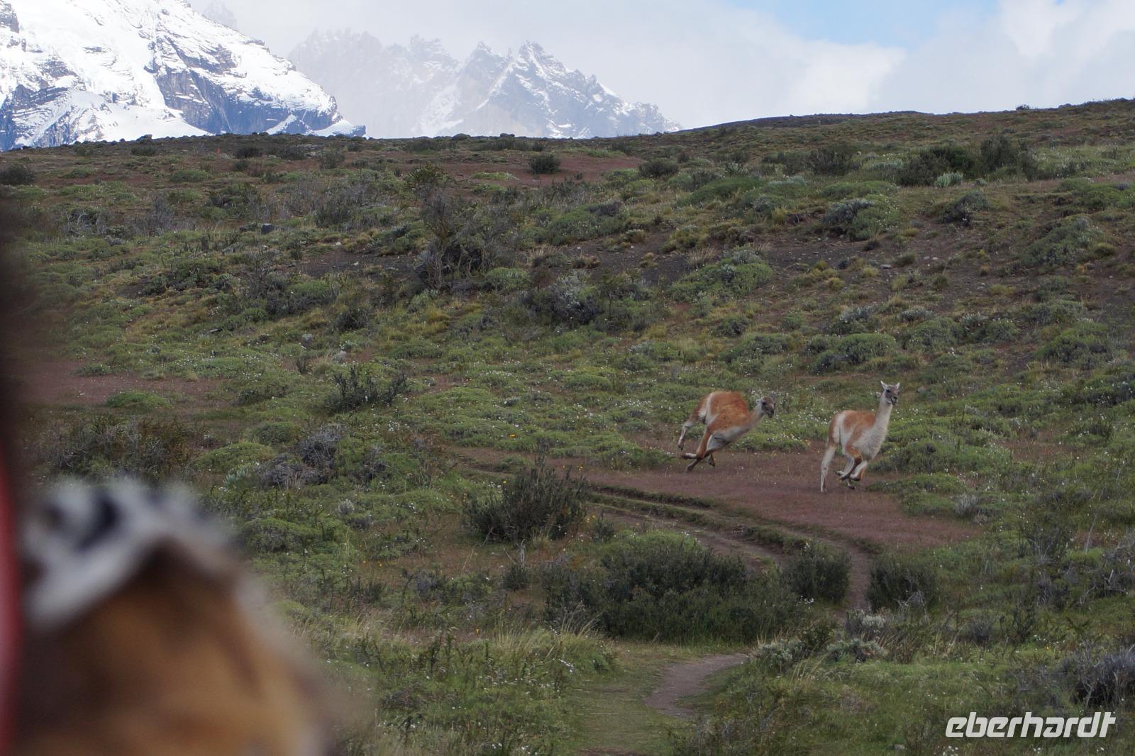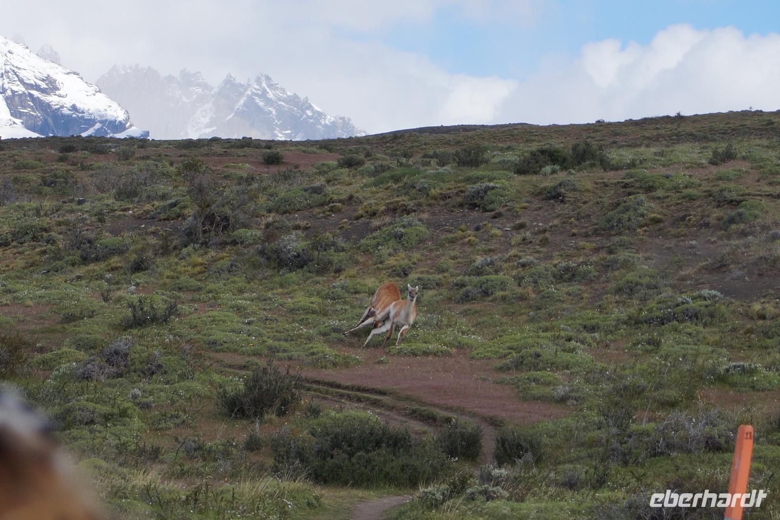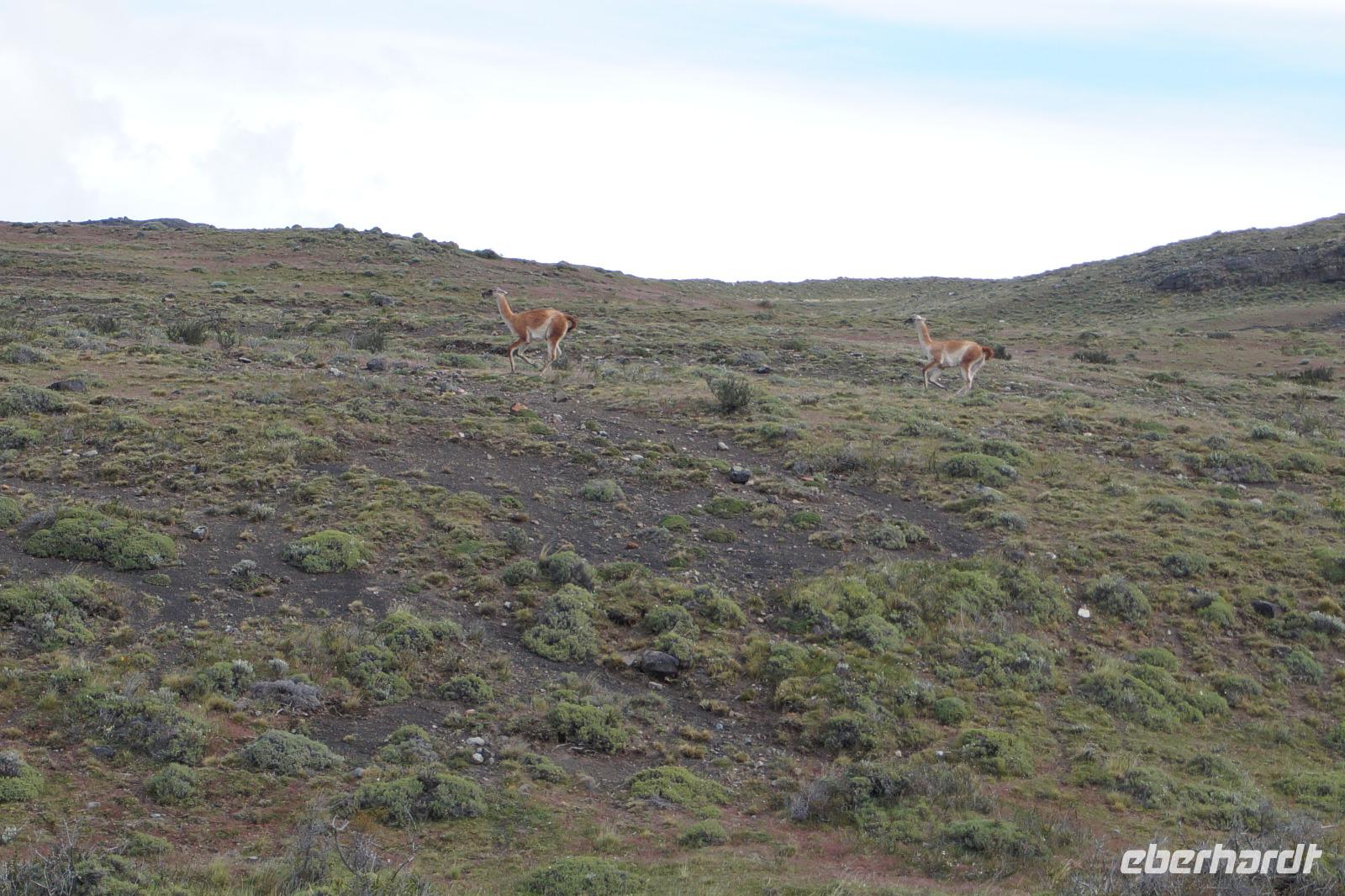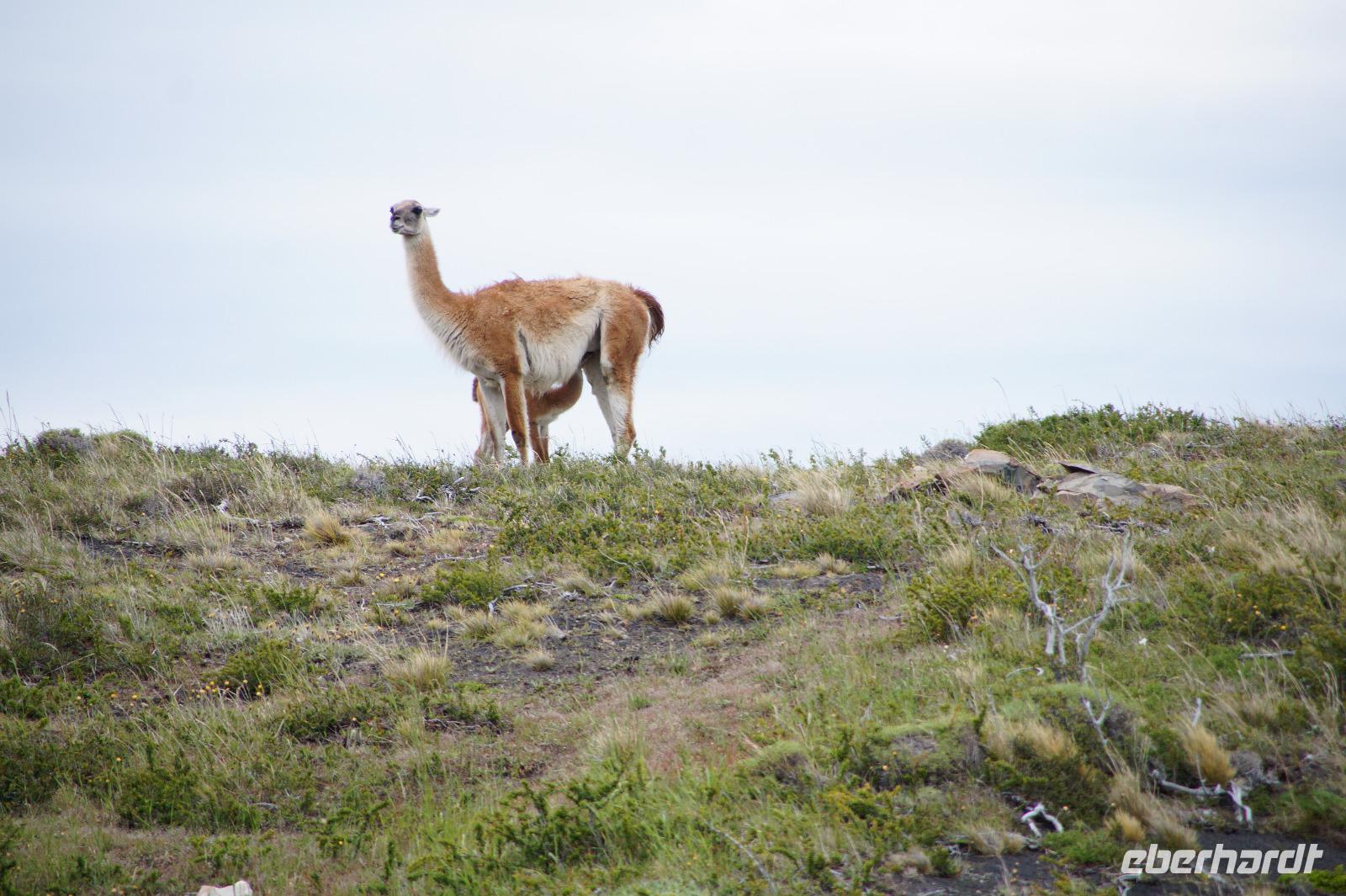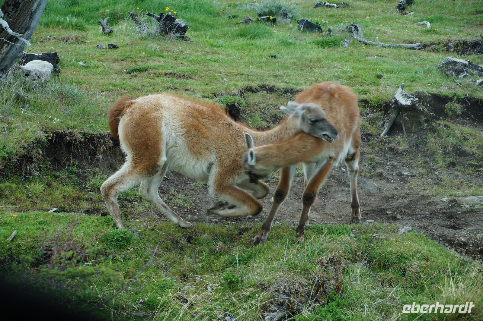 Wenige Schritte weiter stand ein Guanaco, einige Hügel weiter stand ein Guanaco Wache und als es des uns näheren Guanacos gewahr wurde, lief es, schnell Geschwindigkeit aufnehmend auf dieses zu. Es war der Hengst, der seinen Harem zu verteidigen suchte und so erlebten wir unseren ersten Kampf zwischen zwei Guanacohengsten.