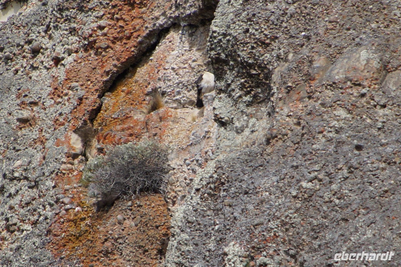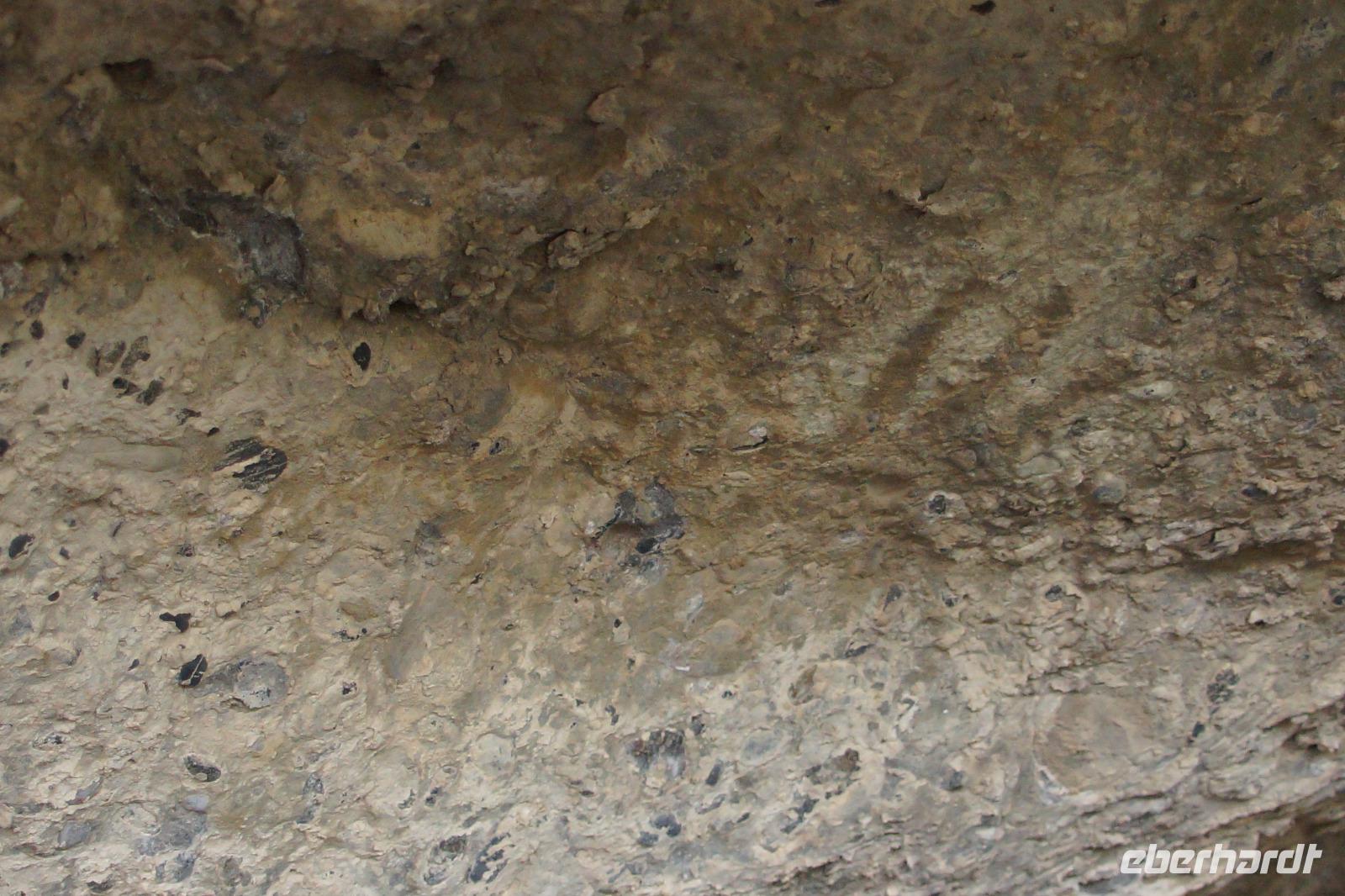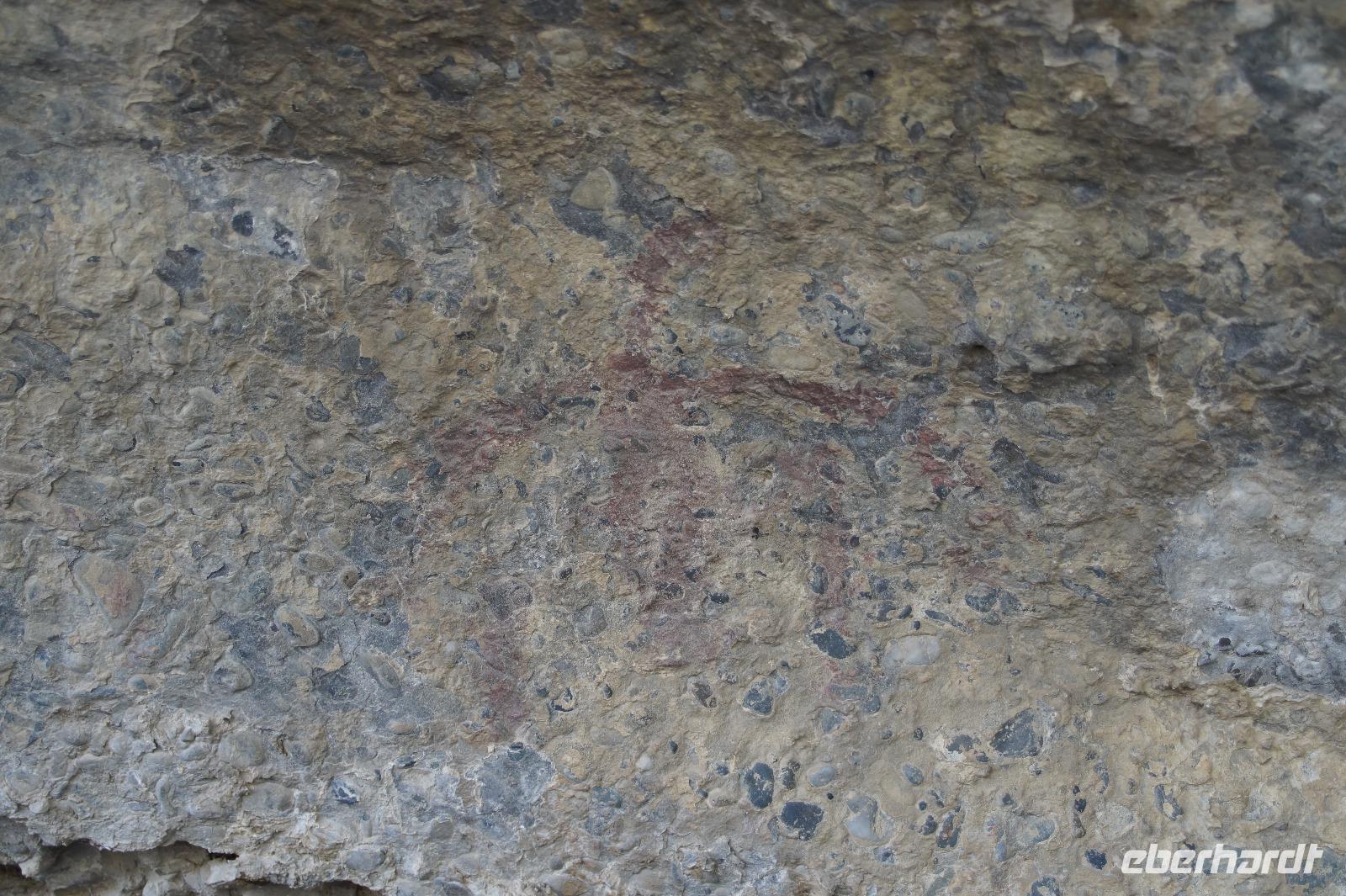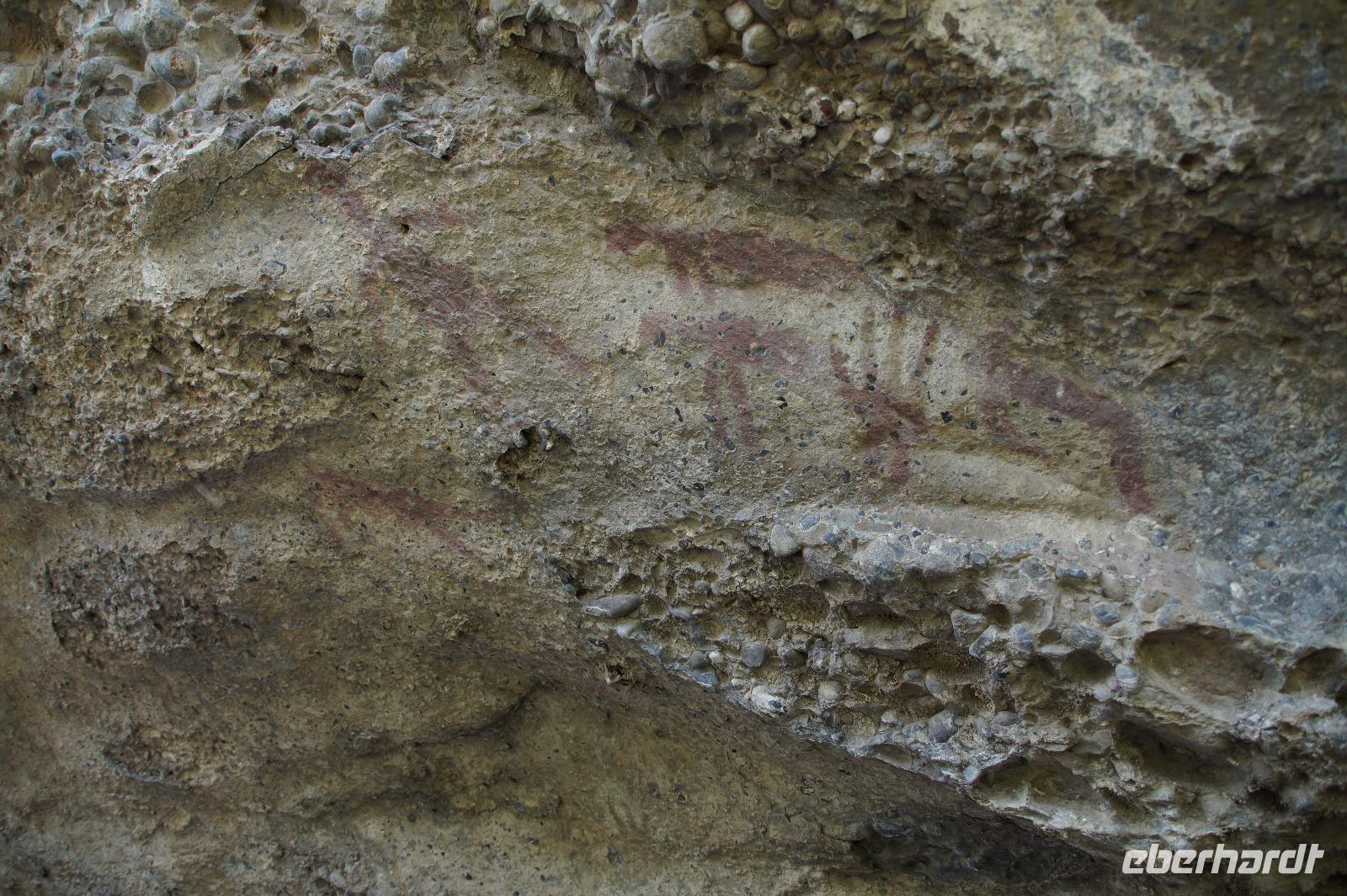 Wir umrundeten etwa ein Fünftel eines Felsens aus Konglomeratgestein, in dessen Südost-Seite wir Falken beobachteten, und erreichten schließlich einen Felsüberhang, nachdem wir vielleicht dreißig Meter aufgestiegen waren. Hier waren ca. 10.000 Jahre alte Malereien zu sehen, sowohl Handabdrücke (im Positiv wie im Negativ) als auch anthropomorphe (menschförmige) und zoomorphe (tierförmige) Figuren. Pancho erklärte uns die Interpretation einer Gruppe, bestehend aus einer antropomorphen Figur links, zwei zoomorphen Figuren in der Mitte, einer Hand und einer weiteren zoomorphen Figur rechts. Bei den beiden zoomorphen Figuren in der Mitte handele es sich um Guanacos, diese seien die Jagdbeute sowohl der Menschen (links) als auch der Pumas (rechts), welche um diese wichtige Ressource konkurrierten. Die Hand symbolisiere vielleicht die Abwehr des Nahrungskonkurrenten Puma durch den Menschen.