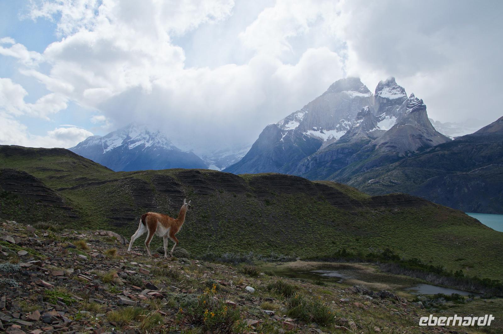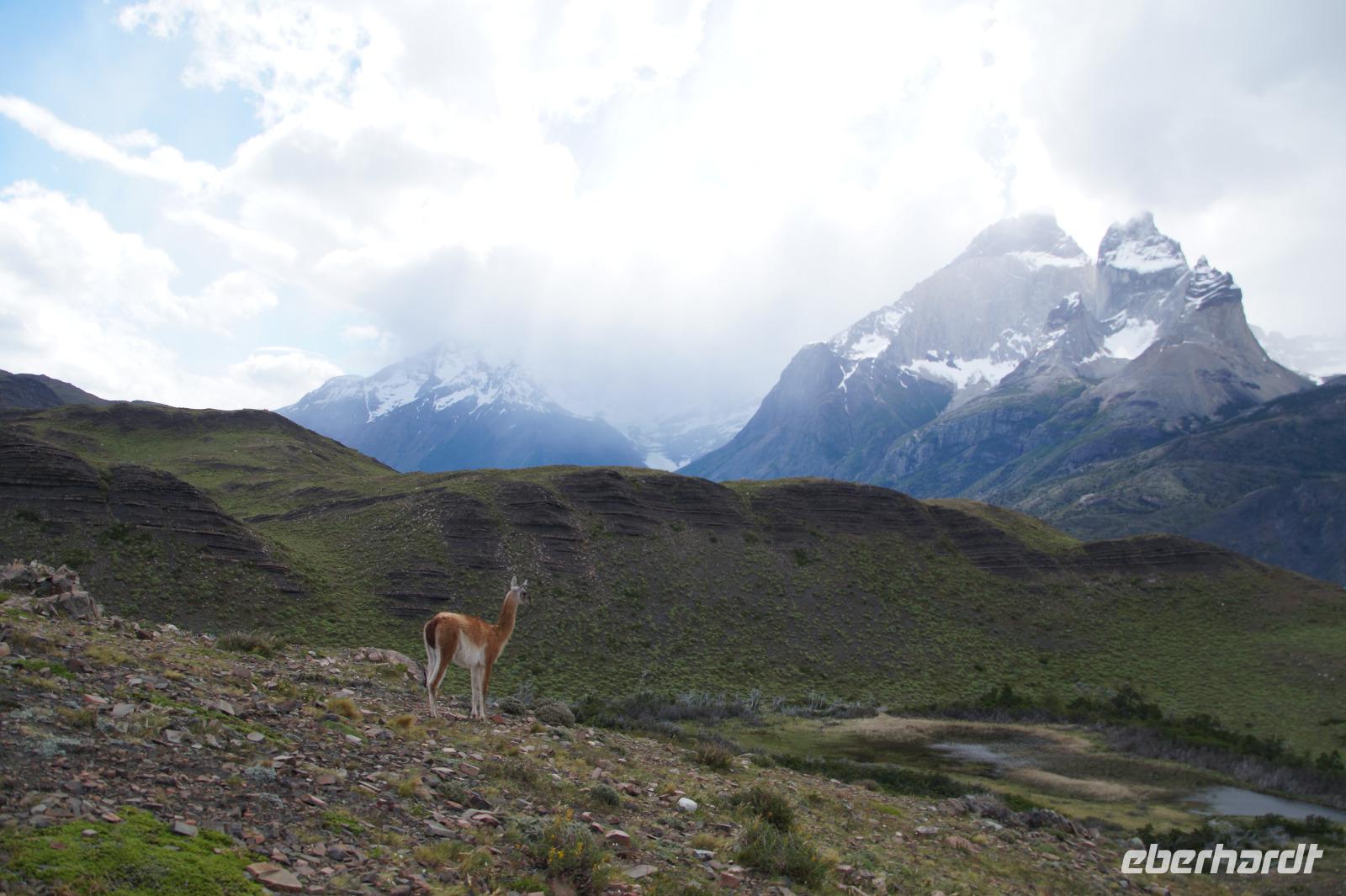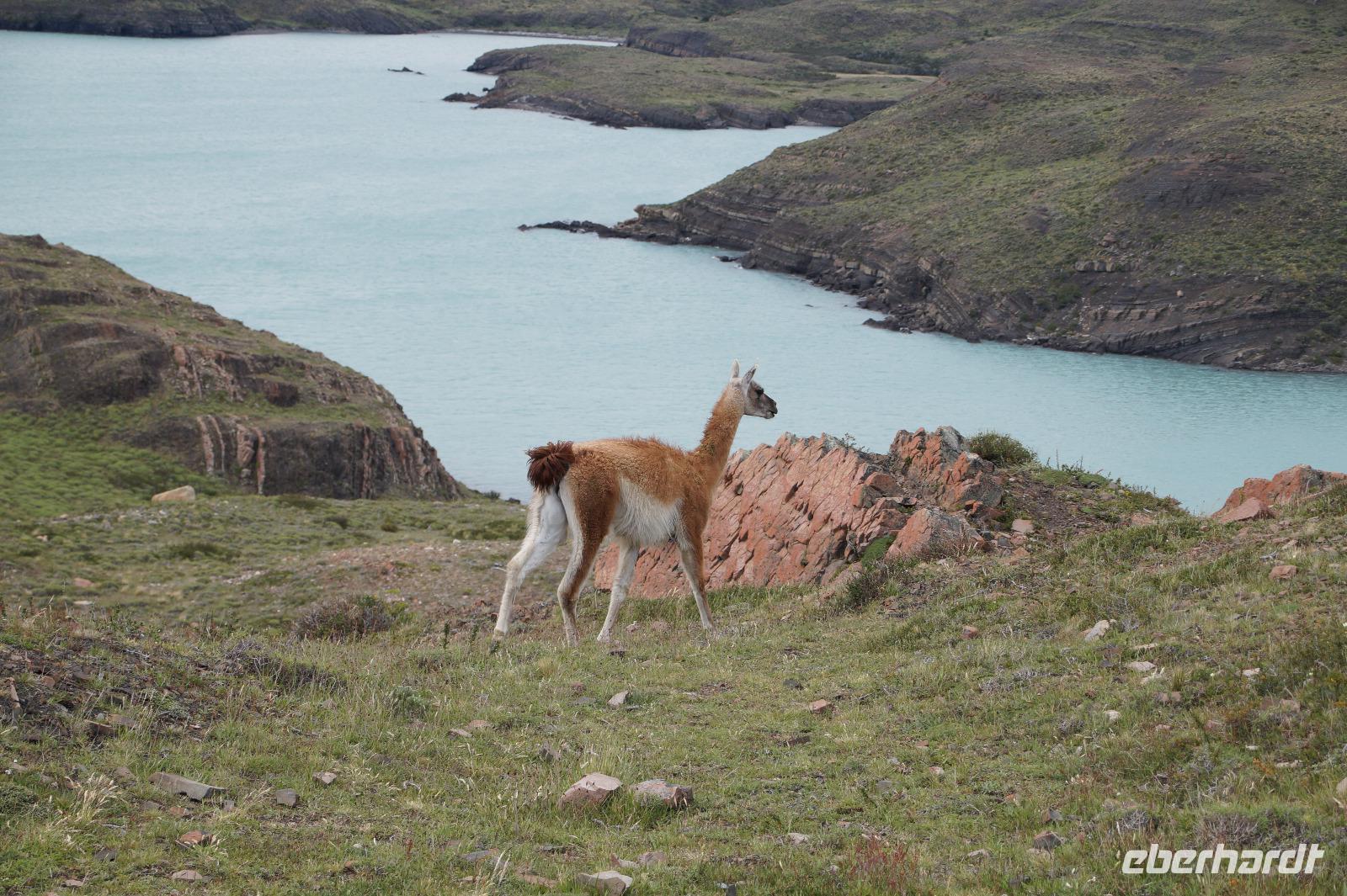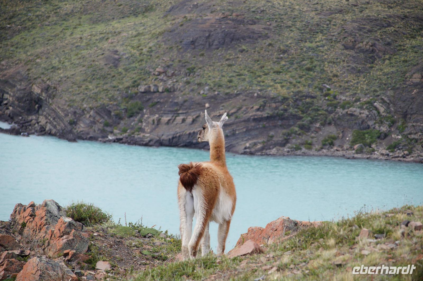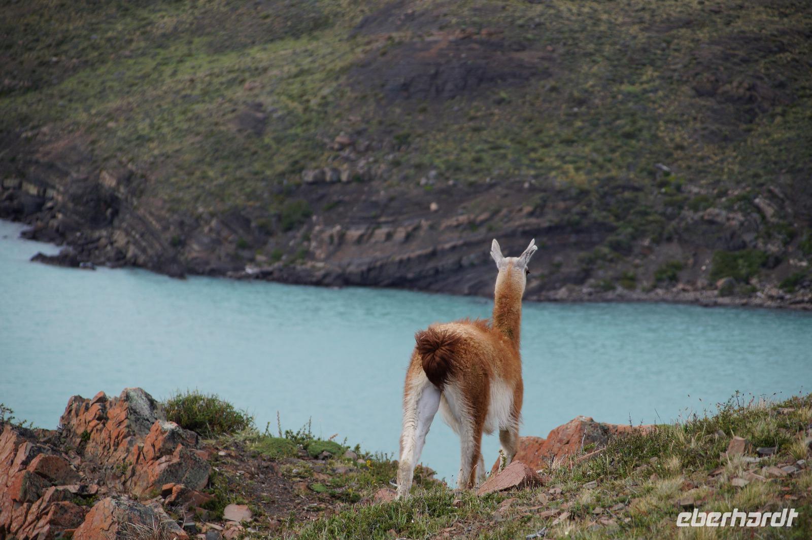Unser erster Abstecher heute galt dem Salto Grande und dem Nordenskjöld-See. Als wir unsere Wanderung begannen, saß in der Nähe eines Schildes, welches auf den Sendero (Wanderweg) hinwies, ein dösendes Guanaco. Nun soll man zwar Tiere nicht allzusehr vermenschlichen, aber die Reaktion dieses Tiers auf uns war doch zu graziös.
