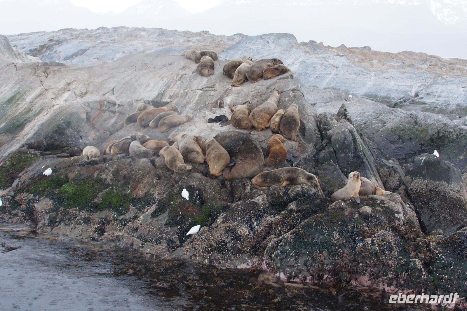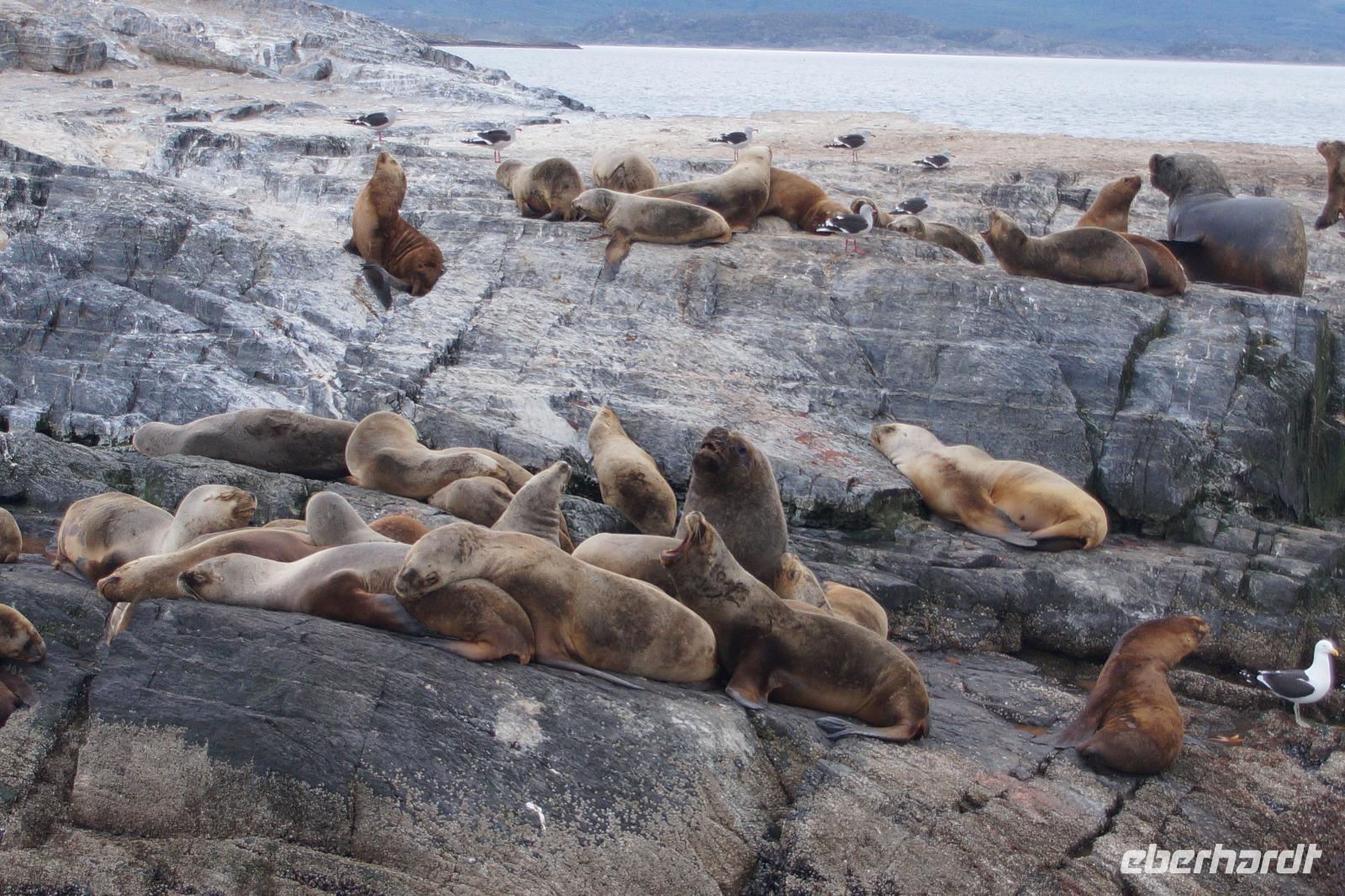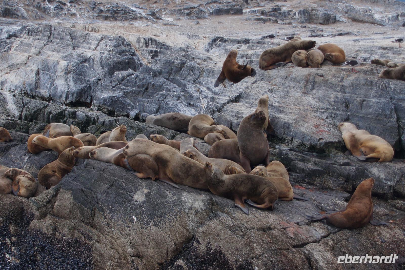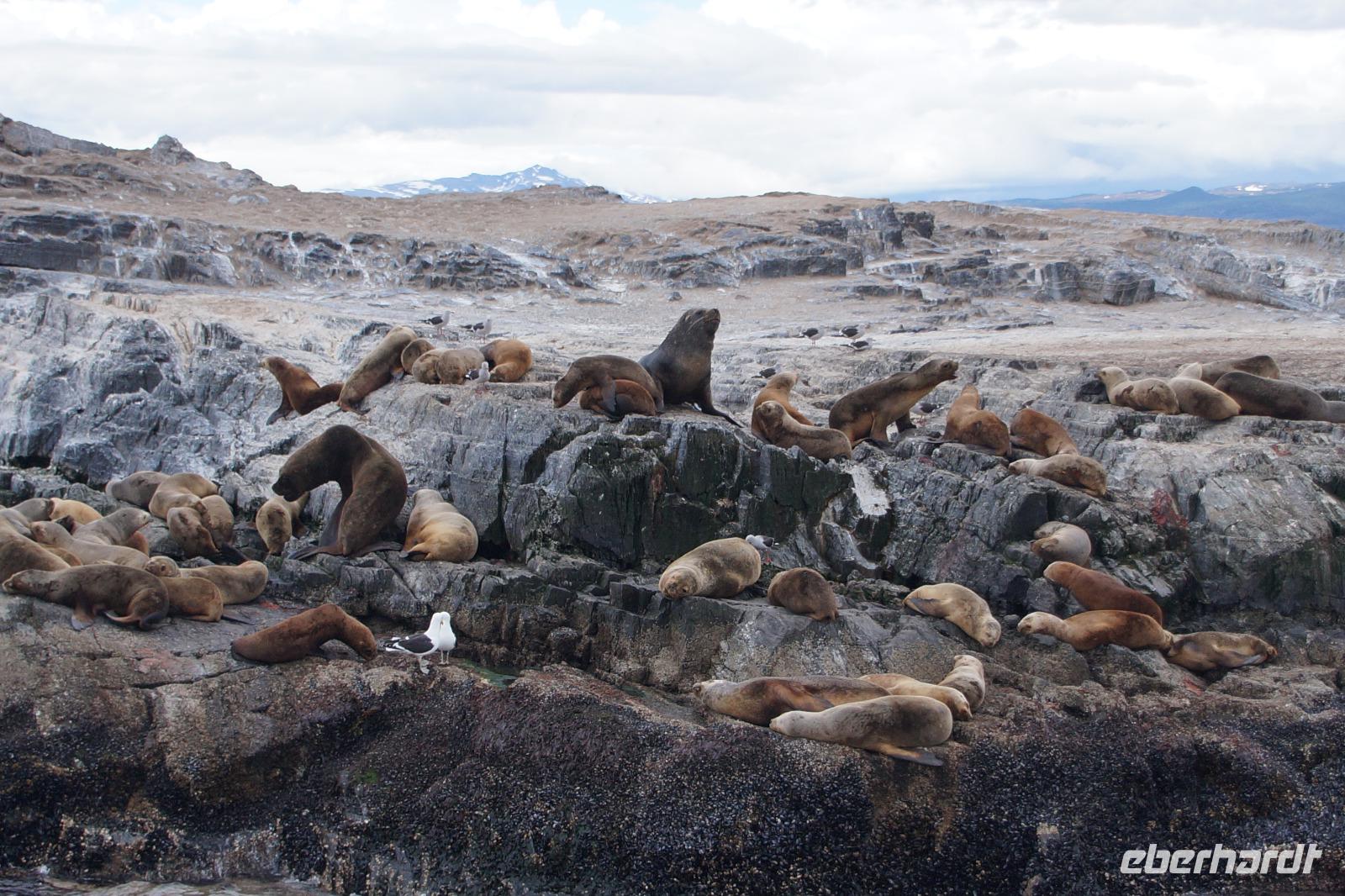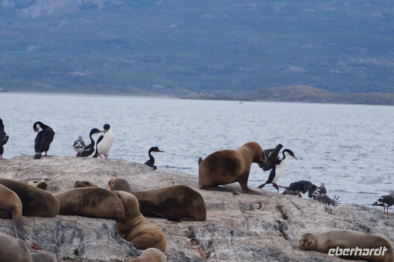 An mehreren Inseln, teils nicht mehr als aus dem Wasser ragende Felsen kamen wir vorbei, beobachteten Seelöwen, in einem Harem vertrieb ein Weibchen eine Möwe, die sich gerade über einen Seestern hermachte, manche bissen sich gegenseitig, schreckten offenbar einen Schwarm Seeschwalben auf und sahen auch ein totes Seelöwenkalb, das vielleicht von seinen Artgenossen, vielleicht aber auch von einem Seeelefanten erdrückt worden war. Die erste Gruppe musste den Seeelefanten wohl morgens gesehen haben, da befand er sich wohl mitten zwischen den Seelöwen, nachmitags sahen wir ihn nur zwischen den Felsen und mussten der Bootscrew glauben, dass es sich um eine andere Robbenart handelte. Die Mutter des toten Kalbs jedoch verteidigte dieses noch immer gegen die Artgenossen, obwohl es längst zu spät war. Der Felsen mit dem Leuchtturm (Faro) Les Éclaireurs (ja, obwohl es eine argentinische Inselgruppe ist, hat sie keinen spanischen, sondern einen französischen Namen) war der weiteste Punkt unserer Bootstour. Dann ging es nach "H". Die Insel liegt etwa fünf bis sechs Kilometer südlich von Ushuaia, sie war das südlichste was wir erreichten, wären wir südlicher gefahren, wären wir wieder in Chile gewesen.