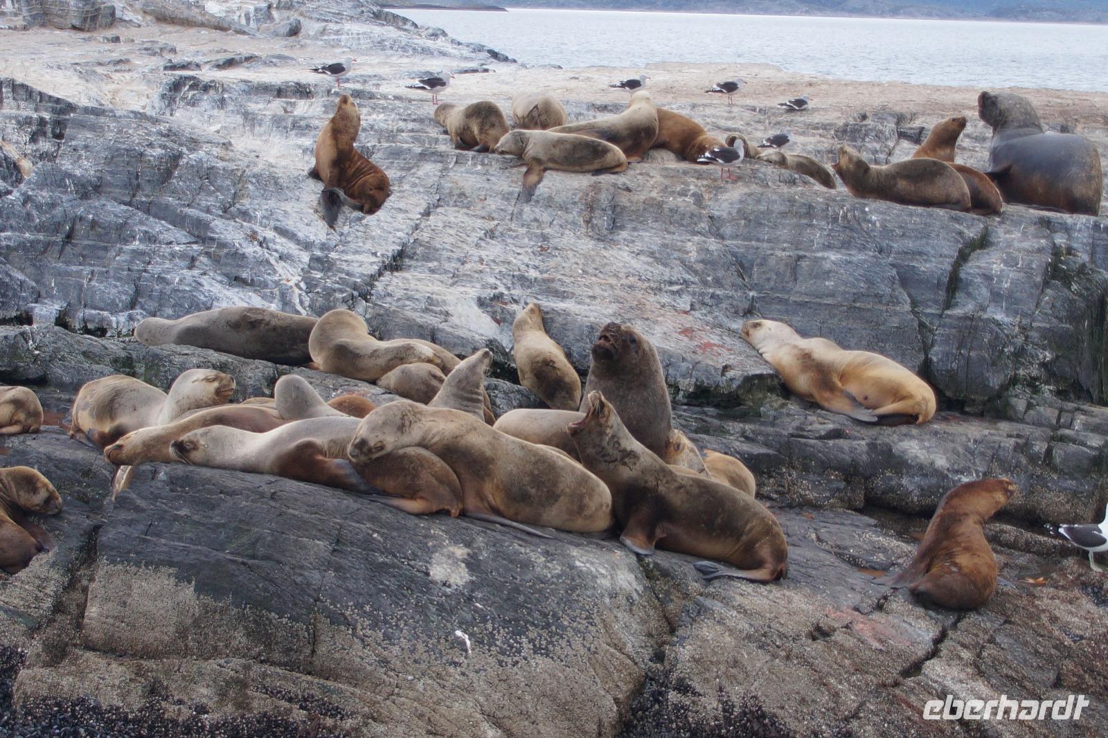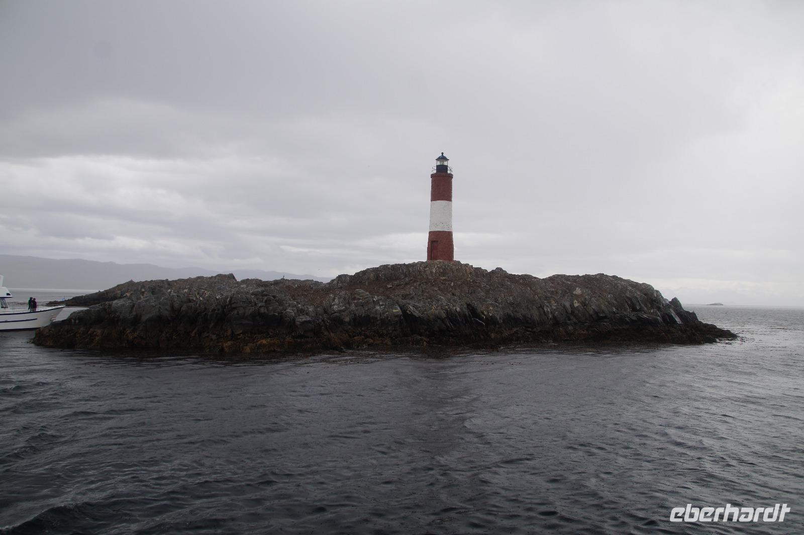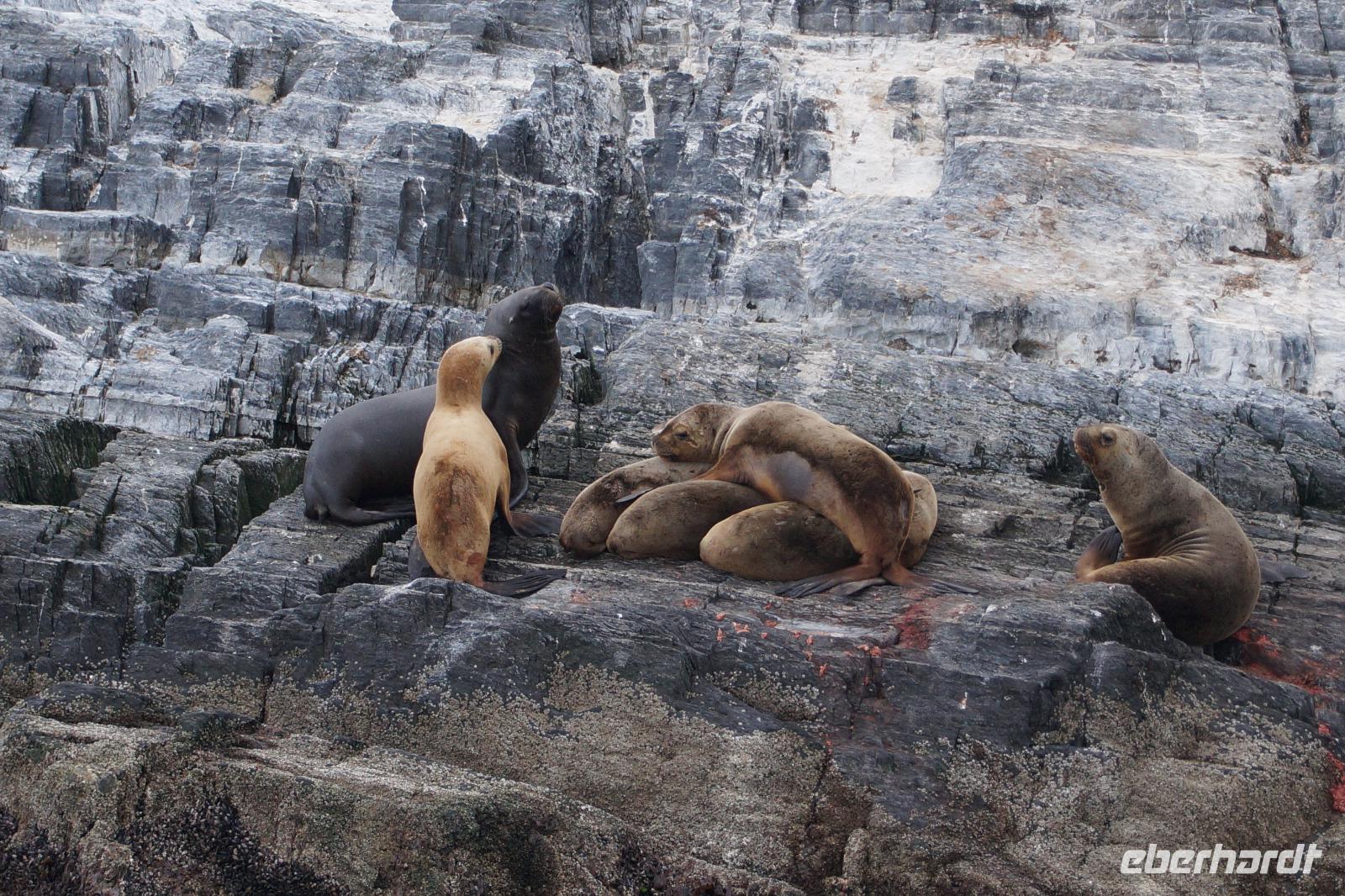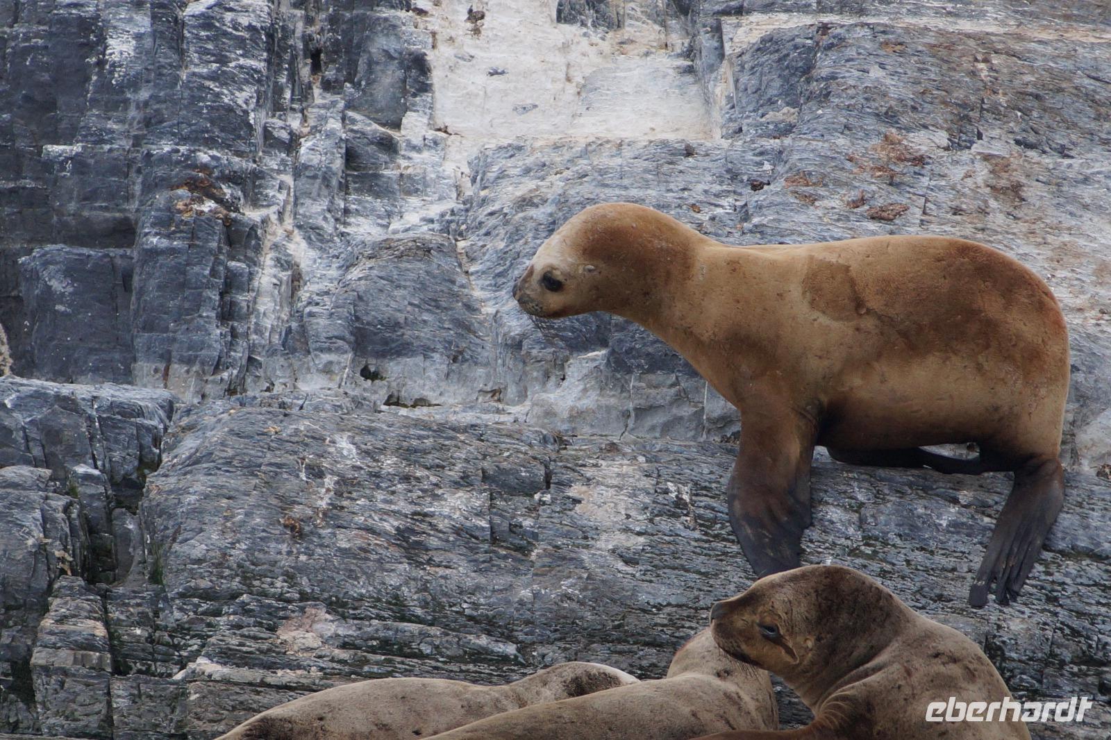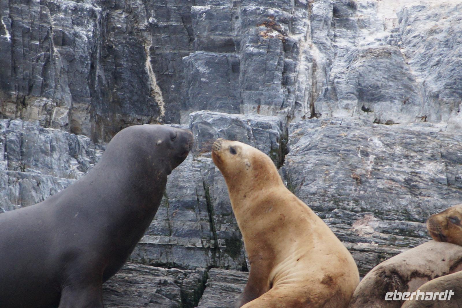 An mehreren Inseln, teils nicht mehr als aus dem Wasser ragende Felsen kamen wir vorbei, beobachteten Seelöwen, in einem Harem vertrieb ein Weibchen eine Möwe, die sich gerade über einen Seestern hermachte, manche bissen sich gegenseitig, schreckten offenbar einen Schwarm Seeschwalben auf und sahen auch ein totes Seelöwenkalb, das vielleicht von seinen Artgenossen, vielleicht aber auch von einem Seeelefanten erdrückt worden war. Die erste Gruppe musste den Seeelefanten wohl morgens gesehen haben, da befand er sich wohl mitten zwischen den Seelöwen, nachmitags sahen wir ihn nur zwischen den Felsen und mussten der Bootscrew glauben, dass es sich um eine andere Robbenart handelte. Die Mutter des toten Kalbs jedoch verteidigte dieses noch immer gegen die Artgenossen, obwohl es längst zu spät war. Der Felsen mit dem Leuchtturm (Faro) Les Éclaireurs (ja, obwohl es eine argentinische Inselgruppe ist, hat sie keinen spanischen, sondern einen französischen Namen) war der weiteste Punkt unserer Bootstour. Dann ging es nach "H". Die Insel liegt etwa fünf bis sechs Kilometer südlich von Ushuaia, sie war das südlichste was wir erreichten, wären wir südlicher gefahren, wären wir wieder in Chile gewesen.