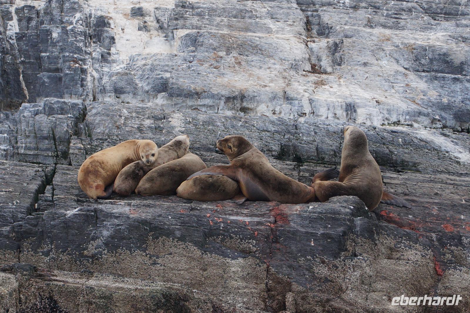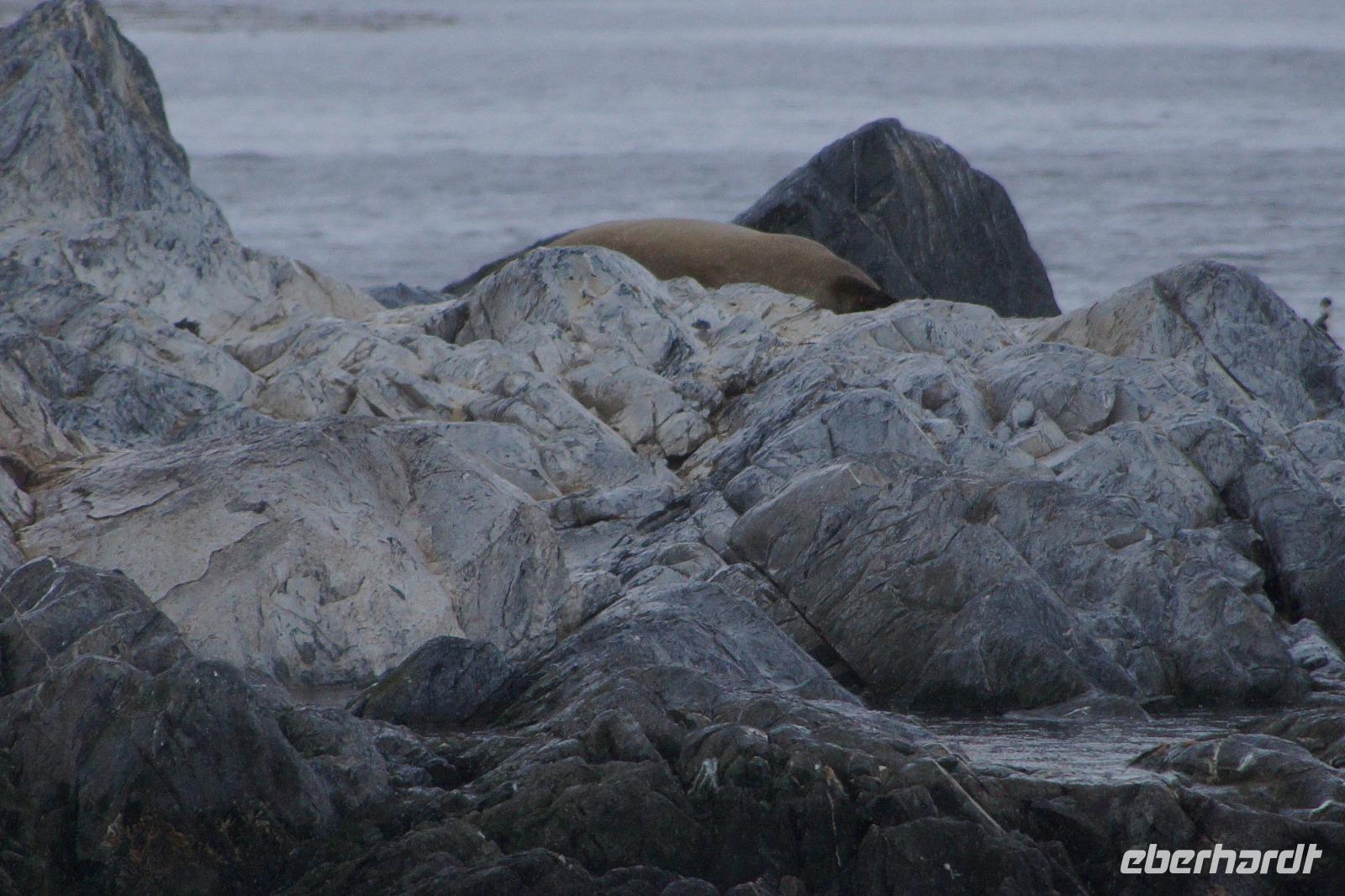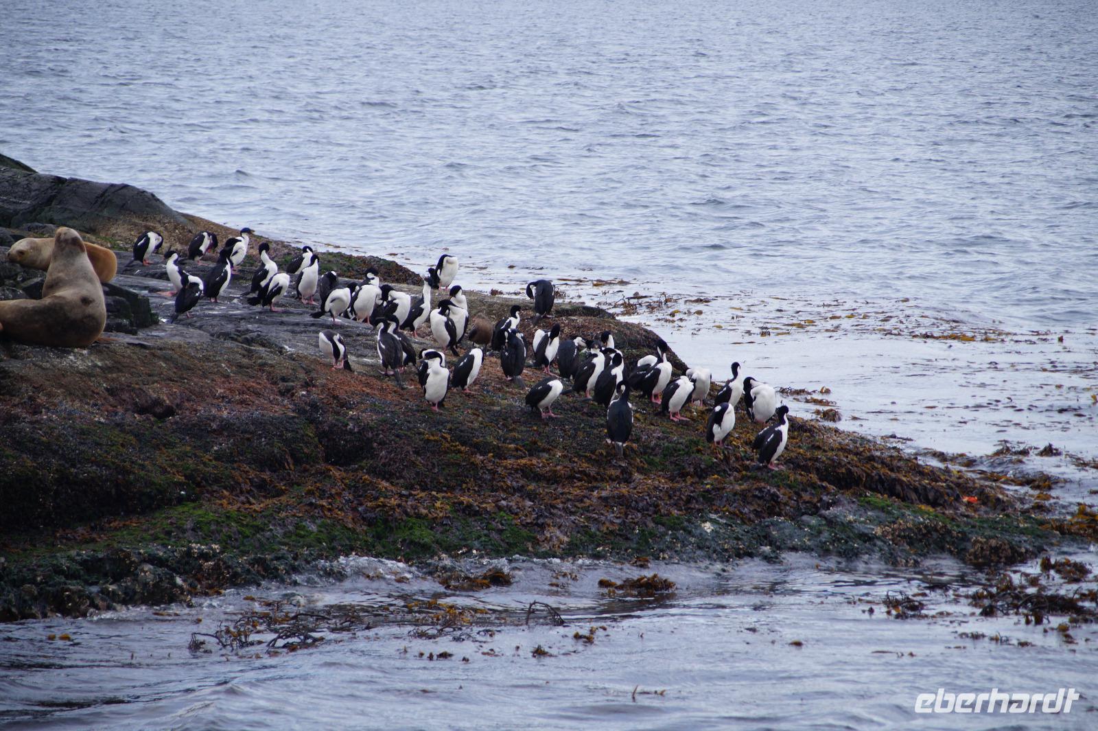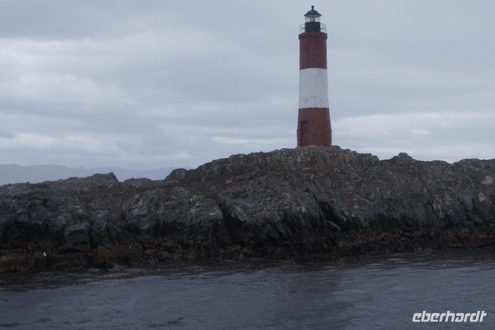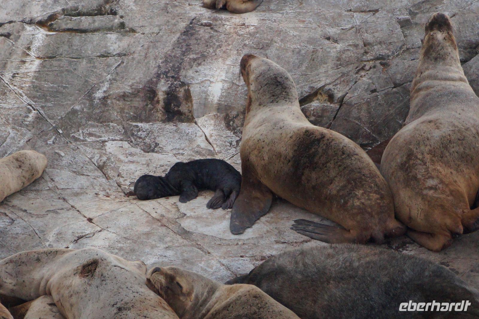 An mehreren Inseln, teils nicht mehr als aus dem Wasser ragende Felsen kamen wir vorbei, beobachteten Seelöwen, in einem Harem vertrieb ein Weibchen eine Möwe, die sich gerade über einen Seestern hermachte, manche bissen sich gegenseitig, schreckten offenbar einen Schwarm Seeschwalben auf und sahen auch ein totes Seelöwenkalb, das vielleicht von seinen Artgenossen, vielleicht aber auch von einem Seeelefanten erdrückt worden war. Die erste Gruppe musste den Seeelefanten wohl morgens gesehen haben, da befand er sich wohl mitten zwischen den Seelöwen, nachmitags sahen wir ihn nur zwischen den Felsen und mussten der Bootscrew glauben, dass es sich um eine andere Robbenart handelte. Die Mutter des toten Kalbs jedoch verteidigte dieses noch immer gegen die Artgenossen, obwohl es längst zu spät war. Der Felsen mit dem Leuchtturm (Faro) Les Éclaireurs (ja, obwohl es eine argentinische Inselgruppe ist, hat sie keinen spanischen, sondern einen französischen Namen) war der weiteste Punkt unserer Bootstour. Dann ging es nach "H". Die Insel liegt etwa fünf bis sechs Kilometer südlich von Ushuaia, sie war das südlichste was wir erreichten, wären wir südlicher gefahren, wären wir wieder in Chile gewesen.