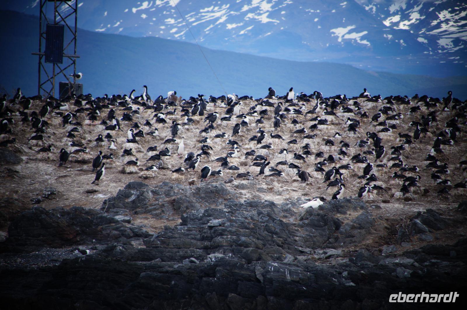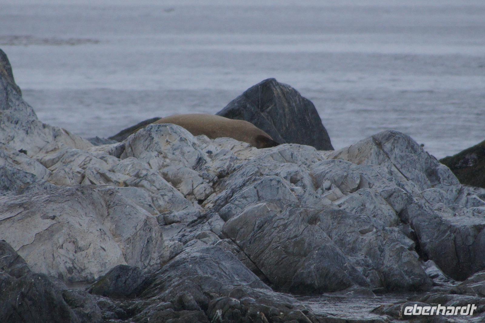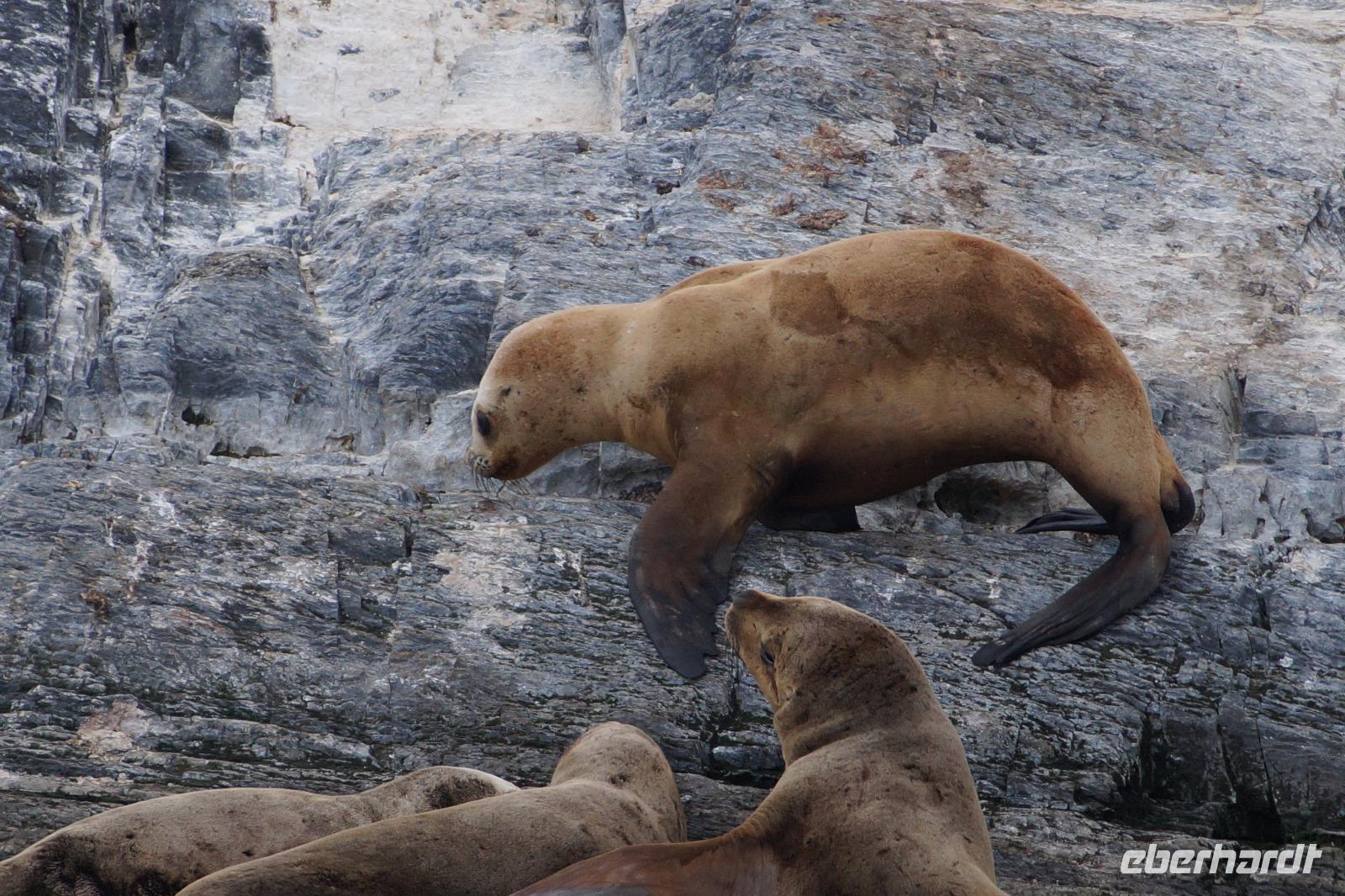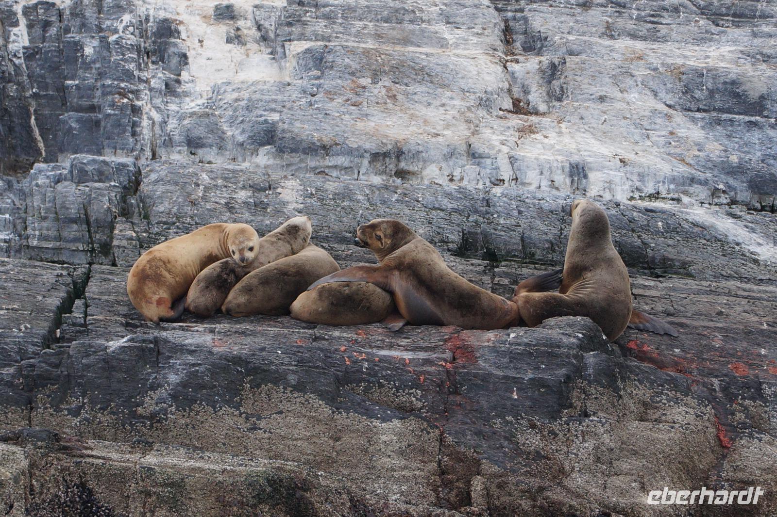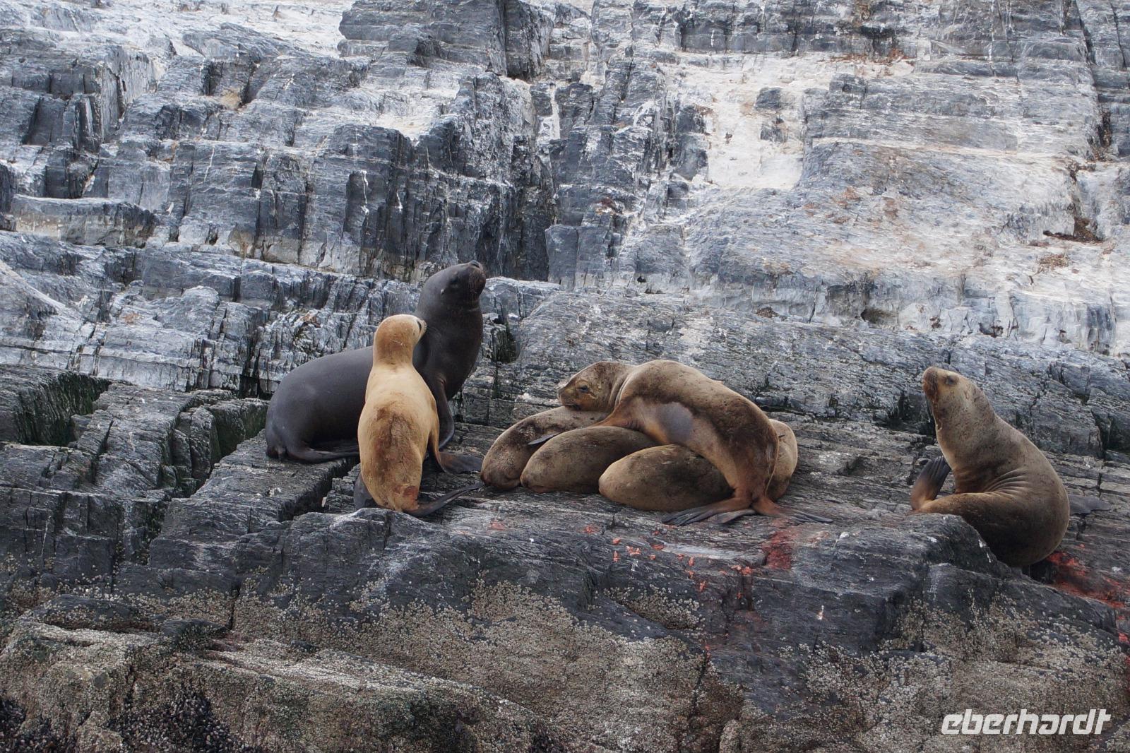 An mehreren Inseln, teils nicht mehr als aus dem Wasser ragende Felsen kamen wir vorbei, beobachteten Seelöwen, in einem Harem vertrieb ein Weibchen eine Möwe, die sich gerade über einen Seestern hermachte, manche bissen sich gegenseitig, schreckten offenbar einen Schwarm Seeschwalben auf und sahen auch ein totes Seelöwenkalb, das vielleicht von seinen Artgenossen, vielleicht aber auch von einem Seeelefanten erdrückt worden war. Die erste Gruppe musste den Seeelefanten wohl morgens gesehen haben, da befand er sich wohl mitten zwischen den Seelöwen, nachmitags sahen wir ihn nur zwischen den Felsen und mussten der Bootscrew glauben, dass es sich um eine andere Robbenart handelte. Die Mutter des toten Kalbs jedoch verteidigte dieses noch immer gegen die Artgenossen, obwohl es längst zu spät war. Der Felsen mit dem Leuchtturm (Faro) Les Éclaireurs (ja, obwohl es eine argentinische Inselgruppe ist, hat sie keinen spanischen, sondern einen französischen Namen) war der weiteste Punkt unserer Bootstour. Dann ging es nach "H". Die Insel liegt etwa fünf bis sechs Kilometer südlich von Ushuaia, sie war das südlichste was wir erreichten, wären wir südlicher gefahren, wären wir wieder in Chile gewesen.