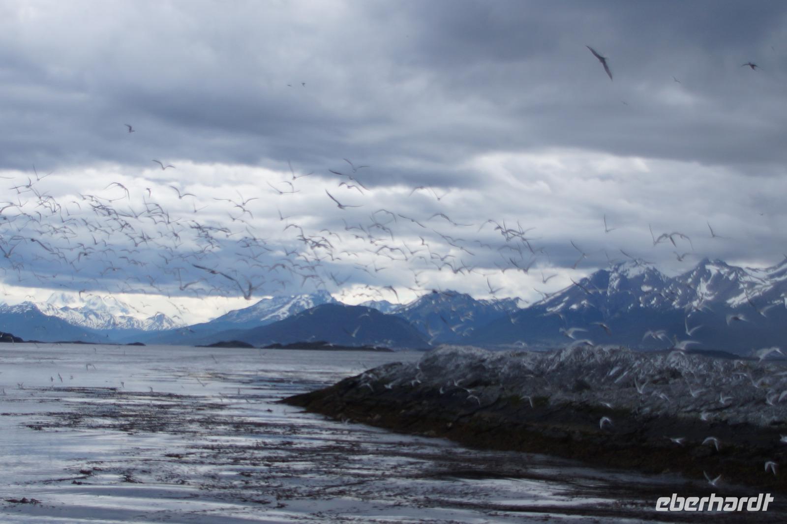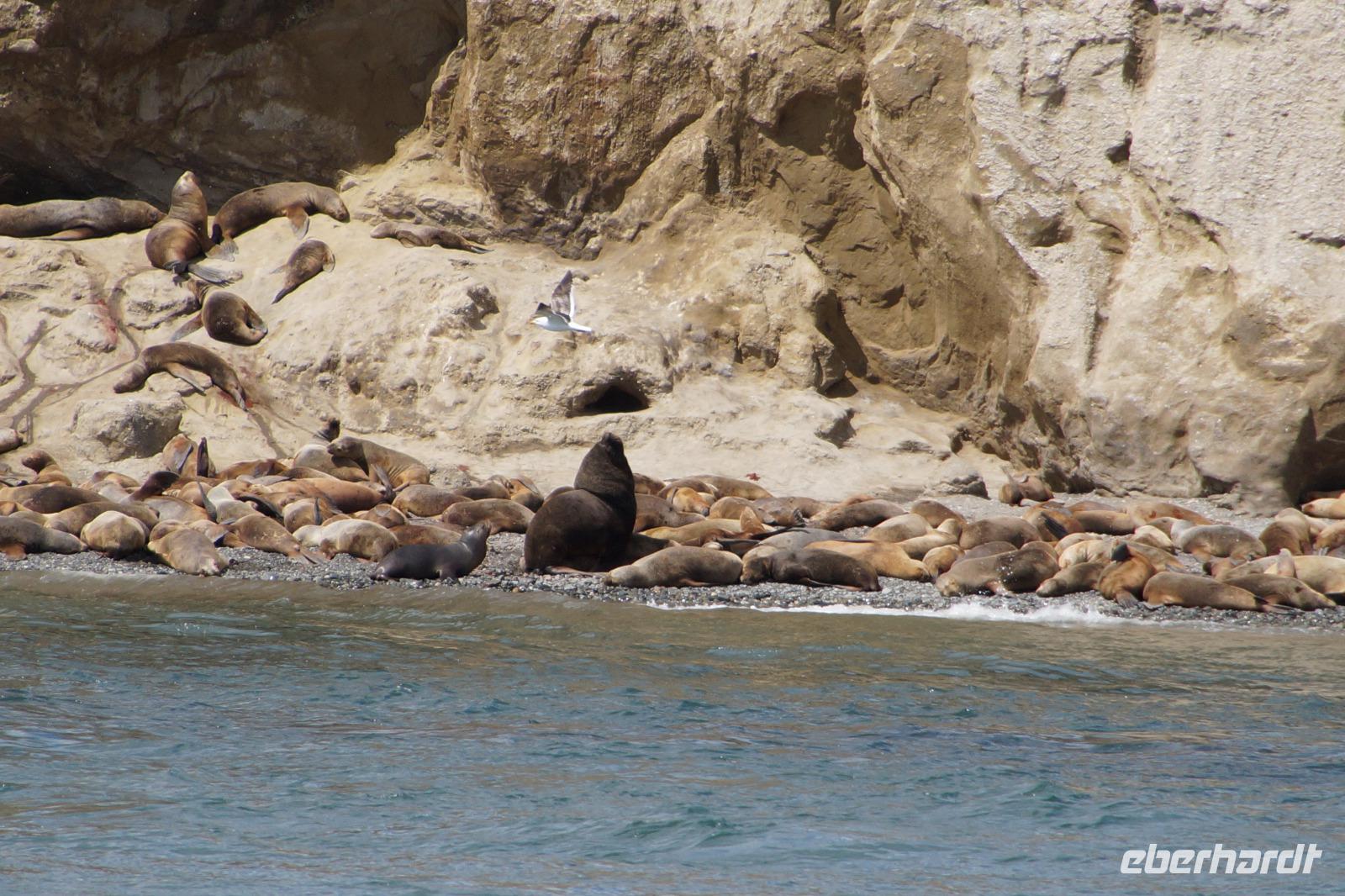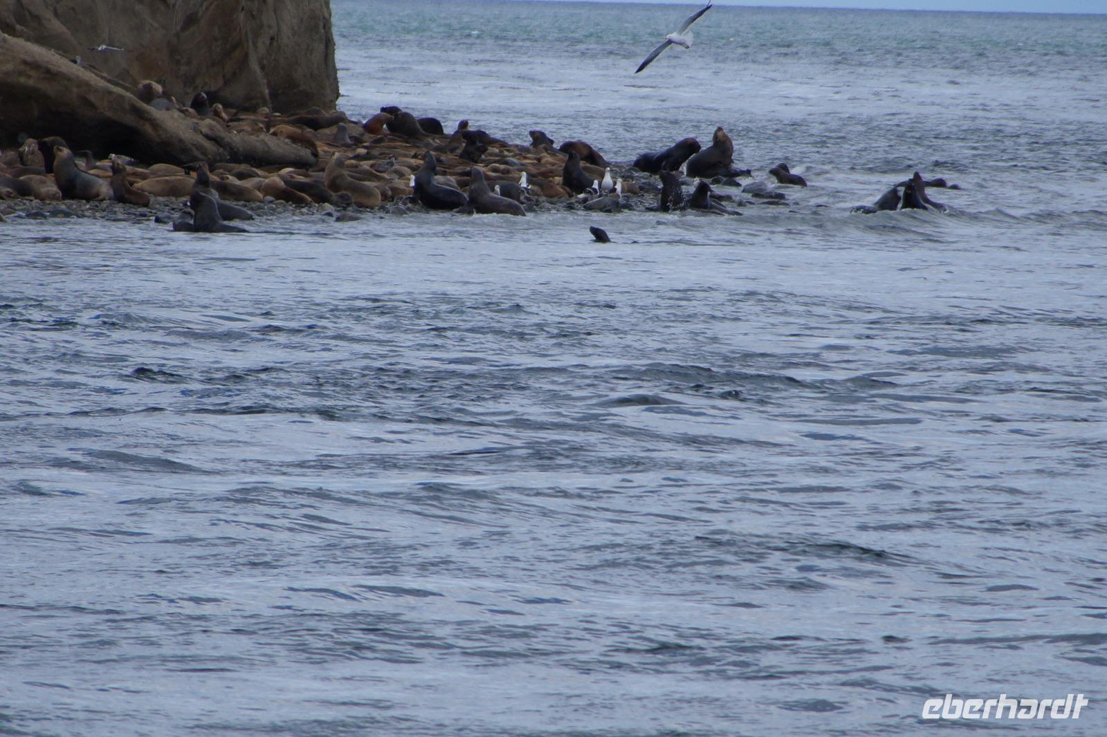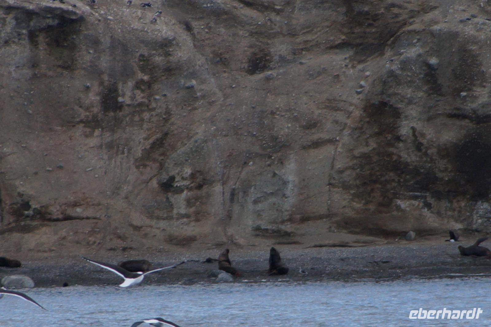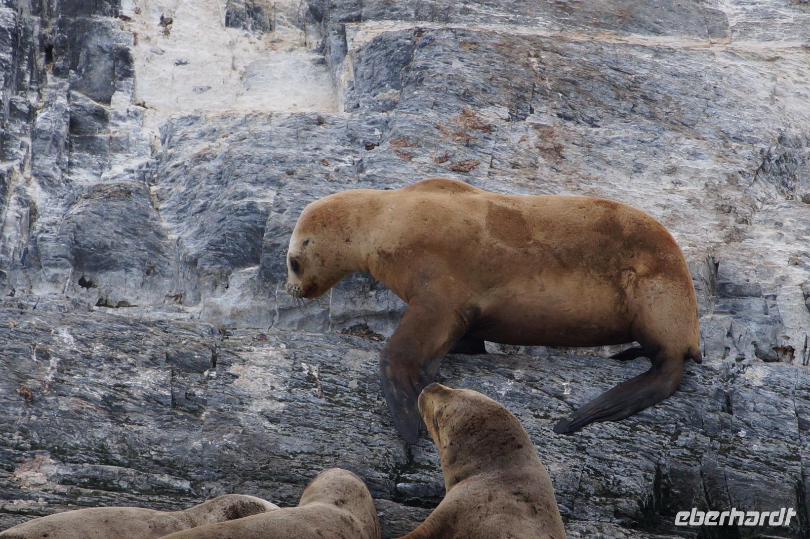 An mehreren Inseln, teils nicht mehr als aus dem Wasser ragende Felsen kamen wir vorbei, beobachteten Seelöwen, in einem Harem vertrieb ein Weibchen eine Möwe, die sich gerade über einen Seestern hermachte, manche bissen sich gegenseitig, schreckten offenbar einen Schwarm Seeschwalben auf und sahen auch ein totes Seelöwenkalb, das vielleicht von seinen Artgenossen, vielleicht aber auch von einem Seeelefanten erdrückt worden war. Die erste Gruppe musste den Seeelefanten wohl morgens gesehen haben, da befand er sich wohl mitten zwischen den Seelöwen, nachmitags sahen wir ihn nur zwischen den Felsen und mussten der Bootscrew glauben, dass es sich um eine andere Robbenart handelte. Die Mutter des toten Kalbs jedoch verteidigte dieses noch immer gegen die Artgenossen, obwohl es längst zu spät war. Der Felsen mit dem Leuchtturm (Faro) Les Éclaireurs (ja, obwohl es eine argentinische Inselgruppe ist, hat sie keinen spanischen, sondern einen französischen Namen) war der weiteste Punkt unserer Bootstour. Dann ging es nach "H". Die Insel liegt etwa fünf bis sechs Kilometer südlich von Ushuaia, sie war das südlichste was wir erreichten, wären wir südlicher gefahren, wären wir wieder in Chile gewesen.