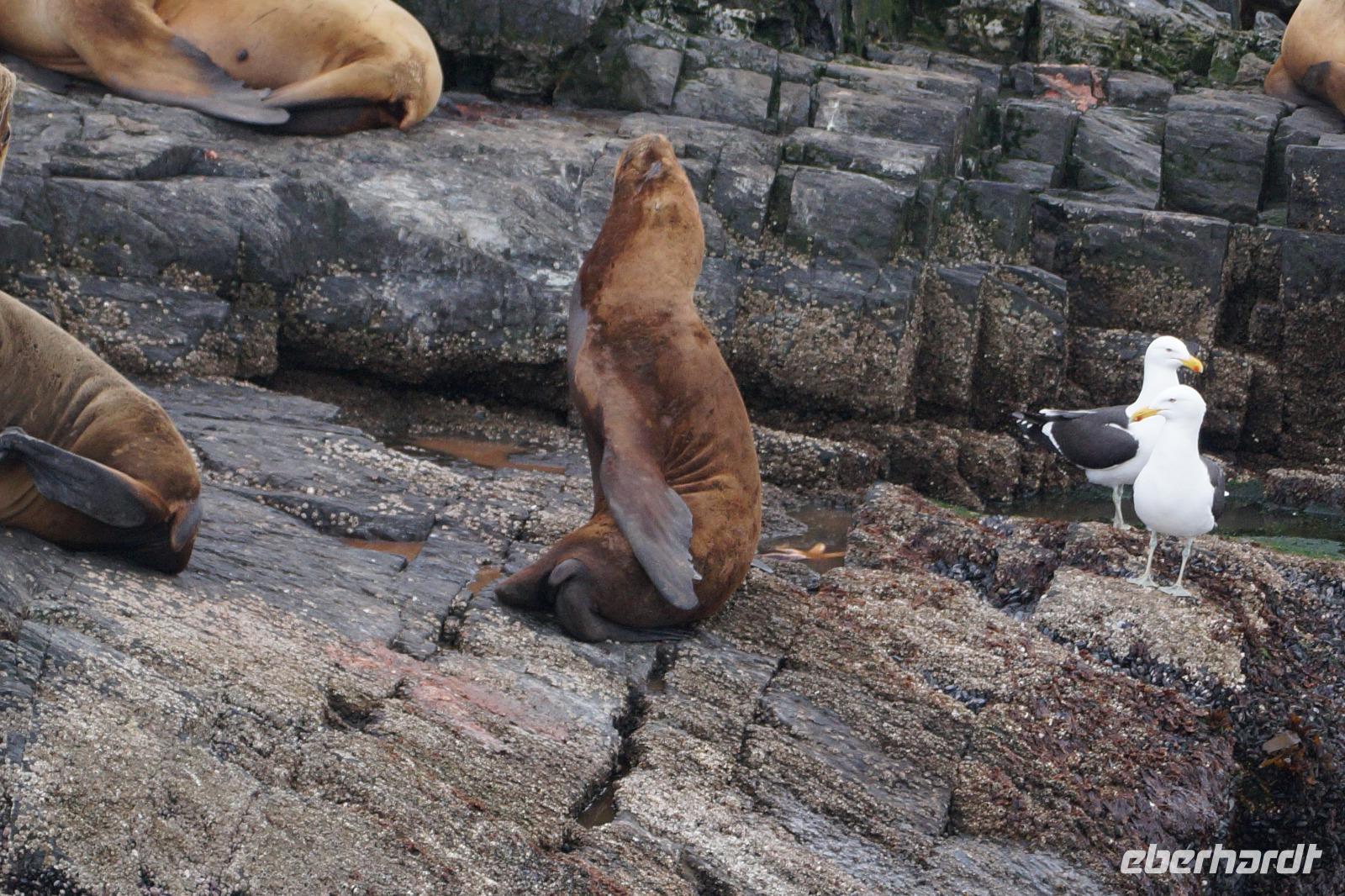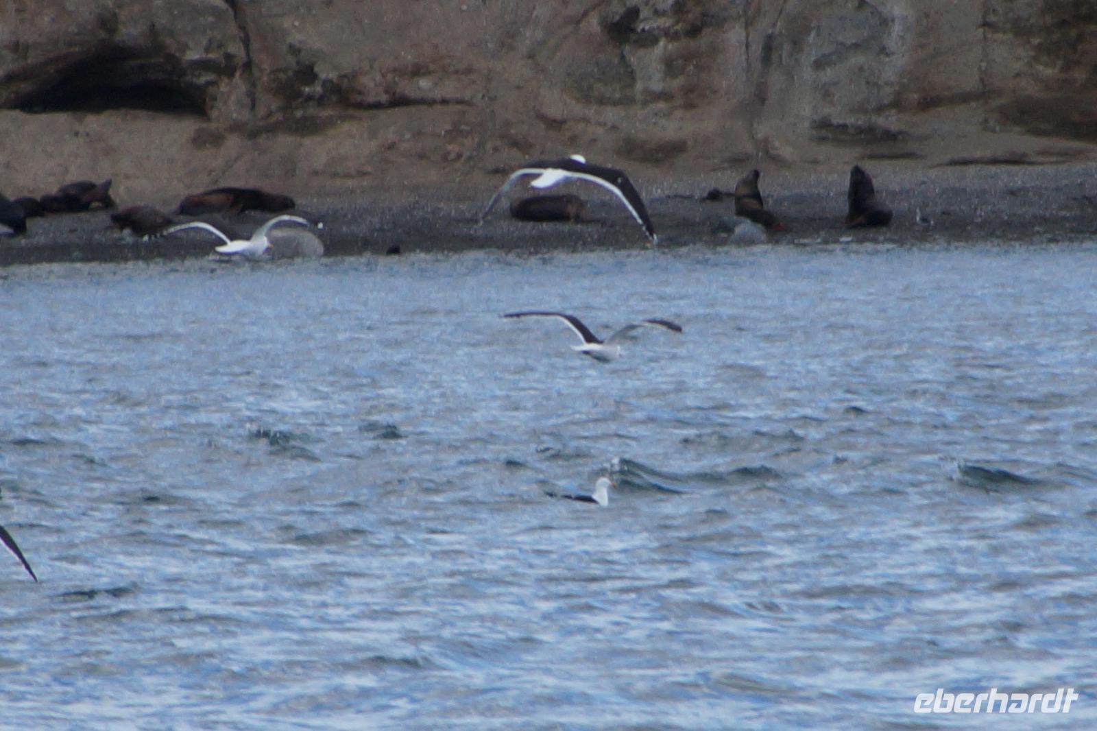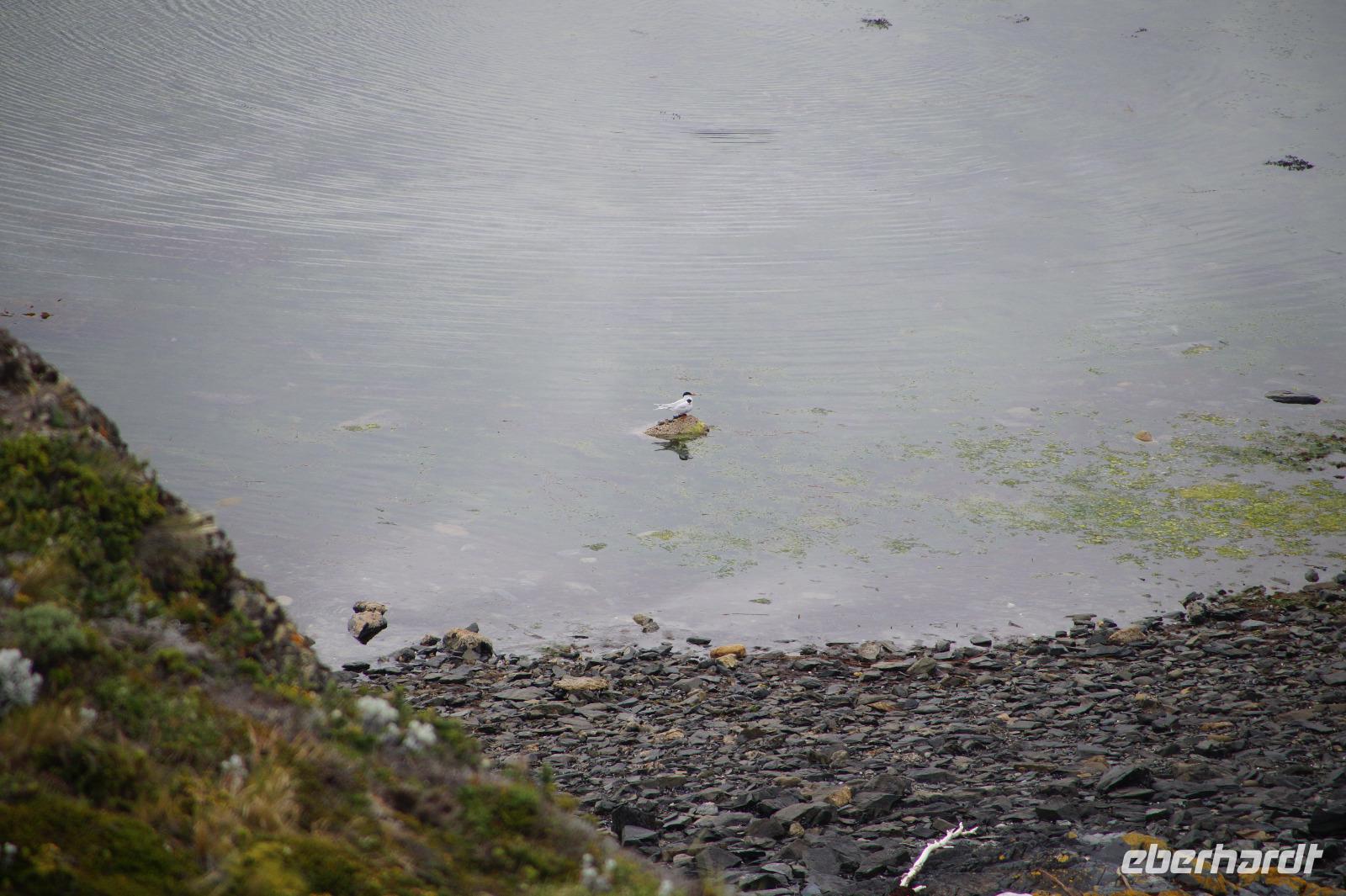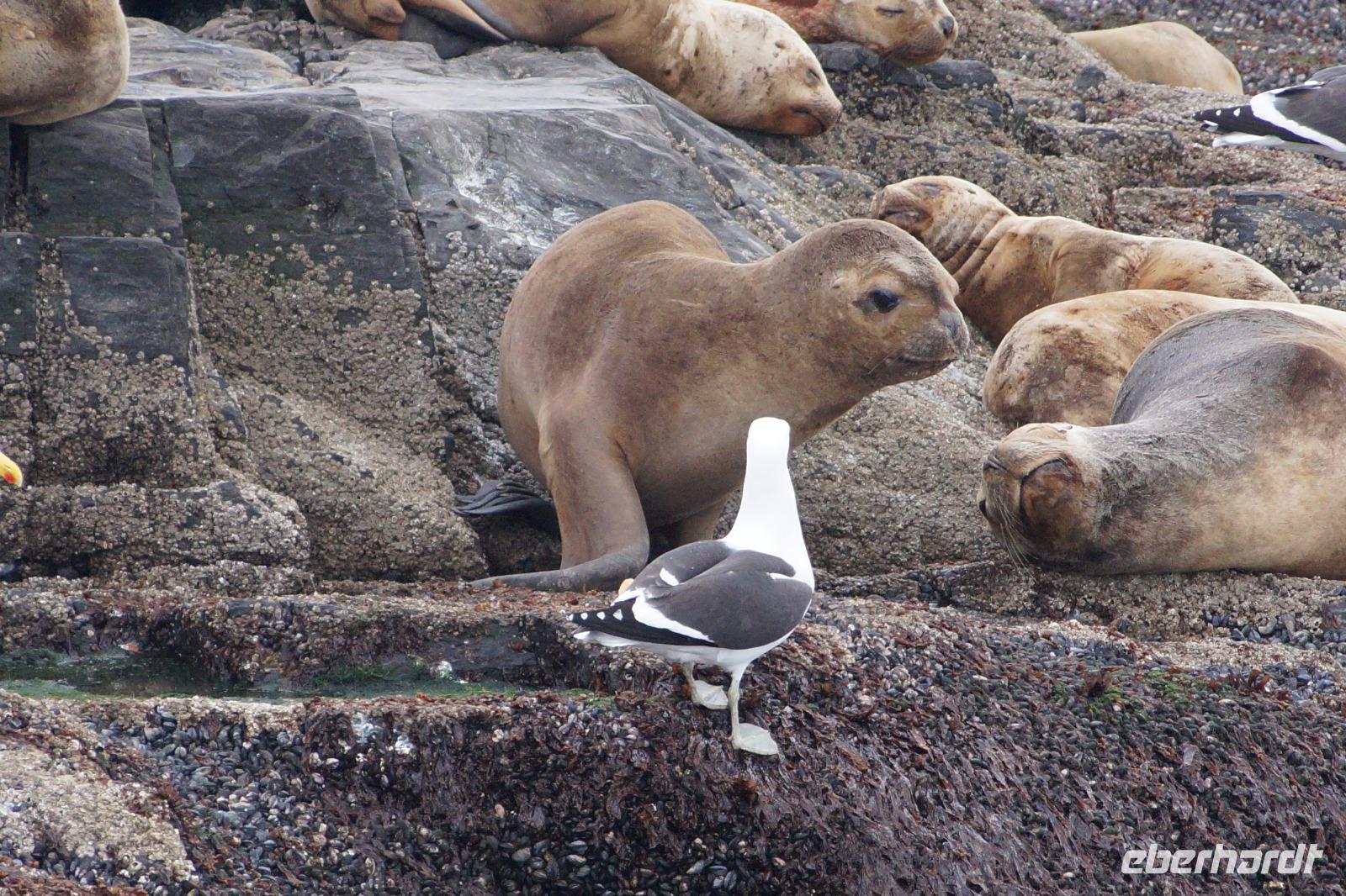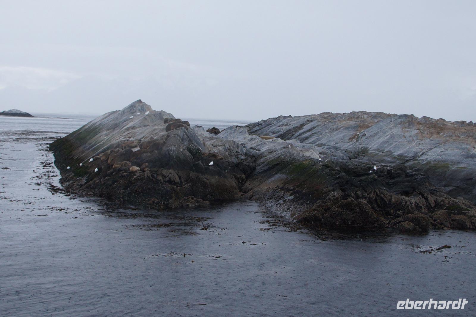 An mehreren Inseln, teils nicht mehr als aus dem Wasser ragende Felsen kamen wir vorbei, beobachteten Seelöwen, in einem Harem vertrieb ein Weibchen eine Möwe, die sich gerade über einen Seestern hermachte, manche bissen sich gegenseitig, schreckten offenbar einen Schwarm Seeschwalben auf und sahen auch ein totes Seelöwenkalb, das vielleicht von seinen Artgenossen, vielleicht aber auch von einem Seeelefanten erdrückt worden war. Die erste Gruppe musste den Seeelefanten wohl morgens gesehen haben, da befand er sich wohl mitten zwischen den Seelöwen, nachmitags sahen wir ihn nur zwischen den Felsen und mussten der Bootscrew glauben, dass es sich um eine andere Robbenart handelte. Die Mutter des toten Kalbs jedoch verteidigte dieses noch immer gegen die Artgenossen, obwohl es längst zu spät war. Der Felsen mit dem Leuchtturm (Faro) Les Éclaireurs (ja, obwohl es eine argentinische Inselgruppe ist, hat sie keinen spanischen, sondern einen französischen Namen) war der weiteste Punkt unserer Bootstour. Dann ging es nach "H". Die Insel liegt etwa fünf bis sechs Kilometer südlich von Ushuaia, sie war das südlichste was wir erreichten, wären wir südlicher gefahren, wären wir wieder in Chile gewesen.