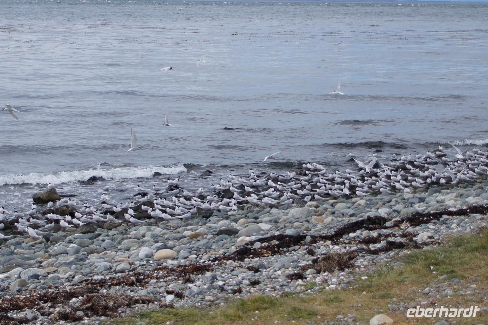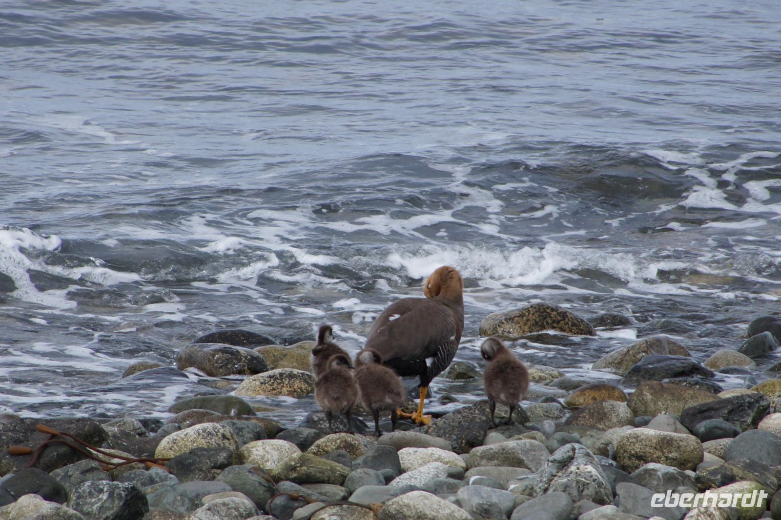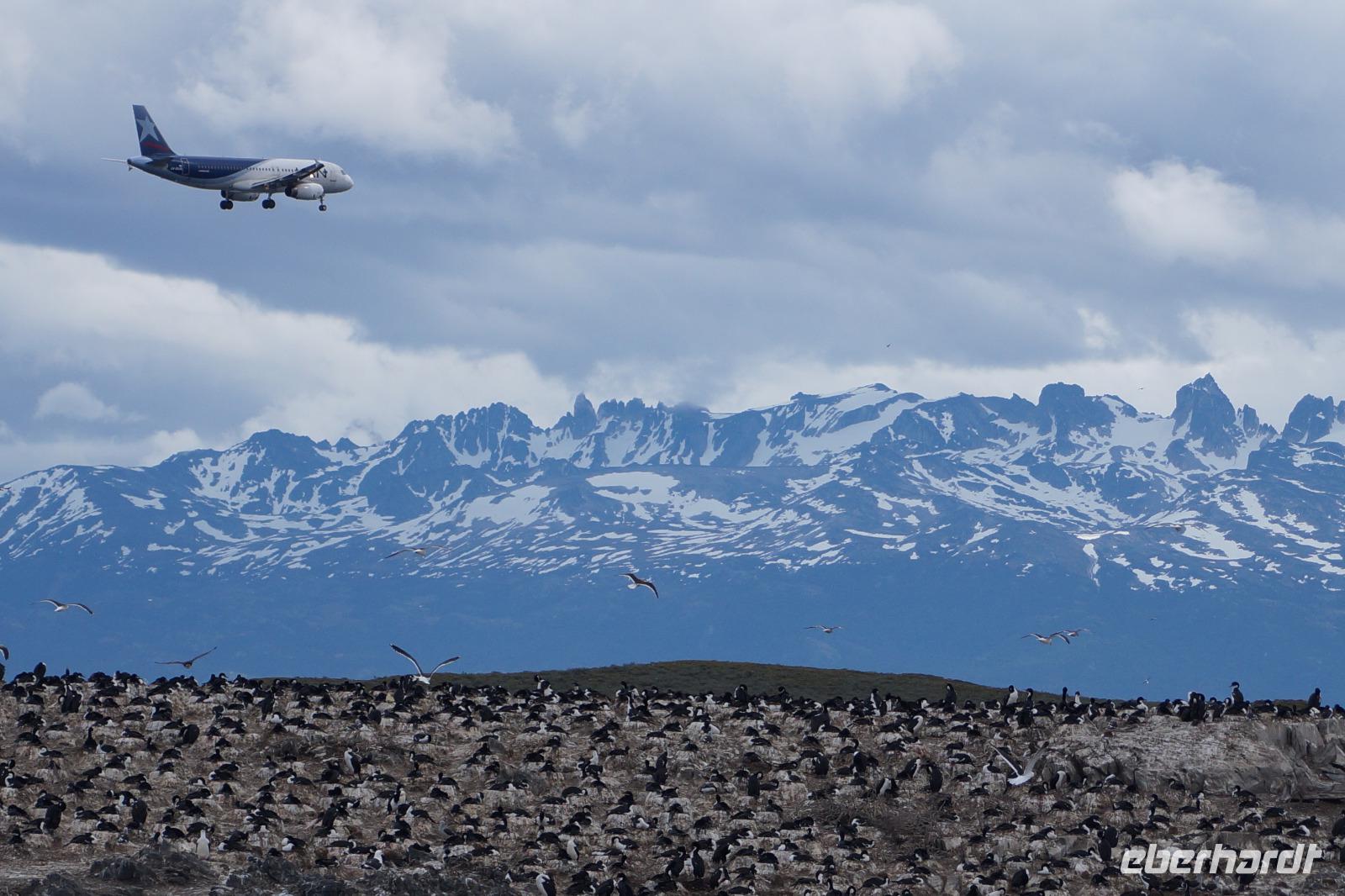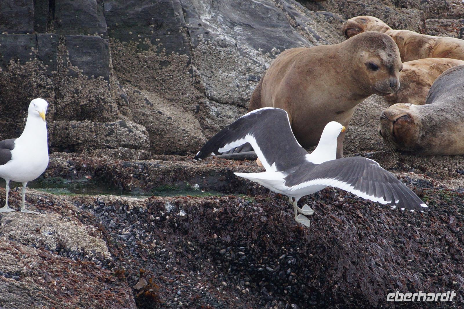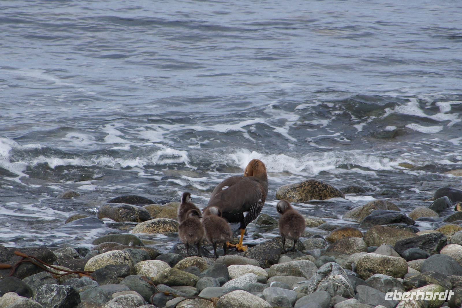 An mehreren Inseln, teils nicht mehr als aus dem Wasser ragende Felsen kamen wir vorbei, beobachteten Seelöwen, in einem Harem vertrieb ein Weibchen eine Möwe, die sich gerade über einen Seestern hermachte, manche bissen sich gegenseitig, schreckten offenbar einen Schwarm Seeschwalben auf und sahen auch ein totes Seelöwenkalb, das vielleicht von seinen Artgenossen, vielleicht aber auch von einem Seeelefanten erdrückt worden war. Die erste Gruppe musste den Seeelefanten wohl morgens gesehen haben, da befand er sich wohl mitten zwischen den Seelöwen, nachmitags sahen wir ihn nur zwischen den Felsen und mussten der Bootscrew glauben, dass es sich um eine andere Robbenart handelte. Die Mutter des toten Kalbs jedoch verteidigte dieses noch immer gegen die Artgenossen, obwohl es längst zu spät war. Der Felsen mit dem Leuchtturm (Faro) Les Éclaireurs (ja, obwohl es eine argentinische Inselgruppe ist, hat sie keinen spanischen, sondern einen französischen Namen) war der weiteste Punkt unserer Bootstour. Dann ging es nach "H". Die Insel liegt etwa fünf bis sechs Kilometer südlich von Ushuaia, sie war das südlichste was wir erreichten, wären wir südlicher gefahren, wären wir wieder in Chile gewesen.