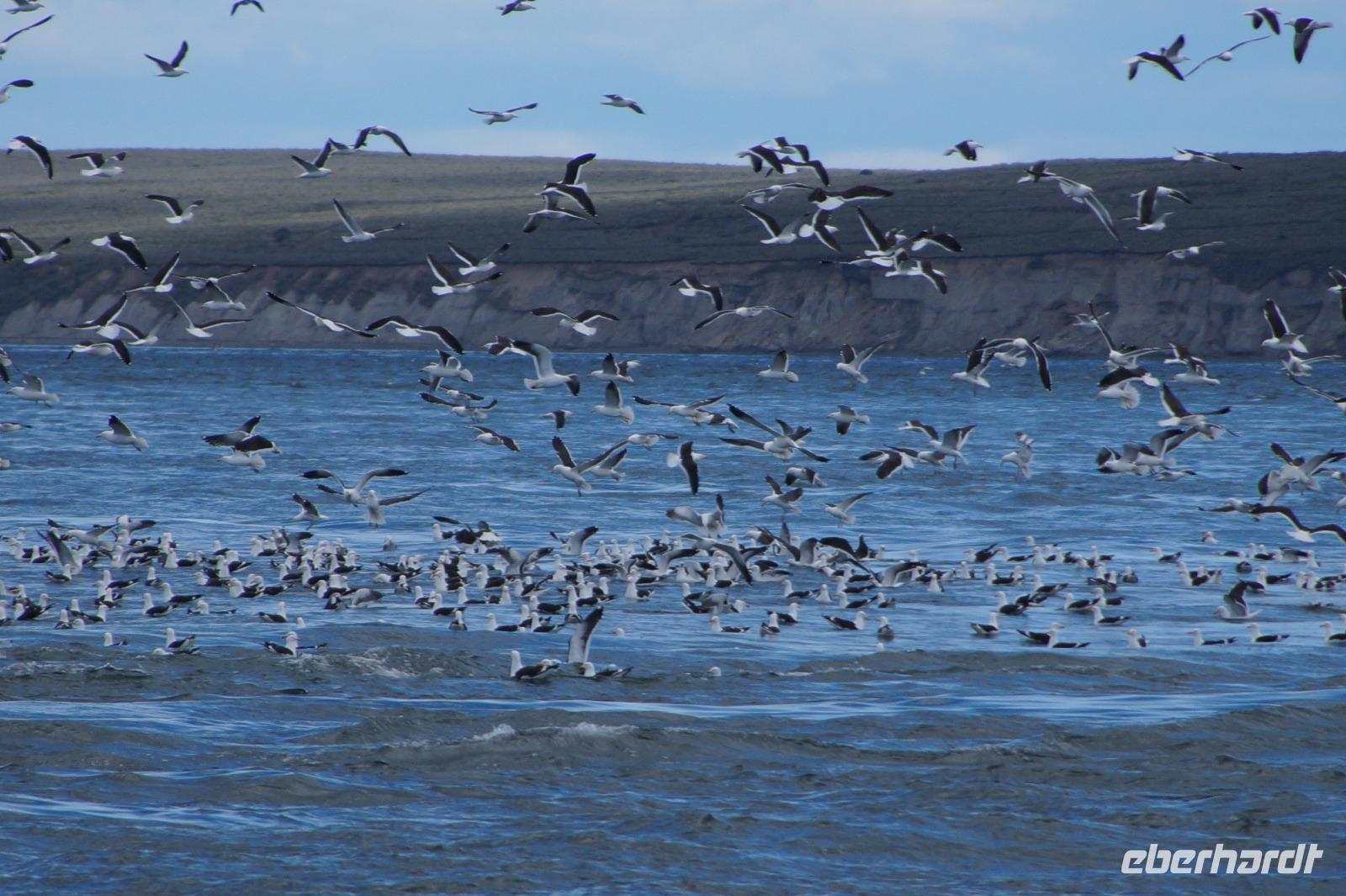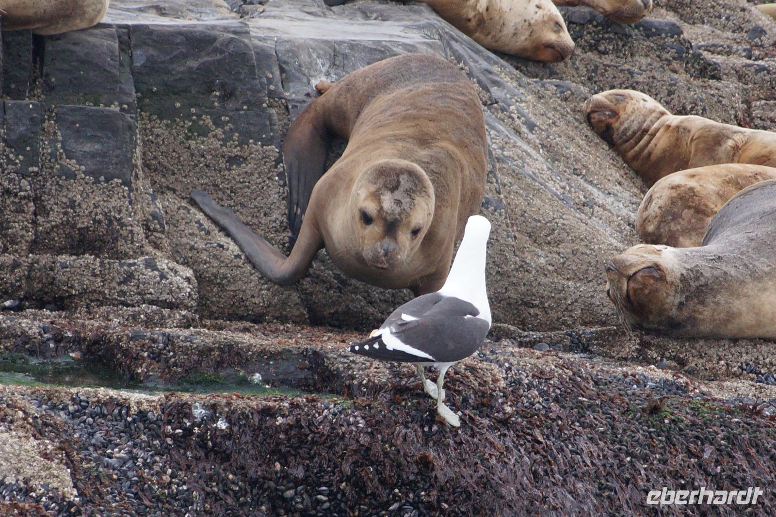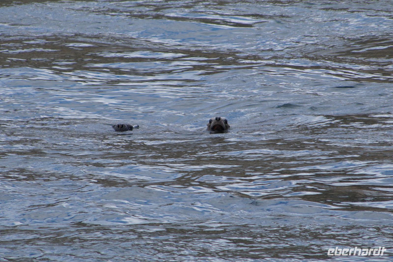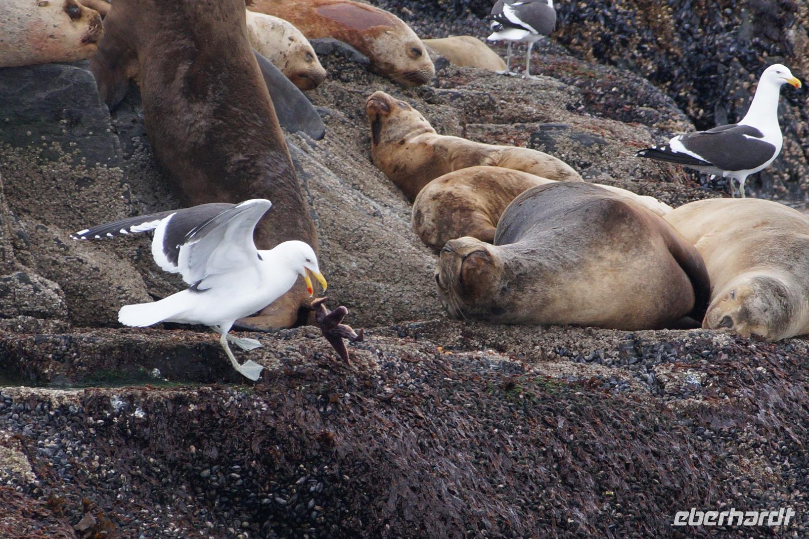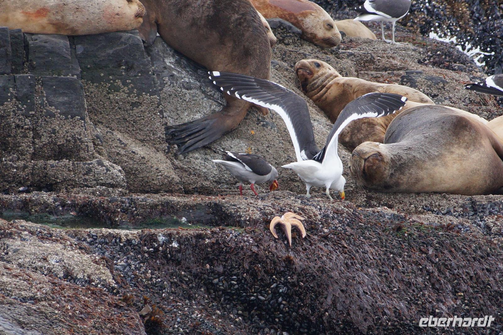 An mehreren Inseln, teils nicht mehr als aus dem Wasser ragende Felsen kamen wir vorbei, beobachteten Seelöwen, in einem Harem vertrieb ein Weibchen eine Möwe, die sich gerade über einen Seestern hermachte, manche bissen sich gegenseitig, schreckten offenbar einen Schwarm Seeschwalben auf und sahen auch ein totes Seelöwenkalb, das vielleicht von seinen Artgenossen, vielleicht aber auch von einem Seeelefanten erdrückt worden war. Die erste Gruppe musste den Seeelefanten wohl morgens gesehen haben, da befand er sich wohl mitten zwischen den Seelöwen, nachmitags sahen wir ihn nur zwischen den Felsen und mussten der Bootscrew glauben, dass es sich um eine andere Robbenart handelte. Die Mutter des toten Kalbs jedoch verteidigte dieses noch immer gegen die Artgenossen, obwohl es längst zu spät war. Der Felsen mit dem Leuchtturm (Faro) Les Éclaireurs (ja, obwohl es eine argentinische Inselgruppe ist, hat sie keinen spanischen, sondern einen französischen Namen) war der weiteste Punkt unserer Bootstour. Dann ging es nach "H". Die Insel liegt etwa fünf bis sechs Kilometer südlich von Ushuaia, sie war das südlichste was wir erreichten, wären wir südlicher gefahren, wären wir wieder in Chile gewesen.