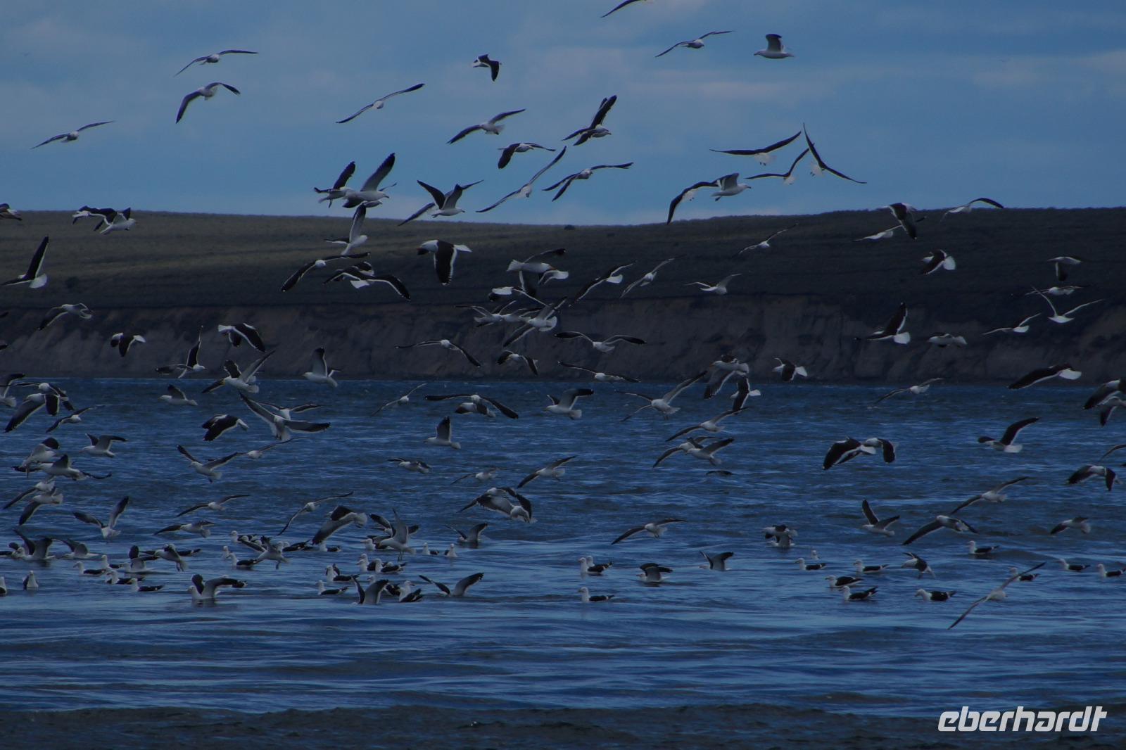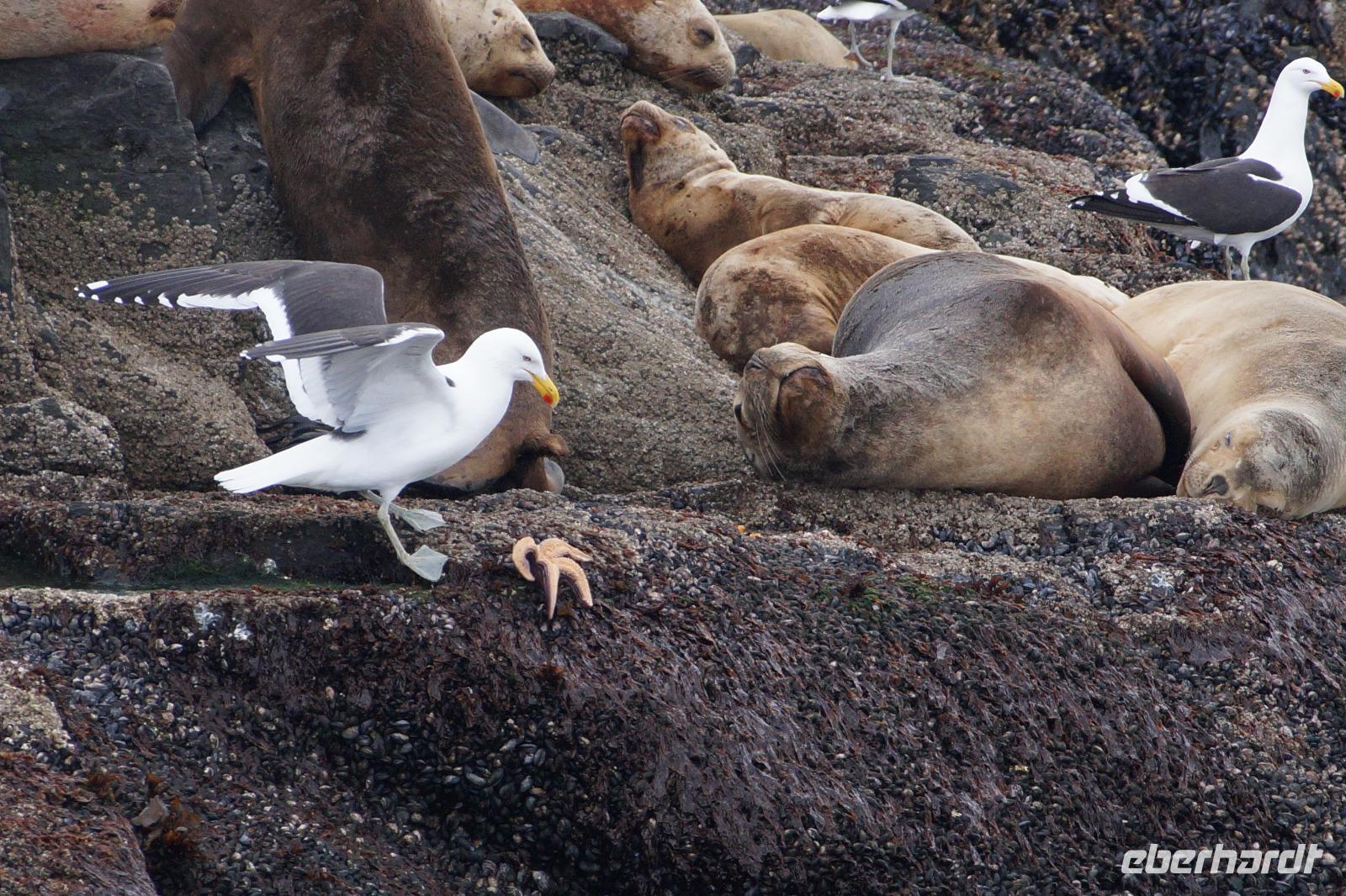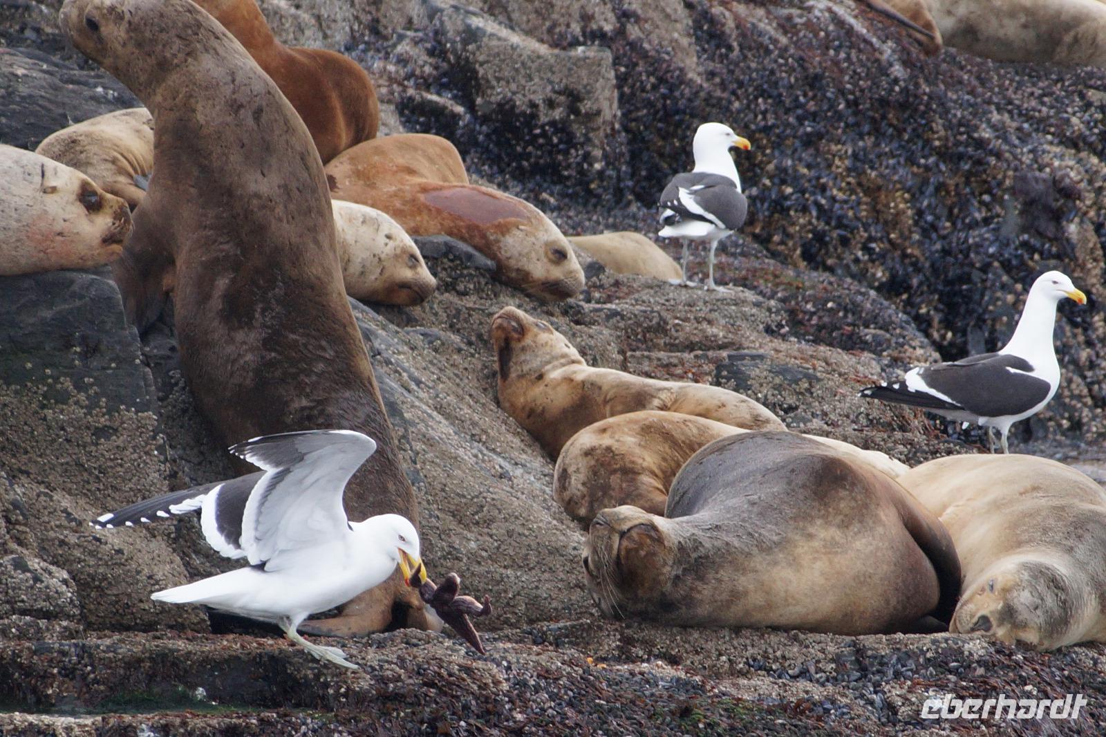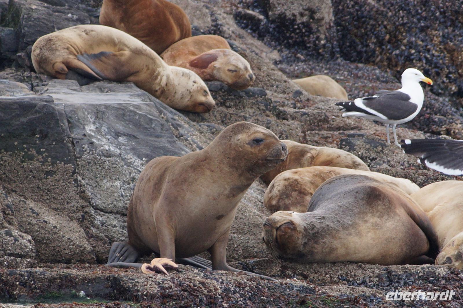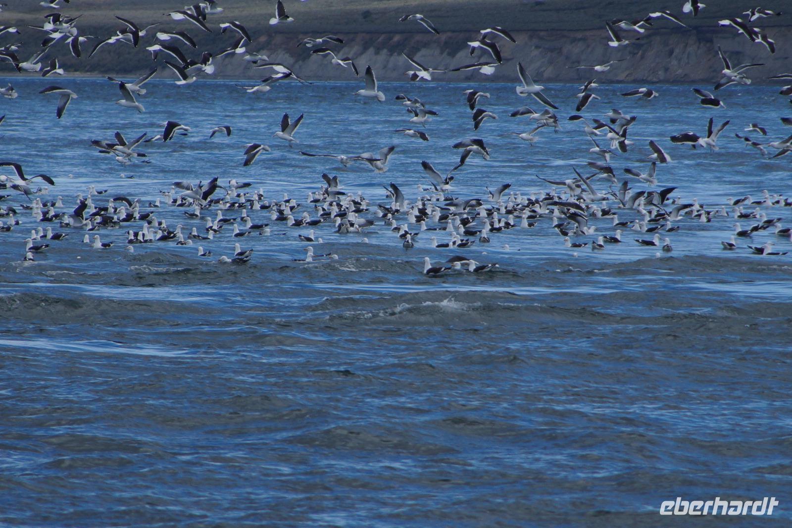 An mehreren Inseln, teils nicht mehr als aus dem Wasser ragende Felsen kamen wir vorbei, beobachteten Seelöwen, in einem Harem vertrieb ein Weibchen eine Möwe, die sich gerade über einen Seestern hermachte, manche bissen sich gegenseitig, schreckten offenbar einen Schwarm Seeschwalben auf und sahen auch ein totes Seelöwenkalb, das vielleicht von seinen Artgenossen, vielleicht aber auch von einem Seeelefanten erdrückt worden war. Die erste Gruppe musste den Seeelefanten wohl morgens gesehen haben, da befand er sich wohl mitten zwischen den Seelöwen, nachmitags sahen wir ihn nur zwischen den Felsen und mussten der Bootscrew glauben, dass es sich um eine andere Robbenart handelte. Die Mutter des toten Kalbs jedoch verteidigte dieses noch immer gegen die Artgenossen, obwohl es längst zu spät war. Der Felsen mit dem Leuchtturm (Faro) Les Éclaireurs (ja, obwohl es eine argentinische Inselgruppe ist, hat sie keinen spanischen, sondern einen französischen Namen) war der weiteste Punkt unserer Bootstour. Dann ging es nach "H". Die Insel liegt etwa fünf bis sechs Kilometer südlich von Ushuaia, sie war das südlichste was wir erreichten, wären wir südlicher gefahren, wären wir wieder in Chile gewesen.