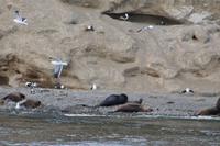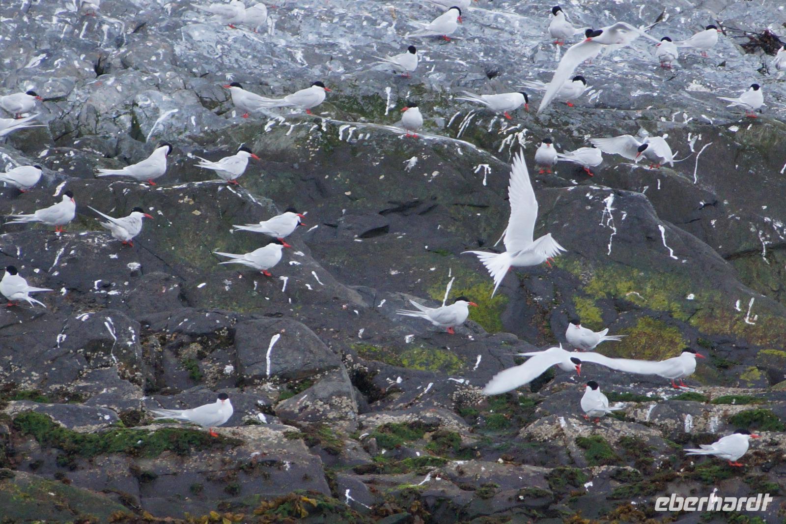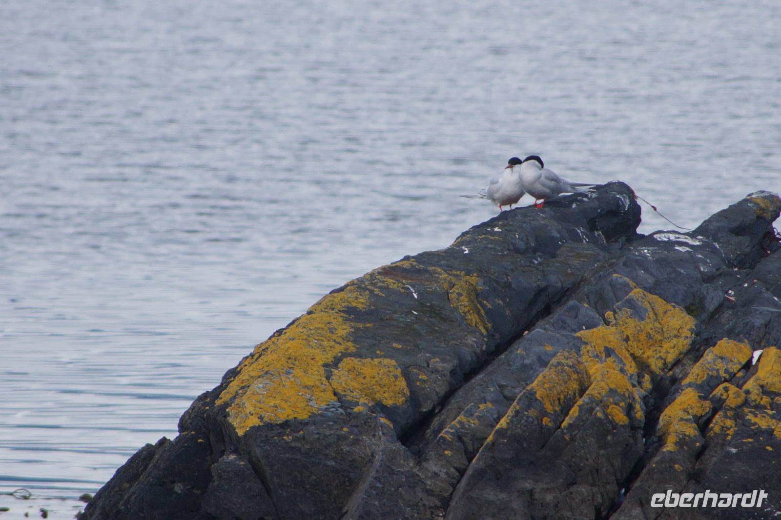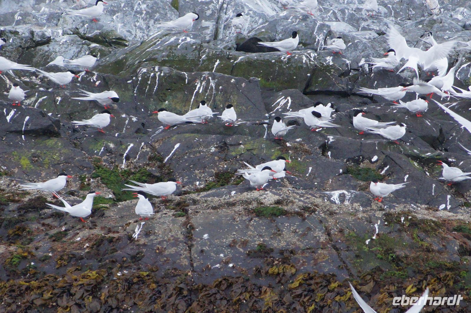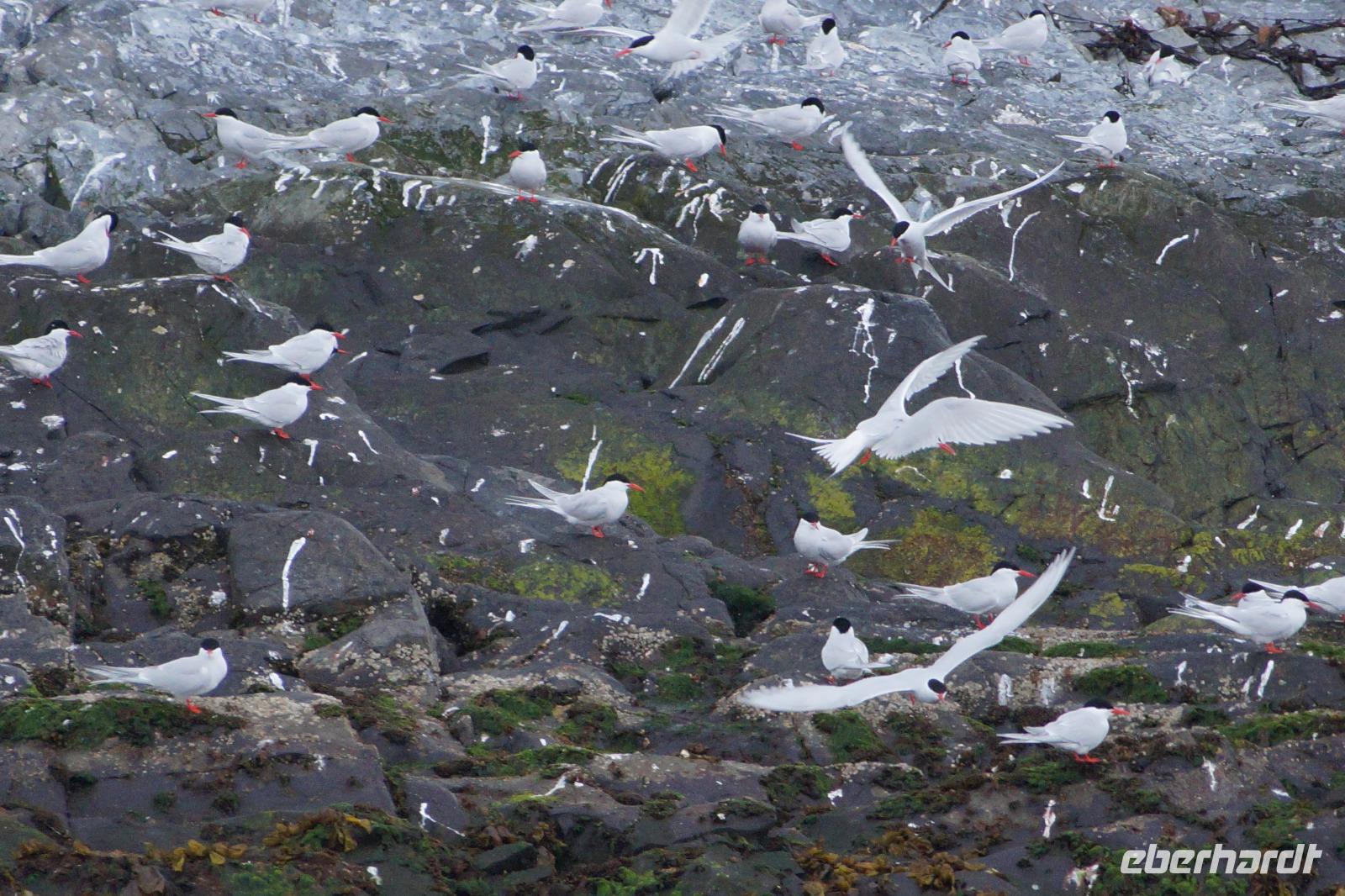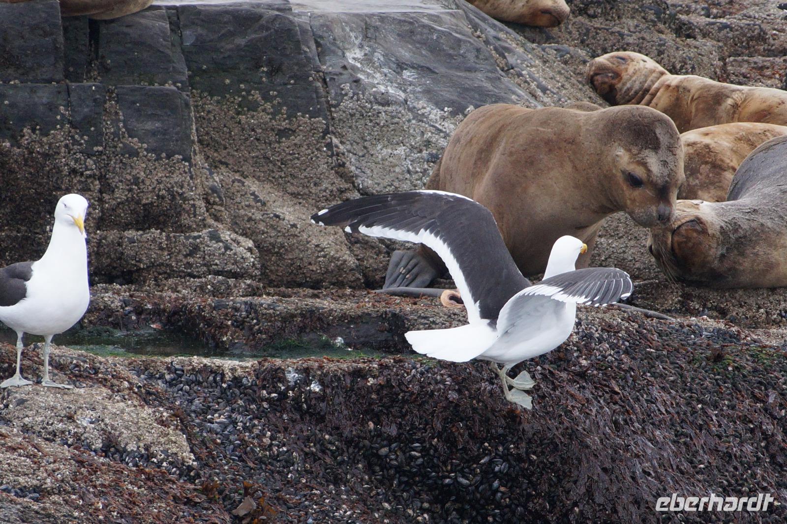 An mehreren Inseln, teils nicht mehr als aus dem Wasser ragende Felsen kamen wir vorbei, beobachteten Seelöwen, in einem Harem vertrieb ein Weibchen eine Möwe, die sich gerade über einen Seestern hermachte, manche bissen sich gegenseitig, schreckten offenbar einen Schwarm Seeschwalben auf und sahen auch ein totes Seelöwenkalb, das vielleicht von seinen Artgenossen, vielleicht aber auch von einem Seeelefanten erdrückt worden war. Die erste Gruppe musste den Seeelefanten wohl morgens gesehen haben, da befand er sich wohl mitten zwischen den Seelöwen, nachmitags sahen wir ihn nur zwischen den Felsen und mussten der Bootscrew glauben, dass es sich um eine andere Robbenart handelte. Die Mutter des toten Kalbs jedoch verteidigte dieses noch immer gegen die Artgenossen, obwohl es längst zu spät war. Der Felsen mit dem Leuchtturm (Faro) Les Éclaireurs (ja, obwohl es eine argentinische Inselgruppe ist, hat sie keinen spanischen, sondern einen französischen Namen) war der weiteste Punkt unserer Bootstour. Dann ging es nach "H". Die Insel liegt etwa fünf bis sechs Kilometer südlich von Ushuaia, sie war das südlichste was wir erreichten, wären wir südlicher gefahren, wären wir wieder in Chile gewesen.