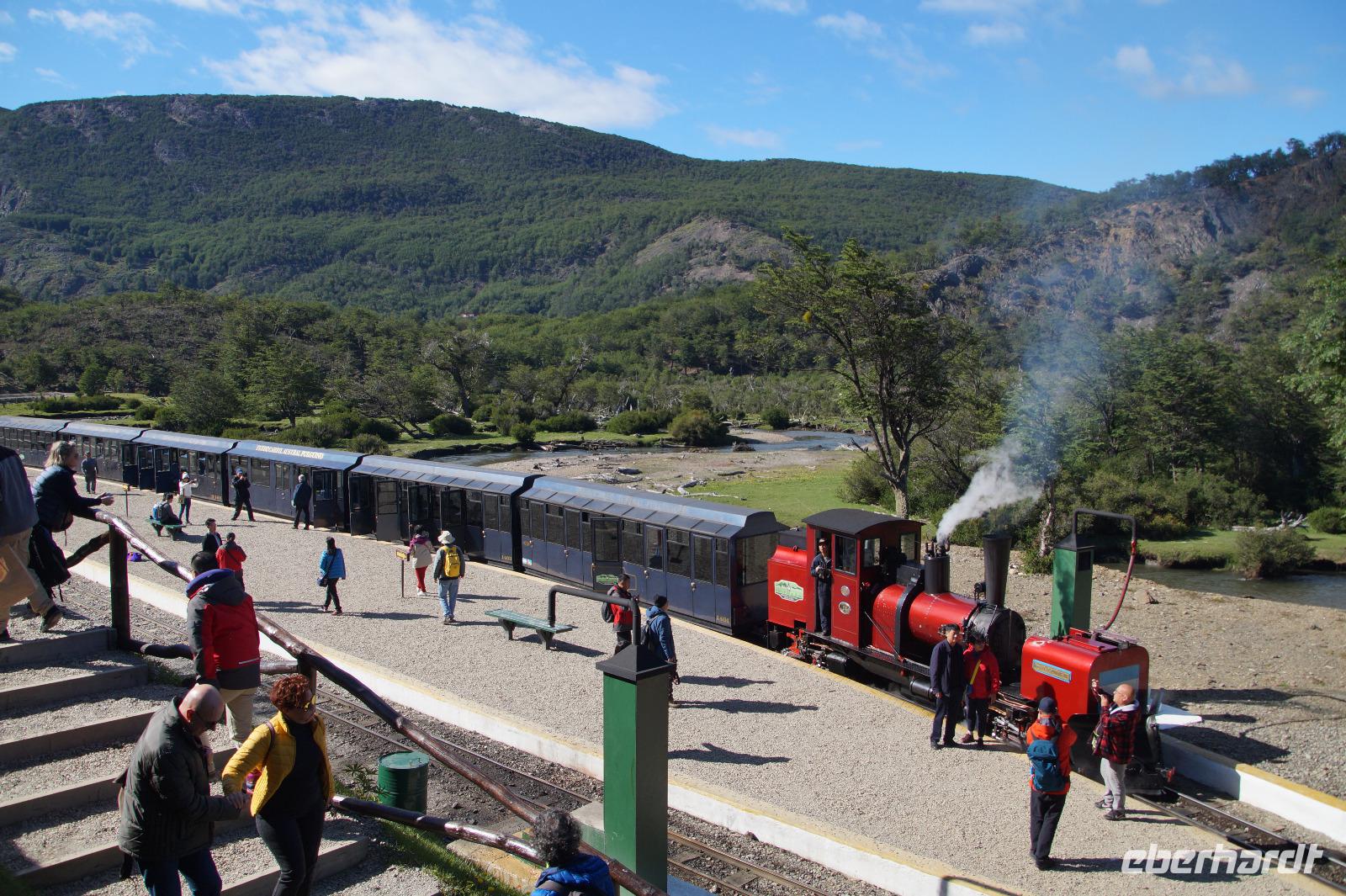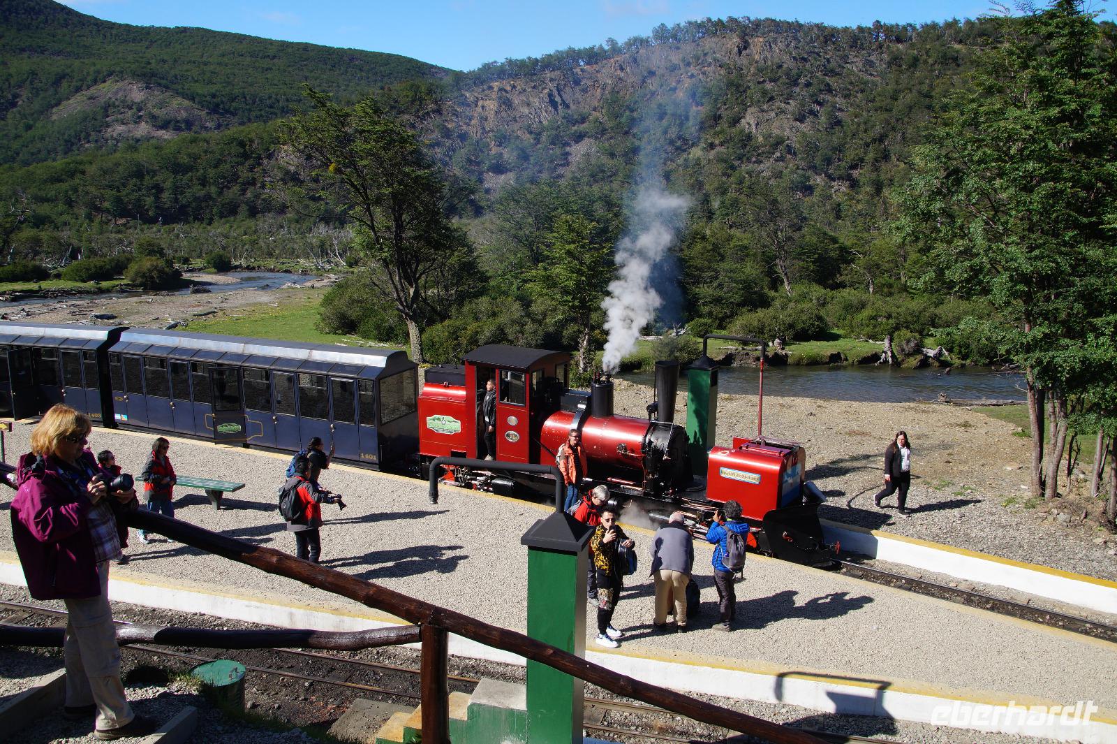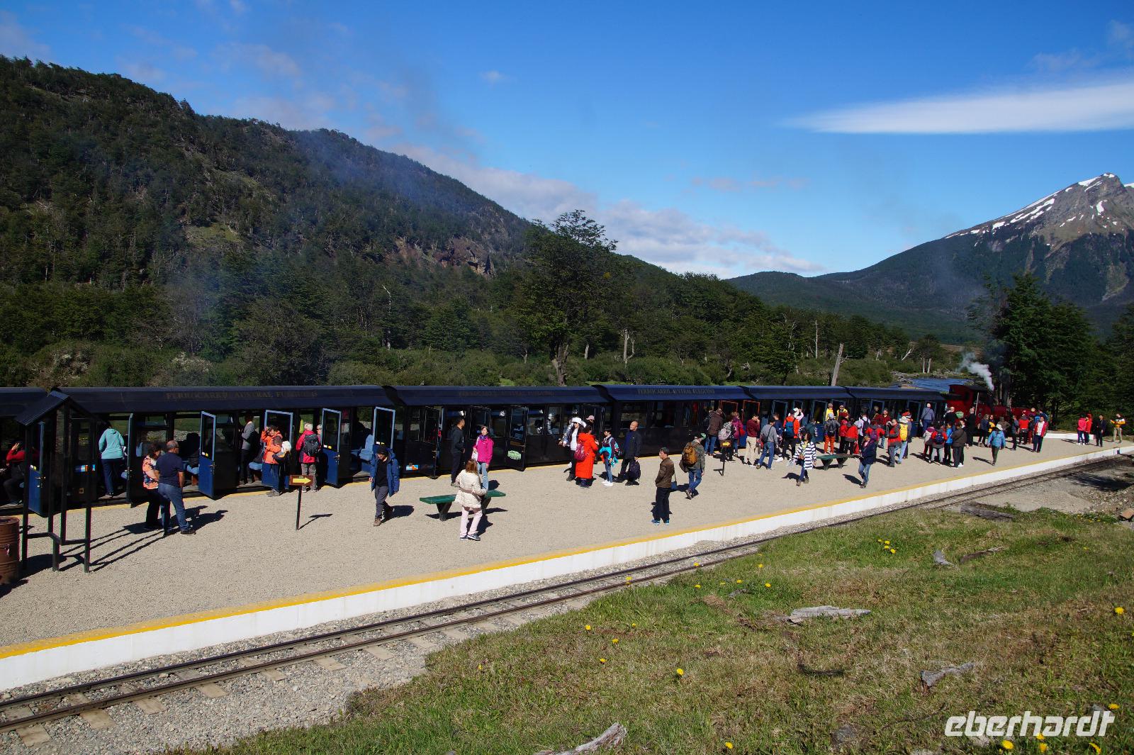 Ushuaia ist lange auch das Alcatraz Argentiniens gewesen. Mit Eli unserer heutigen Wanderführerin fuhren wir zum Bahnhof am Ende der Welt, wo wir mit dem Zug Fin de Mundo fuhren, also dem Zug vom Ende der Welt. Diese Bahn war von den Häftlingen des Presidio de Ushuaia errichtet worden und diente dazu, die Häftlinge an ihre Arbeitsstätten, Steinbrüche und zu Waldarbeiten zu fahren. Entflohene Häftlinge kamen meist nicht von der Insel herunter, scheiterten spätestens an der chilenischen Grenze oder erfroren, wenn sie nicht freiwillig zurückkehrten. Dabei gab es zwei Hauptgruppen unter den Häftlingen, zum einen richtige Schwerverbrecher, wie Argentiniens erster Serienmörder, ein Sadist, der seine ersten Mordversuche bereits als Achtjähriger unternahm, zum anderen politische Gefangene, nach einem Militärputsch von 1930. Heute fährt der restaurierte Zug Touristen in den Nationalpark, am Ende der Bahnlinie liegt eines der südlichsten Postämter der Welt (Correo del fin del Mundo - Post am Ende der Welt).