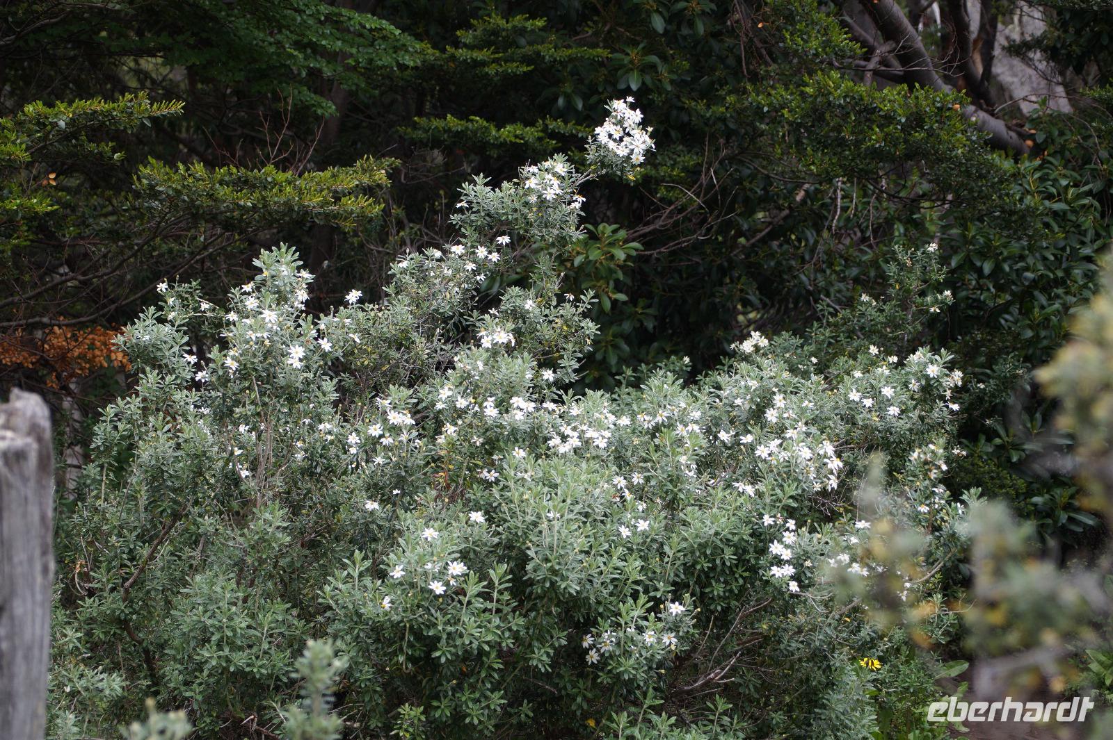 Zunächst aber aßen wir etwas zu Mittag, erst dann ging es über eine schwankende Hängebrücke über den Avutardas, auf der nur je sechs Personen zur gleichen Zeit hinüberdurften, in Richtung der Lagune. Zwischen der Lagune und dem Fluss, den wir gerade überquert hatten, lag nach einem Hügel ein „Strand", eigentlich eine Grundmoräne. Auf diesem Strand verlief ein „Damm". Dieser „Damm", erklärte uns Pancho, sei nicht menschengemacht, sondern würde nach starken Regenfällen oder Gletscherschmelzen immer wieder von den beiden Gewässern, der Laguna Grey und dem Avutardas-Fluss neu definiert. Wir überquerten die etwa zwei Kilometer breite Grundmoräne, bis wir zu einer Ecke des Sees kamen in der mehrere Eisschollen trieben. Es sei der Wind, der dafür sorge, dass die Eisschollen sich in dieser Ecke konzentrierten. Wir kletterten weiter auf eine Halbinsel, die in die Gletscherlagune hineinragte. Hier fanden wir erstmals unsere - nach Ñirre und Lenga - dritte Spezie des Nothofagus (Scheinbuche/Südbuche): den immergrünen Coihue.