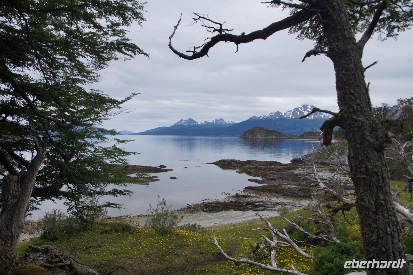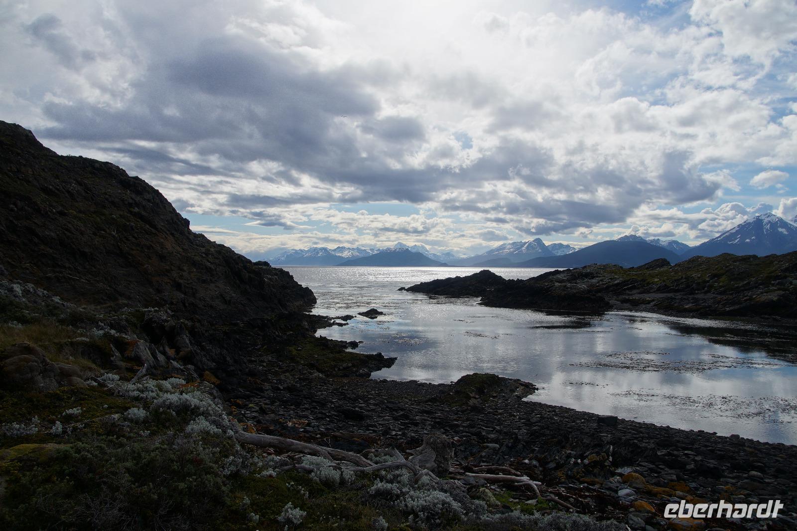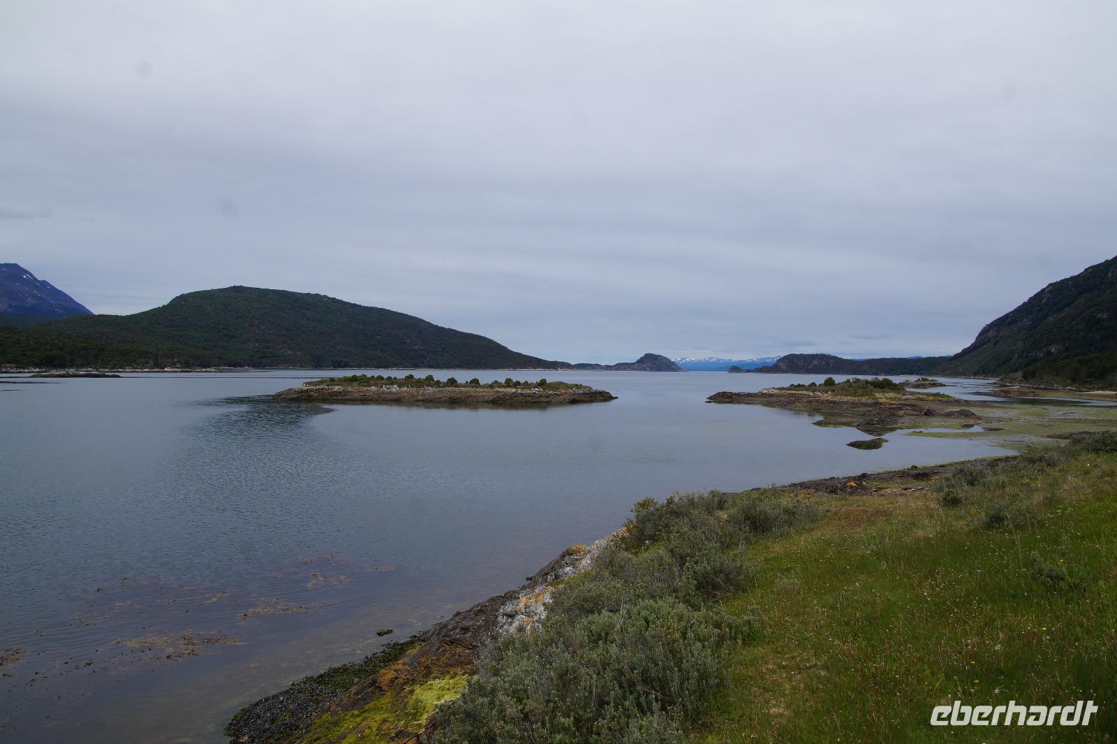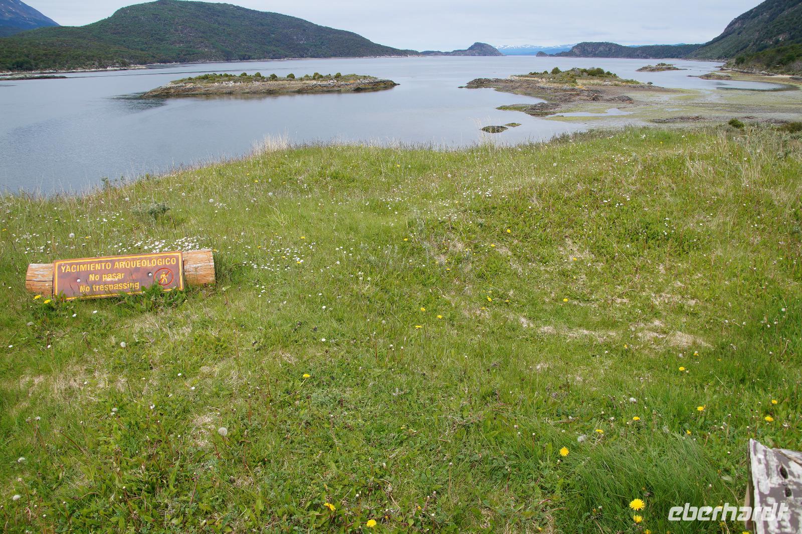 Bis zum Ende der Ruta (Route) 3, einer der wichtigsten Straßenverbindungen Argentiniens, an der malerischen Lapataia-Bucht kamen wir. Hier befand sich, nur anhand eines Schildes markiert und nur für geübte Augen erkennbar, ein archäologischer Fundplatz. Man erkannte am Mirador den dreiecksförmigen Grundriss einer präkolumbinen Behausung, um die herum die Bewohner ihre organischen Abfälle aufgehäuft hatten, die noch als niedriger (vielleicht 40 cm hoher) Wall den Grundriss der Behausung markierten.