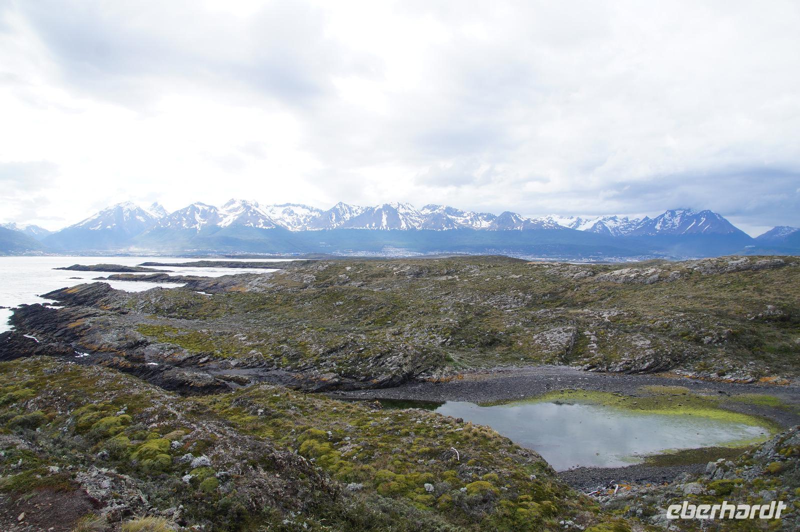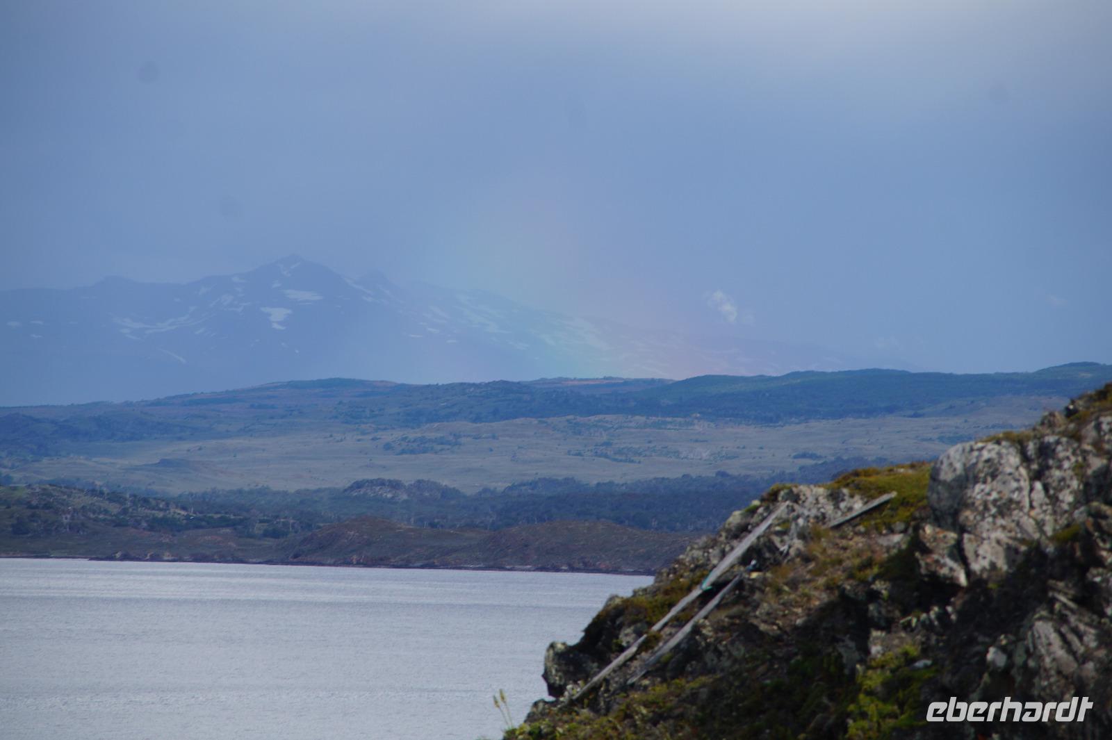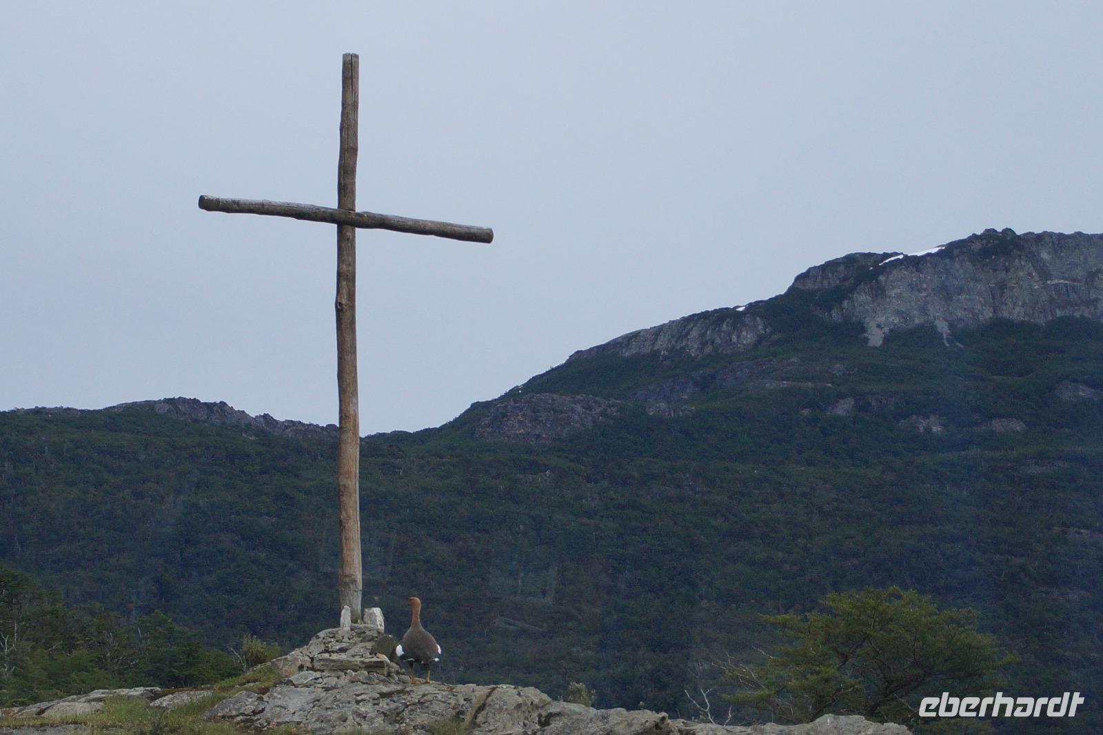 Bis zum Ende der Ruta (Route) 3, einer der wichtigsten Straßenverbindungen Argentiniens, an der malerischen Lapataia-Bucht kamen wir. Hier befand sich, nur anhand eines Schildes markiert und nur für geübte Augen erkennbar, ein archäologischer Fundplatz. Man erkannte am Mirador den dreiecksförmigen Grundriss einer präkolumbinen Behausung, um die herum die Bewohner ihre organischen Abfälle aufgehäuft hatten, die noch als niedriger (vielleicht 40 cm hoher) Wall den Grundriss der Behausung markierten.