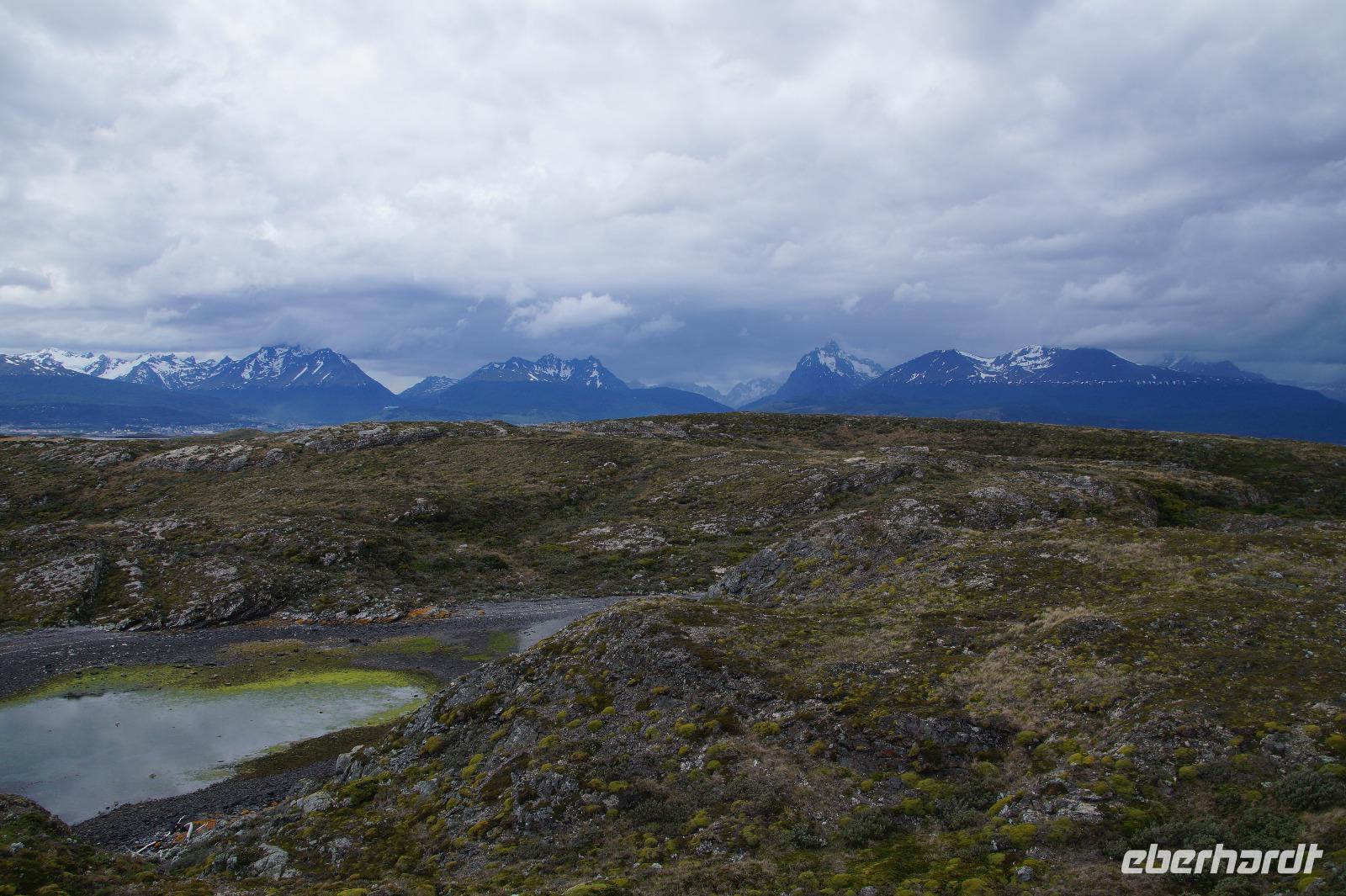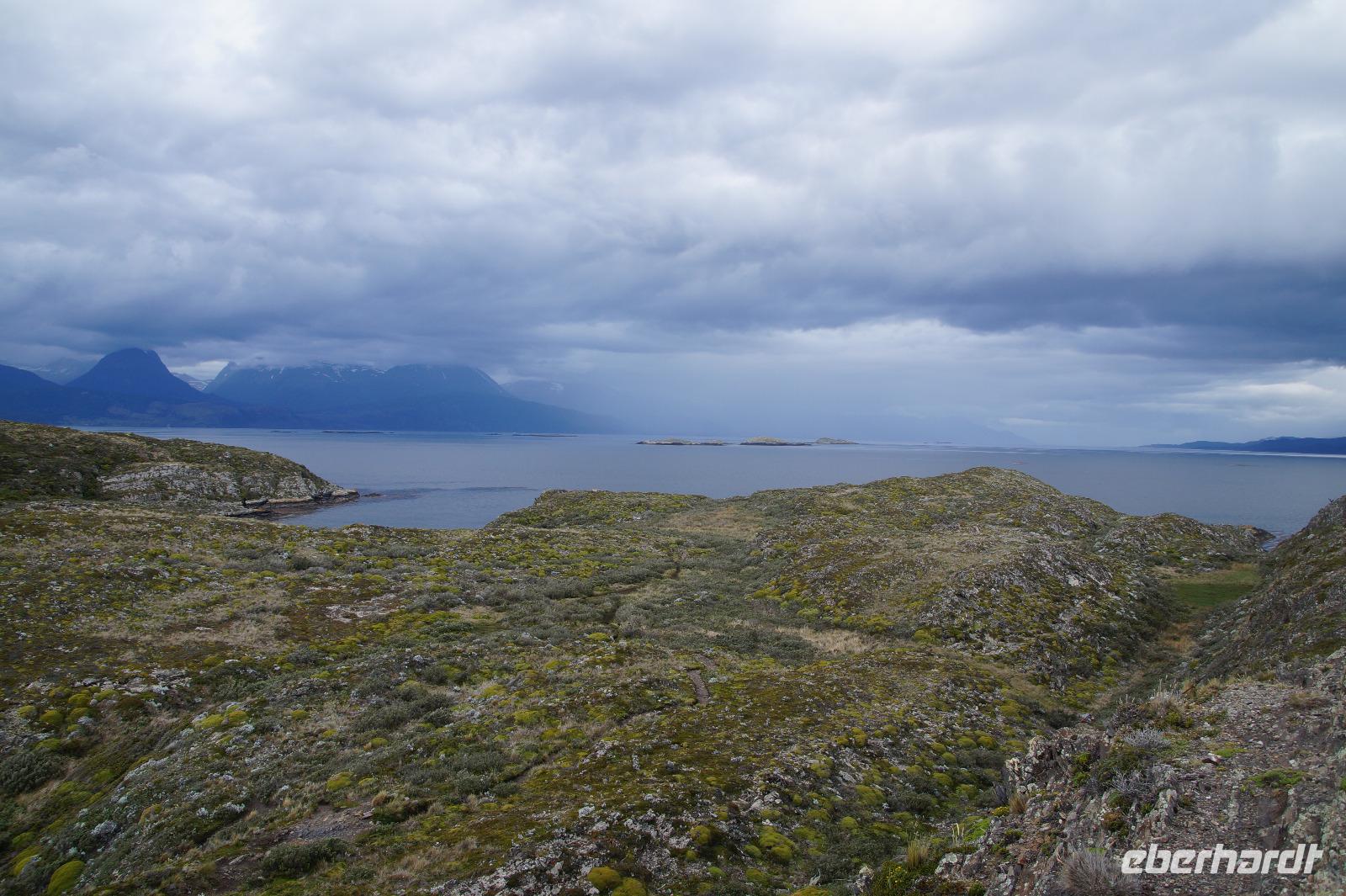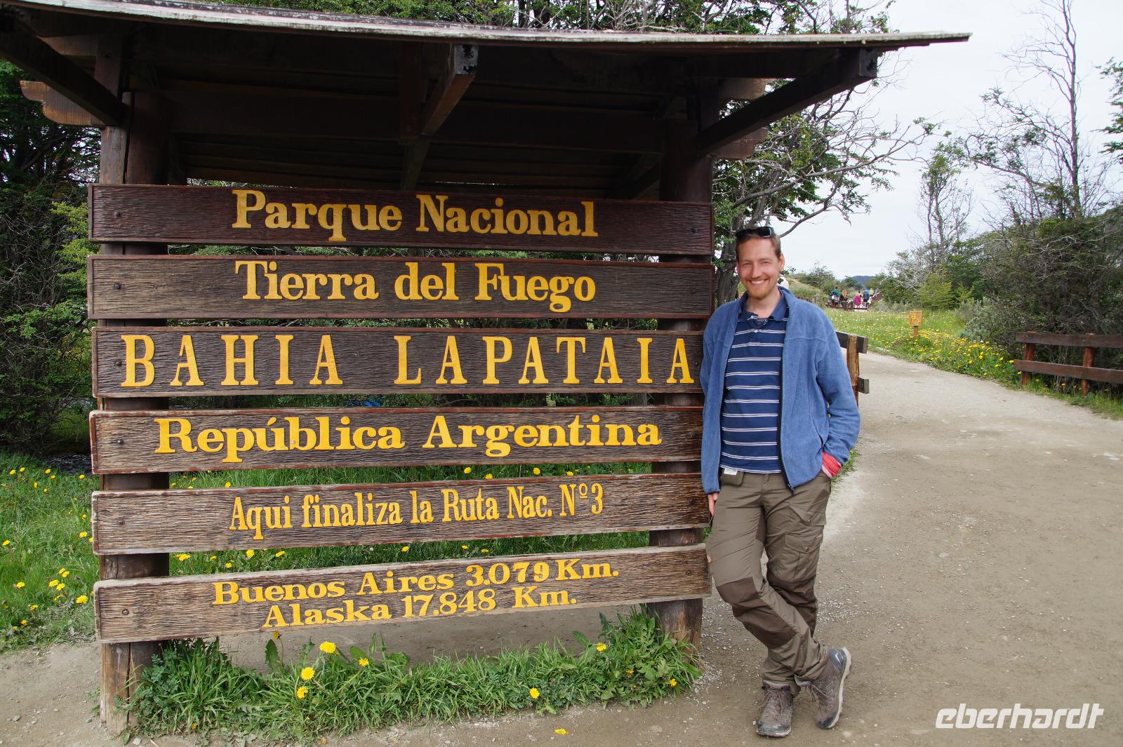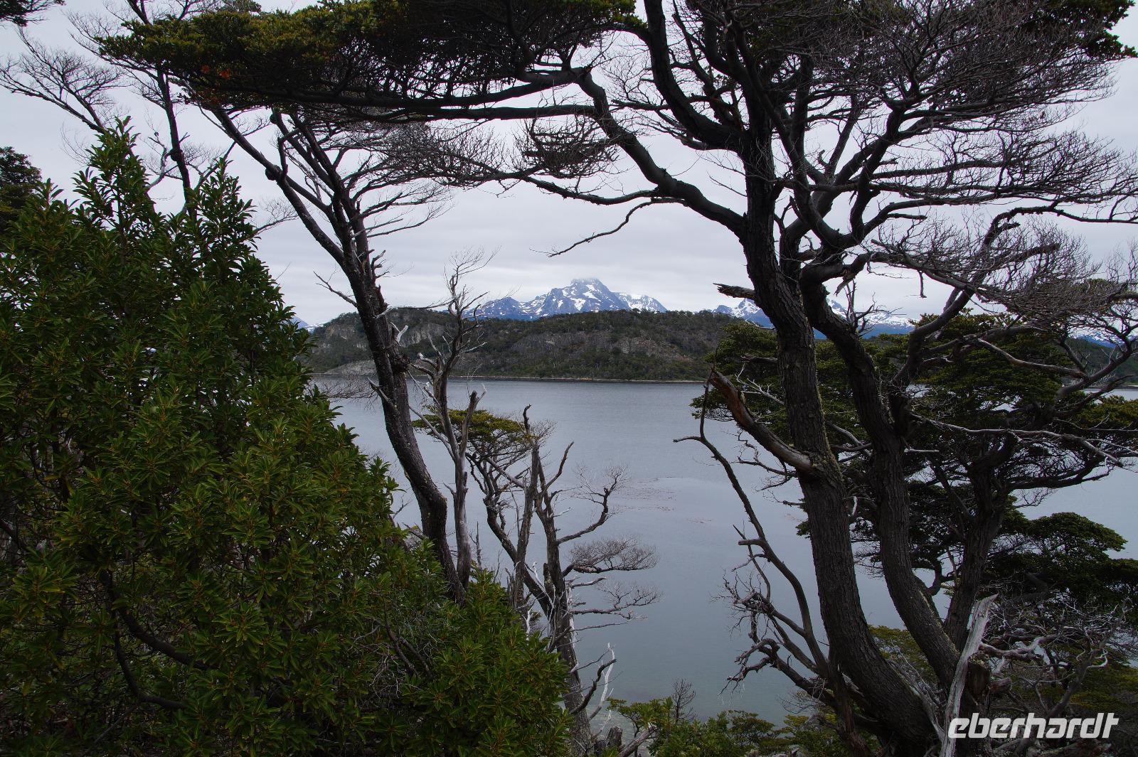 Bis zum Ende der Ruta (Route) 3, einer der wichtigsten Straßenverbindungen Argentiniens, an der malerischen Lapataia-Bucht kamen wir. Hier befand sich, nur anhand eines Schildes markiert und nur für geübte Augen erkennbar, ein archäologischer Fundplatz. Man erkannte am Mirador den dreiecksförmigen Grundriss einer präkolumbinen Behausung, um die herum die Bewohner ihre organischen Abfälle aufgehäuft hatten, die noch als niedriger (vielleicht 40 cm hoher) Wall den Grundriss der Behausung markierten.
