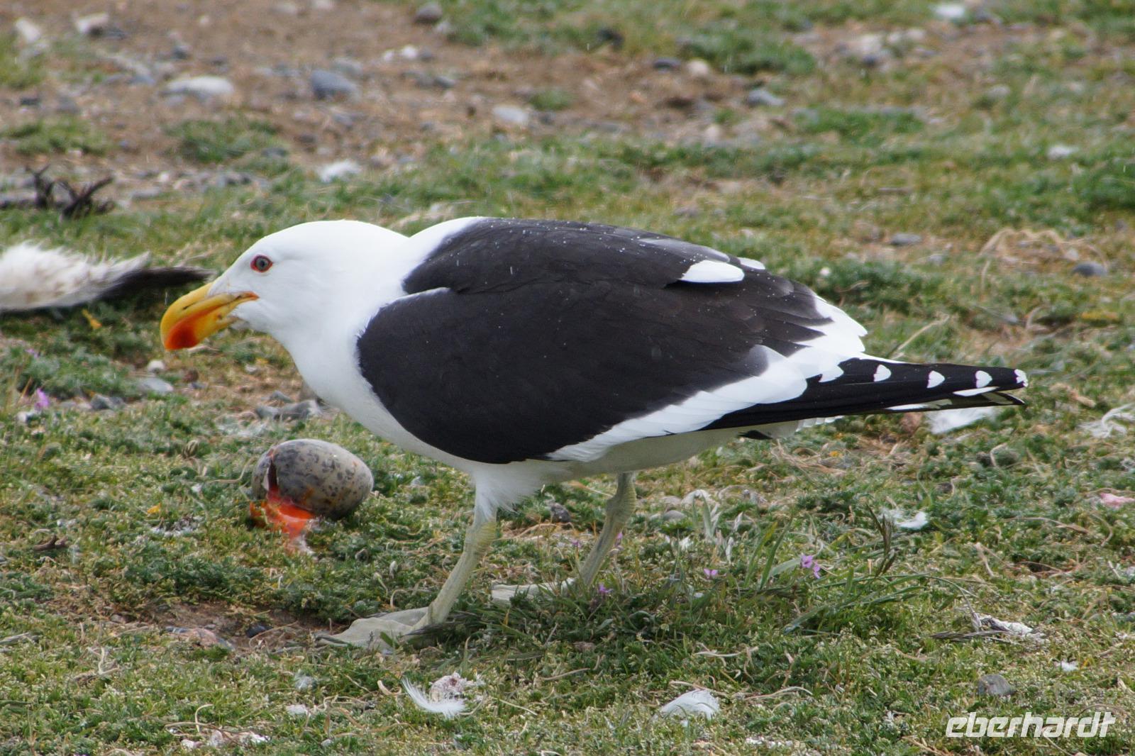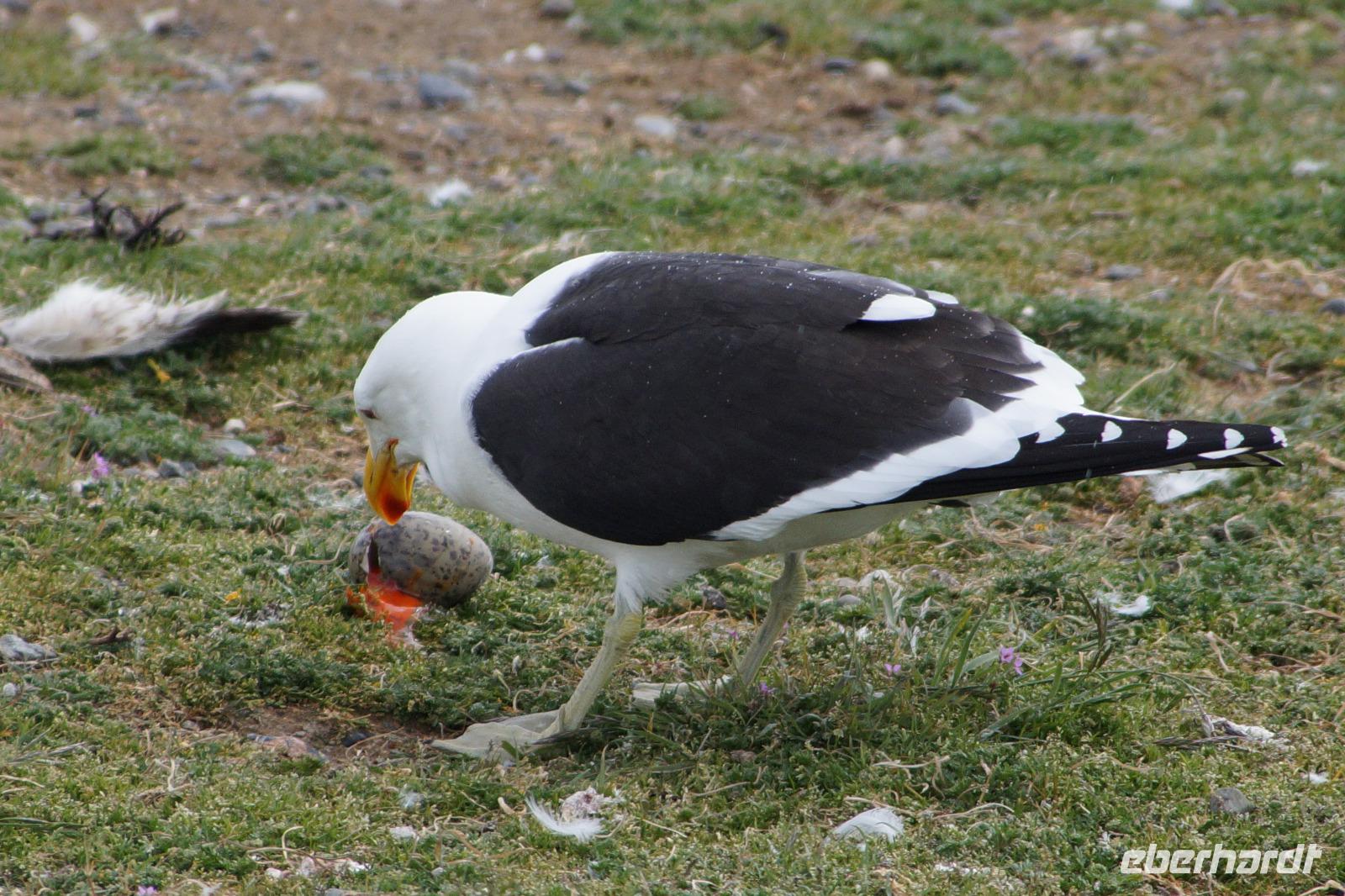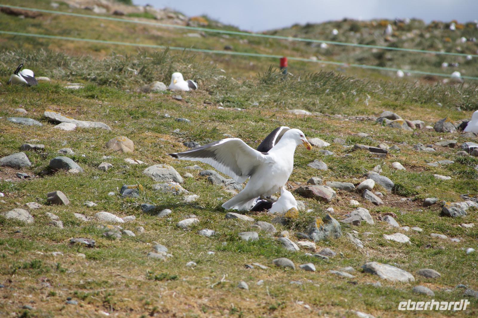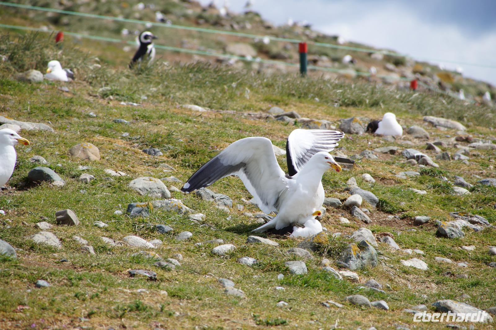 Dann beobachtete Klaus, wie eine Dominikanermöwe einer Artgenossin das Ei aus dem Nest klaute. Mit dem Schnabel hackte es die Schale auf und labte sich an Dotter und Küken. Aber der gegenseitige Eierklau ist nicht das einzige, was die Isla Magdalena zur Kannibaleninsel macht. Häufig stürzen Jungmöwen bei ihren ersten Flugversuchen ab. Dann stürzen sich die in der Absturzzone brütenden Möwen auf die Artgenossin zerhacken diese und verfüttern sie an den eigenen Nachwuchs. Für die Pinguine stellen die Dominkanermöwen jedoch keine Gefahr dar. Deren Nachwuchs wird allenfalls vom Skúa bedroht, der großen Raubmöwe. Diese gilt als der gefährlichste Räuber auf Magdalena, die Eier und Jungtiere aller Vogelarten hier verzehrt.
