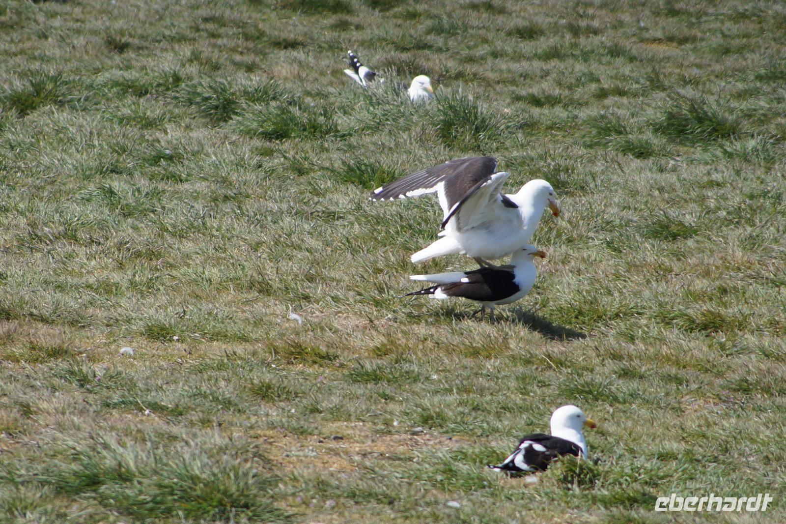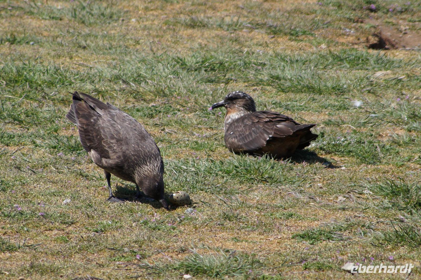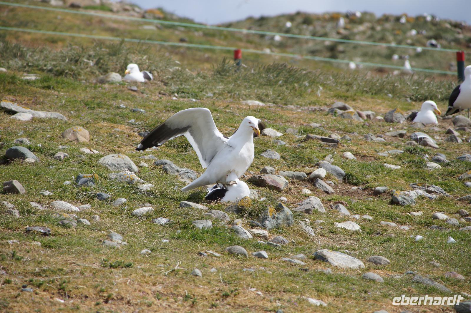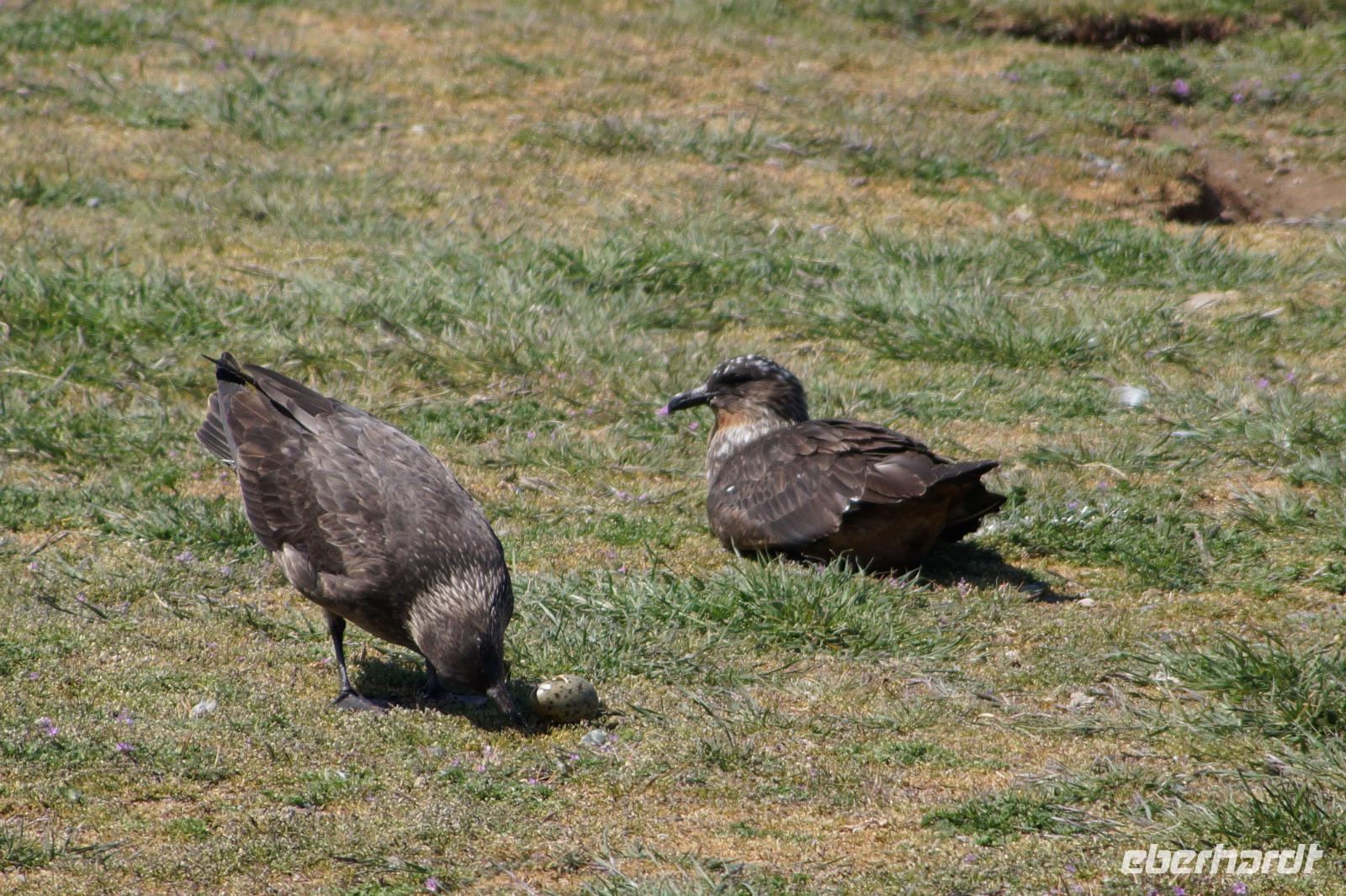 Dann beobachtete Klaus, wie eine Dominikanermöwe einer Artgenossin das Ei aus dem Nest klaute. Mit dem Schnabel hackte es die Schale auf und labte sich an Dotter und Küken. Aber der gegenseitige Eierklau ist nicht das einzige, was die Isla Magdalena zur Kannibaleninsel macht. Häufig stürzen Jungmöwen bei ihren ersten Flugversuchen ab. Dann stürzen sich die in der Absturzzone brütenden Möwen auf die Artgenossin zerhacken diese und verfüttern sie an den eigenen Nachwuchs. Für die Pinguine stellen die Dominkanermöwen jedoch keine Gefahr dar. Deren Nachwuchs wird allenfalls vom Skúa bedroht, der großen Raubmöwe. Diese gilt als der gefährlichste Räuber auf Magdalena, die Eier und Jungtiere aller Vogelarten hier verzehrt.
