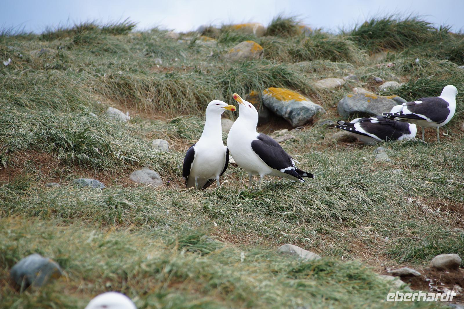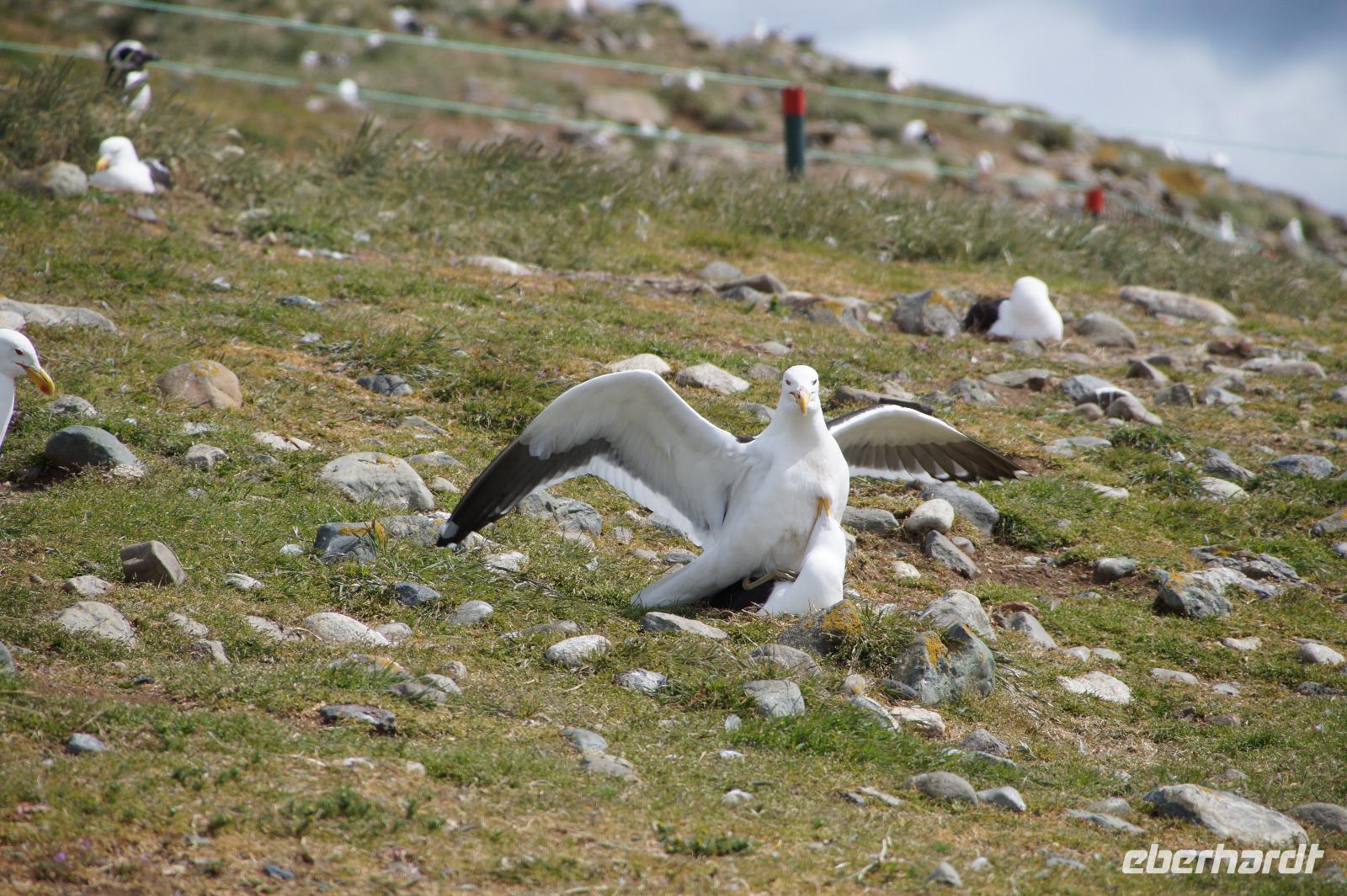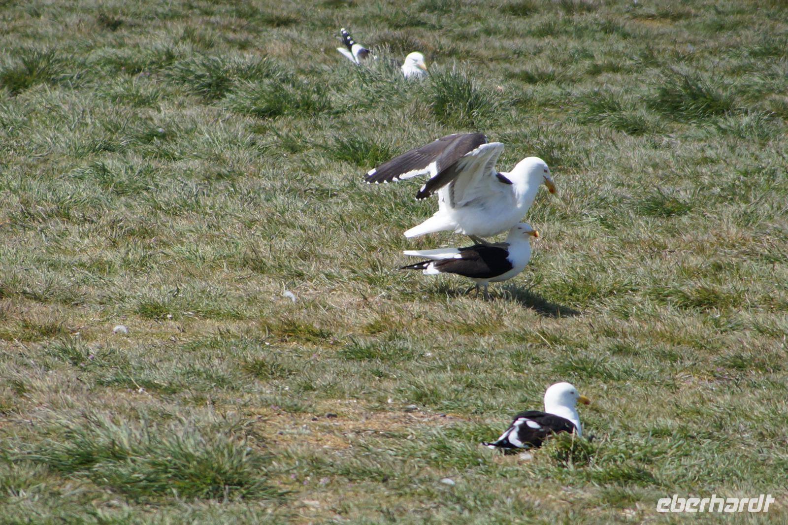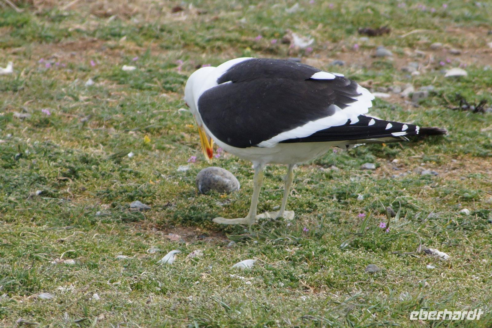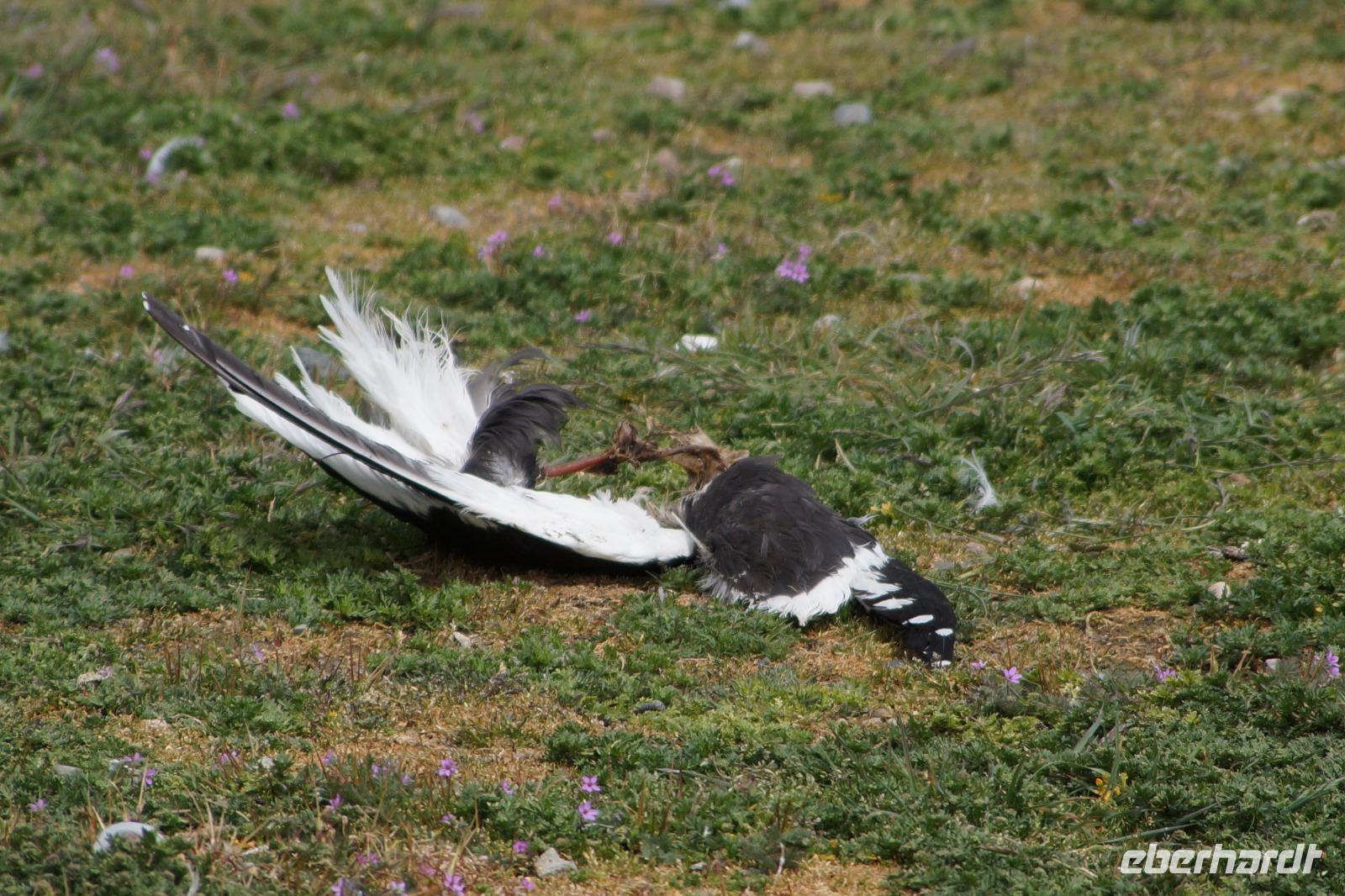 Dann beobachtete Klaus, wie eine Dominikanermöwe einer Artgenossin das Ei aus dem Nest klaute. Mit dem Schnabel hackte es die Schale auf und labte sich an Dotter und Küken. Aber der gegenseitige Eierklau ist nicht das einzige, was die Isla Magdalena zur Kannibaleninsel macht. Häufig stürzen Jungmöwen bei ihren ersten Flugversuchen ab. Dann stürzen sich die in der Absturzzone brütenden Möwen auf die Artgenossin zerhacken diese und verfüttern sie an den eigenen Nachwuchs. Für die Pinguine stellen die Dominkanermöwen jedoch keine Gefahr dar. Deren Nachwuchs wird allenfalls vom Skúa bedroht, der großen Raubmöwe. Diese gilt als der gefährlichste Räuber auf Magdalena, die Eier und Jungtiere aller Vogelarten hier verzehrt.