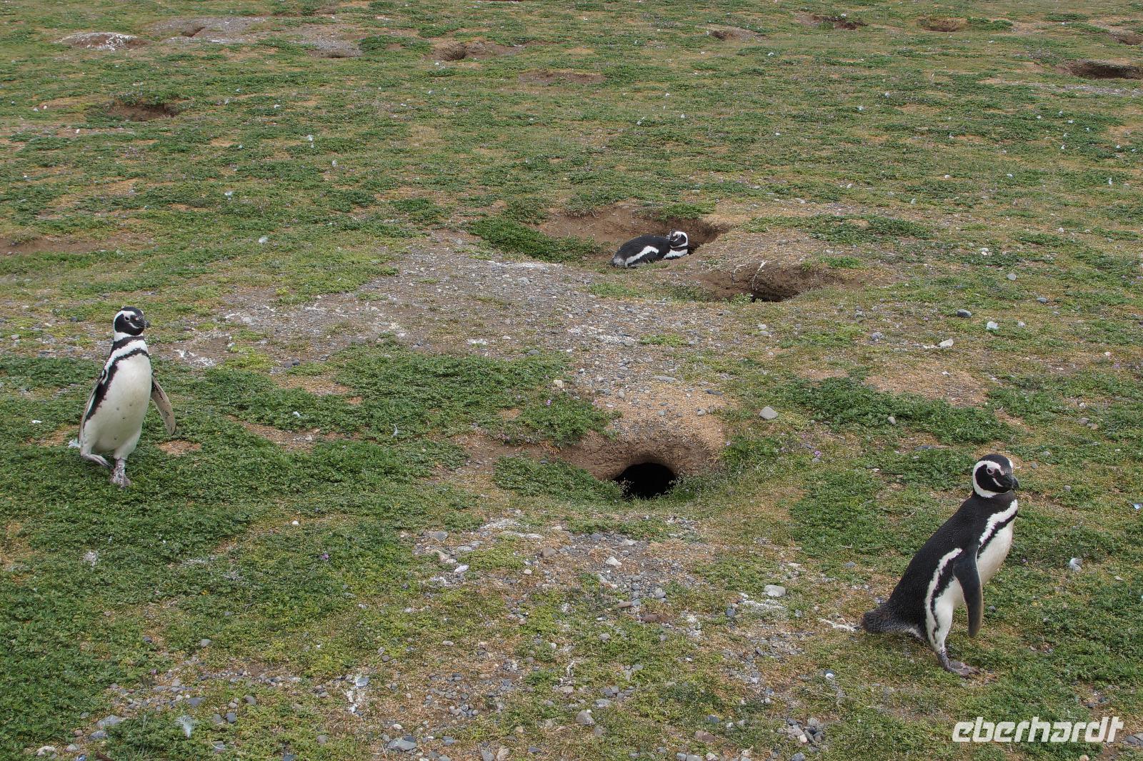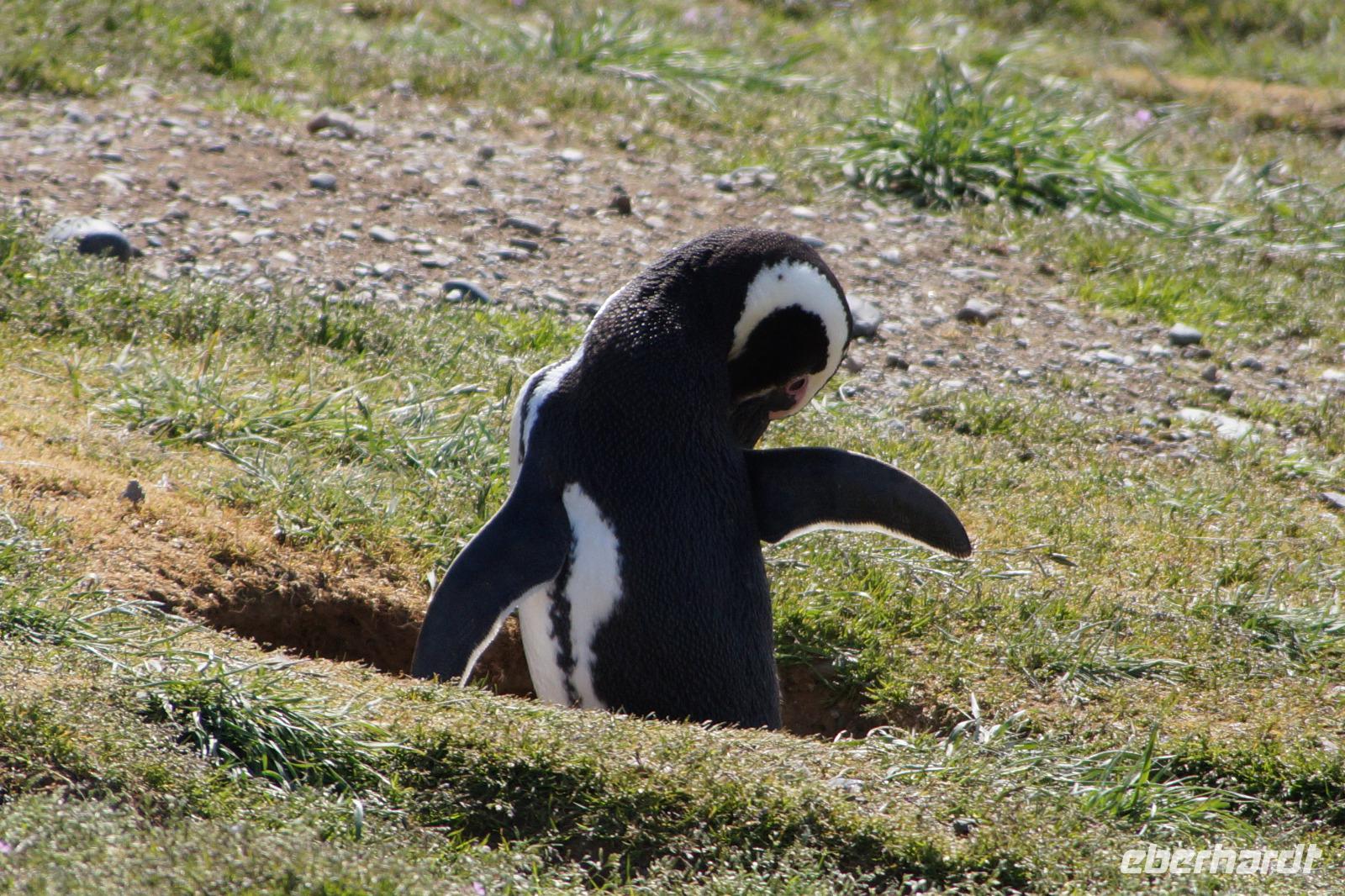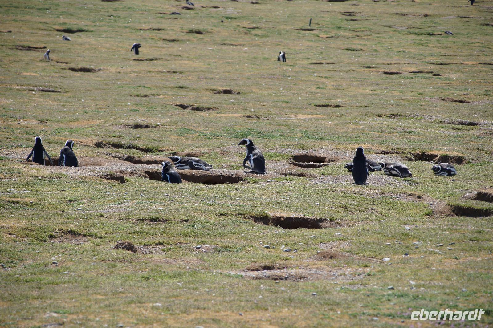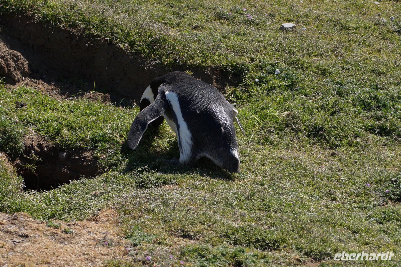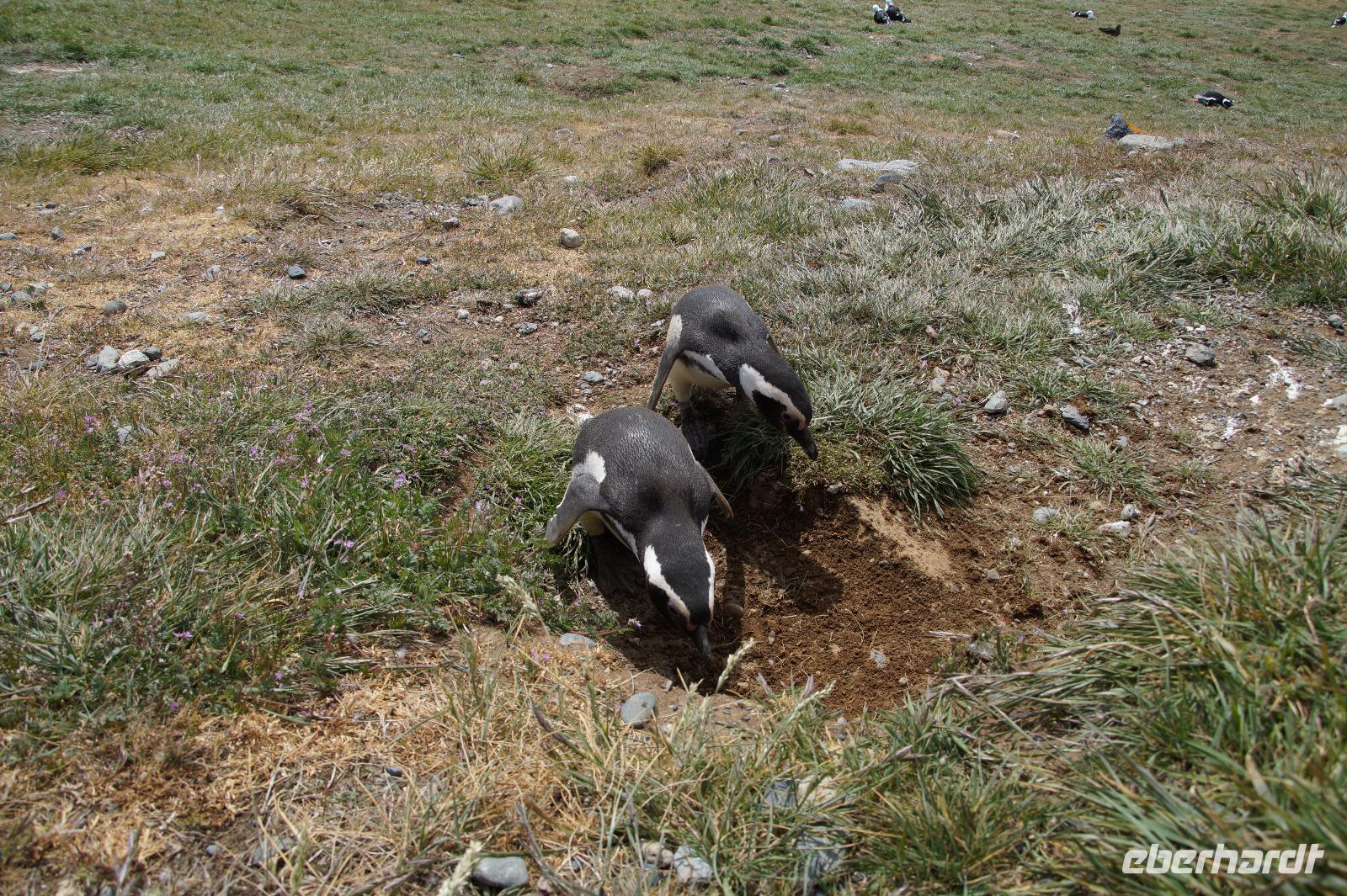 Manche der Pinguine riefen nach ihren Partnern, andere polsterten die Bruthöhlen mit Gras aus. Mit den Bruthöhlen verhält es sich so. Das Pinguinmännchen buddelt eine Bruthöhle. Dann kommt seine Partnerin - Pinguine sind treu - und reißt diese entweder ein und beide bauen gemeinsam eine neue Höhle, oder akzeptiert diese und zieht ein.