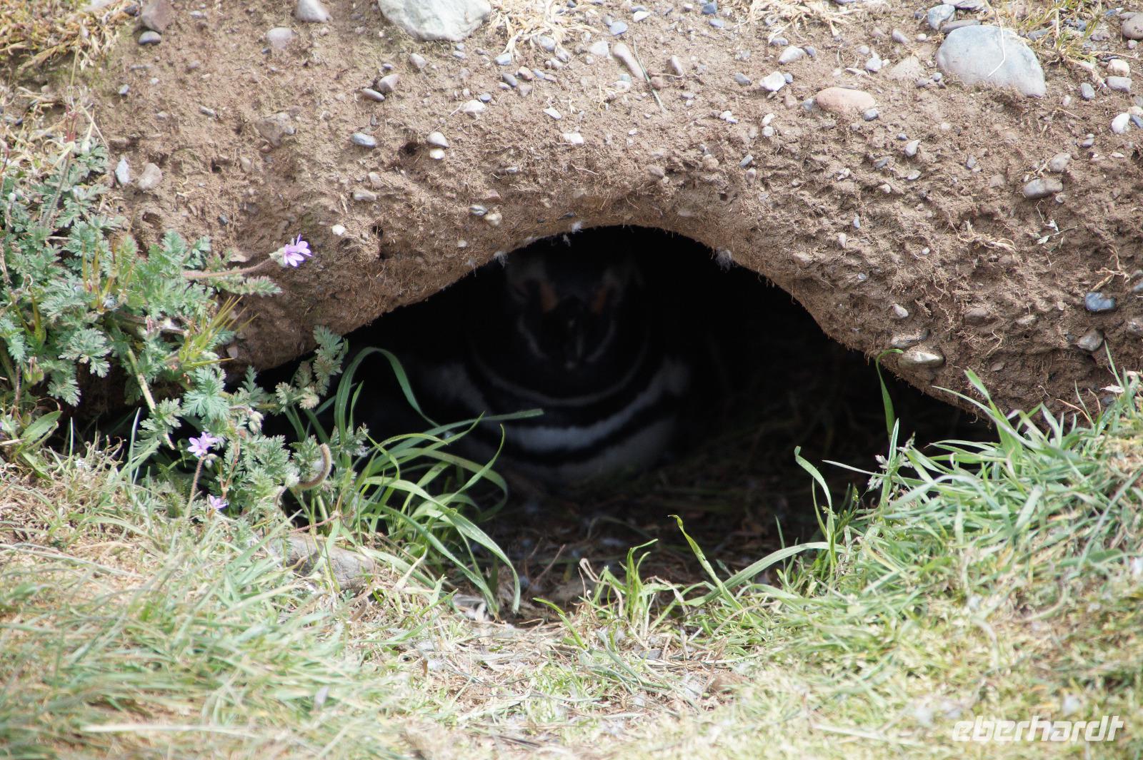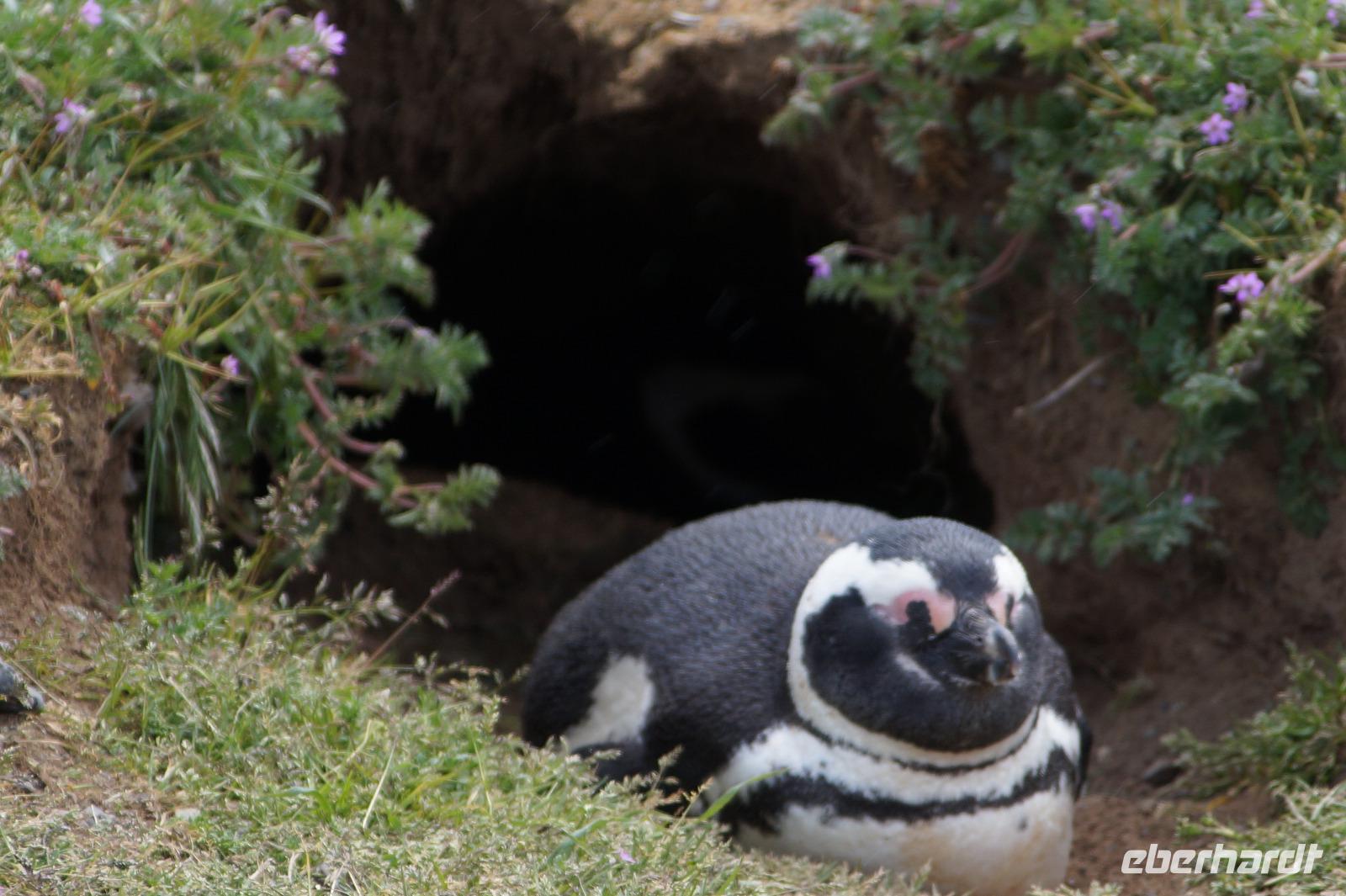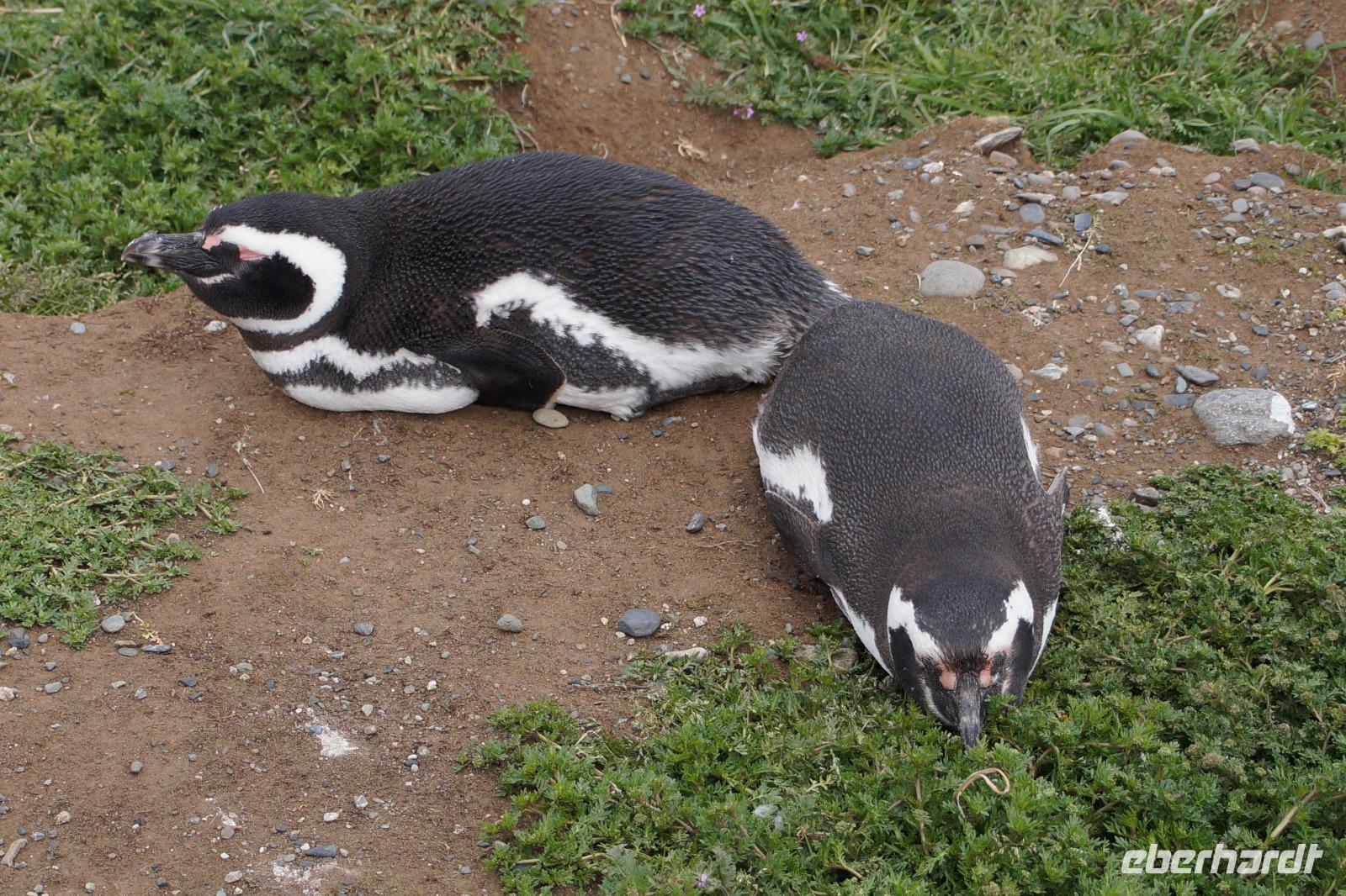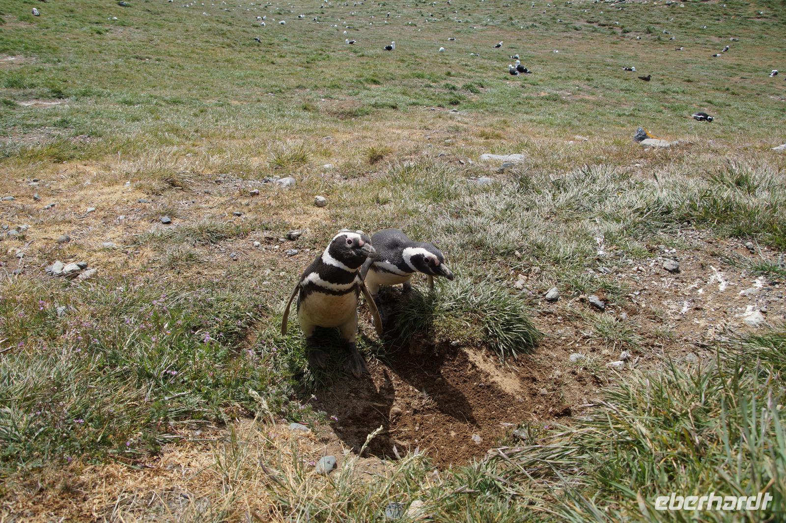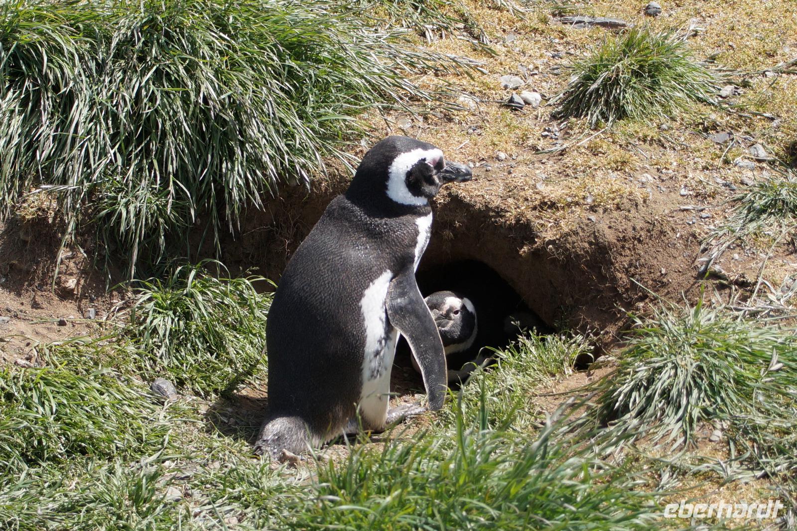 Manche der Pinguine riefen nach ihren Partnern, andere polsterten die Bruthöhlen mit Gras aus. Mit den Bruthöhlen verhält es sich so. Das Pinguinmännchen buddelt eine Bruthöhle. Dann kommt seine Partnerin - Pinguine sind treu - und reißt diese entweder ein und beide bauen gemeinsam eine neue Höhle, oder akzeptiert diese und zieht ein.