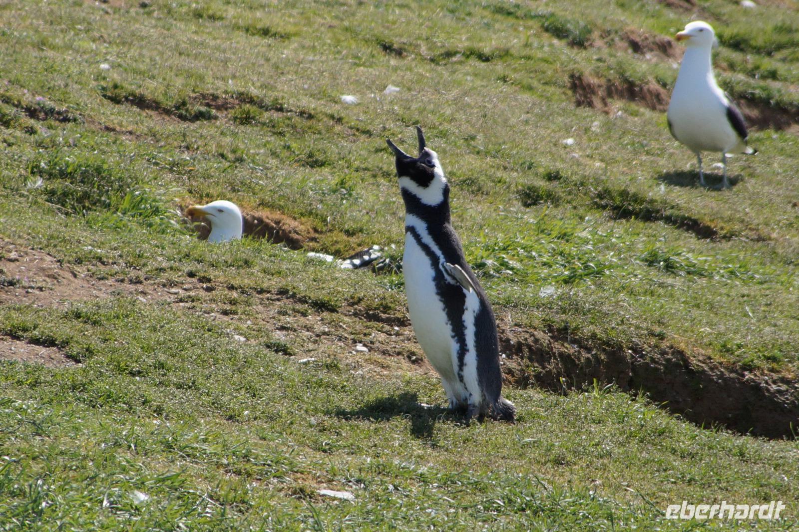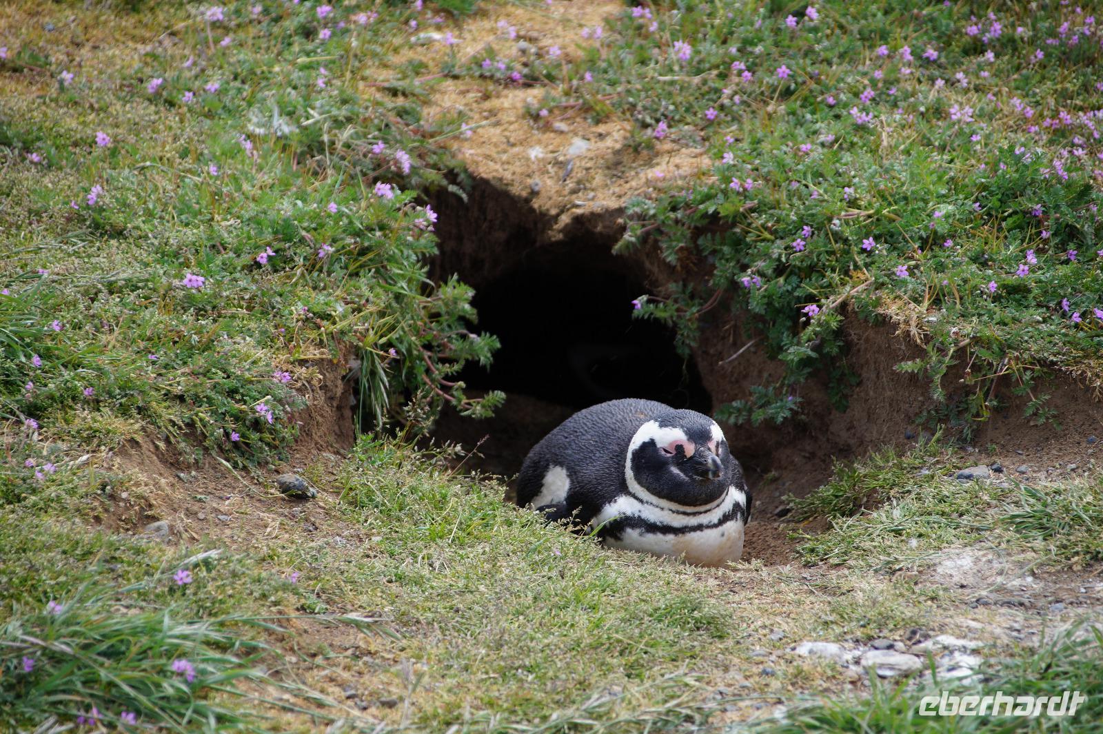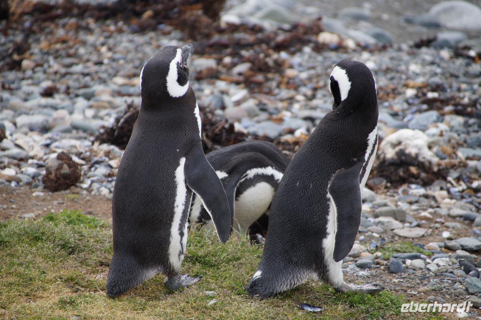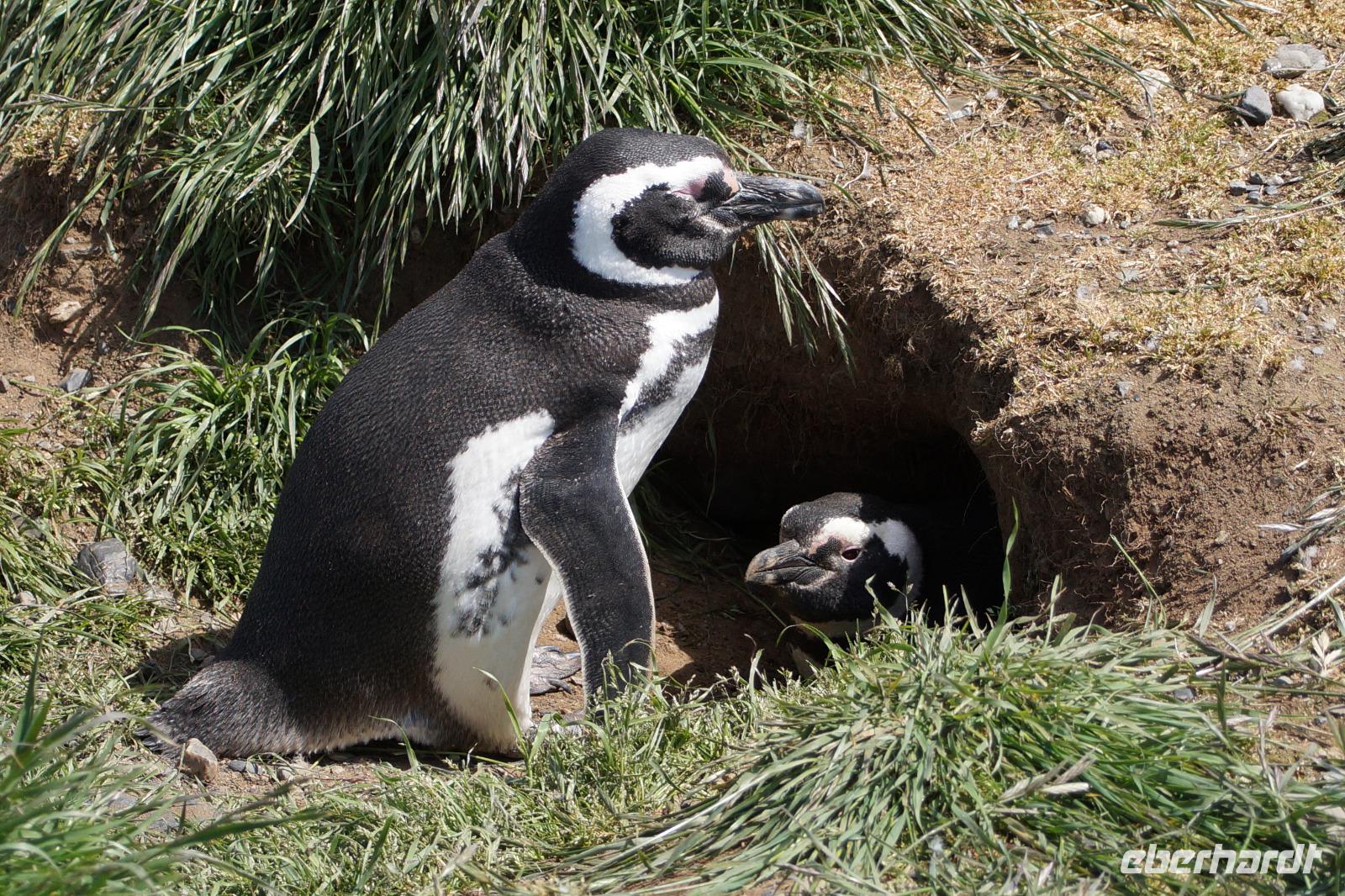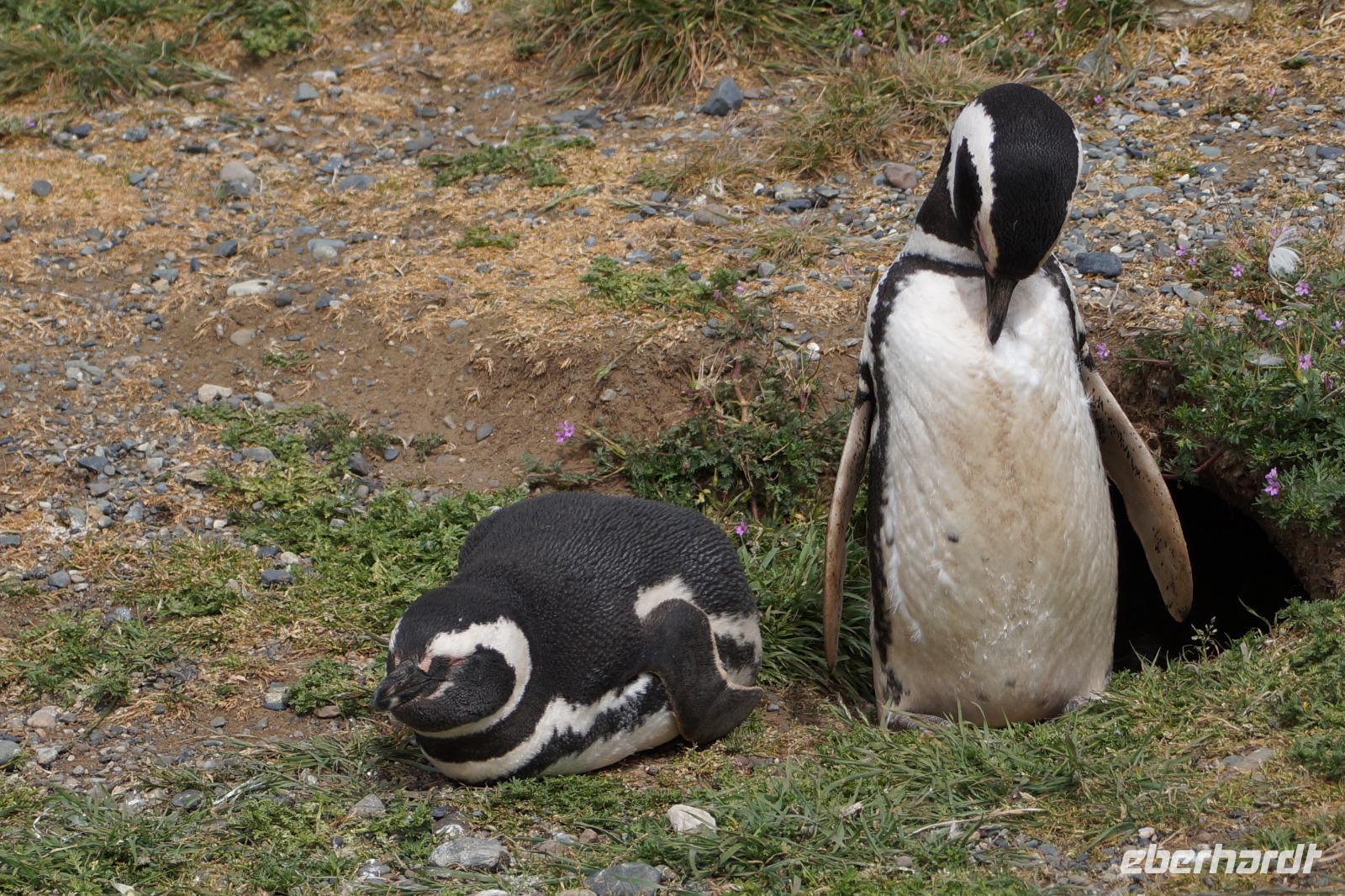Manche der Pinguine riefen nach ihren Partnern, andere polsterten die Bruthöhlen mit Gras aus. Mit den Bruthöhlen verhält es sich so. Das Pinguinmännchen buddelt eine Bruthöhle. Dann kommt seine Partnerin - Pinguine sind treu - und reißt diese entweder ein und beide bauen gemeinsam eine neue Höhle, oder akzeptiert diese und zieht ein.