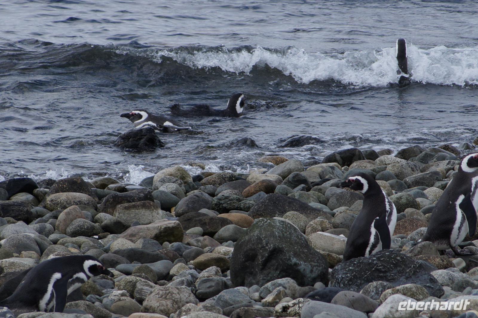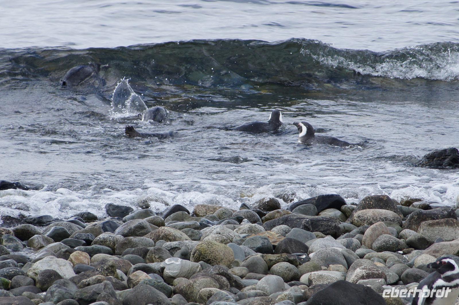 Manche Pinguine watschelten ins Wasser, andere watschelten an Land, einige schwammen und tauchten, viel lagen in oder vor ihren Bruthöhlen.