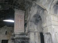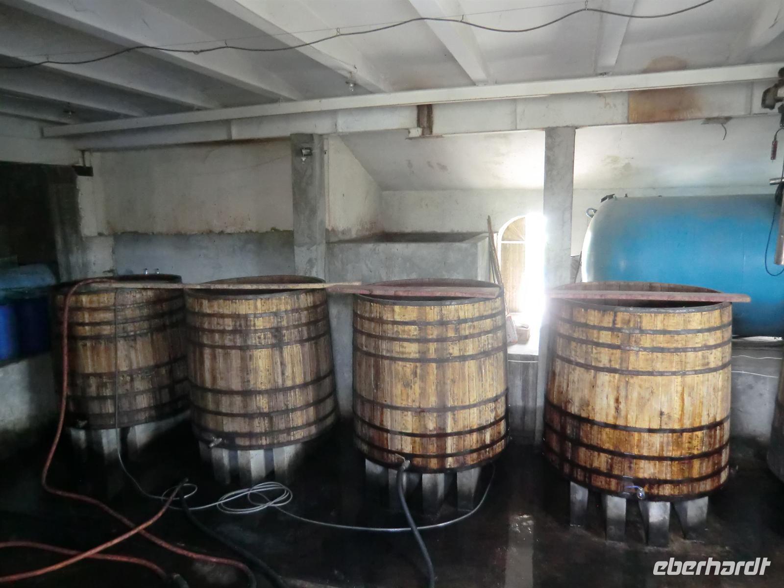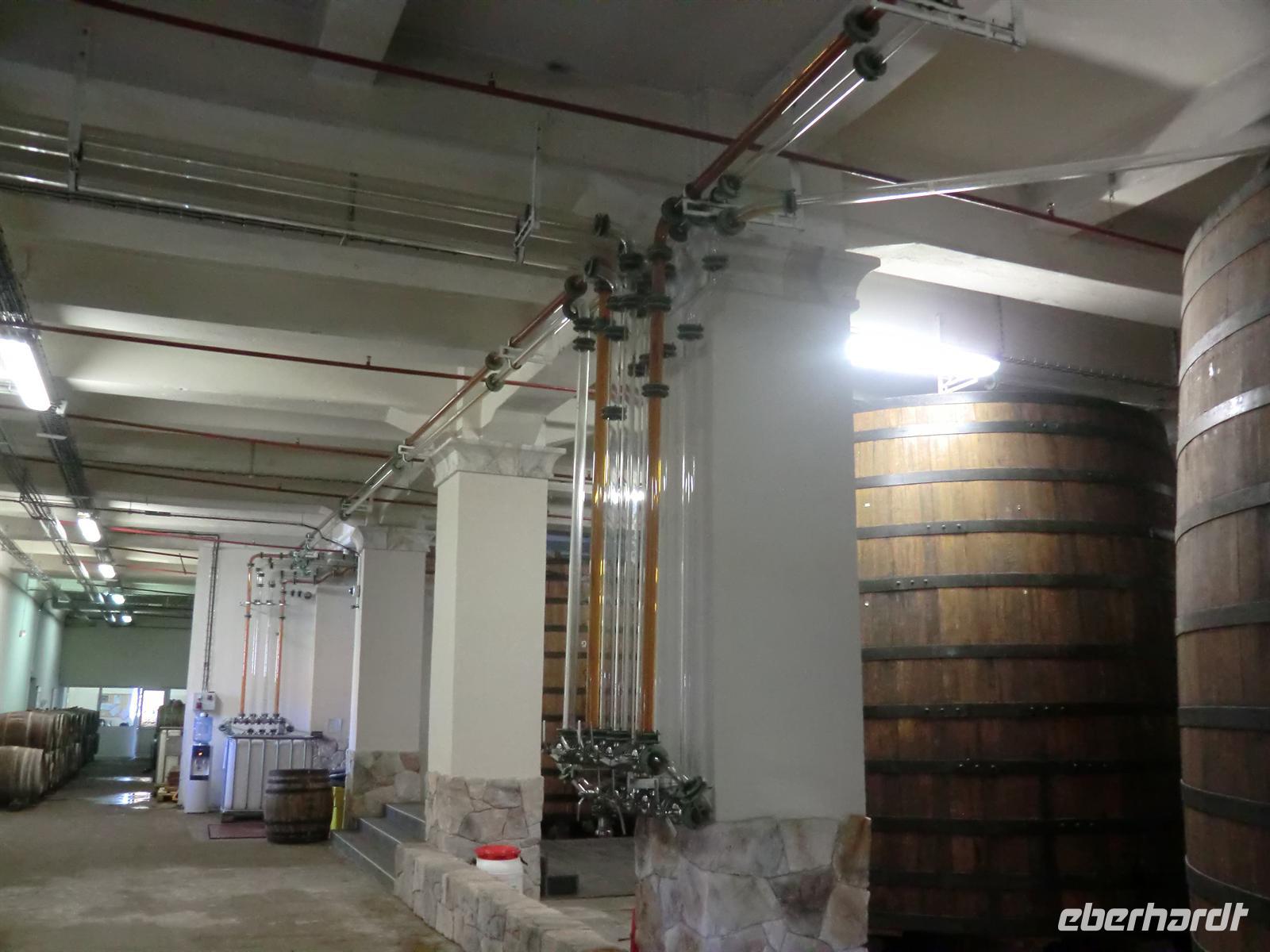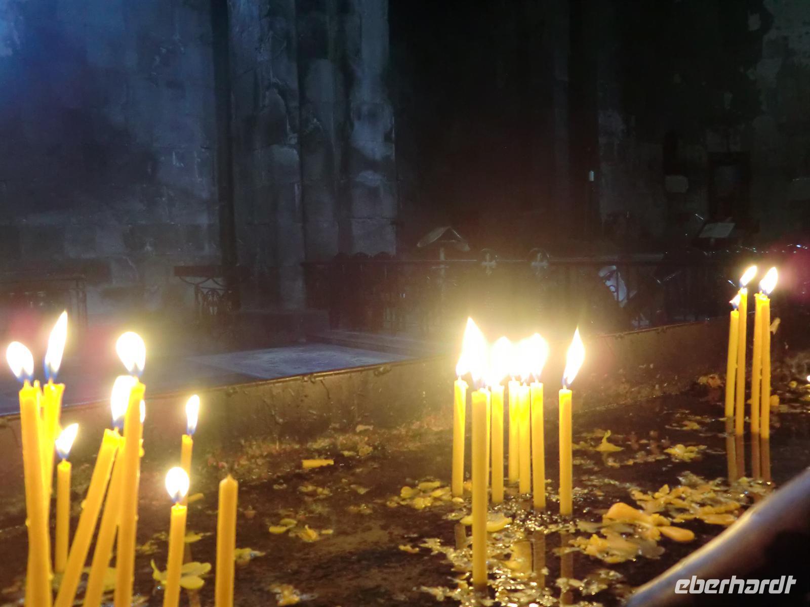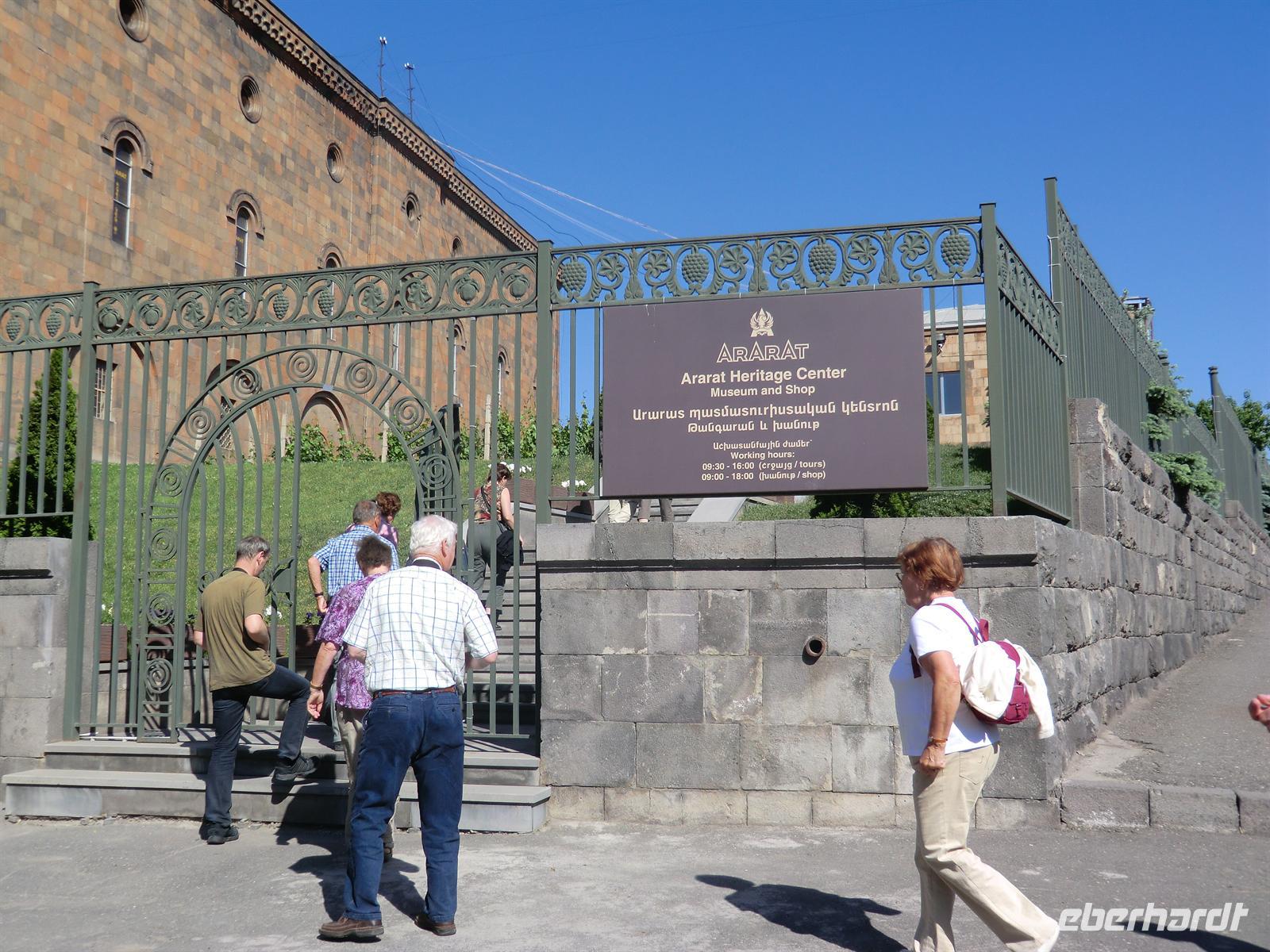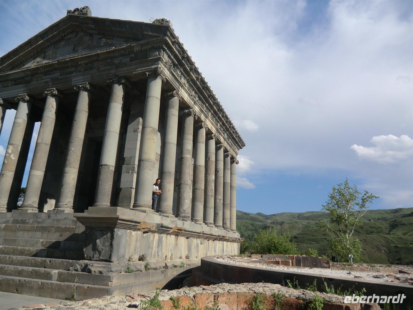 Das heutige Programm war verheißungsvoll und versprach feuchtfröhlich zu werden. Bereits kurz nach 9 Uhr am Morgen betraten wir die heiligen Hallen der Ararat-Brennerei, wo uns eine junge Dame in den Produktionsprozess des armenischen Kognaks einweihte. Im Anschluss an diese informative Führung durften wir drei Proben des goldenen Getränks verkosten - ein wahrer Gaumenschmaus! Da die Geschmacksnerven am frühen Morgen besonders empfänglich sind, bestellte Narine dieses schöne Extra auch für uns zu Beginn des letzten Tages in Armenien. Fröhlich beschwingt ging es anschließend zum kulturellen Genuss, der Handschriftensammlung „Matenadaran“. In der Hauptpost ging es dann zum kollektiven Briefmarkenkauf und Versenden der geschriebenen Urlaubsgrüße ehe wir weiter nach Garni fuhren. In einer zum Restaurant umfunktionierten Bäckerei bekamen wir frisch gebackenes Lavash-Brot zu essen, dessen Herstellung uns zwei Damen demonstrierten. Die wohlduftenden warmen Leibe genossen wir mit frischen Kräutern, Schafskäse und Couscoussalat. Zum Dessert genossen die Damen der Schöpfung den von Eberhardt gesponserten Pfirsichlikör als Pendant zum gestrigen „Männertagskognak“. Frisch gestärkt fuhren wir noch ein Stückchen weiter bis zum Kloster Geghard, das mit seiner in den Fels eingefügten Bauweise stark an das spanische Montserrat erinnerte. Im Tempel von Garni erwarteten uns am späten Nachmittag fünf hübsche Damen, die uns in der Tempelhalle eine Kostprobe ihrer Sangeskunst vorführten und für ordentliche Gänsehaut sorgten.