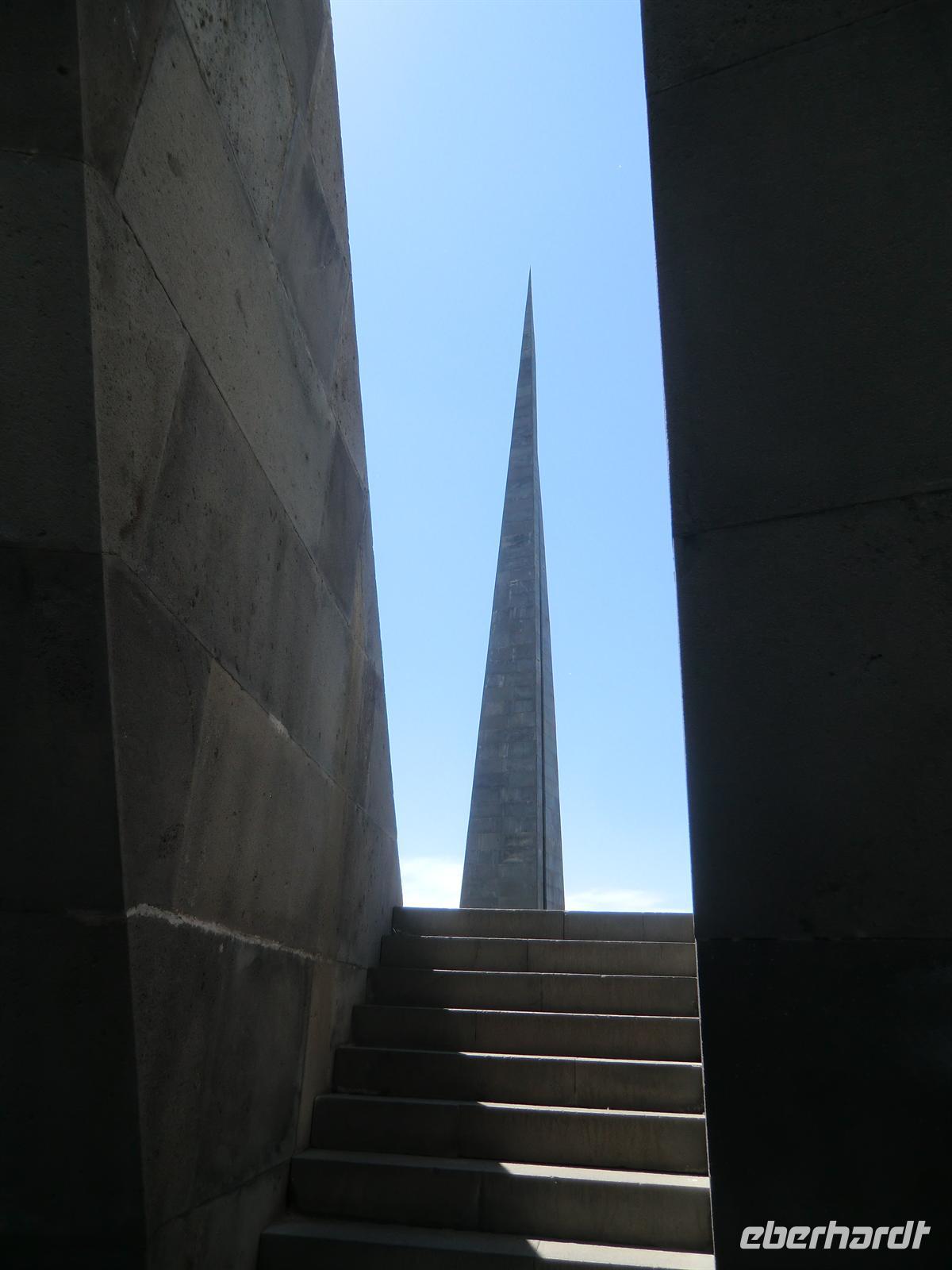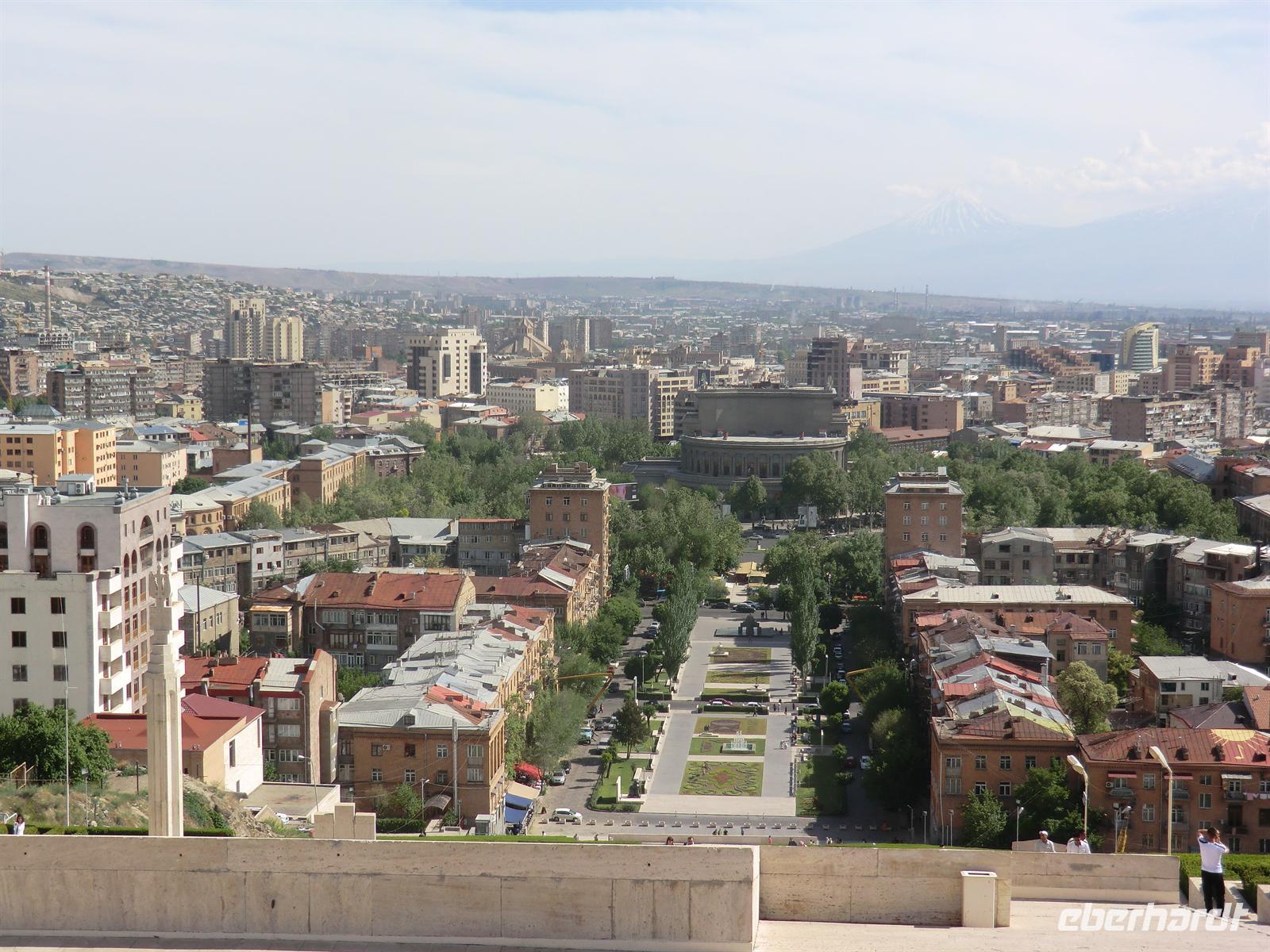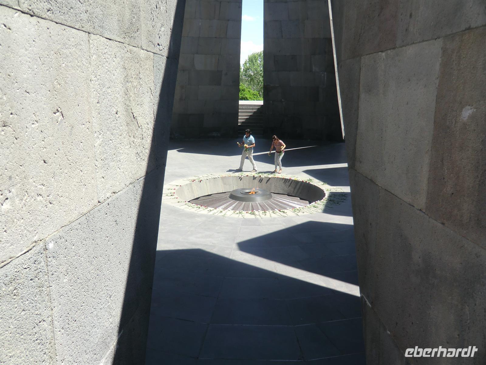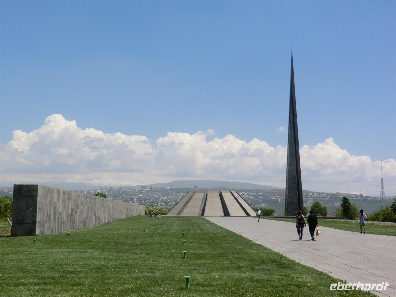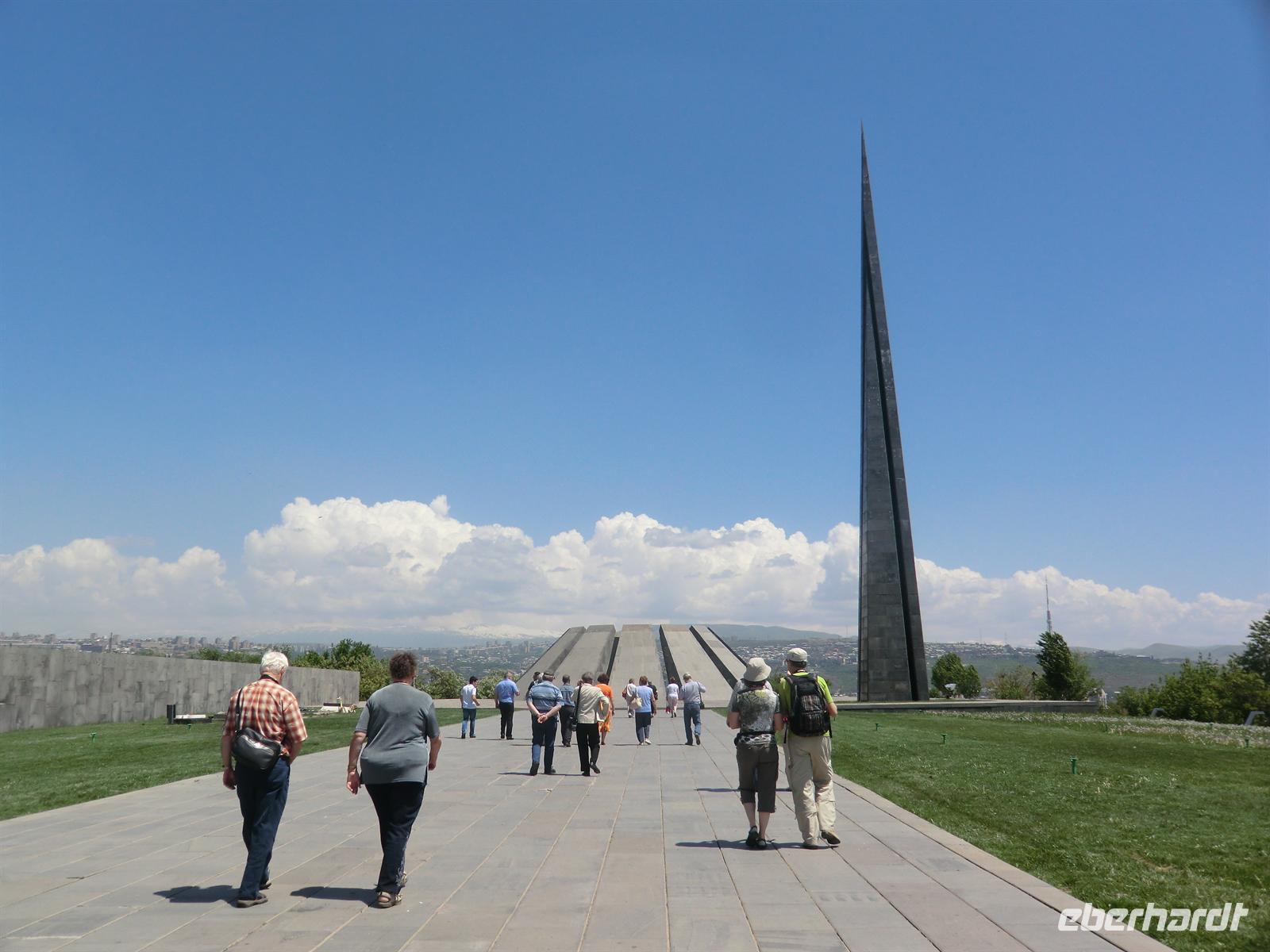 Zimmer warteten bereits auf unseren Bezug und die Betten wurden sofort für ein paar Stunden probegelegen ehe wir uns um 11 Uhr zur ersten Besichtigungstour in der Rezeption wiedertrafen. Zu Fuß ging es bei sommerlichen Temperaturen und Sonnenschein zum „Platz der Republik“. Im Historischen Museum führte uns Anna in einem perfekten Deutsch durch die Ausstellungsräume mit ihren zahlreichen Ausgrabungen und Kunstschätzen. Besonders stolz zeigte sie uns die „ältesten Schuhe der Welt“, welche im Jahr 2008 aus der Erde geborgen wurden und deren Alter auf ca. 30.000 Jahre v. Chr. datiert wird. Im Anschluss fuhren wir auf eine kleine Anhöhe am Rande der Stadt zum Denkmal des Genozids am armenischen Volk. Untermalt von Musik des national verehrten Komponisten Komitas wird hier den bis zum Jahr 1915 rund zwei Millionen zu Tode gekommenen Armeniern gedacht. Auf dem „Schwalbenberg“ (armenisch Zizernakaberd), wie der Denkmalkomplex ebenfalls genannt wird, versammeln sich jedes Jahr zum 24.April Tausende Menschen, um diesem schwarzen Kapitel nationaler Geschichte zu gedenken.
