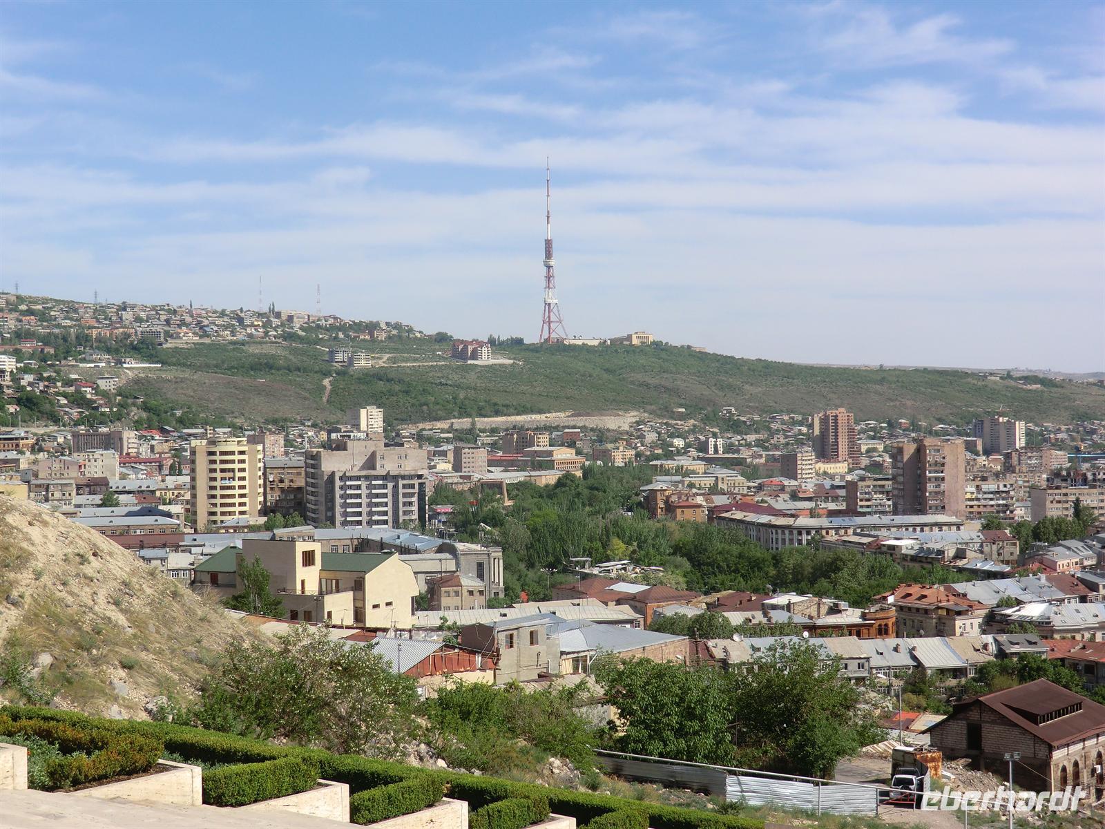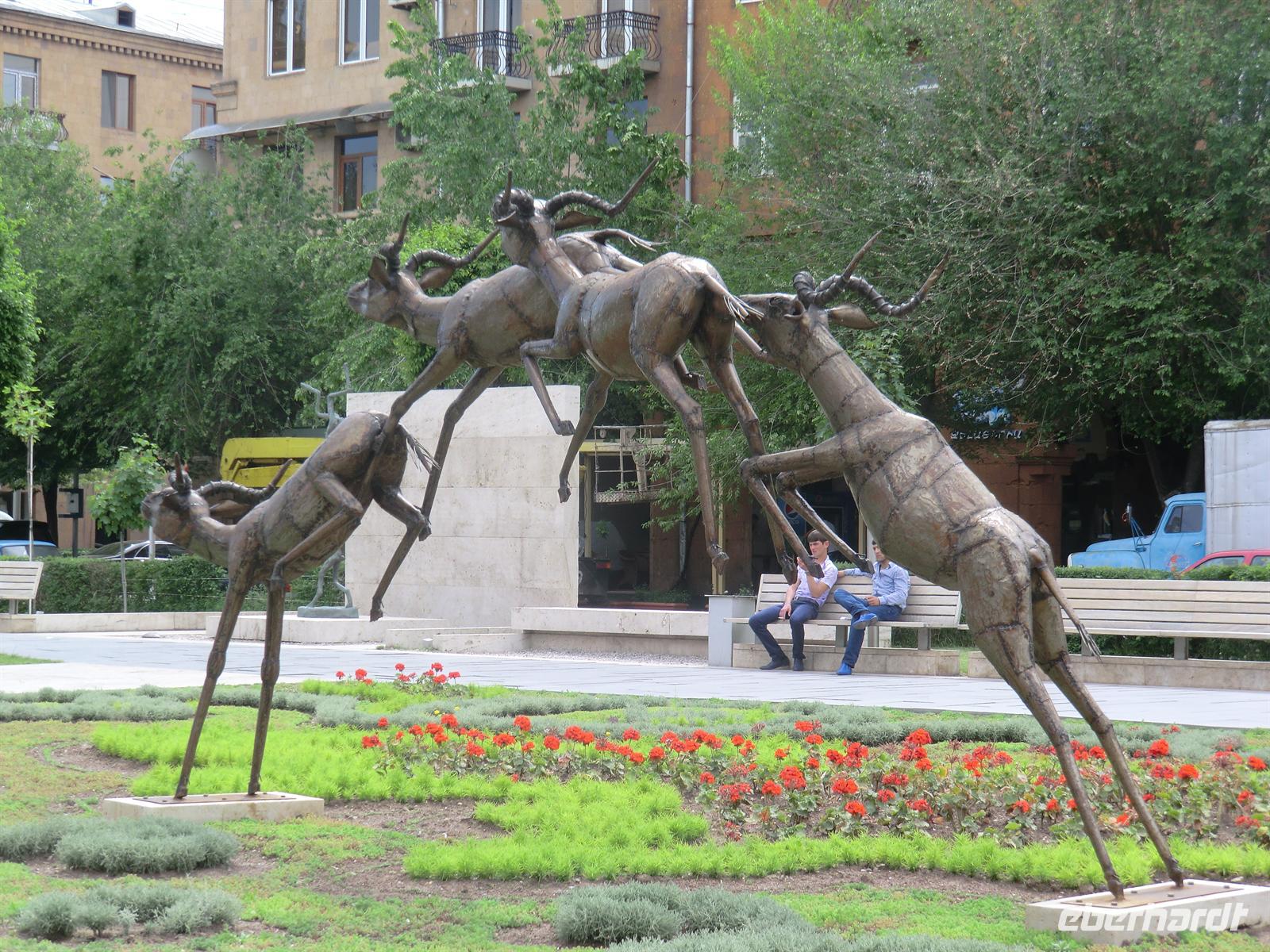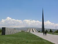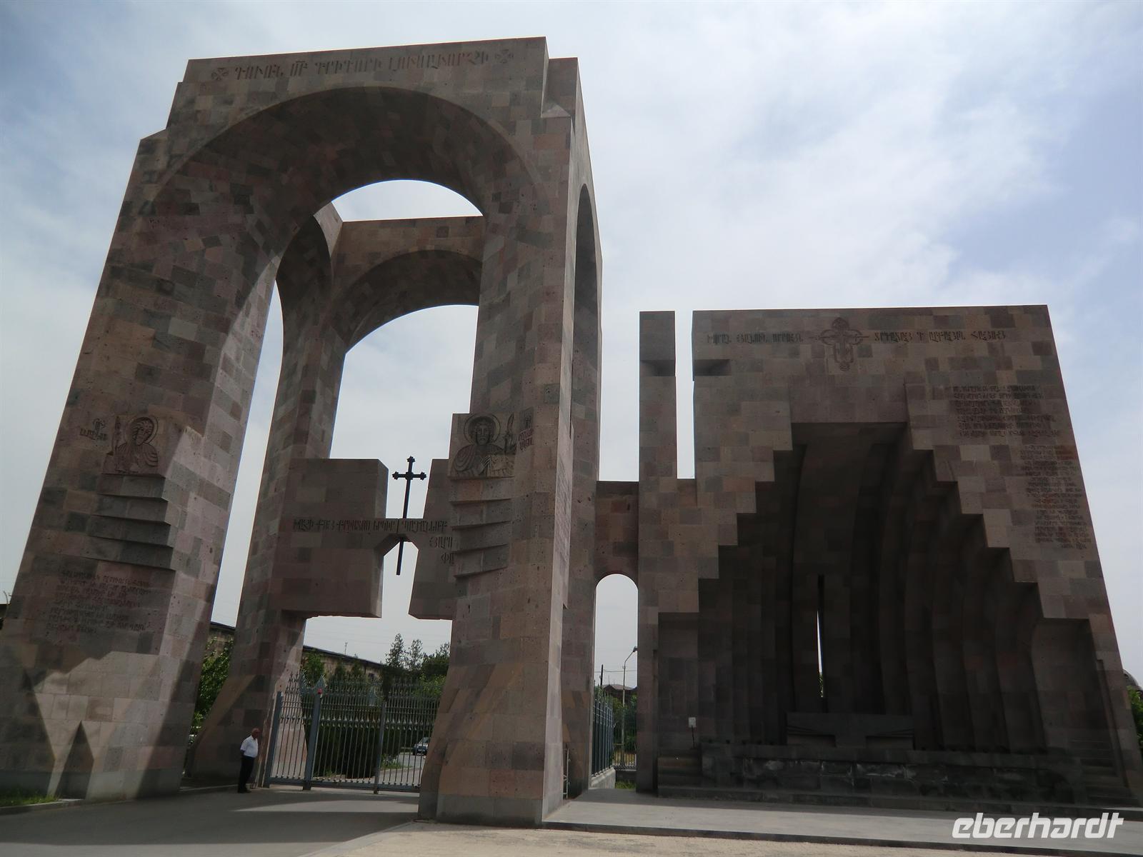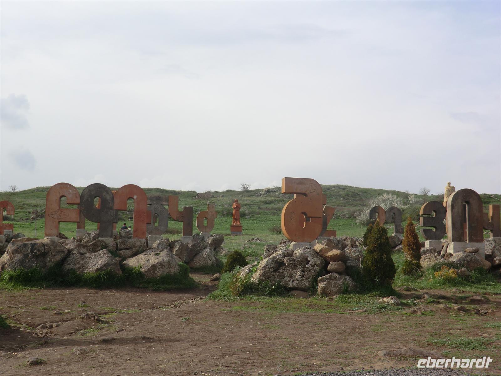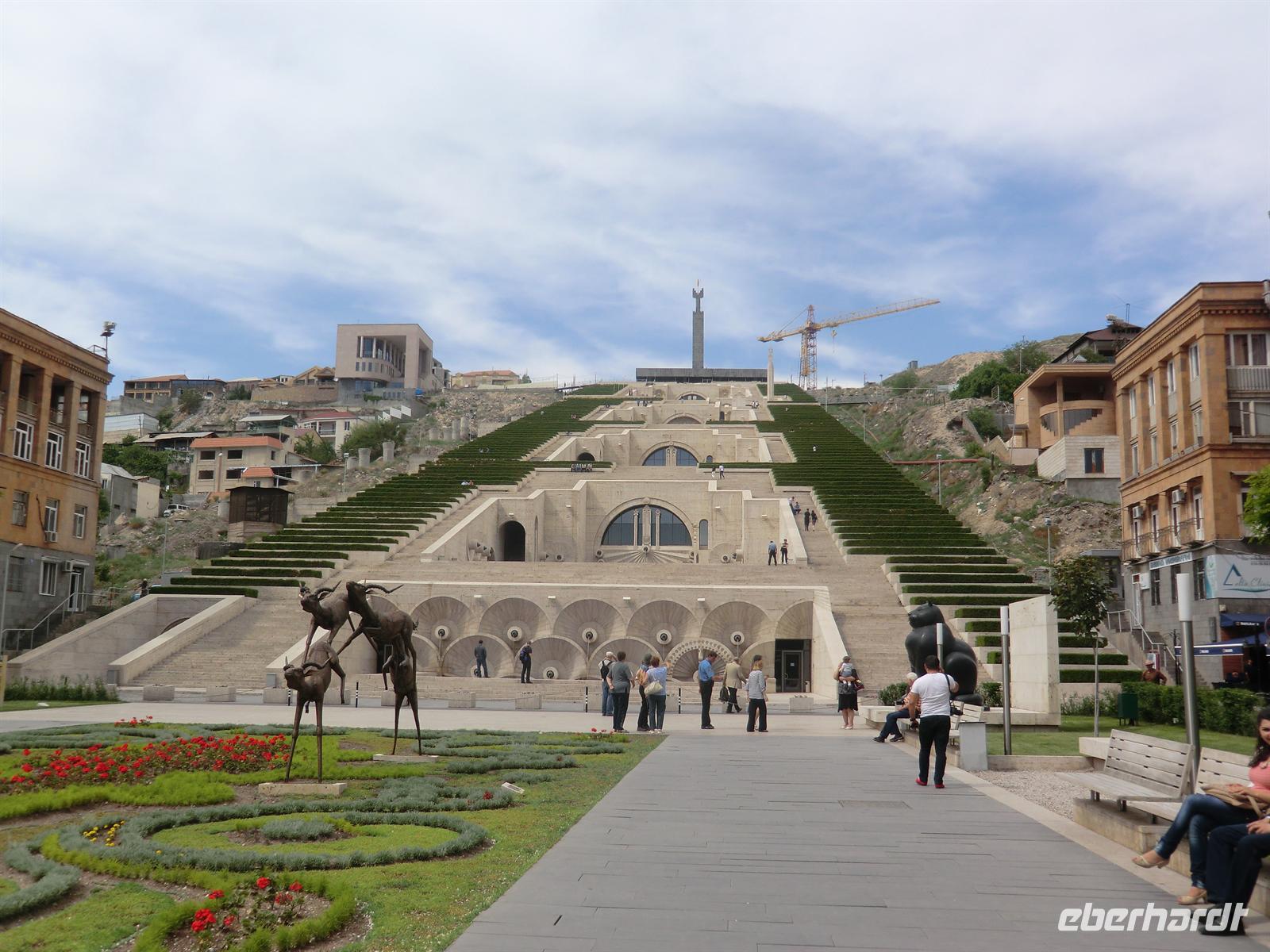 Zimmer warteten bereits auf unseren Bezug und die Betten wurden sofort für ein paar Stunden probegelegen ehe wir uns um 11 Uhr zur ersten Besichtigungstour in der Rezeption wiedertrafen. Zu Fuß ging es bei sommerlichen Temperaturen und Sonnenschein zum „Platz der Republik“. Im Historischen Museum führte uns Anna in einem perfekten Deutsch durch die Ausstellungsräume mit ihren zahlreichen Ausgrabungen und Kunstschätzen. Besonders stolz zeigte sie uns die „ältesten Schuhe der Welt“, welche im Jahr 2008 aus der Erde geborgen wurden und deren Alter auf ca. 30.000 Jahre v. Chr. datiert wird. Im Anschluss fuhren wir auf eine kleine Anhöhe am Rande der Stadt zum Denkmal des Genozids am armenischen Volk. Untermalt von Musik des national verehrten Komponisten Komitas wird hier den bis zum Jahr 1915 rund zwei Millionen zu Tode gekommenen Armeniern gedacht. Auf dem „Schwalbenberg“ (armenisch Zizernakaberd), wie der Denkmalkomplex ebenfalls genannt wird, versammeln sich jedes Jahr zum 24.April Tausende Menschen, um diesem schwarzen Kapitel nationaler Geschichte zu gedenken.