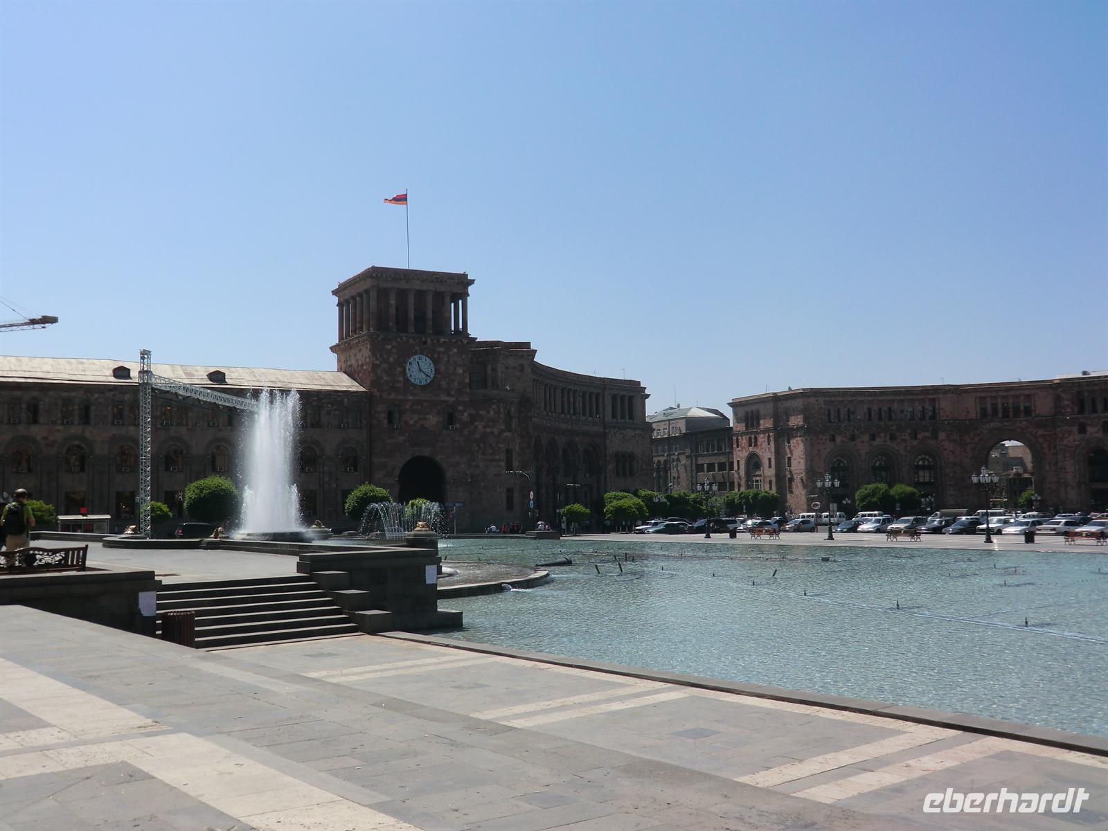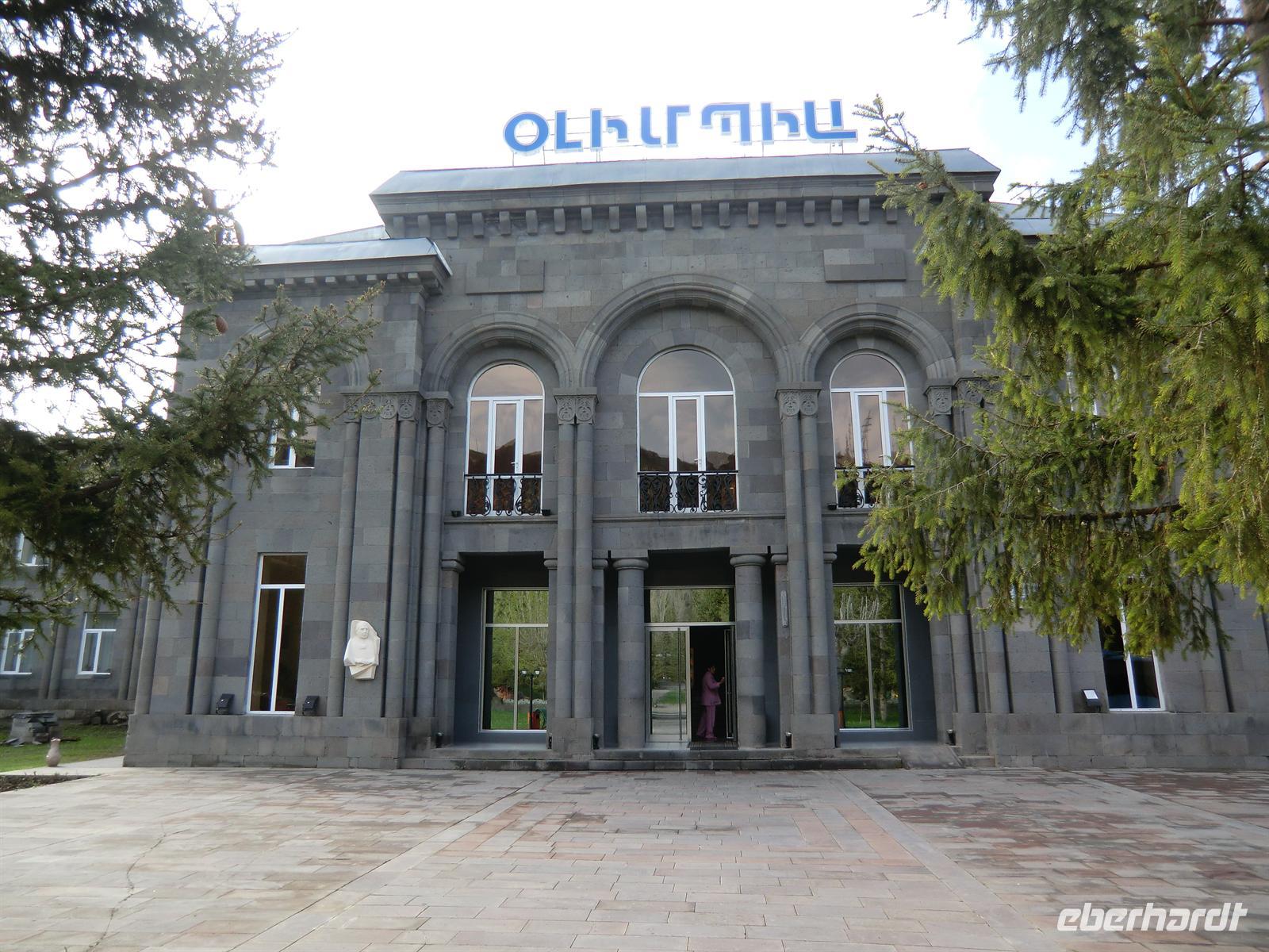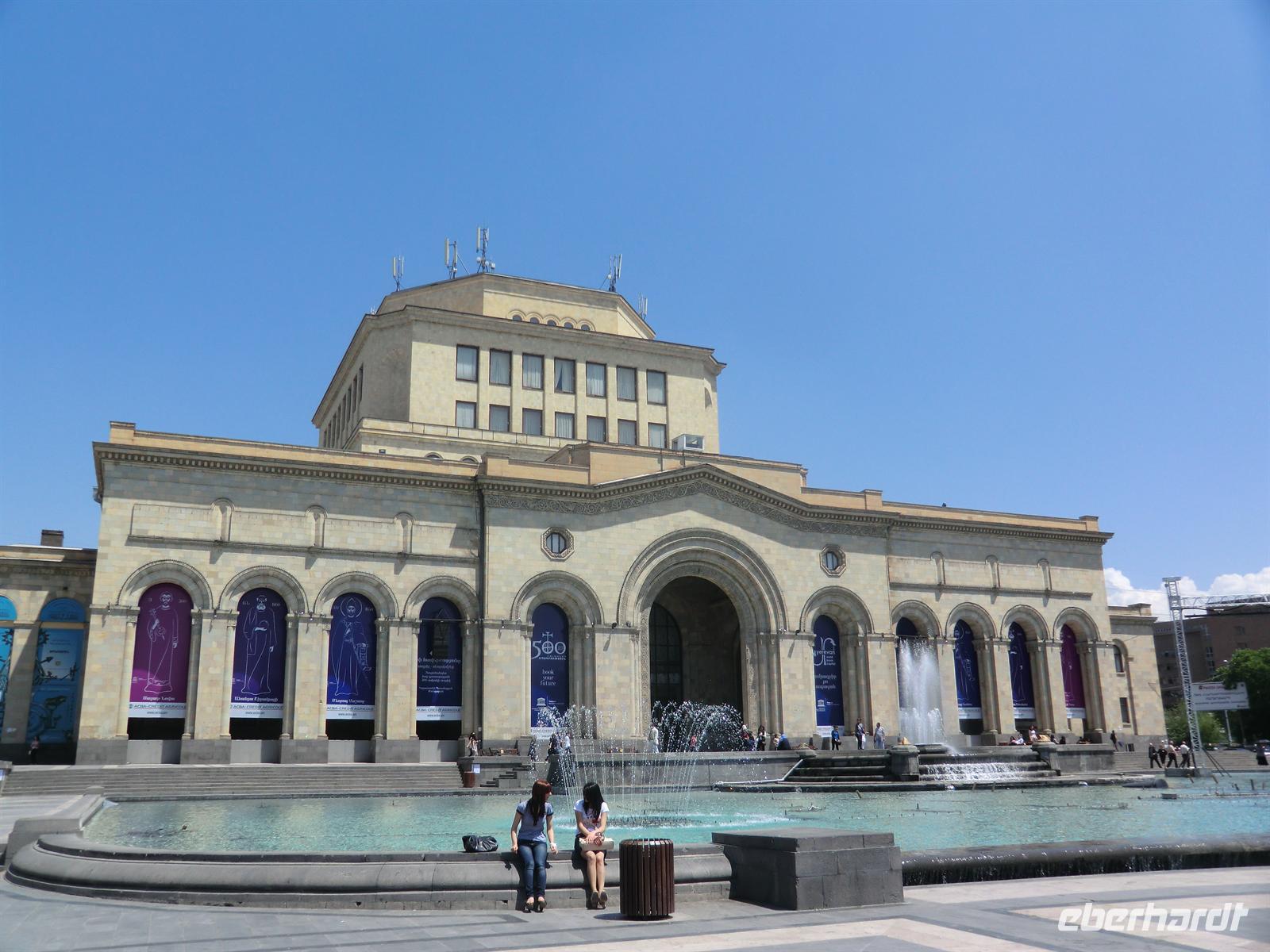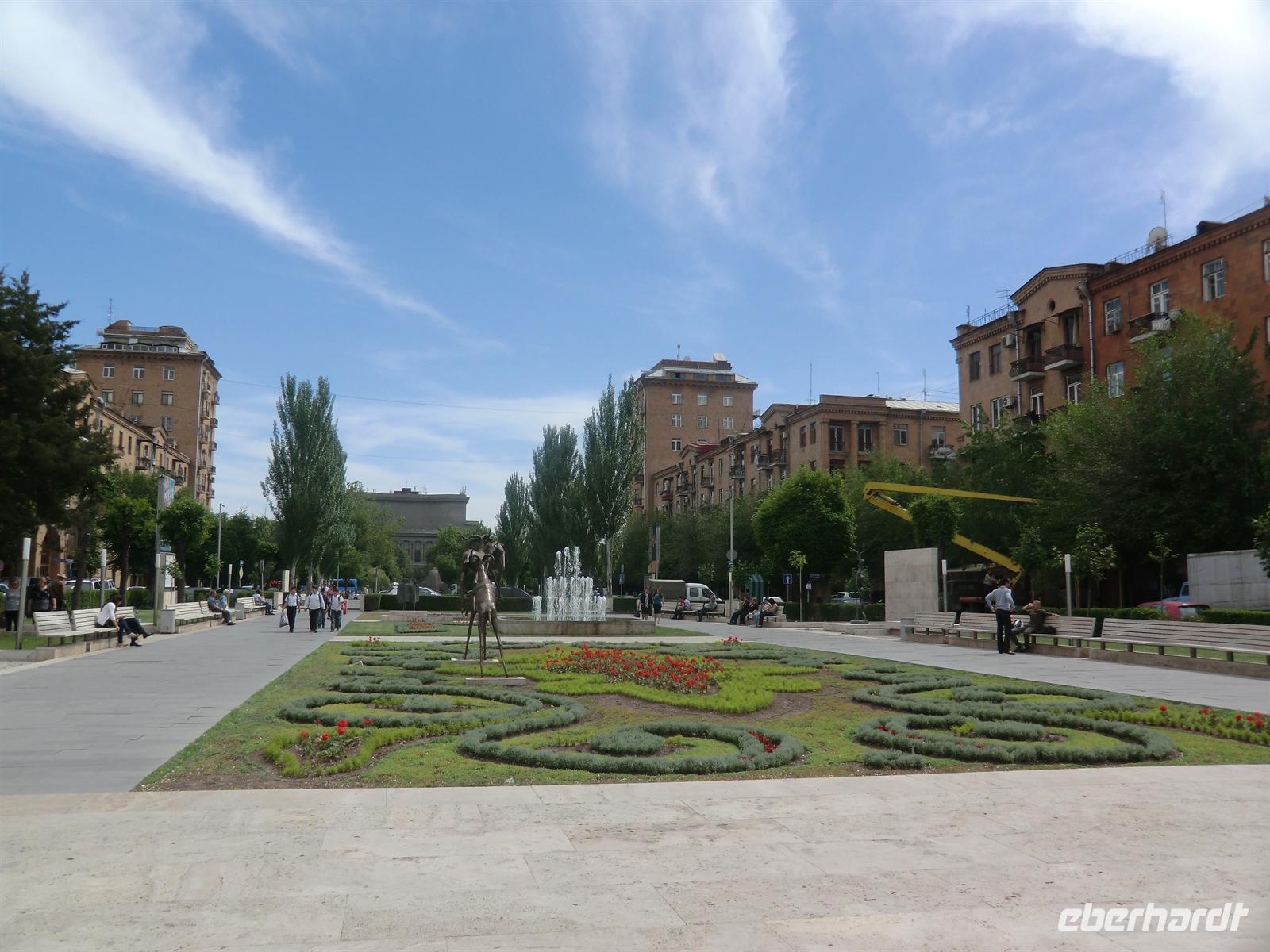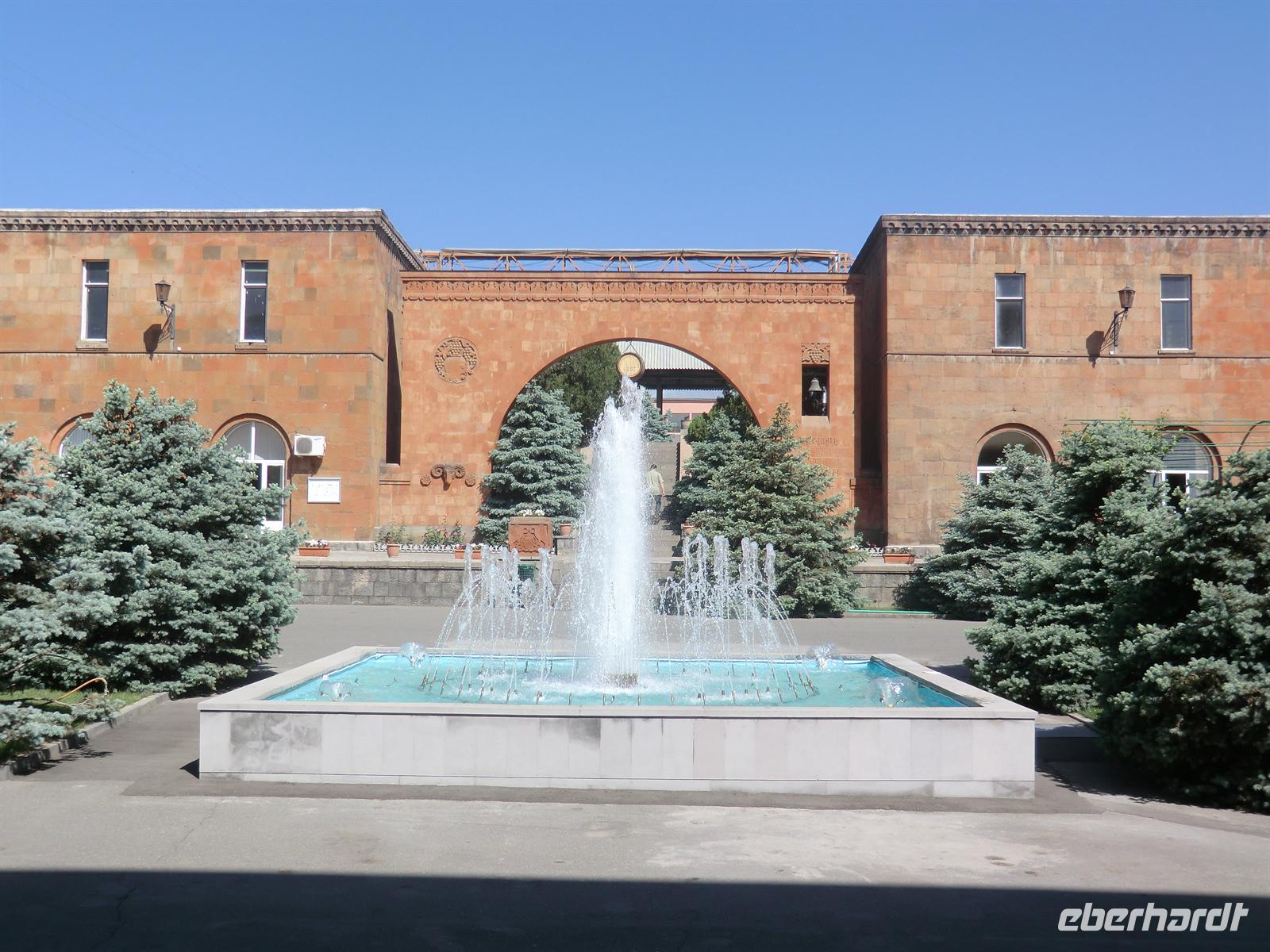Zimmer warteten bereits auf unseren Bezug und die Betten wurden sofort für ein paar Stunden probegelegen ehe wir uns um 11 Uhr zur ersten Besichtigungstour in der Rezeption wiedertrafen. Zu Fuß ging es bei sommerlichen Temperaturen und Sonnenschein zum „Platz der Republik“. Im Historischen Museum führte uns Anna in einem perfekten Deutsch durch die Ausstellungsräume mit ihren zahlreichen Ausgrabungen und Kunstschätzen. Besonders stolz zeigte sie uns die „ältesten Schuhe der Welt“, welche im Jahr 2008 aus der Erde geborgen wurden und deren Alter auf ca. 30.000 Jahre v. Chr. datiert wird. Im Anschluss fuhren wir auf eine kleine Anhöhe am Rande der Stadt zum Denkmal des Genozids am armenischen Volk. Untermalt von Musik des national verehrten Komponisten Komitas wird hier den bis zum Jahr 1915 rund zwei Millionen zu Tode gekommenen Armeniern gedacht. Auf dem „Schwalbenberg“ (armenisch Zizernakaberd), wie der Denkmalkomplex ebenfalls genannt wird, versammeln sich jedes Jahr zum 24.April Tausende Menschen, um diesem schwarzen Kapitel nationaler Geschichte zu gedenken.